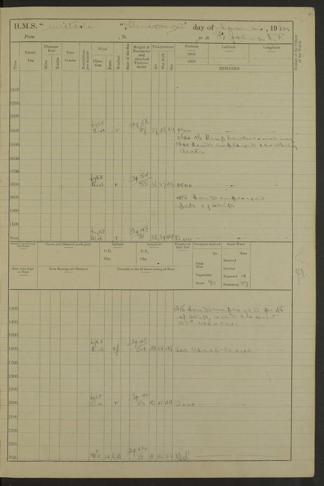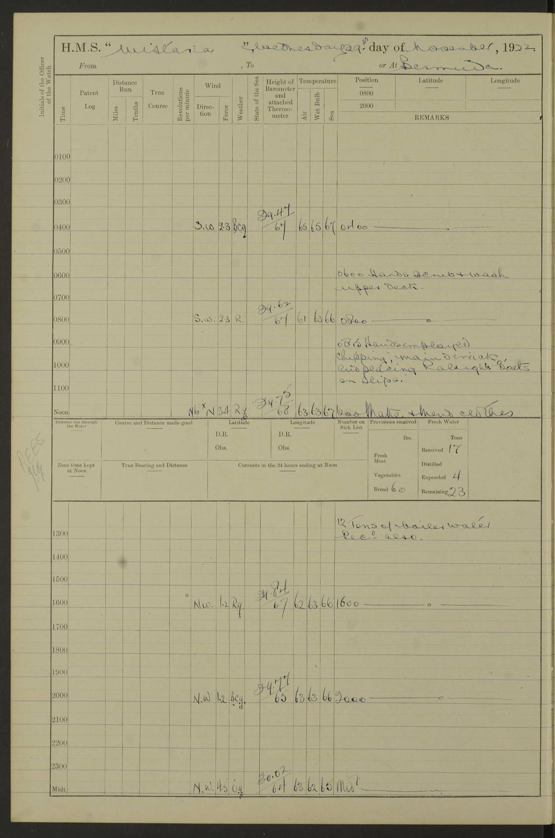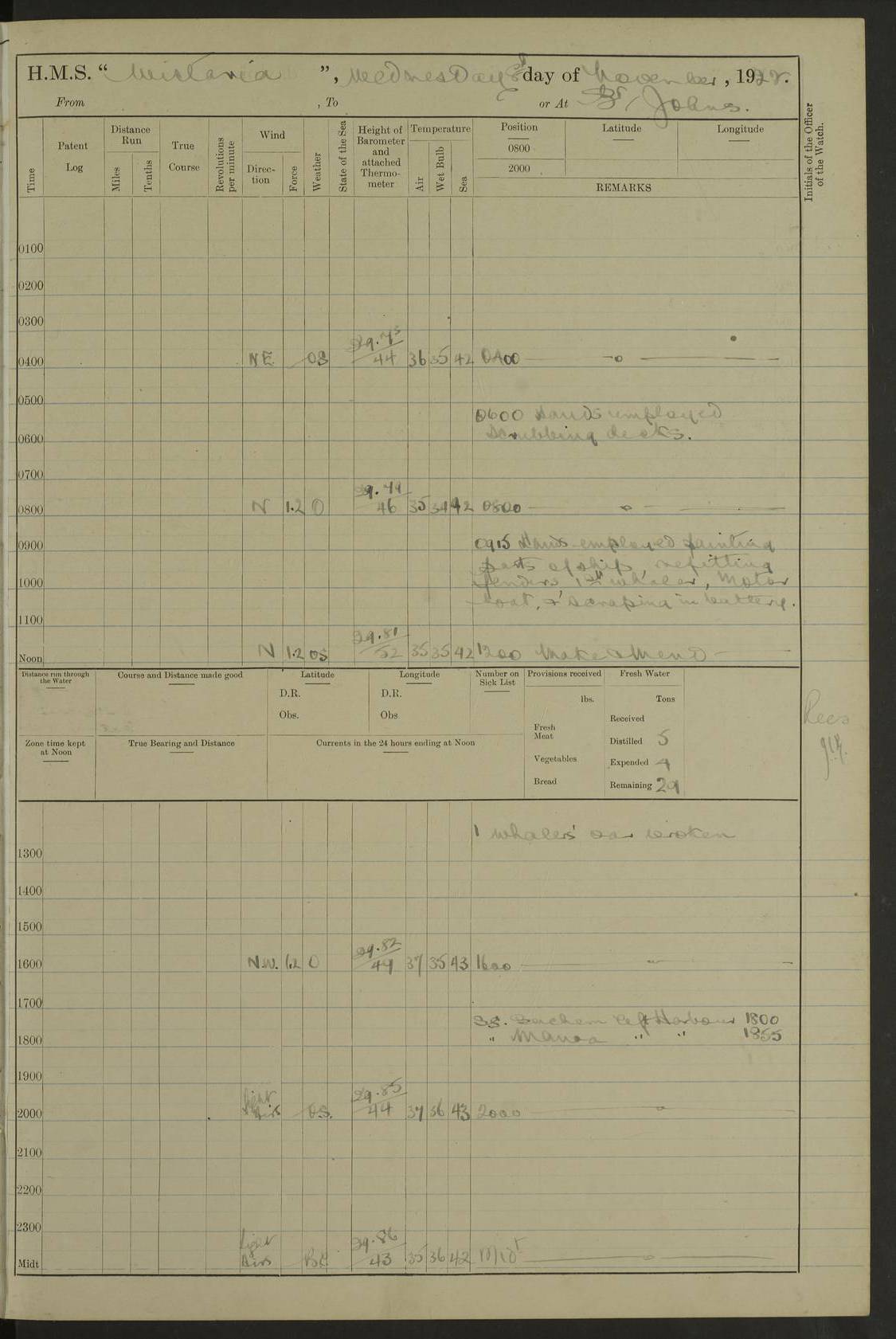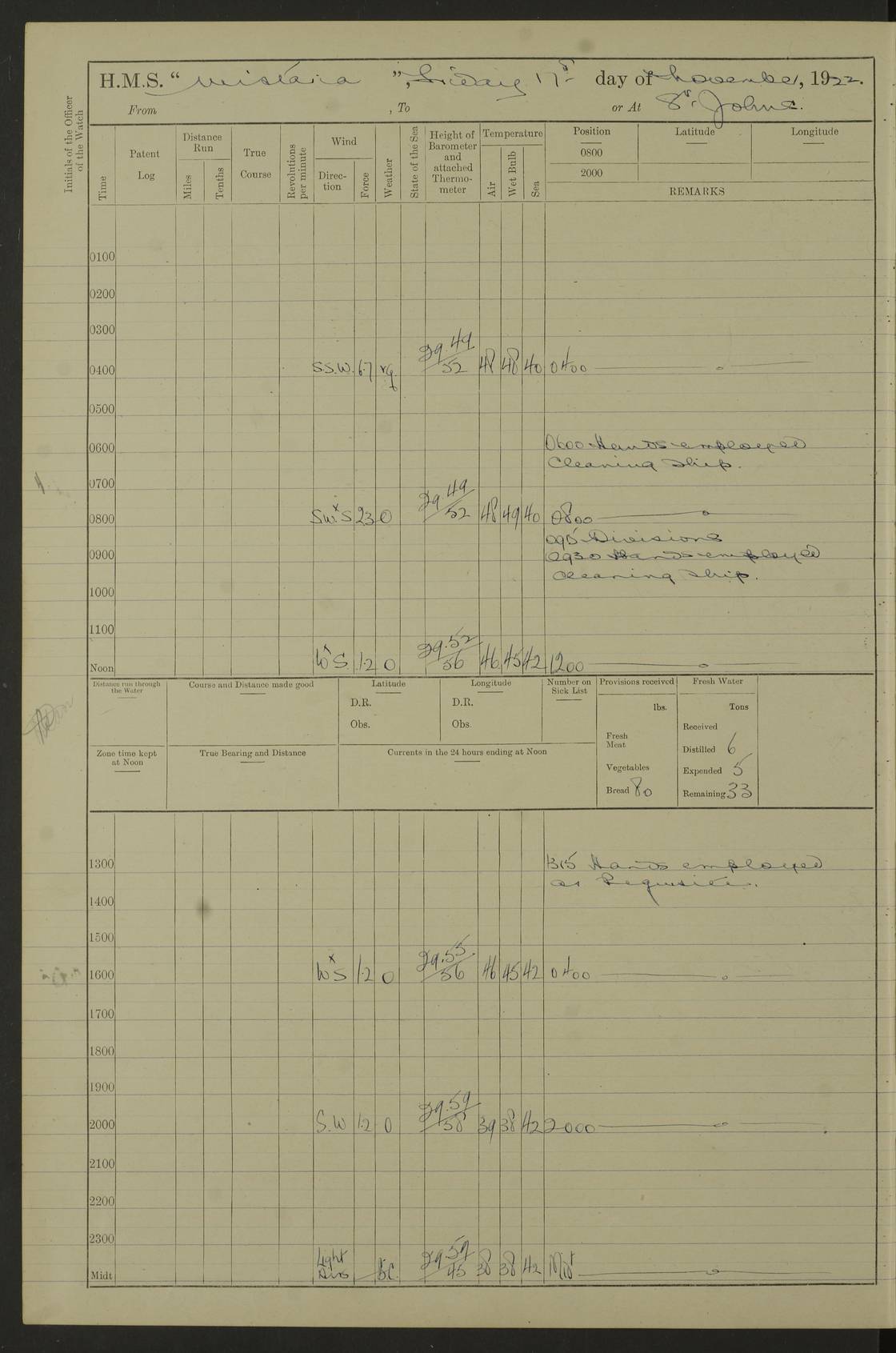 [Signed] A E Johnston, Captain [Signed] F H Alderson Navigating Officer LOGS FOR NOVEMBER 1922 4f73cb16a2fc8ea903000c94: (https://s3.amazonaws.com:443/oldweather/ADM53-93271/0006_0.jpg) 1 November 1922 At St. John’s N.F. Lat 47.56, Long -52.705 9.40am: Hands employed cleaning ship 11.45am: Monthly payment 4f73cb16a2fc8ea903000c95: (https://s3.amazonaws.com:443/oldweather/ADM53-93271/0006_1.jpg) 2 November 1922 At St. John’s N.F. Lat 47.56, Long -52.705 5.30am: 4½” Hemp hawser carried away 6.0am: Hands employed scrubbing decks 8.15am: Hands employed parts of ship 1.15pm: Hands employed parts of ship and about 2nd whaler 4f73cb17a2fc8ea903000c96: (https://s3.amazonaws.com:443/oldweather/ADM53-93271/0007_0.jpg) 3 November 1922 At St. John’s N.F. Lat 47.56, Long -52.705 8.15am: Hands to quarters clean guns 10.0am: Hands employed about 2nd whaler & parts of ship 1.15pm: Q.D. employed with 2½” wire, 2nd whaler & parts of ship 6.15pm: Spring of 2½” wire carried away 4f73cb17a2fc8ea903000c97: (https://s3.amazonaws.com:443/oldweather/ADM53-93271/0007_1.jpg) 4 November 1922 At St. John’s N.F. Lat 47.56, Long -52.705 8.30am: Hands employed part of ship, 2nd whaler, motor boat & 2½” wire 12.45pm: SS “Silvia” leaves harbour 4.30pm: Hauled ship 20 ft ahead [SS “Silvia”: built 1909 as “Orel” for the Russian Voluntary Fleet, 1921 sold to C. T. Bowring & Co., Liverpool, renamed “Silvia”, 1929 transferred to Bermuda & West Indies SS Co., Hamilton, 1935 sold to Douglas SS Co., Hong Kong, renamed “Haitan”, 1950 scrapped. A picture of SS “Silvia” here] 4f73cb17a2fc8ea903000c98: (https://s3.amazonaws.com:443/oldweather/ADM53-93271/0008_0.jpg) 5 November 1922 At St. John’s N.F. Lat 47.56, Long -52.705 6.30am: Hands employed cleaning ship 7.30pm: 1 Ld. Sto. discharged to hospital 4f73cb18a2fc8ea903000c99: (https://s3.amazonaws.com:443/oldweather/ADM53-93271/0008_1.jpg) 6 November 1922 At St. John’s N.F. Lat 47.56, Long -52.705 6.0am: Hands employed scrubbing decks 9.30am: Hands employed parts of ship & boats 1.15pm: Hands employed parts of ship & 2nd whaler 4f73cb18a2fc8ea903000c9a: (https://s3.amazonaws.com:443/oldweather/ADM53-93271/0009_0.jpg) 7 November 1922 At St. John’s N.F. Lat 47.56, Long -52.705 6.15am: Slipped jetty and proceeded to anchorage 7.0am: Came to with Starboard anchor with 3 shackles 7.15am: SS “Digby” leaves harbour; SS “Sachem” proceeds alongside 9.40am: Hands employed about 2nd whaler, painting ship Anchor bearings: Storm Sig FS S85E, Front mark N58W, Chimney N18E pm: Lost by accident: one coir fender 1.15pm: Hands employed about 1st and 2nd whaler, motor boat & parts of ship, painting & repairing fenders [SS “Digby”: built 1913. 1914 commissioned as armed merchant cruiser HMS “Digby”, 1916 renamed “Artois”, 1918 reverted to “Digby”, 1925 transferred to Bermuda & West Indies SS Co, renamed “Dominica”, 1934 sold to United Baltic Co, renamed “Baltrover”, 1939-1944 chartered from United Baltic Co, 1944 returned to owners] [SS “Sachem”: passenger ship built 1893 built by Harland and Wolff for Geo Warren & Co and completed on 28 October 1893. 1927 scrapped.] 4f73cb19a2fc8ea903000c9b: (https://s3.amazonaws.com:443/oldweather/ADM53-93271/0009_1.jpg) 8 November 1922 At St. John’s N.F. Lat 47.56, Long -52.705 6.0am: Hands employed scrubbing decks 9.15am: Hands employed painting parts of ship, refitting fenders, 1st whaler, motor boat, & scraping in battery pm: 1 whalers’ oar broken pm: SS “Sachem” left Harbour 18.00 pm: SS “Manoa” left Harbour 18.55 [Canada Steamship Lines ship “Manoa” (II): built in 1911 by Bremer Vulkan at Vegesack, Germany, and operated as a passenger-cargo ship by the Hamburg-America Line as SS “Wasgenwald”, was chartered for World War I service by the United States Army on 26 October 1917 from the Custom House, New York, and used as a depot collier with the name SS “Shoshone”. In 1920, the vessel was acquired by the American Interlake Line before the Canada Steamship Lines purchased the vessel, renamed her “Manoa” and registered her in London] 4f73cb19a2fc8ea903000c9c: (https://s3.amazonaws.com:443/oldweather/ADM53-93271/0010_0.jpg) 9 November 1922 At St. John’s Lat 47.56, Long -52.705 6.0am: Lowered 2nd whaler. Hands employed scrubbing decks 9.30am: Hands employed about ship's side and painting parts of ship 11.20am: Weighed & proceeded to fresh anchorage, came to with Starboard anchor, 3 shackles pm: One coir fender lost by accident 1.15pm: Hands employed painting ship’s side and painting parts of ship 6.15pm: Hoisted 1st whaler 11.45pm: Let go Port anchor 2 shackles 4f73cb19a2fc8ea903000c9d: (https://s3.amazonaws.com:443/oldweather/ADM53-93271/0010_1.jpg) 10 November 1922 At St. John’s N.F. Lat 47.56, Long -52.705 5.30am: Hands employed scrubbing decks and 1st whaler 6.10am: SS “Javary” left harbour 10.0am: Hands employed painting ship’s side & about boats 1.15pm: Hands employed painting parts of ship & working about boats 4.0pm: Hands to evening quarters, exercise fire stations 4f73cb1aa2fc8ea903000c9e: (https://s3.amazonaws.com:443/oldweather/ADM53-93271/0011_0.jpg) 11 November 1922 At St. John’s N.F. Lat 47.56, Long -52.705 8.35am: Hands to divisions. Muster Ditty Boxes & Helmet Covers 8.45am: Hands employed cleaning ship 10.55am: Divisions 11.0am: Two minute silence 12.30pm: SS “Rosaline” left harbour [SS “Rosaline”: perhaps SS “Rosaline” built 1895] 4f73cb1aa2fc8ea903000c9f: (https://s3.amazonaws.com:443/oldweather/ADM53-93271/0011_1.jpg) 12 November 1922 At St. John’s N.F. Lat 47.56, Long -52.705 6.30am: Hands employed cleaning ship 9.45am: Divisions, Prayers and Rounds 4f73cb1aa2fc8ea903000ca0: (https://s3.amazonaws.com:443/oldweather/ADM53-93271/0012_0.jpg) 13 November 1922 At St. John’s N.F. Lat 47.56, Long -52.705 3.30am: Let go Port anchor 2 shackles 6.0am: Hands employed scrubbing decks & motor boats crew about boats 9