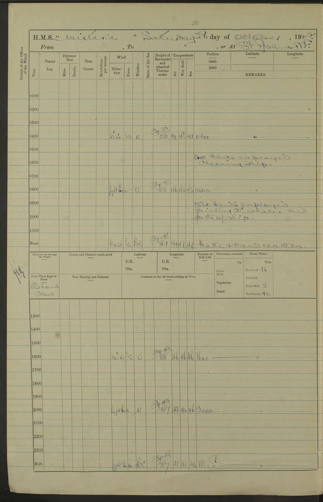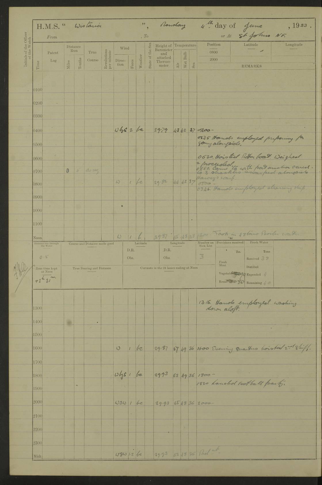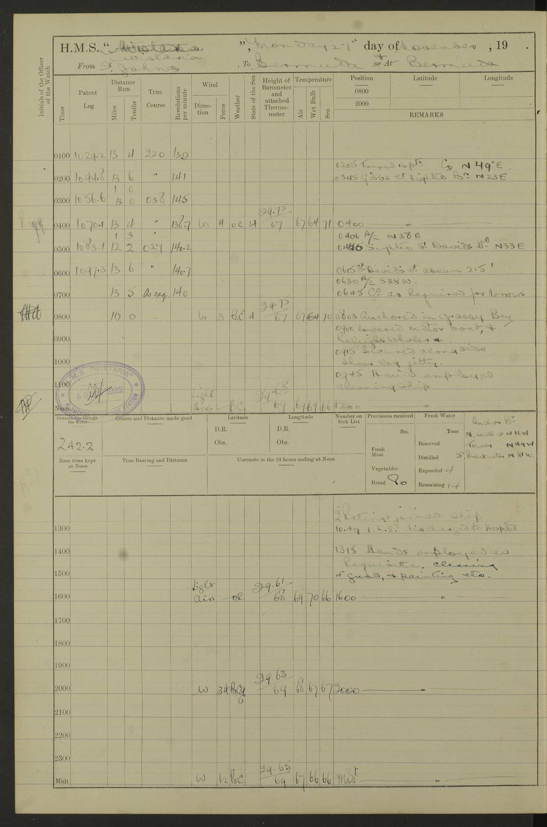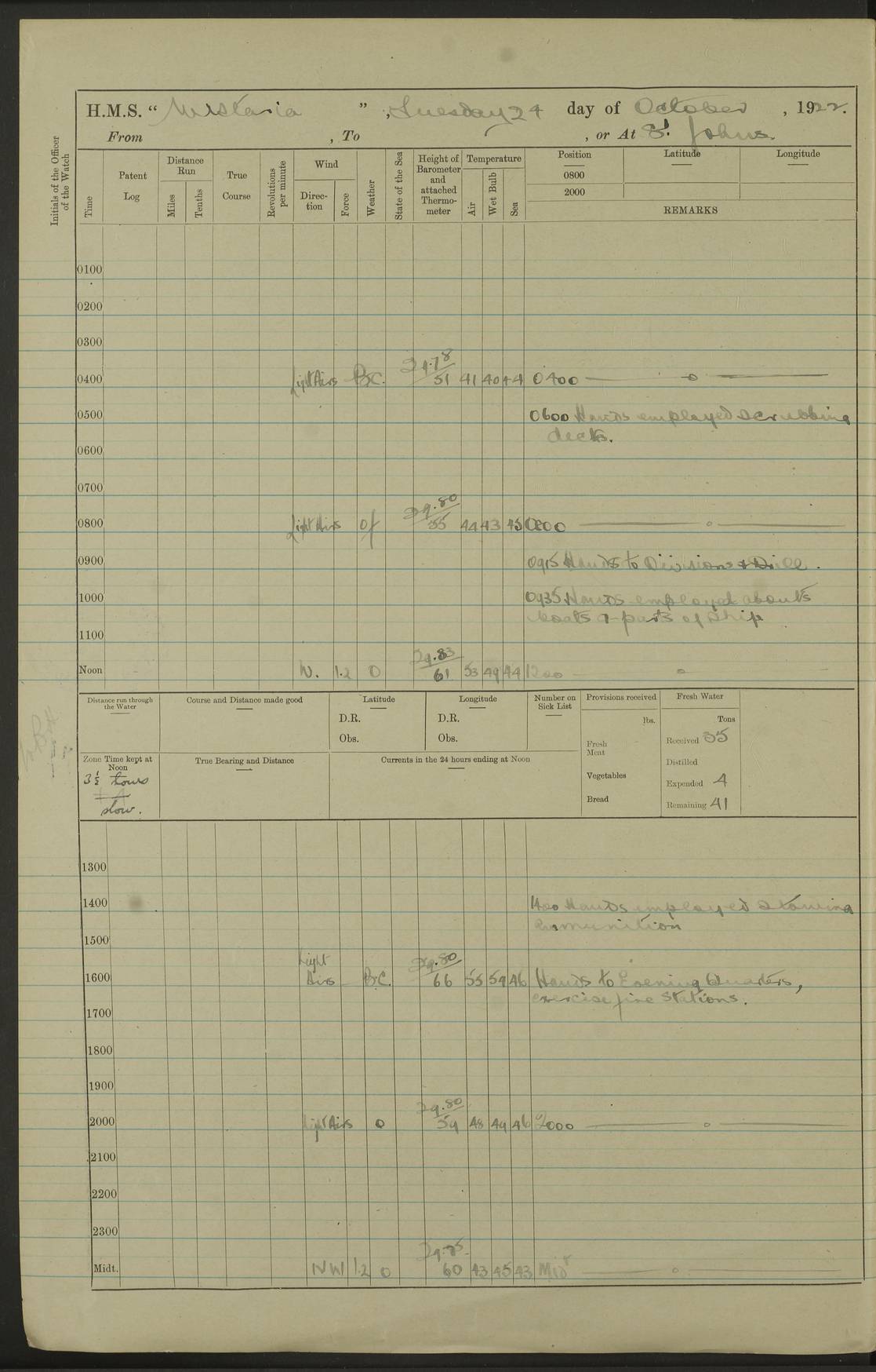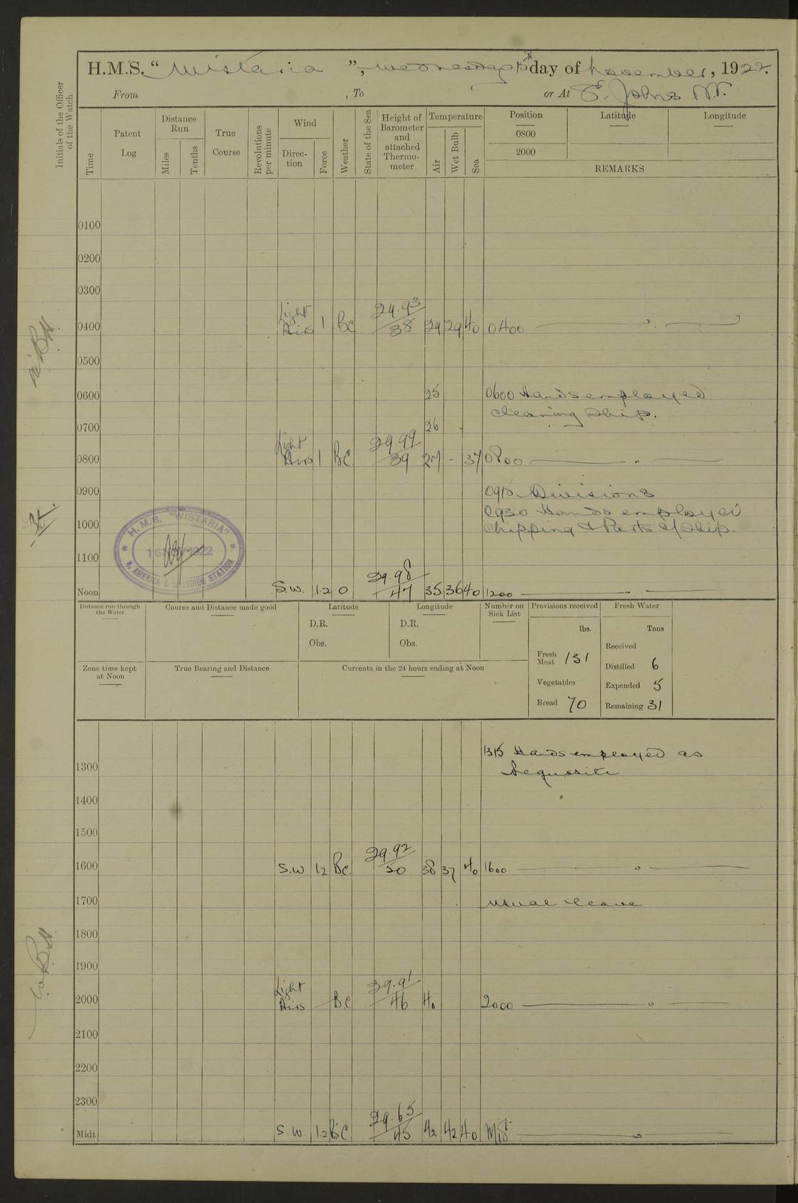 [Signed] A E Johnston, Captain [Signed] F H Alderson Navigating Officer LOGS FOR NOVEMBER 1922 4f73cb16a2fc8ea903000c94: (https://s3.amazonaws.com:443/oldweather/ADM53-93271/0006_0.jpg) 1 November 1922 At St. John’s N.F. Lat 47.56, Long -52.705 9.40am: Hands employed cleaning ship 11.45am: Monthly payment 4f73cb16a2fc8ea903000c95: (https://s3.amazonaws.com:443/oldweather/ADM53-93271/0006_1.jpg) 2 November 1922 At St. John’s N.F. Lat 47.56, Long -52.705 5.30am: 4½” Hemp hawser carried away 6.0am: Hands employed scrubbing decks 8.15am: Hands employed parts of ship 1.15pm: Hands employed parts of ship and about 2nd whaler 4f73cb17a2fc8ea903000c96: (https://s3.amazonaws.com:443/oldweather/ADM53-93271/0007_0.jpg) 3 November 1922 At St. John’s N.F. Lat 47.56, Long -52.705 8.15am: Hands to quarters clean guns 10.0am: Hands employed about 2nd whaler & parts of ship 1.15pm: Q.D. employed with 2½” wire, 2nd whaler & parts of ship 6.15pm: Spring of 2½” wire carried away 4f73cb17a2fc8ea903000c97: (https://s3.amazonaws.com:443/oldweather/ADM53-93271/0007_1.jpg) 4 November 1922 At St. John’s N.F. Lat 47.56, Long -52.705 8.30am: Hands employed part of ship, 2nd whaler, motor boat & 2½” wire 12.45pm: SS “Silvia” leaves harbour 4.30pm: Hauled ship 20 ft ahead [SS “Silvia”: built 1909 as “Orel” for the Russian Voluntary Fleet, 1921 sold to C. T. Bowring & Co., Liverpool, renamed “Silvia”, 1929 transferred to Bermuda & West Indies SS Co., Hamilton, 1935 sold to Douglas SS Co., Hong Kong, renamed “Haitan”, 1950 scrapped. A picture of SS “Silvia” here] 4f73cb17a2fc8ea903000c98: (https://s3.amazonaws.com:443/oldweather/ADM53-93271/0008_0.jpg) 5 November 1922 At St. John’s N.F. Lat 47.56, Long -52.705 6.30am: Hands employed cleaning ship 7.30pm: 1 Ld. Sto. discharged to hospital 4f73cb18a2fc8ea903000c99: (https://s3.amazonaws.com:443/oldweather/ADM53-93271/0008_1.jpg) 6 November 1922 At St. John’s N.F. Lat 47.56, Long -52.705 6.0am: Hands employed scrubbing decks 9.30am: Hands employed parts of ship & boats 1.15pm: Hands employed parts of ship & 2nd whaler 4f73cb18a2fc8ea903000c9a: (https://s3.amazonaws.com:443/oldweather/ADM53-93271/0009_0.jpg) 7 November 1922 At St. John’s N.F. Lat 47.56, Long -52.705 6.15am: Slipped jetty and proceeded to anchorage 7.0am: Came to with Starboard anchor with 3 shackles 7.15am: SS “Digby” leaves harbour; SS “Sachem” proceeds alongside 9.40am: Hands employed about 2nd whaler, painting ship Anchor bearings: Storm Sig FS S85E, Front mark N58W, Chimney N18E pm: Lost by accident: one coir fender 1.15pm: Hands employed about 1st and 2nd whaler, motor boat & parts of ship, painting & repairing fenders [SS “Digby”: built 1913. 1914 commissioned as armed merchant cruiser HMS “Digby”, 1916 renamed “Artois”, 1918 reverted to “Digby”, 1925 transferred to Bermuda & West Indies SS Co, renamed “Dominica”, 1934 sold to United Baltic Co, renamed “Baltrover”, 1939-1944 chartered from United Baltic Co, 1944 returned to owners] [SS “Sachem”: passenger ship built 1893 built by Harland and Wolff for Geo Warren & Co and completed on 28 October 1893. 1927 scrapped.] 4f73cb19a2fc8ea903000c9b: (https://s3.amazonaws.com:443/oldweather/ADM53-93271/0009_1.jpg) 8 November 1922 At St. John’s N.F. Lat 47.56, Long -52.705 6.0am: Hands employed scrubbing decks 9.15am: Hands employed painting parts of ship, refitting fenders, 1st whaler, motor boat, & scraping in battery pm: 1 whalers’ oar broken pm: SS “Sachem” left Harbour 18.00 pm: SS “Manoa” left Harbour 18.55 [Canada Steamship Lines ship “Manoa” (II): built in 1911 by Bremer Vulkan at Vegesack, Germany, and operated as a passenger-cargo ship by the Hamburg-America Line as SS “Wasgenwald”, was chartered for World War I service by the United States Army on 26 October 1917 from the Custom House, New York, and used as a depot collier with the name SS “Shoshone”. In 1920, the vessel was acquired by the American Interlake Line before the Canada Steamship Lines purchased the vessel, renamed her “Manoa” and registered her in London] 4f73cb19a2fc8ea903000c9c: (https://s3.amazonaws.com:443/oldweather/ADM53-93271/0010_0.jpg) 9 November 1922 At St. John’s Lat 47.56, Long -52.705 6.0am: Lowered 2nd whaler. Hands employed scrubbing decks 9.30am: Hands employed about ship's side and painting parts of ship 11.20am: Weighed & proceeded to fresh anchorage, came to with Starboard anchor, 3 shackles pm: One coir fender lost by accident 1.15pm: Hands employed painting ship’s side and painting parts of ship 6.15pm: Hoisted 1st whaler 11.45pm: Let go Port anchor 2 shackles 4f73cb19a2fc8ea903000c9d: (https://s3.amazonaws.com:443/oldweather/ADM53-93271/0010_1.jpg) 10 November 1922 At St. John’s N.F. Lat 47.56, Long -52.705 5.30am: Hands employed scrubbing decks and 1st whaler 6.10am: SS “Javary” left harbour 10.0am: Hands employed painting ship’s side & about boats 1.15pm: Hands employed painting parts of ship & working about boats 4.0pm: Hands to evening quarters, exercise fire stations 4f73cb1aa2fc8ea903000c9e: (https://s3.amazonaws.com:443/oldweather/ADM53-93271/0011_0.jpg) 11 November 1922 At St. John’s N.F. Lat 47.56, Long -52.705 8.35am: Hands to divisions. Muster Ditty Boxes & Helmet Covers 8.45am: Hands employed cleaning ship 10.55am: Divisions 11.0am: Two minute silence 12.30pm: SS “Rosaline” left harbour [SS “Rosaline”: perhaps SS “Rosaline” built 1895] 4f73cb1aa2fc8ea903000c9f: (https://s3.amazonaws.com:443/oldweather/ADM53-93271/0011_1.jpg) 12 November 1922 At St. John’s N.F. Lat 47.56, Long -52.705 6.30am: Hands employed cleaning ship 9.45am: Divisions, Prayers and Rounds 4f73cb1aa2fc8ea903000ca0: (https://s3.amazonaws.com:443/oldweather/ADM53-93271/0012_0.jpg) 13 November 1922 At St. John’s N.F. Lat 47.56, Long -52.705 3.30am: Let go Port anchor 2 shackles 6.0am: Hands employed scrubbing decks & motor boats crew about boats 9