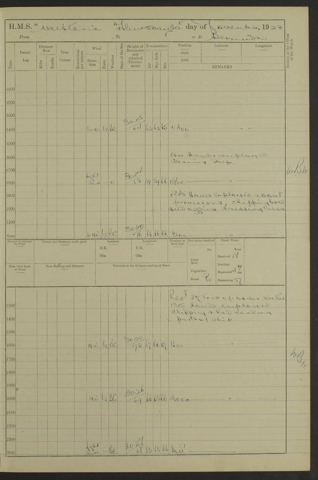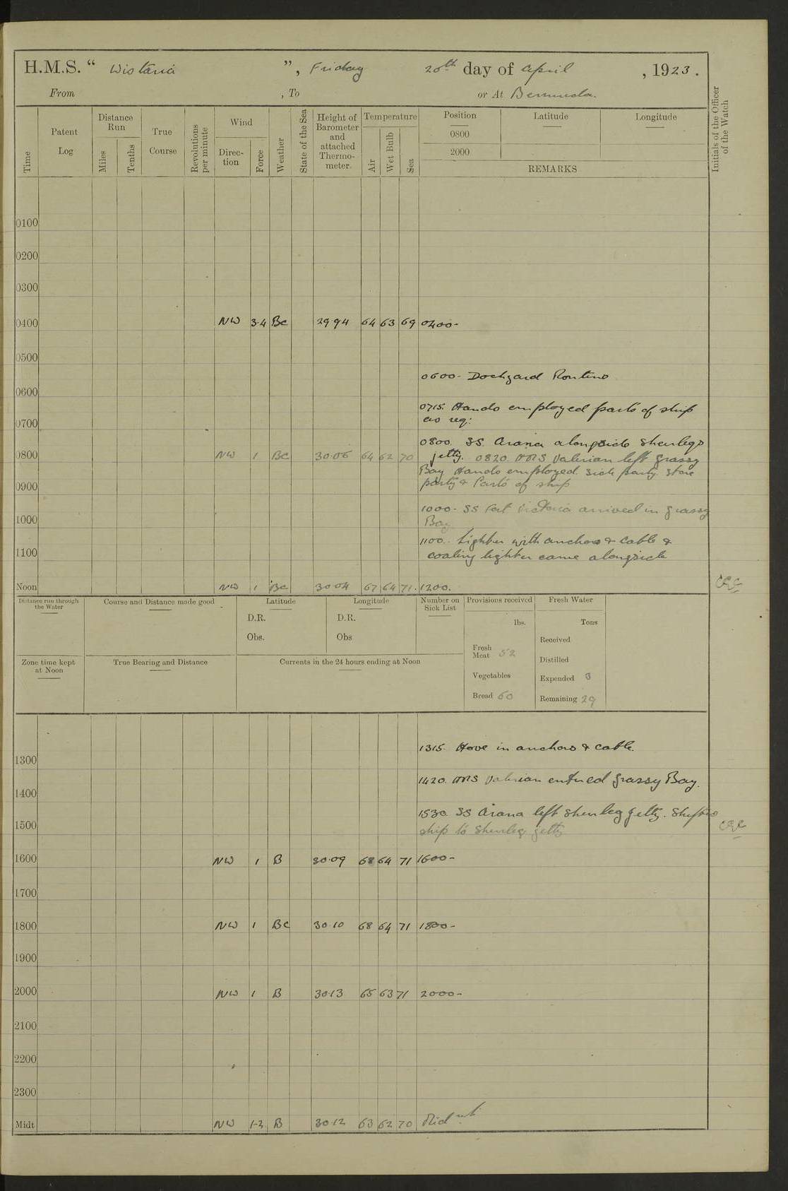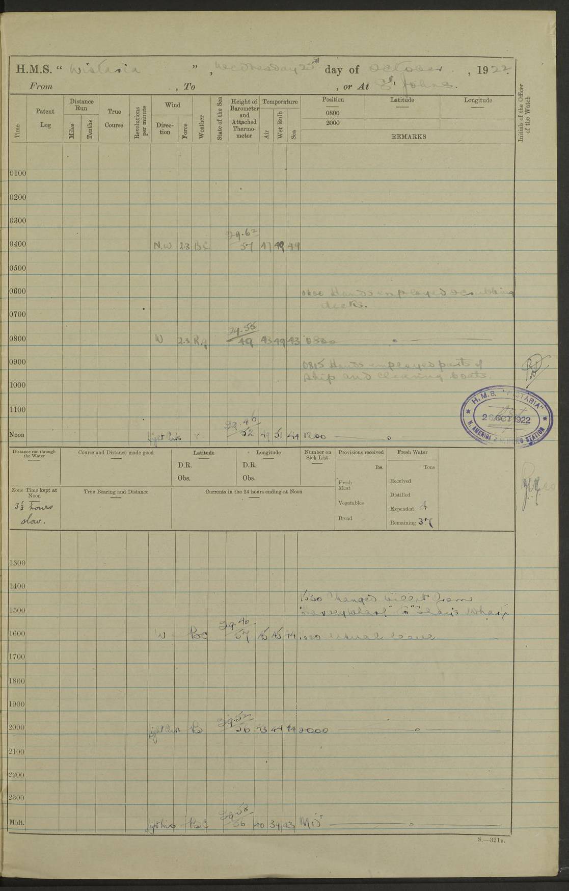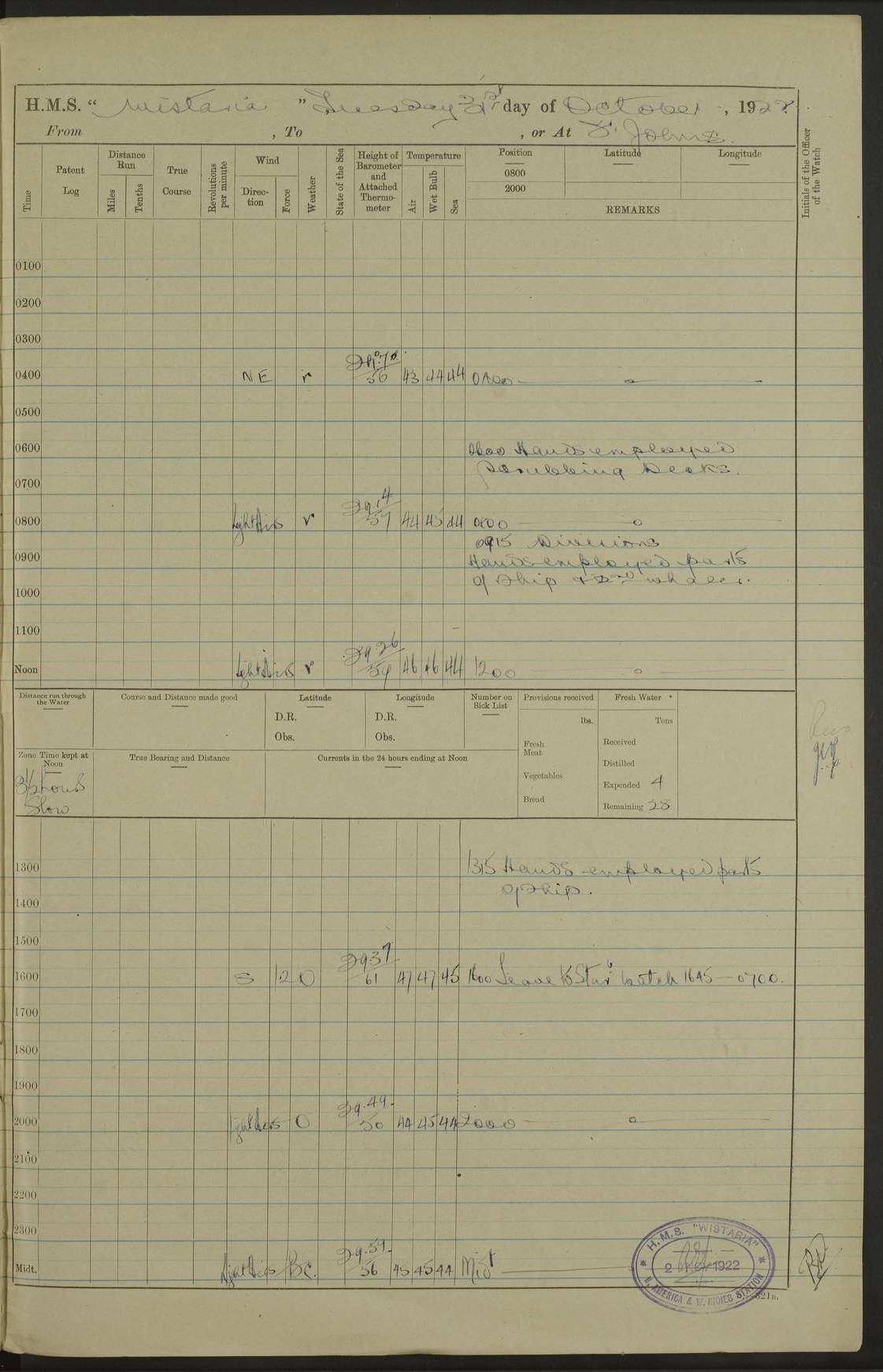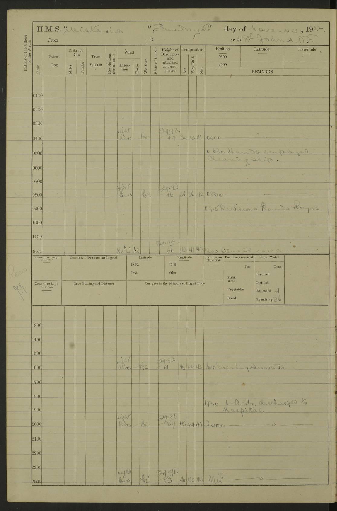 [Signed] A E Johnston, Captain [Signed] F H Alderson Navigating Officer LOGS FOR NOVEMBER 1922 4f73cb16a2fc8ea903000c94: (https://s3.amazonaws.com:443/oldweather/ADM53-93271/0006_0.jpg) 1 November 1922 At St. John’s N.F. Lat 47.56, Long -52.705 9.40am: Hands employed cleaning ship 11.45am: Monthly payment 4f73cb16a2fc8ea903000c95: (https://s3.amazonaws.com:443/oldweather/ADM53-93271/0006_1.jpg) 2 November 1922 At St. John’s N.F. Lat 47.56, Long -52.705 5.30am: 4½” Hemp hawser carried away 6.0am: Hands employed scrubbing decks 8.15am: Hands employed parts of ship 1.15pm: Hands employed parts of ship and about 2nd whaler 4f73cb17a2fc8ea903000c96: (https://s3.amazonaws.com:443/oldweather/ADM53-93271/0007_0.jpg) 3 November 1922 At St. John’s N.F. Lat 47.56, Long -52.705 8.15am: Hands to quarters clean guns 10.0am: Hands employed about 2nd whaler & parts of ship 1.15pm: Q.D. employed with 2½” wire, 2nd whaler & parts of ship 6.15pm: Spring of 2½” wire carried away 4f73cb17a2fc8ea903000c97: (https://s3.amazonaws.com:443/oldweather/ADM53-93271/0007_1.jpg) 4 November 1922 At St. John’s N.F. Lat 47.56, Long -52.705 8.30am: Hands employed part of ship, 2nd whaler, motor boat & 2½” wire 12.45pm: SS “Silvia” leaves harbour 4.30pm: Hauled ship 20 ft ahead [SS “Silvia”: built 1909 as “Orel” for the Russian Voluntary Fleet, 1921 sold to C. T. Bowring & Co., Liverpool, renamed “Silvia”, 1929 transferred to Bermuda & West Indies SS Co., Hamilton, 1935 sold to Douglas SS Co., Hong Kong, renamed “Haitan”, 1950 scrapped. A picture of SS “Silvia” here] 4f73cb17a2fc8ea903000c98: (https://s3.amazonaws.com:443/oldweather/ADM53-93271/0008_0.jpg) 5 November 1922 At St. John’s N.F. Lat 47.56, Long -52.705 6.30am: Hands employed cleaning ship 7.30pm: 1 Ld. Sto. discharged to hospital 4f73cb18a2fc8ea903000c99: (https://s3.amazonaws.com:443/oldweather/ADM53-93271/0008_1.jpg) 6 November 1922 At St. John’s N.F. Lat 47.56, Long -52.705 6.0am: Hands employed scrubbing decks 9.30am: Hands employed parts of ship & boats 1.15pm: Hands employed parts of ship & 2nd whaler 4f73cb18a2fc8ea903000c9a: (https://s3.amazonaws.com:443/oldweather/ADM53-93271/0009_0.jpg) 7 November 1922 At St. John’s N.F. Lat 47.56, Long -52.705 6.15am: Slipped jetty and proceeded to anchorage 7.0am: Came to with Starboard anchor with 3 shackles 7.15am: SS “Digby” leaves harbour; SS “Sachem” proceeds alongside 9.40am: Hands employed about 2nd whaler, painting ship Anchor bearings: Storm Sig FS S85E, Front mark N58W, Chimney N18E pm: Lost by accident: one coir fender 1.15pm: Hands employed about 1st and 2nd whaler, motor boat & parts of ship, painting & repairing fenders [SS “Digby”: built 1913. 1914 commissioned as armed merchant cruiser HMS “Digby”, 1916 renamed “Artois”, 1918 reverted to “Digby”, 1925 transferred to Bermuda & West Indies SS Co, renamed “Dominica”, 1934 sold to United Baltic Co, renamed “Baltrover”, 1939-1944 chartered from United Baltic Co, 1944 returned to owners] [SS “Sachem”: passenger ship built 1893 built by Harland and Wolff for Geo Warren & Co and completed on 28 October 1893. 1927 scrapped.] 4f73cb19a2fc8ea903000c9b: (https://s3.amazonaws.com:443/oldweather/ADM53-93271/0009_1.jpg) 8 November 1922 At St. John’s N.F. Lat 47.56, Long -52.705 6.0am: Hands employed scrubbing decks 9.15am: Hands employed painting parts of ship, refitting fenders, 1st whaler, motor boat, & scraping in battery pm: 1 whalers’ oar broken pm: SS “Sachem” left Harbour 18.00 pm: SS “Manoa” left Harbour 18.55 [Canada Steamship Lines ship “Manoa” (II): built in 1911 by Bremer Vulkan at Vegesack, Germany, and operated as a passenger-cargo ship by the Hamburg-America Line as SS “Wasgenwald”, was chartered for World War I service by the United States Army on 26 October 1917 from the Custom House, New York, and used as a depot collier with the name SS “Shoshone”. In 1920, the vessel was acquired by the American Interlake Line before the Canada Steamship Lines purchased the vessel, renamed her “Manoa” and registered her in London] 4f73cb19a2fc8ea903000c9c: (https://s3.amazonaws.com:443/oldweather/ADM53-93271/0010_0.jpg) 9 November 1922 At St. John’s Lat 47.56, Long -52.705 6.0am: Lowered 2nd whaler. Hands employed scrubbing decks 9.30am: Hands employed about ship's side and painting parts of ship 11.20am: Weighed & proceeded to fresh anchorage, came to with Starboard anchor, 3 shackles pm: One coir fender lost by accident 1.15pm: Hands employed painting ship’s side and painting parts of ship 6.15pm: Hoisted 1st whaler 11.45pm: Let go Port anchor 2 shackles 4f73cb19a2fc8ea903000c9d: (https://s3.amazonaws.com:443/oldweather/ADM53-93271/0010_1.jpg) 10 November 1922 At St. John’s N.F. Lat 47.56, Long -52.705 5.30am: Hands employed scrubbing decks and 1st whaler 6.10am: SS “Javary” left harbour 10.0am: Hands employed painting ship’s side & about boats 1.15pm: Hands employed painting parts of ship & working about boats 4.0pm: Hands to evening quarters, exercise fire stations 4f73cb1aa2fc8ea903000c9e: (https://s3.amazonaws.com:443/oldweather/ADM53-93271/0011_0.jpg) 11 November 1922 At St. John’s N.F. Lat 47.56, Long -52.705 8.35am: Hands to divisions. Muster Ditty Boxes & Helmet Covers 8.45am: Hands employed cleaning ship 10.55am: Divisions 11.0am: Two minute silence 12.30pm: SS “Rosaline” left harbour [SS “Rosaline”: perhaps SS “Rosaline” built 1895] 4f73cb1aa2fc8ea903000c9f: (https://s3.amazonaws.com:443/oldweather/ADM53-93271/0011_1.jpg) 12 November 1922 At St. John’s N.F. Lat 47.56, Long -52.705 6.30am: Hands employed cleaning ship 9.45am: Divisions, Prayers and Rounds 4f73cb1aa2fc8ea903000ca0: (https://s3.amazonaws.com:443/oldweather/ADM53-93271/0012_0.jpg) 13 November 1922 At St. John’s N.F. Lat 47.56, Long -52.705 3.30am: Let go Port anchor 2 shackles 6.0am: Hands employed scrubbing decks & motor boats crew about boats 9