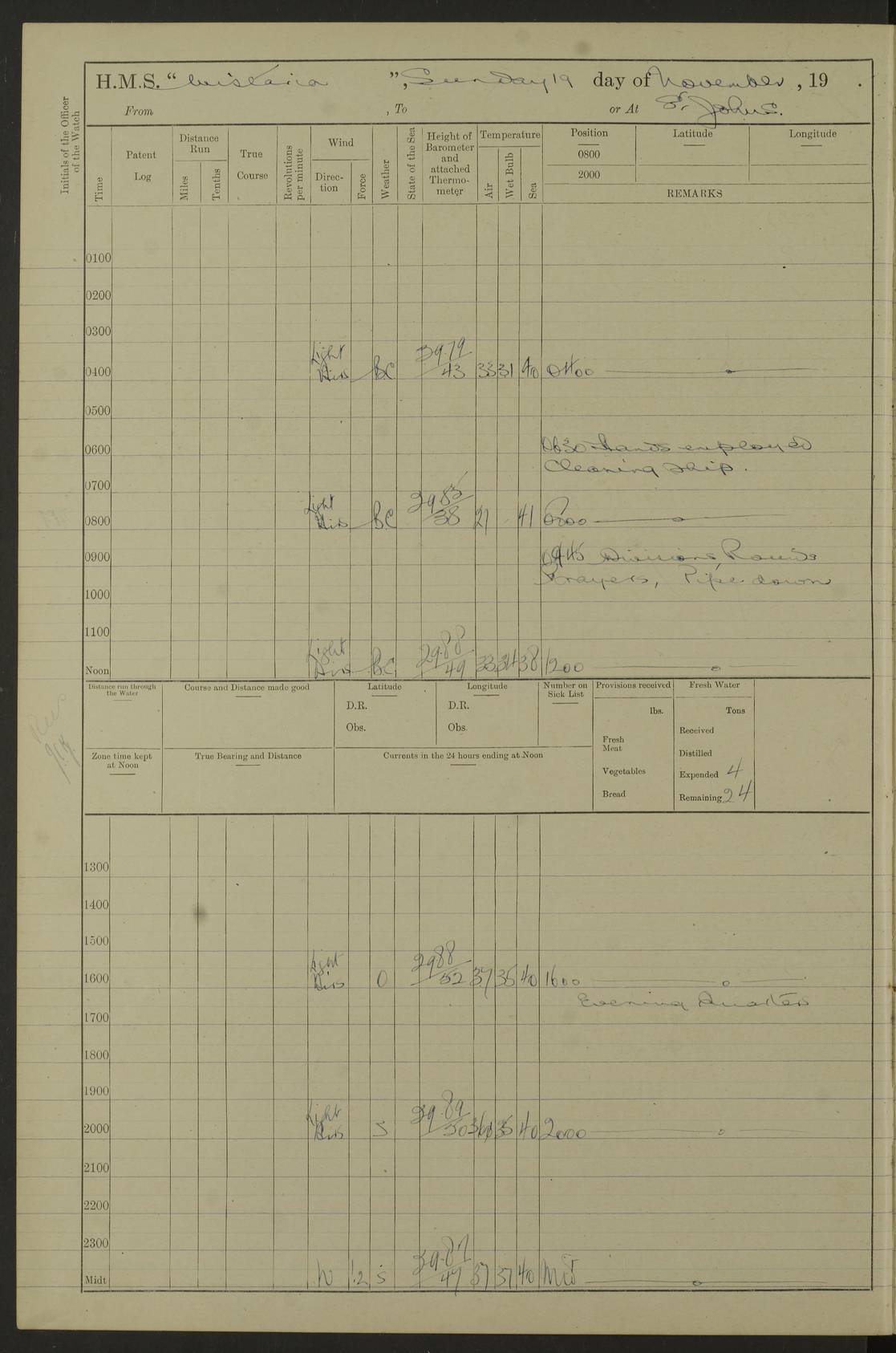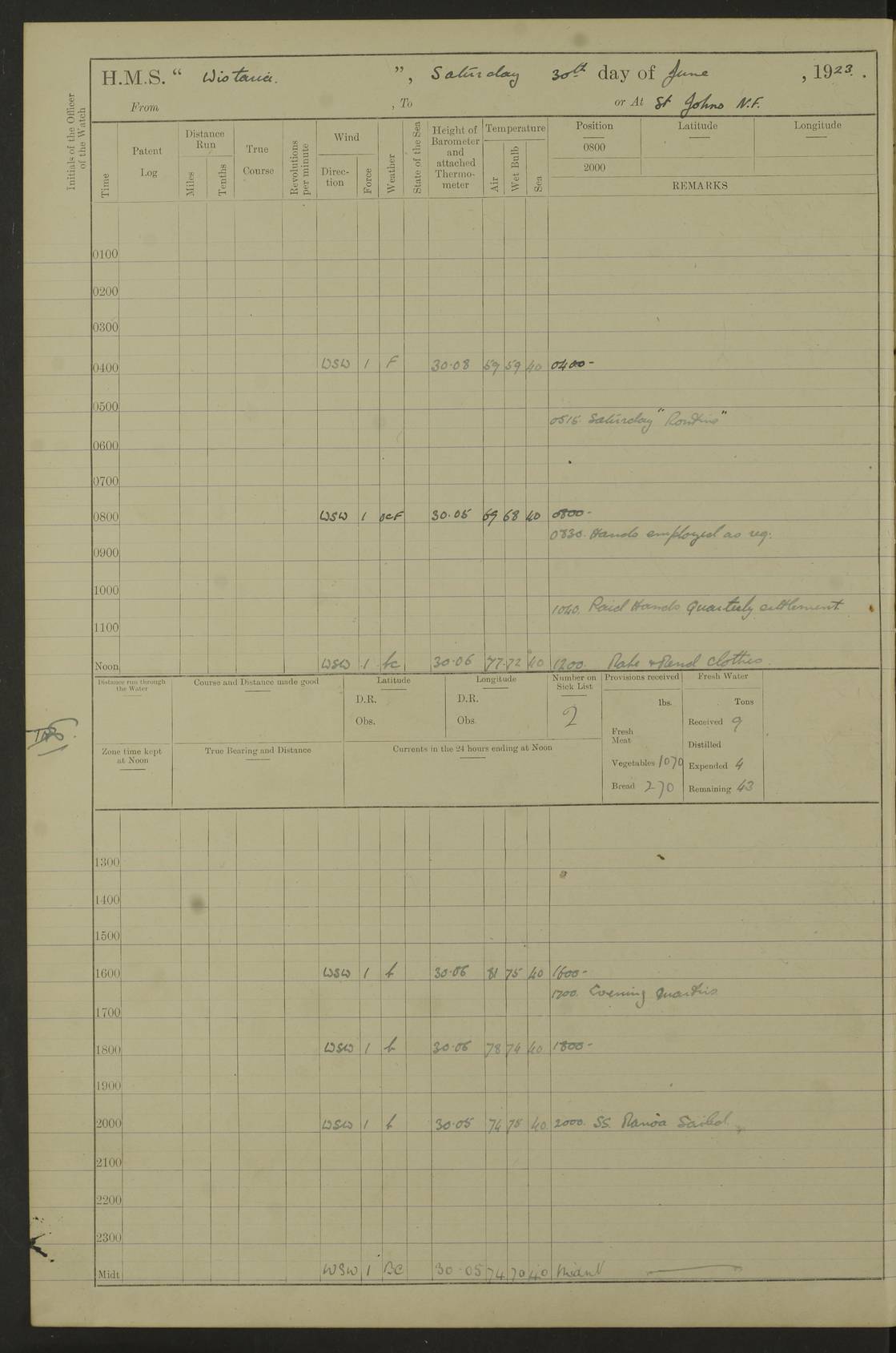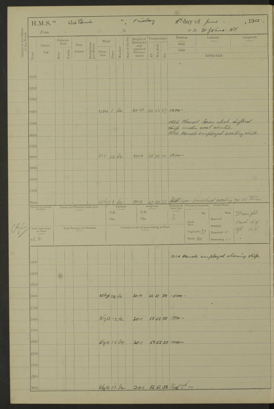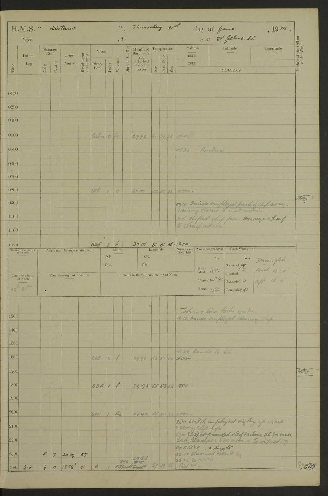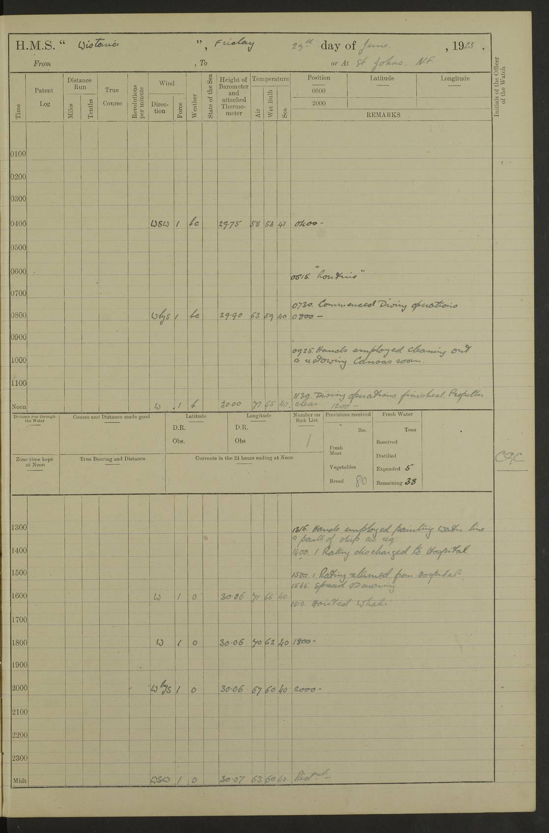 [Signed] A E Johnston, Captain [Signed] F H Alderson Navigating Officer LOGS FOR NOVEMBER 1922 4f73cb16a2fc8ea903000c94: (https://s3.amazonaws.com:443/oldweather/ADM53-93271/0006_0.jpg) 1 November 1922 At St. John’s N.F. Lat 47.56, Long -52.705 9.40am: Hands employed cleaning ship 11.45am: Monthly payment 4f73cb16a2fc8ea903000c95: (https://s3.amazonaws.com:443/oldweather/ADM53-93271/0006_1.jpg) 2 November 1922 At St. John’s N.F. Lat 47.56, Long -52.705 5.30am: 4½” Hemp hawser carried away 6.0am: Hands employed scrubbing decks 8.15am: Hands employed parts of ship 1.15pm: Hands employed parts of ship and about 2nd whaler 4f73cb17a2fc8ea903000c96: (https://s3.amazonaws.com:443/oldweather/ADM53-93271/0007_0.jpg) 3 November 1922 At St. John’s N.F. Lat 47.56, Long -52.705 8.15am: Hands to quarters clean guns 10.0am: Hands employed about 2nd whaler & parts of ship 1.15pm: Q.D. employed with 2½” wire, 2nd whaler & parts of ship 6.15pm: Spring of 2½” wire carried away 4f73cb17a2fc8ea903000c97: (https://s3.amazonaws.com:443/oldweather/ADM53-93271/0007_1.jpg) 4 November 1922 At St. John’s N.F. Lat 47.56, Long -52.705 8.30am: Hands employed part of ship, 2nd whaler, motor boat & 2½” wire 12.45pm: SS “Silvia” leaves harbour 4.30pm: Hauled ship 20 ft ahead [SS “Silvia”: built 1909 as “Orel” for the Russian Voluntary Fleet, 1921 sold to C. T. Bowring & Co., Liverpool, renamed “Silvia”, 1929 transferred to Bermuda & West Indies SS Co., Hamilton, 1935 sold to Douglas SS Co., Hong Kong, renamed “Haitan”, 1950 scrapped. A picture of SS “Silvia” here] 4f73cb17a2fc8ea903000c98: (https://s3.amazonaws.com:443/oldweather/ADM53-93271/0008_0.jpg) 5 November 1922 At St. John’s N.F. Lat 47.56, Long -52.705 6.30am: Hands employed cleaning ship 7.30pm: 1 Ld. Sto. discharged to hospital 4f73cb18a2fc8ea903000c99: (https://s3.amazonaws.com:443/oldweather/ADM53-93271/0008_1.jpg) 6 November 1922 At St. John’s N.F. Lat 47.56, Long -52.705 6.0am: Hands employed scrubbing decks 9.30am: Hands employed parts of ship & boats 1.15pm: Hands employed parts of ship & 2nd whaler 4f73cb18a2fc8ea903000c9a: (https://s3.amazonaws.com:443/oldweather/ADM53-93271/0009_0.jpg) 7 November 1922 At St. John’s N.F. Lat 47.56, Long -52.705 6.15am: Slipped jetty and proceeded to anchorage 7.0am: Came to with Starboard anchor with 3 shackles 7.15am: SS “Digby” leaves harbour; SS “Sachem” proceeds alongside 9.40am: Hands employed about 2nd whaler, painting ship Anchor bearings: Storm Sig FS S85E, Front mark N58W, Chimney N18E pm: Lost by accident: one coir fender 1.15pm: Hands employed about 1st and 2nd whaler, motor boat & parts of ship, painting & repairing fenders [SS “Digby”: built 1913. 1914 commissioned as armed merchant cruiser HMS “Digby”, 1916 renamed “Artois”, 1918 reverted to “Digby”, 1925 transferred to Bermuda & West Indies SS Co, renamed “Dominica”, 1934 sold to United Baltic Co, renamed “Baltrover”, 1939-1944 chartered from United Baltic Co, 1944 returned to owners] [SS “Sachem”: passenger ship built 1893 built by Harland and Wolff for Geo Warren & Co and completed on 28 October 1893. 1927 scrapped.] 4f73cb19a2fc8ea903000c9b: (https://s3.amazonaws.com:443/oldweather/ADM53-93271/0009_1.jpg) 8 November 1922 At St. John’s N.F. Lat 47.56, Long -52.705 6.0am: Hands employed scrubbing decks 9.15am: Hands employed painting parts of ship, refitting fenders, 1st whaler, motor boat, & scraping in battery pm: 1 whalers’ oar broken pm: SS “Sachem” left Harbour 18.00 pm: SS “Manoa” left Harbour 18.55 [Canada Steamship Lines ship “Manoa” (II): built in 1911 by Bremer Vulkan at Vegesack, Germany, and operated as a passenger-cargo ship by the Hamburg-America Line as SS “Wasgenwald”, was chartered for World War I service by the United States Army on 26 October 1917 from the Custom House, New York, and used as a depot collier with the name SS “Shoshone”. In 1920, the vessel was acquired by the American Interlake Line before the Canada Steamship Lines purchased the vessel, renamed her “Manoa” and registered her in London] 4f73cb19a2fc8ea903000c9c: (https://s3.amazonaws.com:443/oldweather/ADM53-93271/0010_0.jpg) 9 November 1922 At St. John’s Lat 47.56, Long -52.705 6.0am: Lowered 2nd whaler. Hands employed scrubbing decks 9.30am: Hands employed about ship's side and painting parts of ship 11.20am: Weighed & proceeded to fresh anchorage, came to with Starboard anchor, 3 shackles pm: One coir fender lost by accident 1.15pm: Hands employed painting ship’s side and painting parts of ship 6.15pm: Hoisted 1st whaler 11.45pm: Let go Port anchor 2 shackles 4f73cb19a2fc8ea903000c9d: (https://s3.amazonaws.com:443/oldweather/ADM53-93271/0010_1.jpg) 10 November 1922 At St. John’s N.F. Lat 47.56, Long -52.705 5.30am: Hands employed scrubbing decks and 1st whaler 6.10am: SS “Javary” left harbour 10.0am: Hands employed painting ship’s side & about boats 1.15pm: Hands employed painting parts of ship & working about boats 4.0pm: Hands to evening quarters, exercise fire stations 4f73cb1aa2fc8ea903000c9e: (https://s3.amazonaws.com:443/oldweather/ADM53-93271/0011_0.jpg) 11 November 1922 At St. John’s N.F. Lat 47.56, Long -52.705 8.35am: Hands to divisions. Muster Ditty Boxes & Helmet Covers 8.45am: Hands employed cleaning ship 10.55am: Divisions 11.0am: Two minute silence 12.30pm: SS “Rosaline” left harbour [SS “Rosaline”: perhaps SS “Rosaline” built 1895] 4f73cb1aa2fc8ea903000c9f: (https://s3.amazonaws.com:443/oldweather/ADM53-93271/0011_1.jpg) 12 November 1922 At St. John’s N.F. Lat 47.56, Long -52.705 6.30am: Hands employed cleaning ship 9.45am: Divisions, Prayers and Rounds 4f73cb1aa2fc8ea903000ca0: (https://s3.amazonaws.com:443/oldweather/ADM53-93271/0012_0.jpg) 13 November 1922 At St. John’s N.F. Lat 47.56, Long -52.705 3.30am: Let go Port anchor 2 shackles 6.0am: Hands employed scrubbing decks & motor boats crew about boats 9