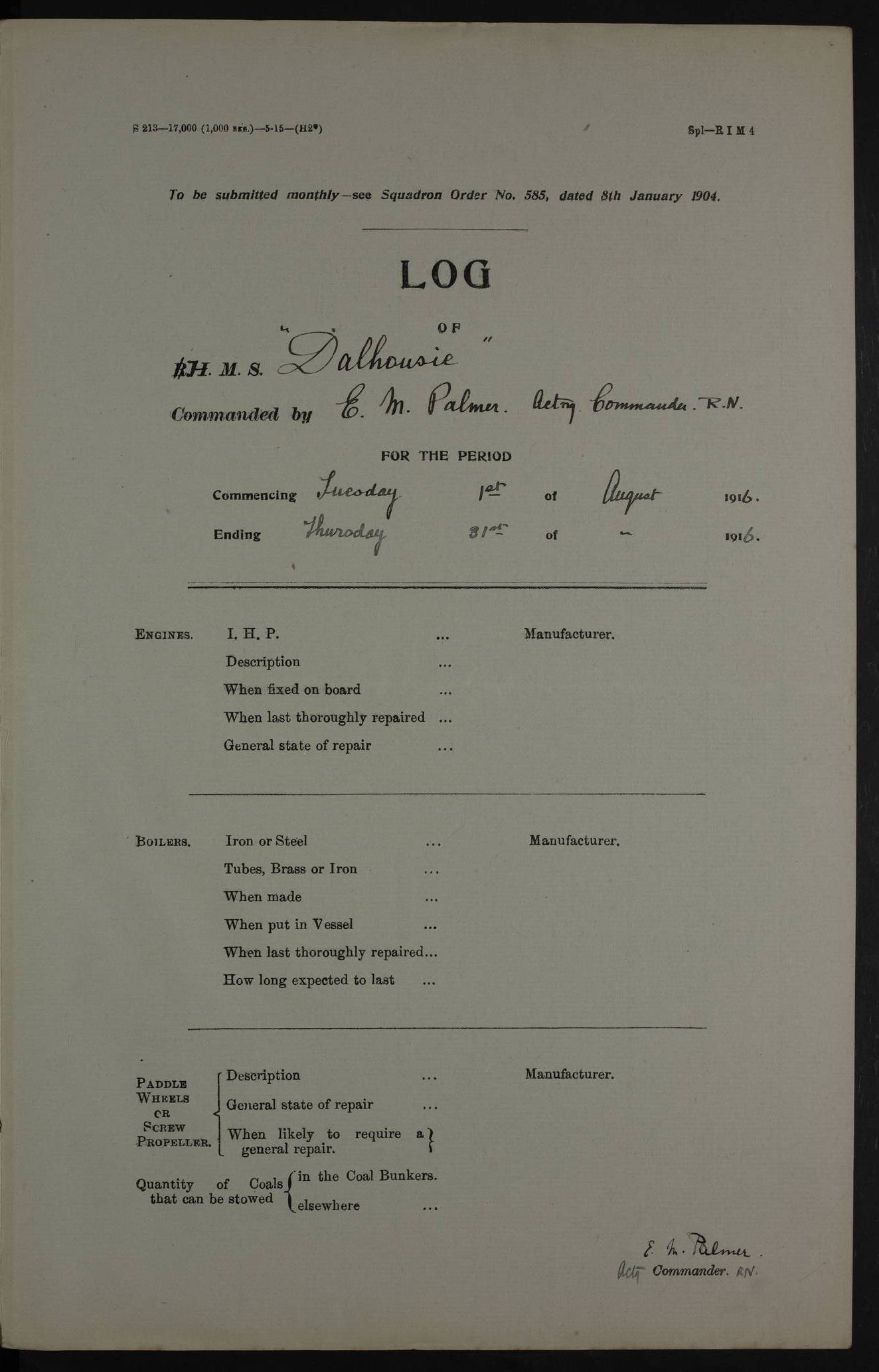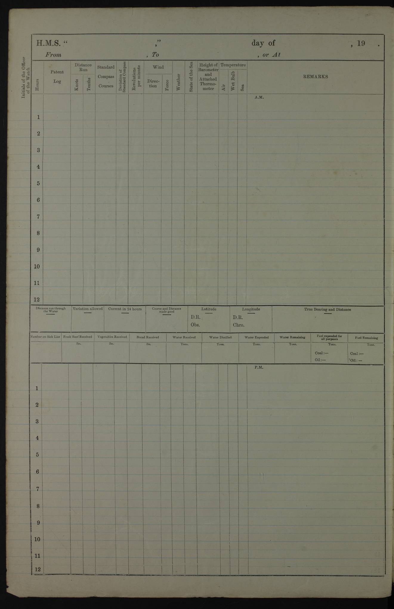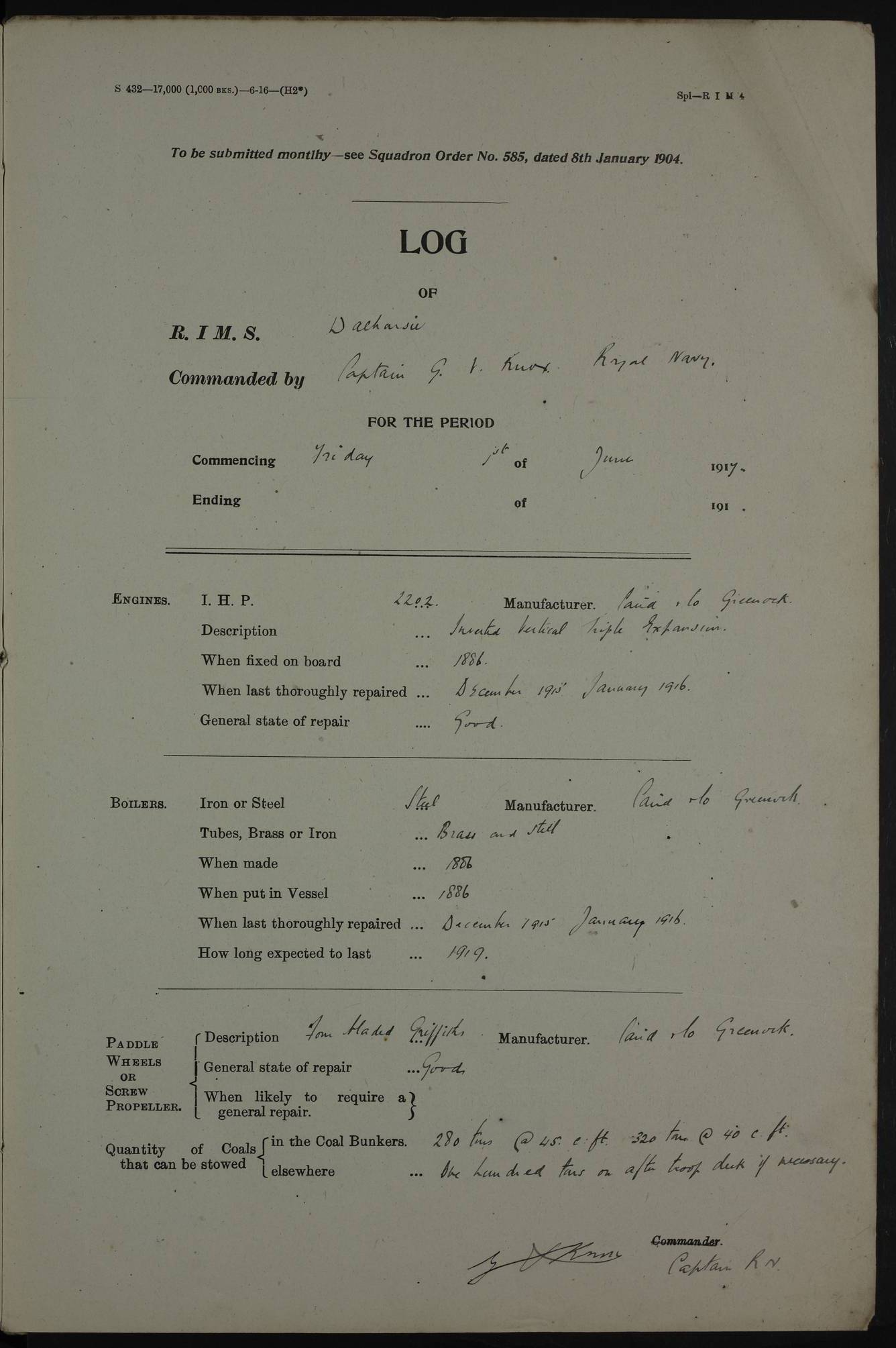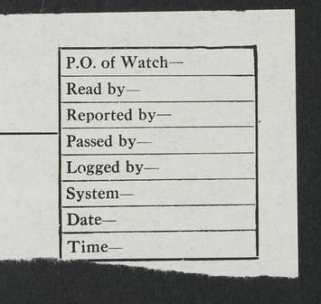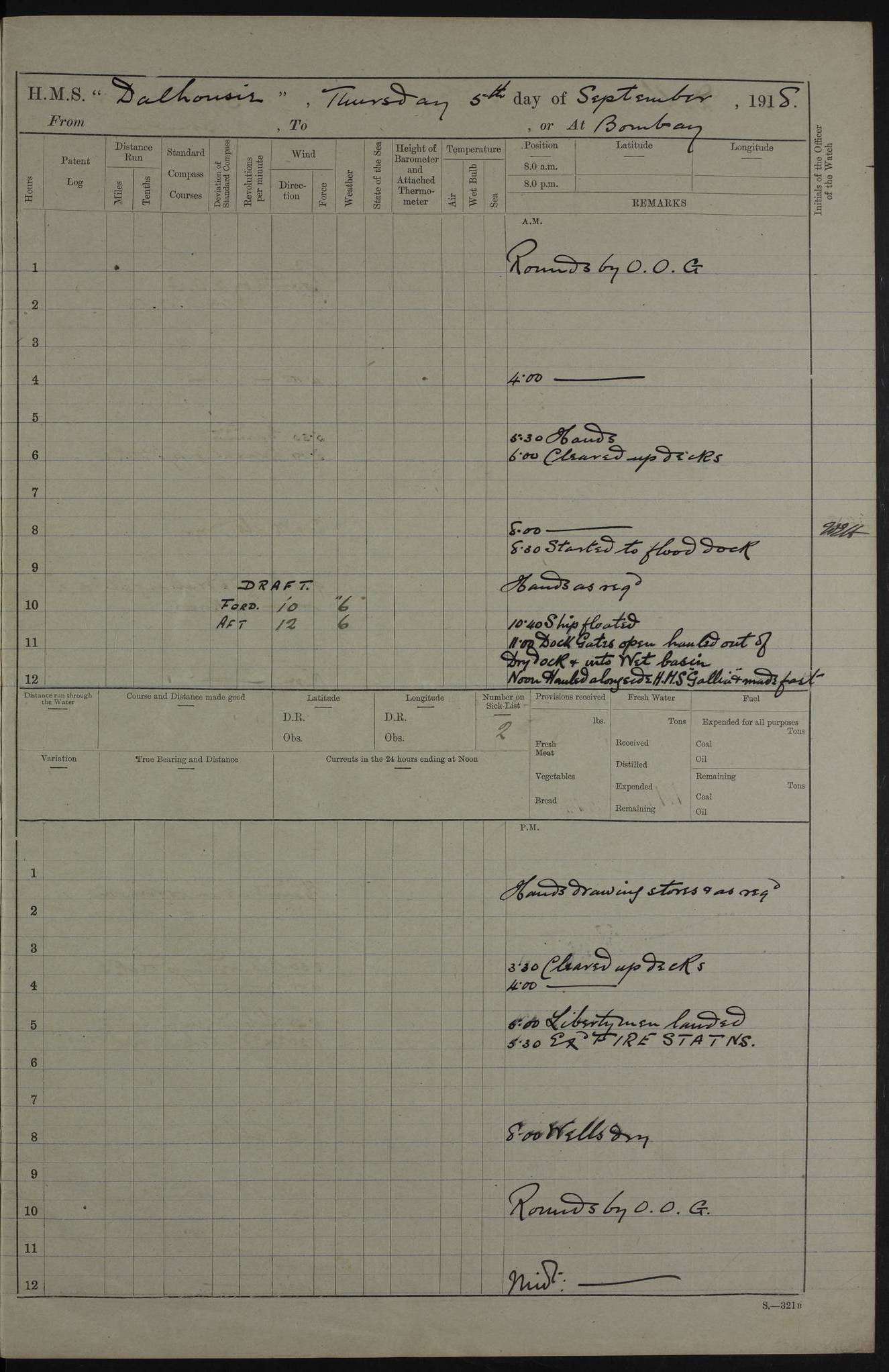 PM - Discharged To Shore Sentry: T Jackson, Petty Officer 1st – J Golden, Stoker – J Tarney, Royal Navy Reserve Trawler Section – H Hopkins, Stoker Royal Navy Reserve – J Donegan Royal Navy Reserve Trawler Section To Hospital: J Orman, Leading Seaman – Dullah Hammed, Seedie Top 6 Mess: M McMillan, Able Seaman Royal Navy Reserve To SS EGRA: C Ray, Engineer Royal Navy Reserve Trawler Section – E Cliorum Royal Navy Reserve Trawler Section – A Campbell, Stoker Royal Navy Reserve Trawler Section – G Bailey Royal Navy Reserve Trawler Section – C Woodward Chief Petty Officer – C Sell, Chief Stoker – R Apps, Chief Stoker – H Farmer Leading Hand Royal Navy Reserve Trawler Section – G Kelly, Able Seaman Royal Navy Reserve – J Ramsey, 2nd Hand 4ef4fa93e53e0a0c910056e3: (https://s3.amazonaws.com:443/oldweather/ADM53-39392/0018_1.jpg) Log Page - Blank 4ef4fa93e53e0a0c910056e4: (https://s3.amazonaws.com:443/oldweather/ADM53-39392/0019_0.jpg) Log Page - Blank 4ef4fa93e53e0a0c910056e5: (https://s3.amazonaws.com:443/oldweather/ADM53-39392/0019_1.jpg) Log Page - Blank 4ef4fa94e53e0a0c910056e6: (https://s3.amazonaws.com:443/oldweather/ADM53-39392/0020_0.jpg) Log Page - Blank 4ef4fa94e53e0a0c910056e7: (https://s3.amazonaws.com:443/oldweather/ADM53-39392/0020_1.jpg) Log Page – Blank LOGS FOR SEPTEMBER 1916 4ef4fa94e53e0a0c910056e8: (https://s3.amazonaws.com:443/oldweather/ADM53-39393/0000_0.jpg) Log Page – Cover September 1916 4ef4fa94e53e0a0c910056e9: (https://s3.amazonaws.com:443/oldweather/ADM53-39393/0000_1.jpg) Log Page – Cover September 1916 4ef4fa95e53e0a0c910056ea: (https://s3.amazonaws.com:443/oldweather/ADM53-39393/0001_0.jpg) Log Page – Blank 4ef4fa95e53e0a0c910056eb: (https://s3.amazonaws.com:443/oldweather/ADM53-39393/0001_1.jpg) Log Page – Blank 4ef4fa95e53e0a0c910056ec: (https://s3.amazonaws.com:443/oldweather/ADM53-39393/0002_0.jpg) Log Page – Blank 4ef4fa95e53e0a0c910056ed: (https://s3.amazonaws.com:443/oldweather/ADM53-39393/0002_1.jpg) Log Page – Specifications 4ef4fa95e53e0a0c910056ee: (https://s3.amazonaws.com:443/oldweather/ADM53-39393/0003_0.jpg) Log Page – Directions for Weather reporting 4ef4fa95e53e0a0c910056ef: (https://s3.amazonaws.com:443/oldweather/ADM53-39393/0003_1.jpg) Log Page – Specifications 4ef4fa96e53e0a0c910056f0: (https://s3.amazonaws.com:443/oldweather/ADM53-39393/0004_0.jpg) 1 September 1916 Place: Basrah Lat 30.5269, Long 47.8407 2:00am: Rounds 5:30am: Hands 6:00am: Morning Routine 6:45am: IMOGENE shifted billet 8:00am: Wells dry - Signal Books Correct 9:30am: Divisions - Hands cleaning out fresh water tank on fore troop deck & paint work on Main Deck – fitting man ropes to Port after gangway 11:00am: Paid ship’s company for full month of August – Muster by Open List 12:00pm: Signal Books Correct 12:30pm: Piped Down 4:00pm: Signal Books Correct 4:30pm: Cleared up decks – Naval Ratings mustered for Monthly payment 5:00pm: Evening Quarters – Leave to Watch of Naval Ratings 5:40pm: Hospital Ship SICILIA passed up 7:00pm: Sunset - Fire Gear in readiness 7:30pm: Liberty men returned 8:00pm: Wells dry - Signal Books Correct 9:00pm: Rounds - Signal Books Correct AM – Joined From Motor Launch 20: A Murray Royal Naval Reserve Trawler Section AM – Discharged TO Shore: Habib, Seedie PM – Joined From Motor Launch 16: J Brophy, Trimmer From Motor Launch 20: T Gardner, Royal Naval Reserve Trawler Section From Motor Launch 9: G Skelly, Trimmer PM – Discharged To Hospital: No. 2053 Sieker Merya, Stoker – No. 2008 Handoo Alefkhan 4ef4fa96e53e0a0c910056f1: (https://s3.amazonaws.com:443/oldweather/ADM53-39393/0004_1.jpg) 2 September 1916 Place: Basrah Lat 30.5269, Long 47.8407 2:00am: Rounds 5:30am: Hands 6:00am: Morning Routine 8:00am: Wells dry - Signal Books Correct 9:30am: Saturday Morning Routine & cleaning fresh water tank on after troop deck. Taking in stores from Motor Launch 13 12:00pm: Signal Books Correct 12:30pm: Piped Down 2:20pm: Hospital Ship SICILIA passed down 4:00pm: Signal Books Correct 4:30pm: Cleared up decks 5:00pm: Evening Quarters – Leave to Watch of Naval Ratings 7:00pm: Sunset - Fire Gear in readiness 7:30pm: Liberty men returned 8:00pm: Wells dry - Signal Books Correct 9:00pm: Rounds - Signal Books Correct 11:00pm: Destroyed 28 tins Milk being unfit for use. – Lost overboard by accident at night lantern, tin, one in No. AM – Joined From ALERT: L Scott, Stoker – A Turner, Able Seaman From GNAT: M. Ford, Chief petty Officer AM – Discharged TO Patrol 24 for Motor Launch 12: L Golden, Stoker TO Patrol 24 for Motor Launch 6: H Hopkins Stoker Royal Naval Reserve TO Patrol 24 for Motor Launch 1: J Donegan Royal Naval Reserve Trawler Section PM – Joined From GNAT: W Tweeddle, Able Seaman PM - Discharged To Hospital: M McMilan, Seaman Royal Naval Reserve – J Shelly, Trimmer – J Brophy, Trimmer – J Gardner, Trimmer – J A Stevens, Carpenter’s Crew 4ef4fa96e53e0a0c910056f2: (https://s3.amazonaws.com:443/oldweather/ADM53-39393/0005_0.jpg) 3 September 1916 Place: Basrah Lat 30.5269, Long 47.8407 2:00am: Rounds 5:15am: GNAT left up river 5:30am: Hands 6:00am: Morning Routine 6:45am: Church of England party landed 7:30am: Roman Catholic Church party landed 7:55am: Hospital Ship VARSOVA passed up river 8:00am: Wells dry – Signal Books Correct 8:30am: Church parties returned 9:45am: Divisions – Piped down – Liberty to some Lascars & Stokers 12:00pm: Signal Books Correct – Issued Quinine to ship’s company 12:30pm: Piped Down 4:00pm: Signal Books Correct 4:30pm: Cleared up decks 5:00pm: Evening Quarters – Leave to Watch of Naval Ratings 6:25pm: Hospital Ship VARSOVA passed down river 7:00pm: Sunset - Fire Gear in readiness 7:30pm: Liberty men returned 8:00pm: Wells dry - Signal Books Correct 9:00pm: Rounds - Signal Books Correct PM – Joined From Motor Launch 8: S Kent, Chief Stoker From Hospital: C Healey, Officer’s Cook 4ef4fa96e53e0a0c910056f3: (https://s3.amazonaws.com:443