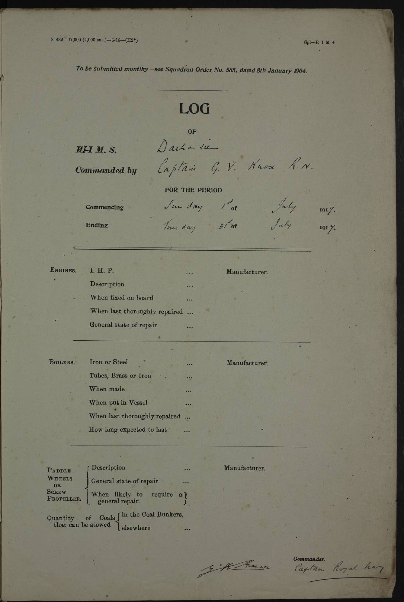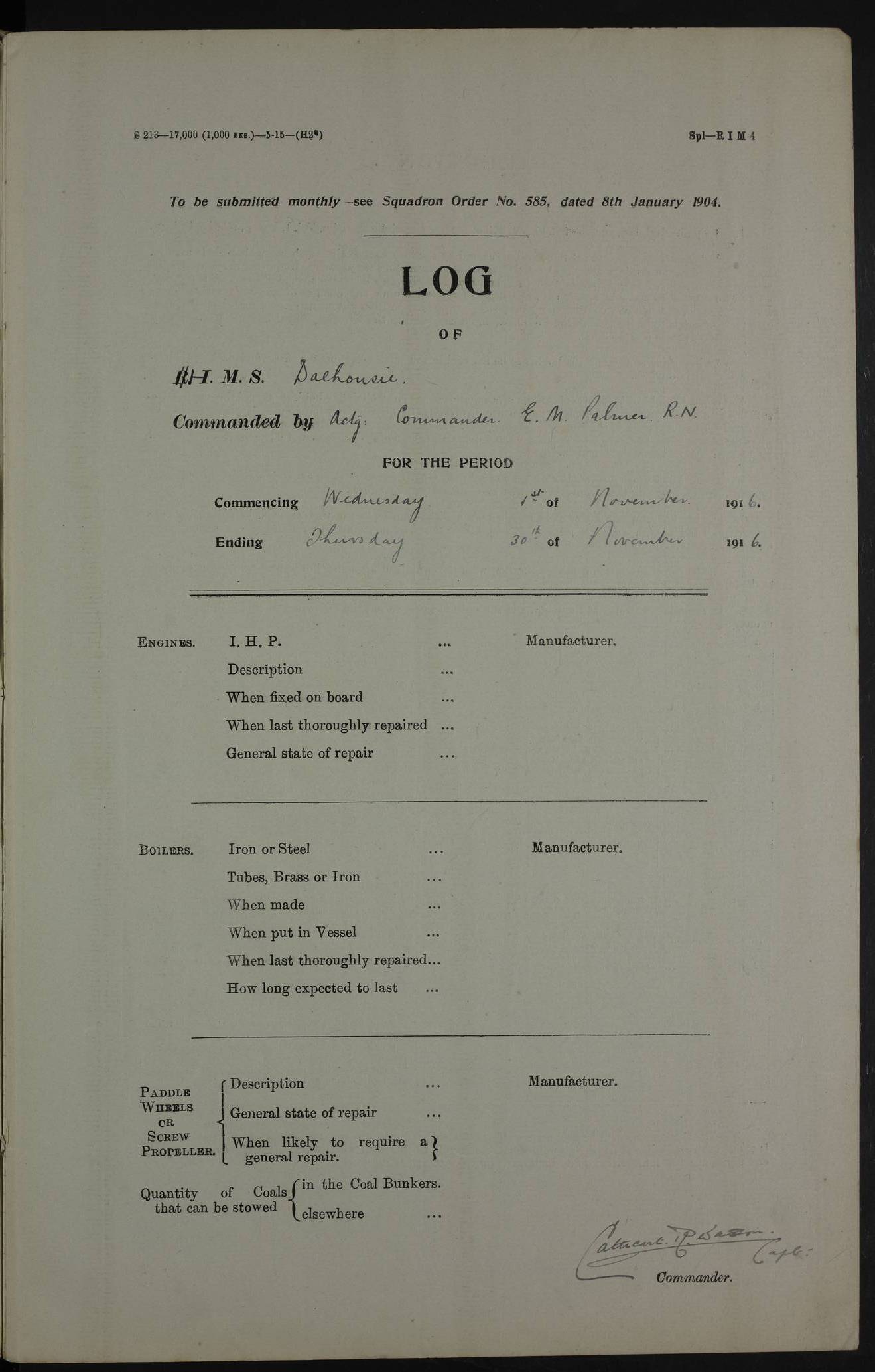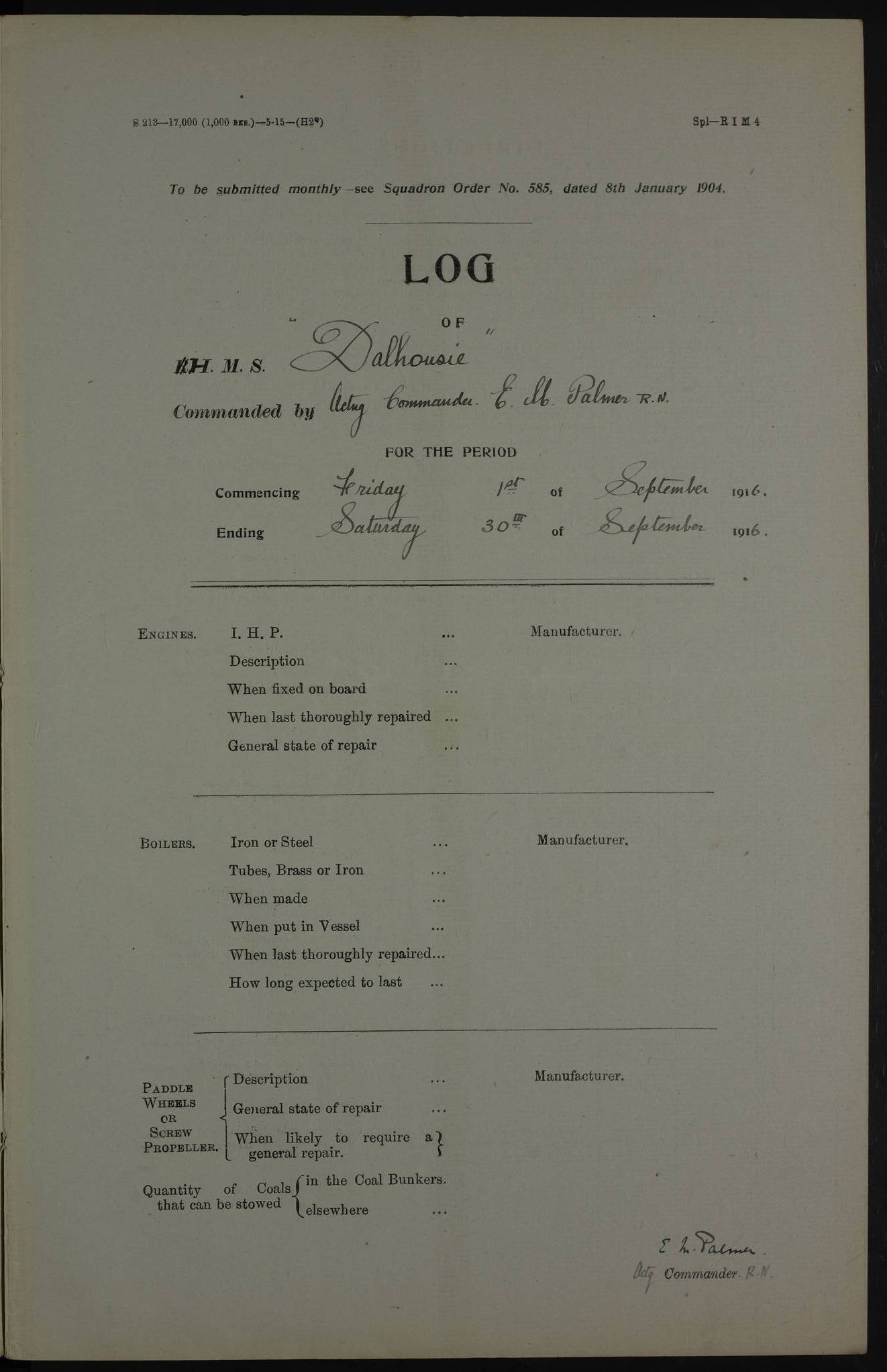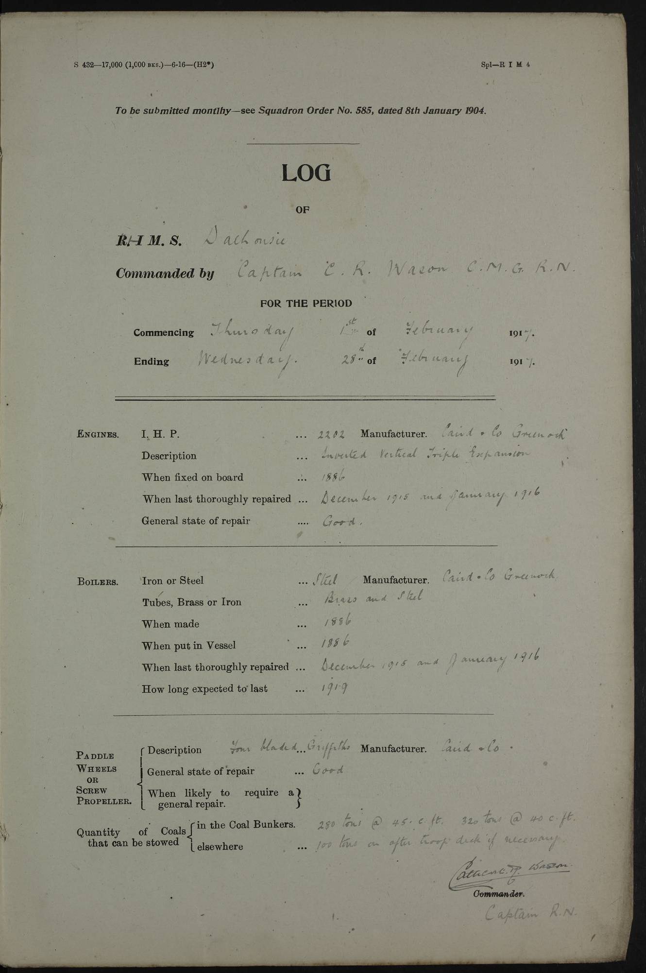 PM - Discharged To Shore Sentry: T Jackson, Petty Officer 1st – J Golden, Stoker – J Tarney, Royal Navy Reserve Trawler Section – H Hopkins, Stoker Royal Navy Reserve – J Donegan Royal Navy Reserve Trawler Section To Hospital: J Orman, Leading Seaman – Dullah Hammed, Seedie Top 6 Mess: M McMillan, Able Seaman Royal Navy Reserve To SS EGRA: C Ray, Engineer Royal Navy Reserve Trawler Section – E Cliorum Royal Navy Reserve Trawler Section – A Campbell, Stoker Royal Navy Reserve Trawler Section – G Bailey Royal Navy Reserve Trawler Section – C Woodward Chief Petty Officer – C Sell, Chief Stoker – R Apps, Chief Stoker – H Farmer Leading Hand Royal Navy Reserve Trawler Section – G Kelly, Able Seaman Royal Navy Reserve – J Ramsey, 2nd Hand 4ef4fa93e53e0a0c910056e3: (https://s3.amazonaws.com:443/oldweather/ADM53-39392/0018_1.jpg) Log Page - Blank 4ef4fa93e53e0a0c910056e4: (https://s3.amazonaws.com:443/oldweather/ADM53-39392/0019_0.jpg) Log Page - Blank 4ef4fa93e53e0a0c910056e5: (https://s3.amazonaws.com:443/oldweather/ADM53-39392/0019_1.jpg) Log Page - Blank 4ef4fa94e53e0a0c910056e6: (https://s3.amazonaws.com:443/oldweather/ADM53-39392/0020_0.jpg) Log Page - Blank 4ef4fa94e53e0a0c910056e7: (https://s3.amazonaws.com:443/oldweather/ADM53-39392/0020_1.jpg) Log Page – Blank LOGS FOR SEPTEMBER 1916 4ef4fa94e53e0a0c910056e8: (https://s3.amazonaws.com:443/oldweather/ADM53-39393/0000_0.jpg) Log Page – Cover September 1916 4ef4fa94e53e0a0c910056e9: (https://s3.amazonaws.com:443/oldweather/ADM53-39393/0000_1.jpg) Log Page – Cover September 1916 4ef4fa95e53e0a0c910056ea: (https://s3.amazonaws.com:443/oldweather/ADM53-39393/0001_0.jpg) Log Page – Blank 4ef4fa95e53e0a0c910056eb: (https://s3.amazonaws.com:443/oldweather/ADM53-39393/0001_1.jpg) Log Page – Blank 4ef4fa95e53e0a0c910056ec: (https://s3.amazonaws.com:443/oldweather/ADM53-39393/0002_0.jpg) Log Page – Blank 4ef4fa95e53e0a0c910056ed: (https://s3.amazonaws.com:443/oldweather/ADM53-39393/0002_1.jpg) Log Page – Specifications 4ef4fa95e53e0a0c910056ee: (https://s3.amazonaws.com:443/oldweather/ADM53-39393/0003_0.jpg) Log Page – Directions for Weather reporting 4ef4fa95e53e0a0c910056ef: (https://s3.amazonaws.com:443/oldweather/ADM53-39393/0003_1.jpg) Log Page – Specifications 4ef4fa96e53e0a0c910056f0: (https://s3.amazonaws.com:443/oldweather/ADM53-39393/0004_0.jpg) 1 September 1916 Place: Basrah Lat 30.5269, Long 47.8407 2:00am: Rounds 5:30am: Hands 6:00am: Morning Routine 6:45am: IMOGENE shifted billet 8:00am: Wells dry - Signal Books Correct 9:30am: Divisions - Hands cleaning out fresh water tank on fore troop deck & paint work on Main Deck – fitting man ropes to Port after gangway 11:00am: Paid ship’s company for full month of August – Muster by Open List 12:00pm: Signal Books Correct 12:30pm: Piped Down 4:00pm: Signal Books Correct 4:30pm: Cleared up decks – Naval Ratings mustered for Monthly payment 5:00pm: Evening Quarters – Leave to Watch of Naval Ratings 5:40pm: Hospital Ship SICILIA passed up 7:00pm: Sunset - Fire Gear in readiness 7:30pm: Liberty men returned 8:00pm: Wells dry - Signal Books Correct 9:00pm: Rounds - Signal Books Correct AM – Joined From Motor Launch 20: A Murray Royal Naval Reserve Trawler Section AM – Discharged TO Shore: Habib, Seedie PM – Joined From Motor Launch 16: J Brophy, Trimmer From Motor Launch 20: T Gardner, Royal Naval Reserve Trawler Section From Motor Launch 9: G Skelly, Trimmer PM – Discharged To Hospital: No. 2053 Sieker Merya, Stoker – No. 2008 Handoo Alefkhan 4ef4fa96e53e0a0c910056f1: (https://s3.amazonaws.com:443/oldweather/ADM53-39393/0004_1.jpg) 2 September 1916 Place: Basrah Lat 30.5269, Long 47.8407 2:00am: Rounds 5:30am: Hands 6:00am: Morning Routine 8:00am: Wells dry - Signal Books Correct 9:30am: Saturday Morning Routine & cleaning fresh water tank on after troop deck. Taking in stores from Motor Launch 13 12:00pm: Signal Books Correct 12:30pm: Piped Down 2:20pm: Hospital Ship SICILIA passed down 4:00pm: Signal Books Correct 4:30pm: Cleared up decks 5:00pm: Evening Quarters – Leave to Watch of Naval Ratings 7:00pm: Sunset - Fire Gear in readiness 7:30pm: Liberty men returned 8:00pm: Wells dry - Signal Books Correct 9:00pm: Rounds - Signal Books Correct 11:00pm: Destroyed 28 tins Milk being unfit for use. – Lost overboard by accident at night lantern, tin, one in No. AM – Joined From ALERT: L Scott, Stoker – A Turner, Able Seaman From GNAT: M. Ford, Chief petty Officer AM – Discharged TO Patrol 24 for Motor Launch 12: L Golden, Stoker TO Patrol 24 for Motor Launch 6: H Hopkins Stoker Royal Naval Reserve TO Patrol 24 for Motor Launch 1: J Donegan Royal Naval Reserve Trawler Section PM – Joined From GNAT: W Tweeddle, Able Seaman PM - Discharged To Hospital: M McMilan, Seaman Royal Naval Reserve – J Shelly, Trimmer – J Brophy, Trimmer – J Gardner, Trimmer – J A Stevens, Carpenter’s Crew 4ef4fa96e53e0a0c910056f2: (https://s3.amazonaws.com:443/oldweather/ADM53-39393/0005_0.jpg) 3 September 1916 Place: Basrah Lat 30.5269, Long 47.8407 2:00am: Rounds 5:15am: GNAT left up river 5:30am: Hands 6:00am: Morning Routine 6:45am: Church of England party landed 7:30am: Roman Catholic Church party landed 7:55am: Hospital Ship VARSOVA passed up river 8:00am: Wells dry – Signal Books Correct 8:30am: Church parties returned 9:45am: Divisions – Piped down – Liberty to some Lascars & Stokers 12:00pm: Signal Books Correct – Issued Quinine to ship’s company 12:30pm: Piped Down 4:00pm: Signal Books Correct 4:30pm: Cleared up decks 5:00pm: Evening Quarters – Leave to Watch of Naval Ratings 6:25pm: Hospital Ship VARSOVA passed down river 7:00pm: Sunset - Fire Gear in readiness 7:30pm: Liberty men returned 8:00pm: Wells dry - Signal Books Correct 9:00pm: Rounds - Signal Books Correct PM – Joined From Motor Launch 8: S Kent, Chief Stoker From Hospital: C Healey, Officer’s Cook 4ef4fa96e53e0a0c910056f3: (https://s3.amazonaws.com:443