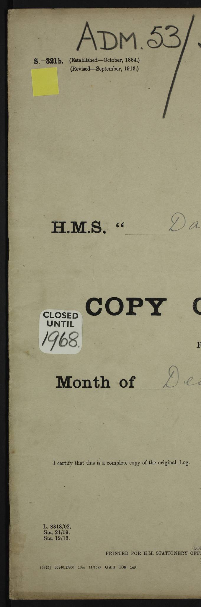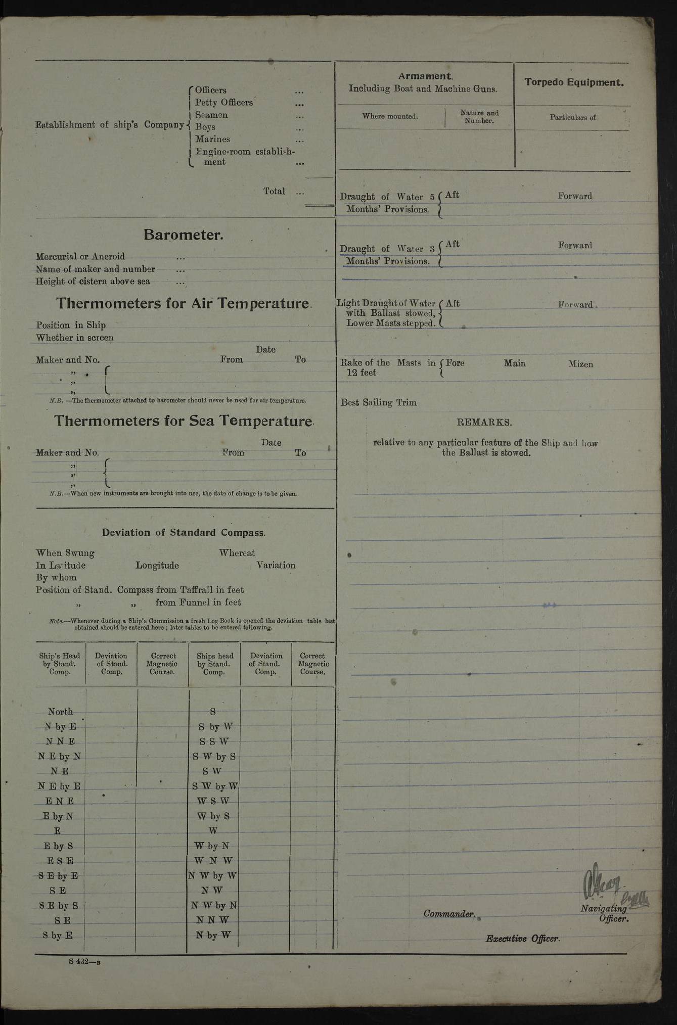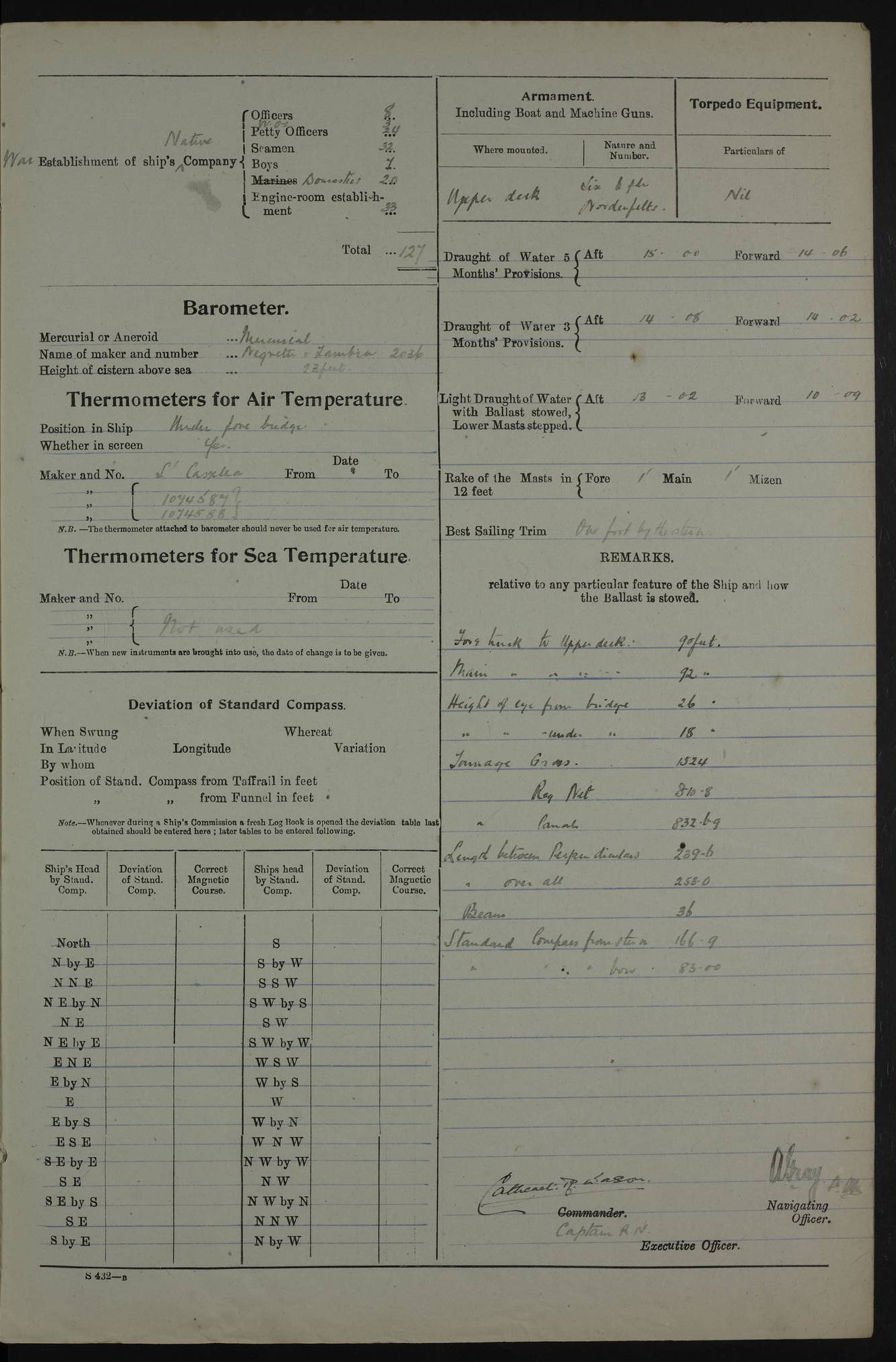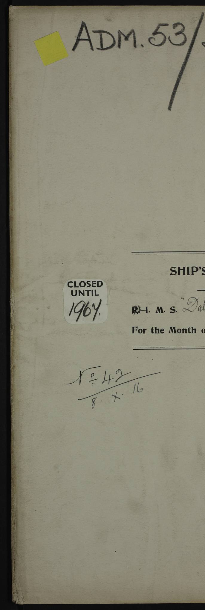 PM - Discharged To Shore Sentry: T Jackson, Petty Officer 1st – J Golden, Stoker – J Tarney, Royal Navy Reserve Trawler Section – H Hopkins, Stoker Royal Navy Reserve – J Donegan Royal Navy Reserve Trawler Section To Hospital: J Orman, Leading Seaman – Dullah Hammed, Seedie Top 6 Mess: M McMillan, Able Seaman Royal Navy Reserve To SS EGRA: C Ray, Engineer Royal Navy Reserve Trawler Section – E Cliorum Royal Navy Reserve Trawler Section – A Campbell, Stoker Royal Navy Reserve Trawler Section – G Bailey Royal Navy Reserve Trawler Section – C Woodward Chief Petty Officer – C Sell, Chief Stoker – R Apps, Chief Stoker – H Farmer Leading Hand Royal Navy Reserve Trawler Section – G Kelly, Able Seaman Royal Navy Reserve – J Ramsey, 2nd Hand 4ef4fa93e53e0a0c910056e3: (https://s3.amazonaws.com:443/oldweather/ADM53-39392/0018_1.jpg) Log Page - Blank 4ef4fa93e53e0a0c910056e4: (https://s3.amazonaws.com:443/oldweather/ADM53-39392/0019_0.jpg) Log Page - Blank 4ef4fa93e53e0a0c910056e5: (https://s3.amazonaws.com:443/oldweather/ADM53-39392/0019_1.jpg) Log Page - Blank 4ef4fa94e53e0a0c910056e6: (https://s3.amazonaws.com:443/oldweather/ADM53-39392/0020_0.jpg) Log Page - Blank 4ef4fa94e53e0a0c910056e7: (https://s3.amazonaws.com:443/oldweather/ADM53-39392/0020_1.jpg) Log Page – Blank LOGS FOR SEPTEMBER 1916 4ef4fa94e53e0a0c910056e8: (https://s3.amazonaws.com:443/oldweather/ADM53-39393/0000_0.jpg) Log Page – Cover September 1916 4ef4fa94e53e0a0c910056e9: (https://s3.amazonaws.com:443/oldweather/ADM53-39393/0000_1.jpg) Log Page – Cover September 1916 4ef4fa95e53e0a0c910056ea: (https://s3.amazonaws.com:443/oldweather/ADM53-39393/0001_0.jpg) Log Page – Blank 4ef4fa95e53e0a0c910056eb: (https://s3.amazonaws.com:443/oldweather/ADM53-39393/0001_1.jpg) Log Page – Blank 4ef4fa95e53e0a0c910056ec: (https://s3.amazonaws.com:443/oldweather/ADM53-39393/0002_0.jpg) Log Page – Blank 4ef4fa95e53e0a0c910056ed: (https://s3.amazonaws.com:443/oldweather/ADM53-39393/0002_1.jpg) Log Page – Specifications 4ef4fa95e53e0a0c910056ee: (https://s3.amazonaws.com:443/oldweather/ADM53-39393/0003_0.jpg) Log Page – Directions for Weather reporting 4ef4fa95e53e0a0c910056ef: (https://s3.amazonaws.com:443/oldweather/ADM53-39393/0003_1.jpg) Log Page – Specifications 4ef4fa96e53e0a0c910056f0: (https://s3.amazonaws.com:443/oldweather/ADM53-39393/0004_0.jpg) 1 September 1916 Place: Basrah Lat 30.5269, Long 47.8407 2:00am: Rounds 5:30am: Hands 6:00am: Morning Routine 6:45am: IMOGENE shifted billet 8:00am: Wells dry - Signal Books Correct 9:30am: Divisions - Hands cleaning out fresh water tank on fore troop deck & paint work on Main Deck – fitting man ropes to Port after gangway 11:00am: Paid ship’s company for full month of August – Muster by Open List 12:00pm: Signal Books Correct 12:30pm: Piped Down 4:00pm: Signal Books Correct 4:30pm: Cleared up decks – Naval Ratings mustered for Monthly payment 5:00pm: Evening Quarters – Leave to Watch of Naval Ratings 5:40pm: Hospital Ship SICILIA passed up 7:00pm: Sunset - Fire Gear in readiness 7:30pm: Liberty men returned 8:00pm: Wells dry - Signal Books Correct 9:00pm: Rounds - Signal Books Correct AM – Joined From Motor Launch 20: A Murray Royal Naval Reserve Trawler Section AM – Discharged TO Shore: Habib, Seedie PM – Joined From Motor Launch 16: J Brophy, Trimmer From Motor Launch 20: T Gardner, Royal Naval Reserve Trawler Section From Motor Launch 9: G Skelly, Trimmer PM – Discharged To Hospital: No. 2053 Sieker Merya, Stoker – No. 2008 Handoo Alefkhan 4ef4fa96e53e0a0c910056f1: (https://s3.amazonaws.com:443/oldweather/ADM53-39393/0004_1.jpg) 2 September 1916 Place: Basrah Lat 30.5269, Long 47.8407 2:00am: Rounds 5:30am: Hands 6:00am: Morning Routine 8:00am: Wells dry - Signal Books Correct 9:30am: Saturday Morning Routine & cleaning fresh water tank on after troop deck. Taking in stores from Motor Launch 13 12:00pm: Signal Books Correct 12:30pm: Piped Down 2:20pm: Hospital Ship SICILIA passed down 4:00pm: Signal Books Correct 4:30pm: Cleared up decks 5:00pm: Evening Quarters – Leave to Watch of Naval Ratings 7:00pm: Sunset - Fire Gear in readiness 7:30pm: Liberty men returned 8:00pm: Wells dry - Signal Books Correct 9:00pm: Rounds - Signal Books Correct 11:00pm: Destroyed 28 tins Milk being unfit for use. – Lost overboard by accident at night lantern, tin, one in No. AM – Joined From ALERT: L Scott, Stoker – A Turner, Able Seaman From GNAT: M. Ford, Chief petty Officer AM – Discharged TO Patrol 24 for Motor Launch 12: L Golden, Stoker TO Patrol 24 for Motor Launch 6: H Hopkins Stoker Royal Naval Reserve TO Patrol 24 for Motor Launch 1: J Donegan Royal Naval Reserve Trawler Section PM – Joined From GNAT: W Tweeddle, Able Seaman PM - Discharged To Hospital: M McMilan, Seaman Royal Naval Reserve – J Shelly, Trimmer – J Brophy, Trimmer – J Gardner, Trimmer – J A Stevens, Carpenter’s Crew 4ef4fa96e53e0a0c910056f2: (https://s3.amazonaws.com:443/oldweather/ADM53-39393/0005_0.jpg) 3 September 1916 Place: Basrah Lat 30.5269, Long 47.8407 2:00am: Rounds 5:15am: GNAT left up river 5:30am: Hands 6:00am: Morning Routine 6:45am: Church of England party landed 7:30am: Roman Catholic Church party landed 7:55am: Hospital Ship VARSOVA passed up river 8:00am: Wells dry – Signal Books Correct 8:30am: Church parties returned 9:45am: Divisions – Piped down – Liberty to some Lascars & Stokers 12:00pm: Signal Books Correct – Issued Quinine to ship’s company 12:30pm: Piped Down 4:00pm: Signal Books Correct 4:30pm: Cleared up decks 5:00pm: Evening Quarters – Leave to Watch of Naval Ratings 6:25pm: Hospital Ship VARSOVA passed down river 7:00pm: Sunset - Fire Gear in readiness 7:30pm: Liberty men returned 8:00pm: Wells dry - Signal Books Correct 9:00pm: Rounds - Signal Books Correct PM – Joined From Motor Launch 8: S Kent, Chief Stoker From Hospital: C Healey, Officer’s Cook 4ef4fa96e53e0a0c910056f3: (https://s3.amazonaws.com:443