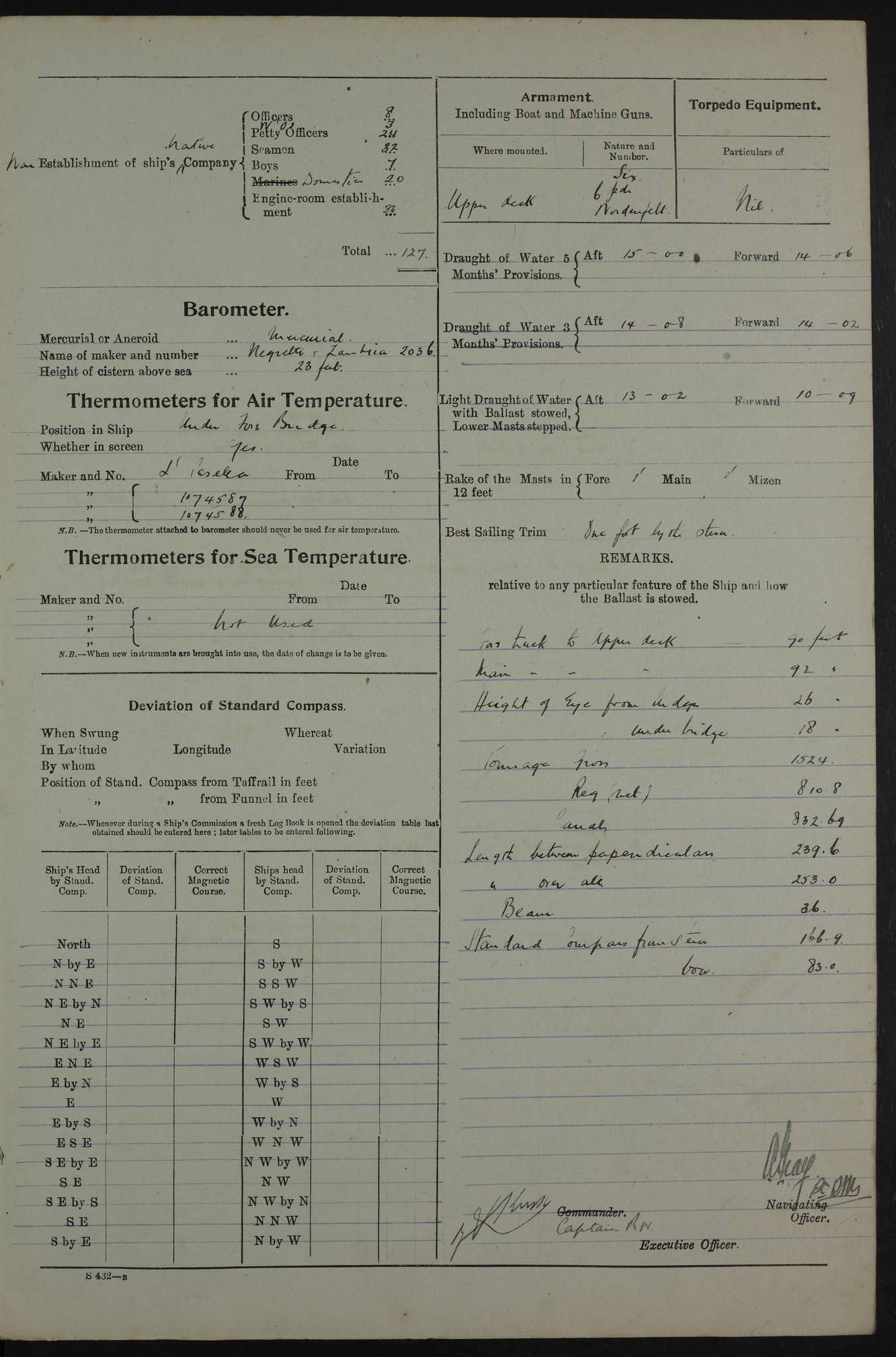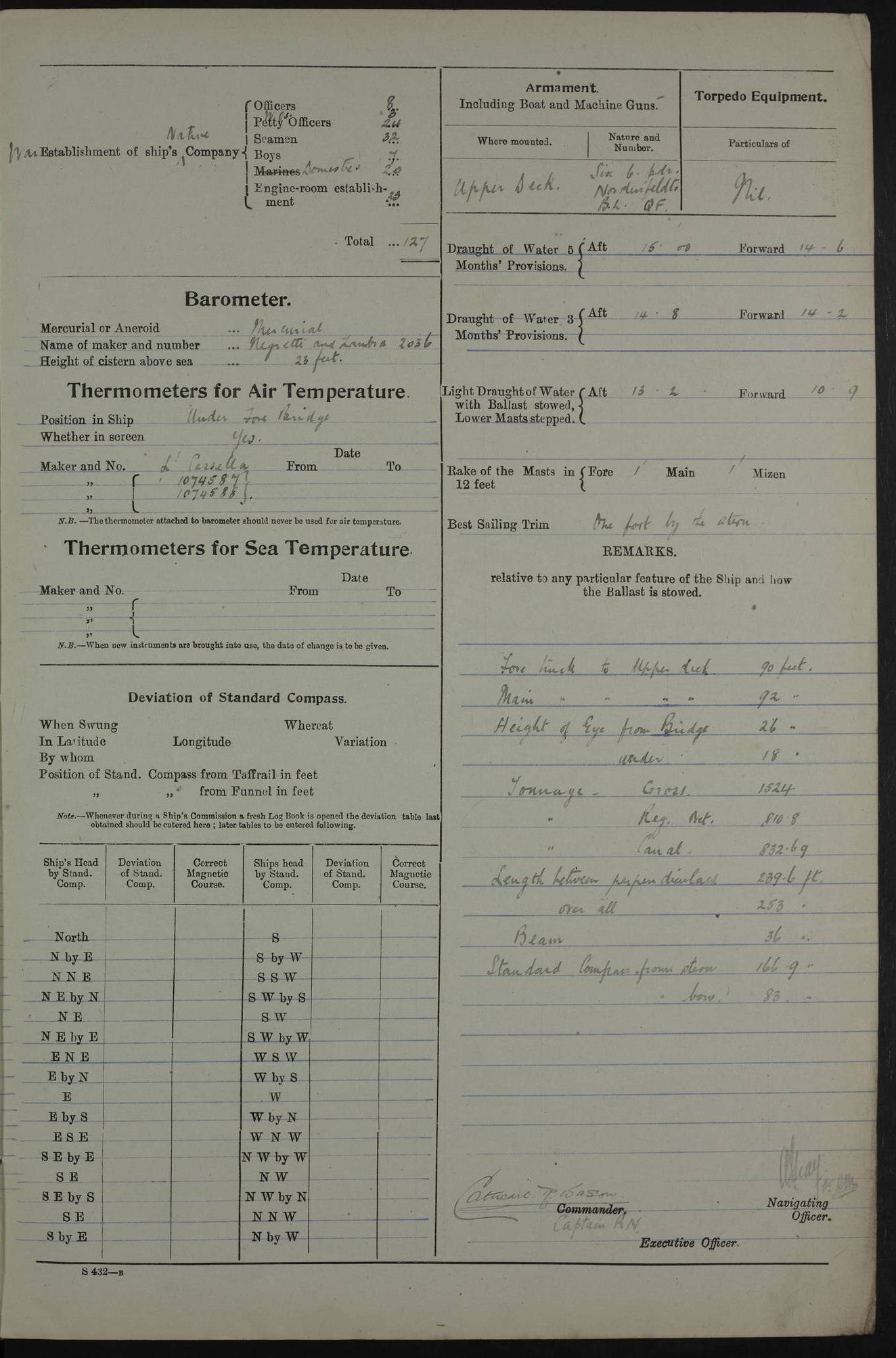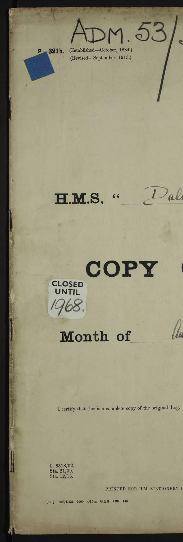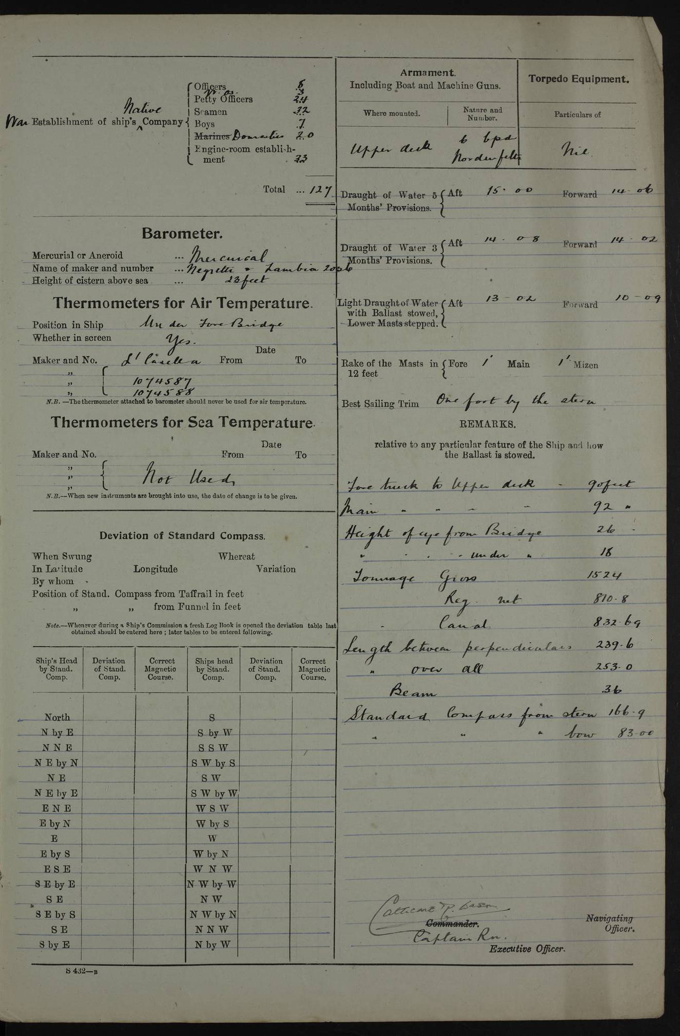 PM - Discharged To Shore Sentry: T Jackson, Petty Officer 1st – J Golden, Stoker – J Tarney, Royal Navy Reserve Trawler Section – H Hopkins, Stoker Royal Navy Reserve – J Donegan Royal Navy Reserve Trawler Section To Hospital: J Orman, Leading Seaman – Dullah Hammed, Seedie Top 6 Mess: M McMillan, Able Seaman Royal Navy Reserve To SS EGRA: C Ray, Engineer Royal Navy Reserve Trawler Section – E Cliorum Royal Navy Reserve Trawler Section – A Campbell, Stoker Royal Navy Reserve Trawler Section – G Bailey Royal Navy Reserve Trawler Section – C Woodward Chief Petty Officer – C Sell, Chief Stoker – R Apps, Chief Stoker – H Farmer Leading Hand Royal Navy Reserve Trawler Section – G Kelly, Able Seaman Royal Navy Reserve – J Ramsey, 2nd Hand 4ef4fa93e53e0a0c910056e3: (https://s3.amazonaws.com:443/oldweather/ADM53-39392/0018_1.jpg) Log Page - Blank 4ef4fa93e53e0a0c910056e4: (https://s3.amazonaws.com:443/oldweather/ADM53-39392/0019_0.jpg) Log Page - Blank 4ef4fa93e53e0a0c910056e5: (https://s3.amazonaws.com:443/oldweather/ADM53-39392/0019_1.jpg) Log Page - Blank 4ef4fa94e53e0a0c910056e6: (https://s3.amazonaws.com:443/oldweather/ADM53-39392/0020_0.jpg) Log Page - Blank 4ef4fa94e53e0a0c910056e7: (https://s3.amazonaws.com:443/oldweather/ADM53-39392/0020_1.jpg) Log Page – Blank LOGS FOR SEPTEMBER 1916 4ef4fa94e53e0a0c910056e8: (https://s3.amazonaws.com:443/oldweather/ADM53-39393/0000_0.jpg) Log Page – Cover September 1916 4ef4fa94e53e0a0c910056e9: (https://s3.amazonaws.com:443/oldweather/ADM53-39393/0000_1.jpg) Log Page – Cover September 1916 4ef4fa95e53e0a0c910056ea: (https://s3.amazonaws.com:443/oldweather/ADM53-39393/0001_0.jpg) Log Page – Blank 4ef4fa95e53e0a0c910056eb: (https://s3.amazonaws.com:443/oldweather/ADM53-39393/0001_1.jpg) Log Page – Blank 4ef4fa95e53e0a0c910056ec: (https://s3.amazonaws.com:443/oldweather/ADM53-39393/0002_0.jpg) Log Page – Blank 4ef4fa95e53e0a0c910056ed: (https://s3.amazonaws.com:443/oldweather/ADM53-39393/0002_1.jpg) Log Page – Specifications 4ef4fa95e53e0a0c910056ee: (https://s3.amazonaws.com:443/oldweather/ADM53-39393/0003_0.jpg) Log Page – Directions for Weather reporting 4ef4fa95e53e0a0c910056ef: (https://s3.amazonaws.com:443/oldweather/ADM53-39393/0003_1.jpg) Log Page – Specifications 4ef4fa96e53e0a0c910056f0: (https://s3.amazonaws.com:443/oldweather/ADM53-39393/0004_0.jpg) 1 September 1916 Place: Basrah Lat 30.5269, Long 47.8407 2:00am: Rounds 5:30am: Hands 6:00am: Morning Routine 6:45am: IMOGENE shifted billet 8:00am: Wells dry - Signal Books Correct 9:30am: Divisions - Hands cleaning out fresh water tank on fore troop deck & paint work on Main Deck – fitting man ropes to Port after gangway 11:00am: Paid ship’s company for full month of August – Muster by Open List 12:00pm: Signal Books Correct 12:30pm: Piped Down 4:00pm: Signal Books Correct 4:30pm: Cleared up decks – Naval Ratings mustered for Monthly payment 5:00pm: Evening Quarters – Leave to Watch of Naval Ratings 5:40pm: Hospital Ship SICILIA passed up 7:00pm: Sunset - Fire Gear in readiness 7:30pm: Liberty men returned 8:00pm: Wells dry - Signal Books Correct 9:00pm: Rounds - Signal Books Correct AM – Joined From Motor Launch 20: A Murray Royal Naval Reserve Trawler Section AM – Discharged TO Shore: Habib, Seedie PM – Joined From Motor Launch 16: J Brophy, Trimmer From Motor Launch 20: T Gardner, Royal Naval Reserve Trawler Section From Motor Launch 9: G Skelly, Trimmer PM – Discharged To Hospital: No. 2053 Sieker Merya, Stoker – No. 2008 Handoo Alefkhan 4ef4fa96e53e0a0c910056f1: (https://s3.amazonaws.com:443/oldweather/ADM53-39393/0004_1.jpg) 2 September 1916 Place: Basrah Lat 30.5269, Long 47.8407 2:00am: Rounds 5:30am: Hands 6:00am: Morning Routine 8:00am: Wells dry - Signal Books Correct 9:30am: Saturday Morning Routine & cleaning fresh water tank on after troop deck. Taking in stores from Motor Launch 13 12:00pm: Signal Books Correct 12:30pm: Piped Down 2:20pm: Hospital Ship SICILIA passed down 4:00pm: Signal Books Correct 4:30pm: Cleared up decks 5:00pm: Evening Quarters – Leave to Watch of Naval Ratings 7:00pm: Sunset - Fire Gear in readiness 7:30pm: Liberty men returned 8:00pm: Wells dry - Signal Books Correct 9:00pm: Rounds - Signal Books Correct 11:00pm: Destroyed 28 tins Milk being unfit for use. – Lost overboard by accident at night lantern, tin, one in No. AM – Joined From ALERT: L Scott, Stoker – A Turner, Able Seaman From GNAT: M. Ford, Chief petty Officer AM – Discharged TO Patrol 24 for Motor Launch 12: L Golden, Stoker TO Patrol 24 for Motor Launch 6: H Hopkins Stoker Royal Naval Reserve TO Patrol 24 for Motor Launch 1: J Donegan Royal Naval Reserve Trawler Section PM – Joined From GNAT: W Tweeddle, Able Seaman PM - Discharged To Hospital: M McMilan, Seaman Royal Naval Reserve – J Shelly, Trimmer – J Brophy, Trimmer – J Gardner, Trimmer – J A Stevens, Carpenter’s Crew 4ef4fa96e53e0a0c910056f2: (https://s3.amazonaws.com:443/oldweather/ADM53-39393/0005_0.jpg) 3 September 1916 Place: Basrah Lat 30.5269, Long 47.8407 2:00am: Rounds 5:15am: GNAT left up river 5:30am: Hands 6:00am: Morning Routine 6:45am: Church of England party landed 7:30am: Roman Catholic Church party landed 7:55am: Hospital Ship VARSOVA passed up river 8:00am: Wells dry – Signal Books Correct 8:30am: Church parties returned 9:45am: Divisions – Piped down – Liberty to some Lascars & Stokers 12:00pm: Signal Books Correct – Issued Quinine to ship’s company 12:30pm: Piped Down 4:00pm: Signal Books Correct 4:30pm: Cleared up decks 5:00pm: Evening Quarters – Leave to Watch of Naval Ratings 6:25pm: Hospital Ship VARSOVA passed down river 7:00pm: Sunset - Fire Gear in readiness 7:30pm: Liberty men returned 8:00pm: Wells dry - Signal Books Correct 9:00pm: Rounds - Signal Books Correct PM – Joined From Motor Launch 8: S Kent, Chief Stoker From Hospital: C Healey, Officer’s Cook 4ef4fa96e53e0a0c910056f3: (https://s3.amazonaws.com:443