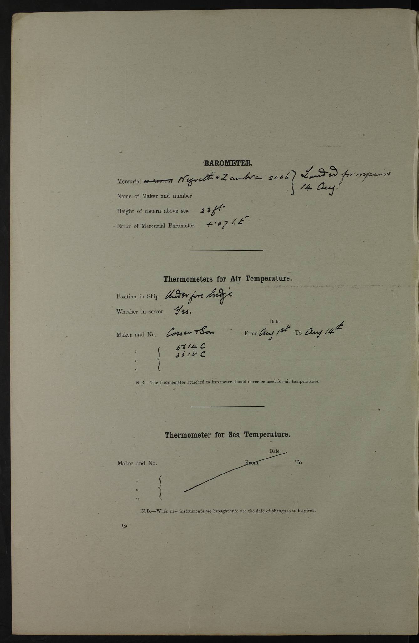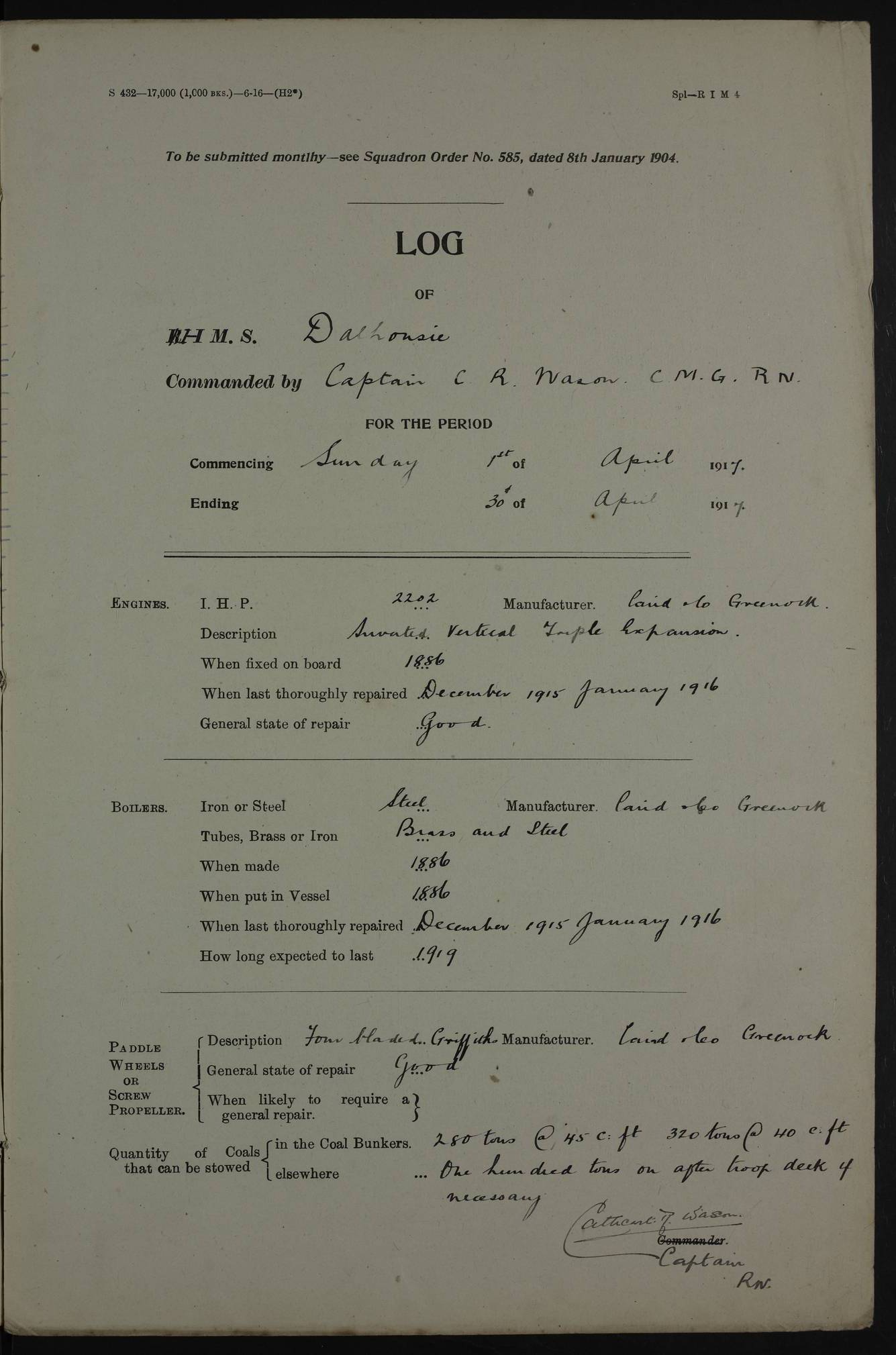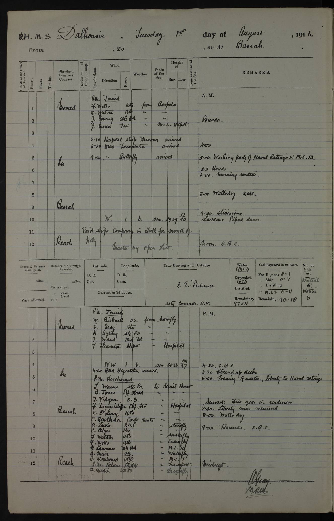 (Maps prepared using Journey Plotter, developed by Maikel. The Plots can only be approximate. They are made by joining-up positions on successive days, and sometimes positions are not given. There will therefore be occasions when the ship appears to have travelled overland) LOGS FOR AUGUST 1916 4ef4fa8de53e0a0c910056be: (https://s3.amazonaws.com:443/oldweather/ADM53-39392/0000_0.jpg) Log – Cover Page – August 1916 4ef4fa8de53e0a0c910056bf: (https://s3.amazonaws.com:443/oldweather/ADM53-39392/0000_1.jpg) Log – Cover Page – August 1916 4ef4fa8de53e0a0c910056c0: (https://s3.amazonaws.com:443/oldweather/ADM53-39392/0001_0.jpg) Log Page – Blank 4ef4fa8de53e0a0c910056c1: (https://s3.amazonaws.com:443/oldweather/ADM53-39392/0001_1.jpg) Log Page – Title Page – E.M. Palmer Acting Commander Royal Navy 4ef4fa8de53e0a0c910056c2: (https://s3.amazonaws.com:443/oldweather/ADM53-39392/0002_0.jpg) Log Page – Directions for completing Logs 4ef4fa8de53e0a0c910056c3: (https://s3.amazonaws.com:443/oldweather/ADM53-39392/0002_1.jpg) Log Page – Equipment – Armament – Not completed 4ef4fa8ee53e0a0c910056c4: (https://s3.amazonaws.com:443/oldweather/ADM53-39392/0003_0.jpg) 1 August 1916 Place: Basrah Lat 30.5269, Long 47.8407 2:00am: Rounds 5:00am: Working party of Naval Ratings in Motor Launch 13 5:10am: Hospital Ship VARSOVA arrived 5:50am: HMS TARANTULA arrived 6:00am: Hands 6:30am: Morning Routine 8:00am: Wells dry – Signal Books correct 9:00am: HMS BUTTERFLY arrived 9:30am: Divisions – Lascars Piped down 11:00am: Paid ship’s company in full for month of July – Muster by open list 12:00pm: Signal Books correct 4:00pm: Signal Books correct – HMS FLYCATCHER arrived 4:30pm: Cleared up decks 5:00pm: Evening Quarters – liberty to Naval Ratings 7:00pm: Sunset – Fire Gear in readiness 7:30pm: Liberty men returned 8:00pm: Wells dry 9:00pm: Rounds – Signal Books correct AM - Joined From BARPETA: F. Wells, Able Seaman – F. Watson, Able Seaman – J. Gownig, Deck Hand [Possible: Frank Wells] Joined From Motor Launch Depot: J. Gunn, Trimmer PM – Joined From SAWFLY: W. Bicknell, Ordinary Seaman– E. Gray, Stoker – H. Ayling, Stoker Petty Officer – T. Ward, Ordinary Telegrapher Joined From Hospital: T. Thornton, Shipwright [Possible: Thomas Joseph Thornton] Discharged to Mail Boat: L. Warne, Stoker Petty Officer – B. Jones, Officer’s Steward – T. Vidgeon, Ordinary Seaman [Possible: L.J. Warne] To Hospital: F. Tunnicliffe, Chief Stoker – C. O’Leary, Able Seaman – C. Faulkner, Carpenter’s Mate To STONEFLY: A. Lewis, Petty Officer 1st – C. Helyer, Stoker To SNAKEFLY: F. Watson, Able Seaman To CRANEFLY: F. Wells, Able Seaman To MOTOR LAUNCH 14: G. LAWRENCE, Deck Hand To WATERFLY: A. Muir, Able Seaman To MOTOR LAUNCH 1: C. Woodward, Chief Petty Officer To TRANSPORT: J.M. Palmer, Lieutenant Royal Navy To DRAGONFLY: F. Martin, Stoker Petty Officer [Fly Class Gunboats – Prefix HM GUNBOAT - http://en.wikipedia.org/wiki/Fly-class_gunboat] [HMS FLYCATCHER , ex-Turkish motor patrol boat. Built 1912 Thornycroft. Sunk 9.11.14 by ESPIEGLE in Shatt el Arab, salvaged, back in service late 1915. Battle Honour (and link to despatches, casualties, awards) Mesopotamia 1915/17. Armed with 1-6pdr/1-MG. Sold c1923.] [HMS TARANTULA, river gunboat, Insect-class, ordered 2.15 as "China Gunboat" for service on Danube. Served elsewhere, P.6A (1.16), P.A8 (1.18). Launched 18.12.15 Wood Skinner. 645 tons, 237(oa), 230(pp)x36x4ft. TE 2000ihp,14kts, twin screws in tunnels. Armament: 2-6in, 2-12pdr. Crew: 53. Mesopotamia 1916-18. Battle Honour (and link to despatches, casualties, awards) Mesopotamia 1916/17. Log Book Availability. Sunk 1.5.46 as target off Ceylon.] 4ef4fa8ee53e0a0c910056c5: (https://s3.amazonaws.com:443/oldweather/ADM53-39392/0003_1.jpg) 2 August 1916 Place: Basrah Lat 30.5269, Long 47.8407 2:00am: Rounds 5:00am: HMS FLYCATCHER left for upriver 5:30am: Hands 5:45am: Hospital ship VARSOVA left 6:00am: Morning Routine 8:00am: Wells dry - Signal Books Correct 9:30am: Divisions – Hands cleaning Main Deck paint work, chipping and red-leading ship’s side 12:00pm: Signal Books Correct 12:30pm: Piped Down 4:00pm: Signal Books Correct 4:30pm: Cleared up decks 5:00pm: Evening Quarters – Liberty to Watch of Naval Ratings 7:00pm: Sunset - Fire Gear in readiness 7:30pm: Liberty men returned 8:00pm: Wells dry - Signal Books Correct 9:00pm: Rounds - Signal Books Correct AM – Joined From GADFLY: Solomon S. Saleh , Interpreter From IMOGAU: Hancock, Petty Officer 1st PM: Discharged To Hospital: J Gunn, Trimmer – Duncan Abmed Seedie – Duloon Almed Seedie To Shore: Salomon S. Saleh, Interpreter 4ef4fa8ee53e0a0c910056c6: (https://s3.amazonaws.com:443/oldweather/ADM53-39392/0004_0.jpg) 3 August 1916 Place: Basrah Lat 30.5269, Long 47.8407 2:00am: Rounds 5:30am: Hands 6:00am: Morning Routine 8:00am: Wells dry - Signal Books Correct 9:30am: Divisions – Hands shipping, scaling & and red-leading ship’s side & repairing fenders 12:00pm: Signal Books Correct - Issued Quinine to Ship's company 12:30pm: Piped Down 4:00pm: Signal Books Correct 4:30pm: Cleared up decks 5:00pm: Evening Quarters – Liberty to one Watch of Naval Ratings 7:00pm: Sunset - Fire Gear in readiness 7:30pm: Liberty men returned 8:00pm: Wells dry - Signal Books Correct 9:00pm: Rounds - Signal Books Correct AM – Joined From Motor Launch 15: E Lever, Stoker [Possible: Edmund J. Leaver] PM – Discharged: To GNAT: J. Borill Royal Navy Reserve – J. Soutar, Engine Room Artificer, G. Archer, Signalman To Hospital: E. Lever, Stoker – J.C. Edgecombe, Gunner Royal Indian Marines (Dysentery) 4ef4fa8ee53e0a0c910056c7: (https://s3.amazonaws.com:443/oldweather/ADM53-39392/0004_1.jpg) 4 August 1916 Place: Basrah Lat 30.5269, Long 47.8407 2:00am: Rounds 5:30am: Hands 6:00am: Morning Routine – HMS GNAT left 8:00am: Wells dry – Signal Books Correct 8:15am: Hospital ship VITA left 9:30am: Divisions – Hands chipping and red-