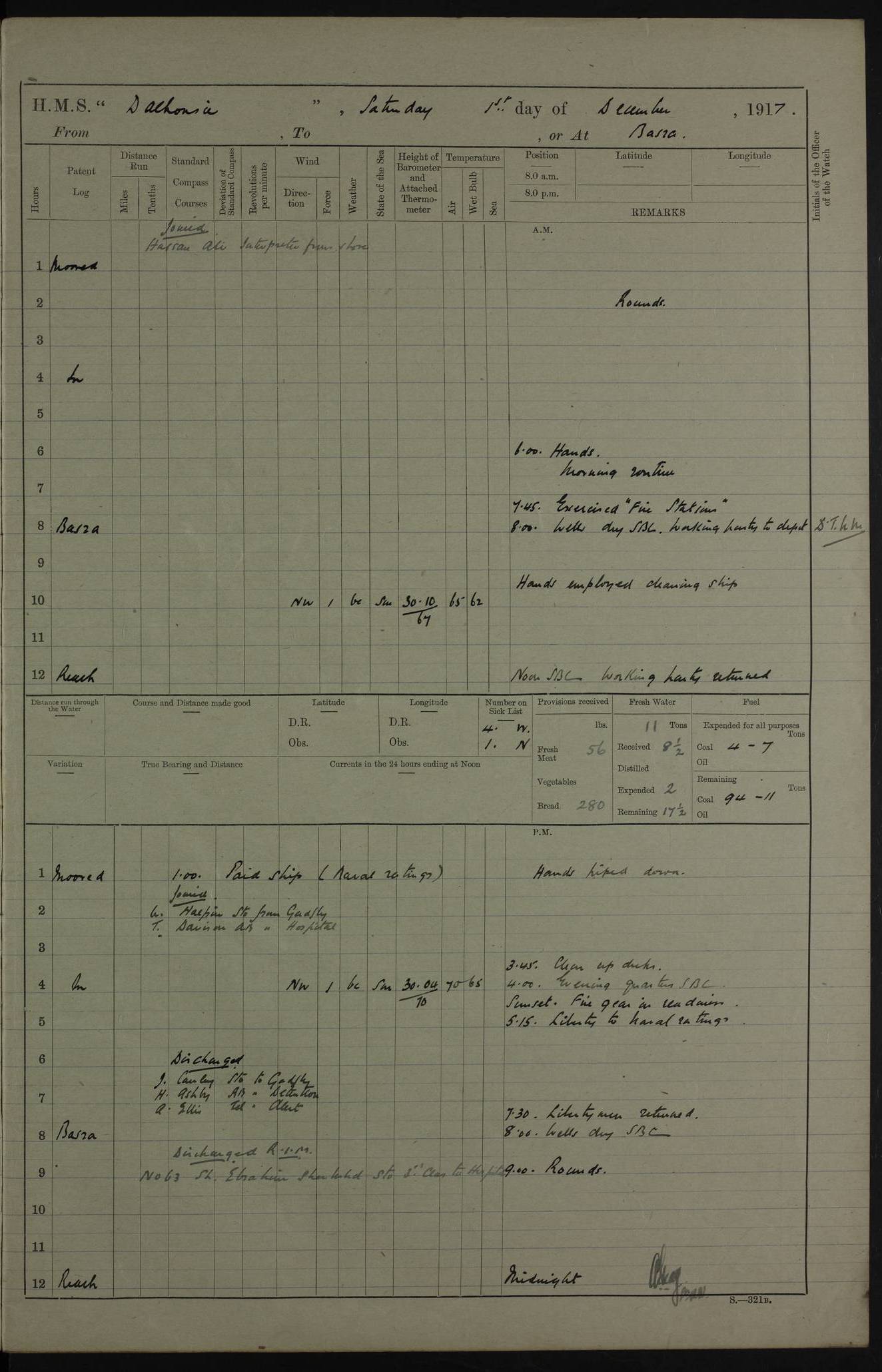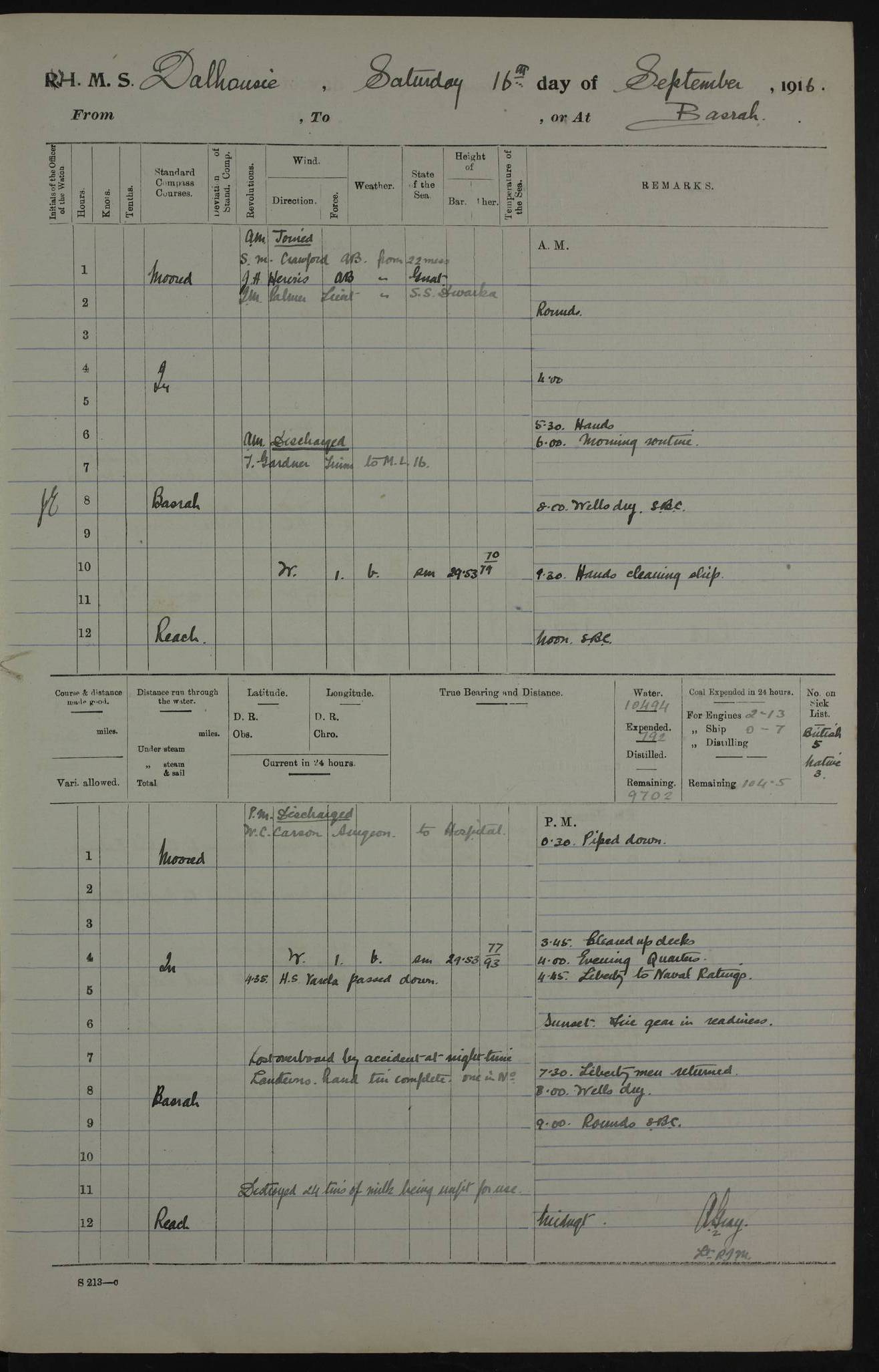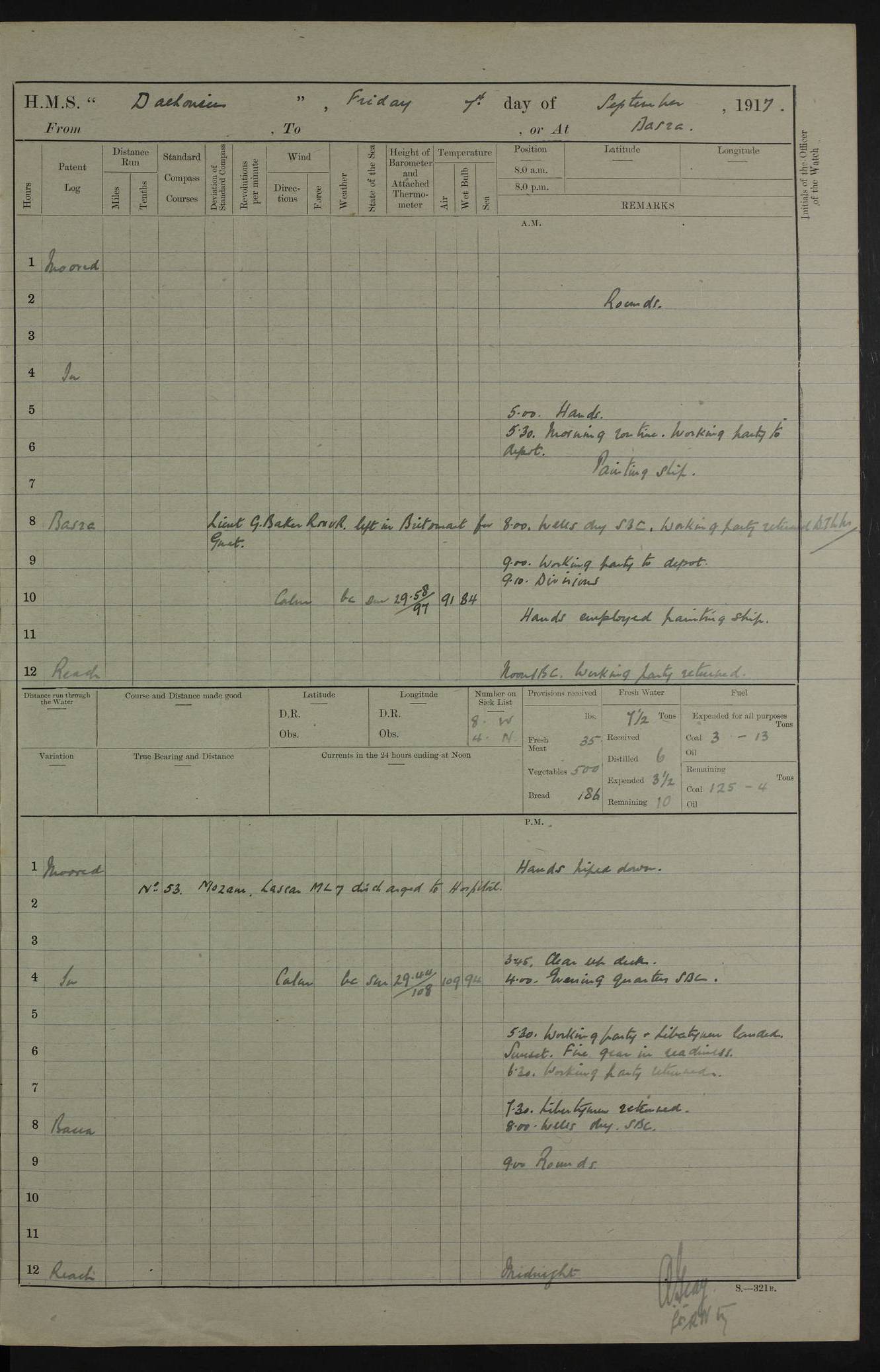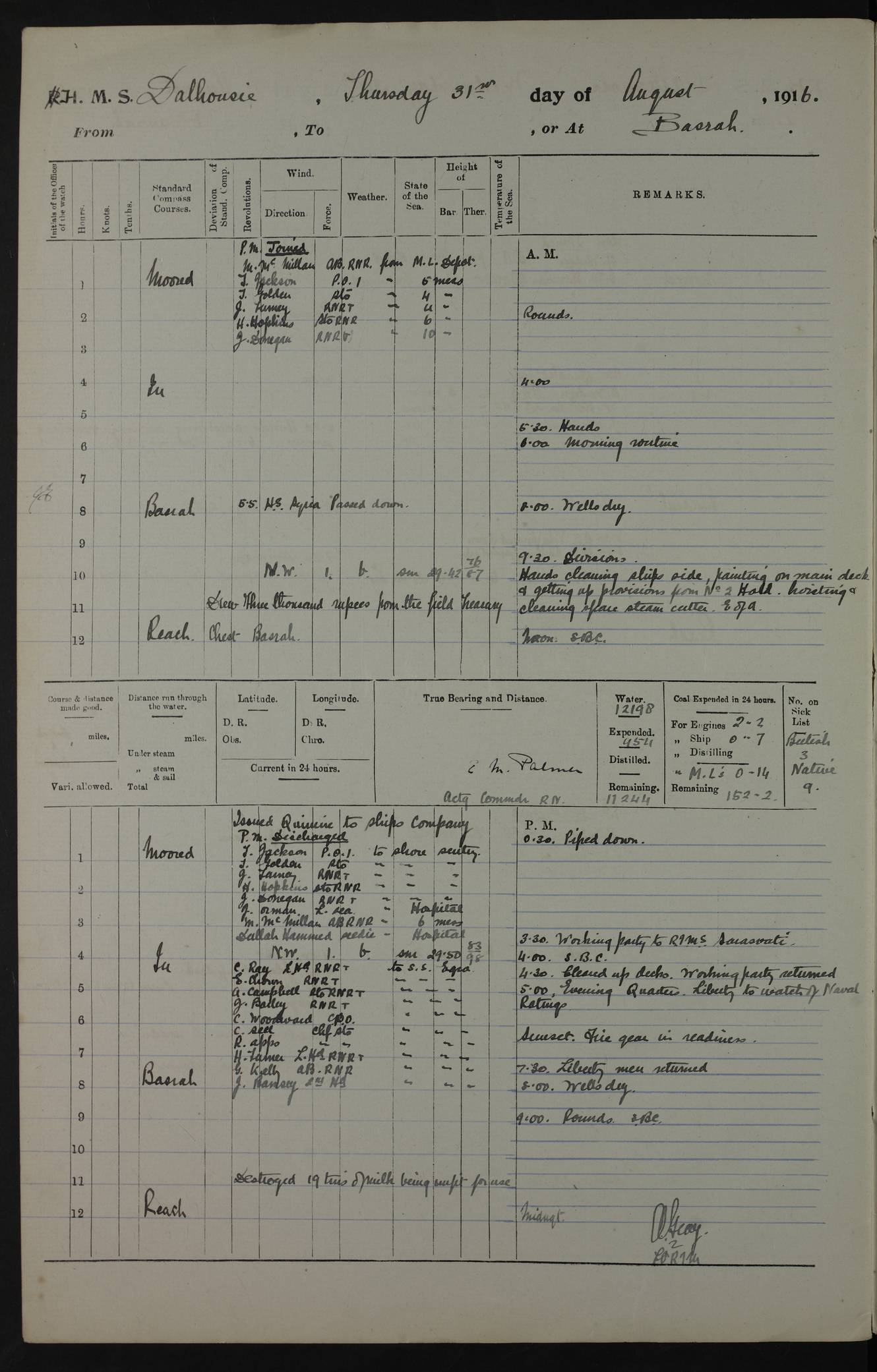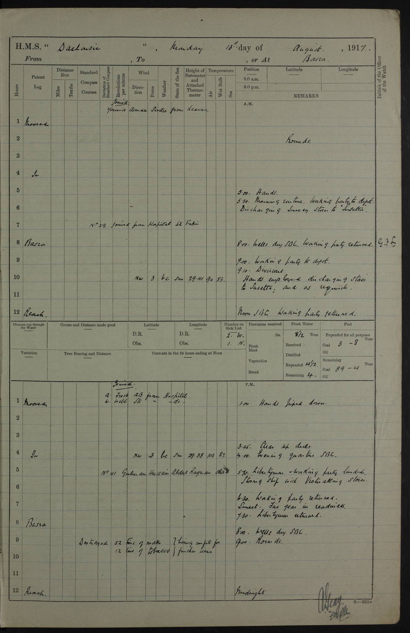 PM - Discharged To Hospital: H Widger, Engine Room Artificer - PW Harrison, Stoker Royal Navy Reserve To Motor Launch 11: J W Whitfield, Stoker 4ef4fa93e53e0a0c910056e2: (https://s3.amazonaws.com:443/oldweather/ADM53-39392/0018_0.jpg) 31 August 1916 Place: Basrah Lat 30.5269, Long 47.8407 2:00am: Rounds 5:05am: Hospital Ship SYRIA passed down 5:30am: Hands 6:00am: Morning Routine 8:00am: Wells dry – Signal Books Correct 9:30am: Divisions - Hands cleaning ship 11:00am: Drew Three Thousand Rupees from the Field treasury 12:00pm: Signal Books Correct – Issued Quinine to ship’s company 12:30pm: Piped Down 3:30pm: 4:00pm: Signal Books Correct 4:30pm: Cleared up decks 5:00pm: Evening Quarters – Leave to Watch of Naval Ratings 7:00pm: Sunset - Fire Gear in readiness 7:30pm: Liberty men returned 8:00pm: Wells dry - Signal Books Correct 9:00pm: Rounds - Signal Books Correct 11:00pm: Destroyed 19 tins Milk being unfit for use. AM – Joined From Motor Launch Depot: M. McMillan, Able Seaman From 5 Mess: T. Jackson, Petty Officer 1st From 4 Mess: T Golden, Stoker – J Tunney, Royal Navy Reserve Trawler Section From 10 Mess: J Donegan Royal Navy Reserve Trawler Section