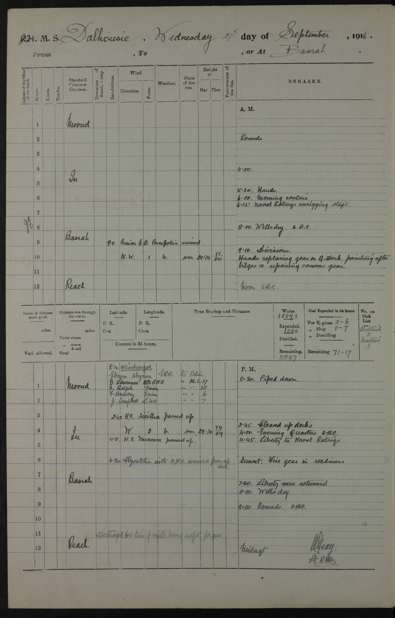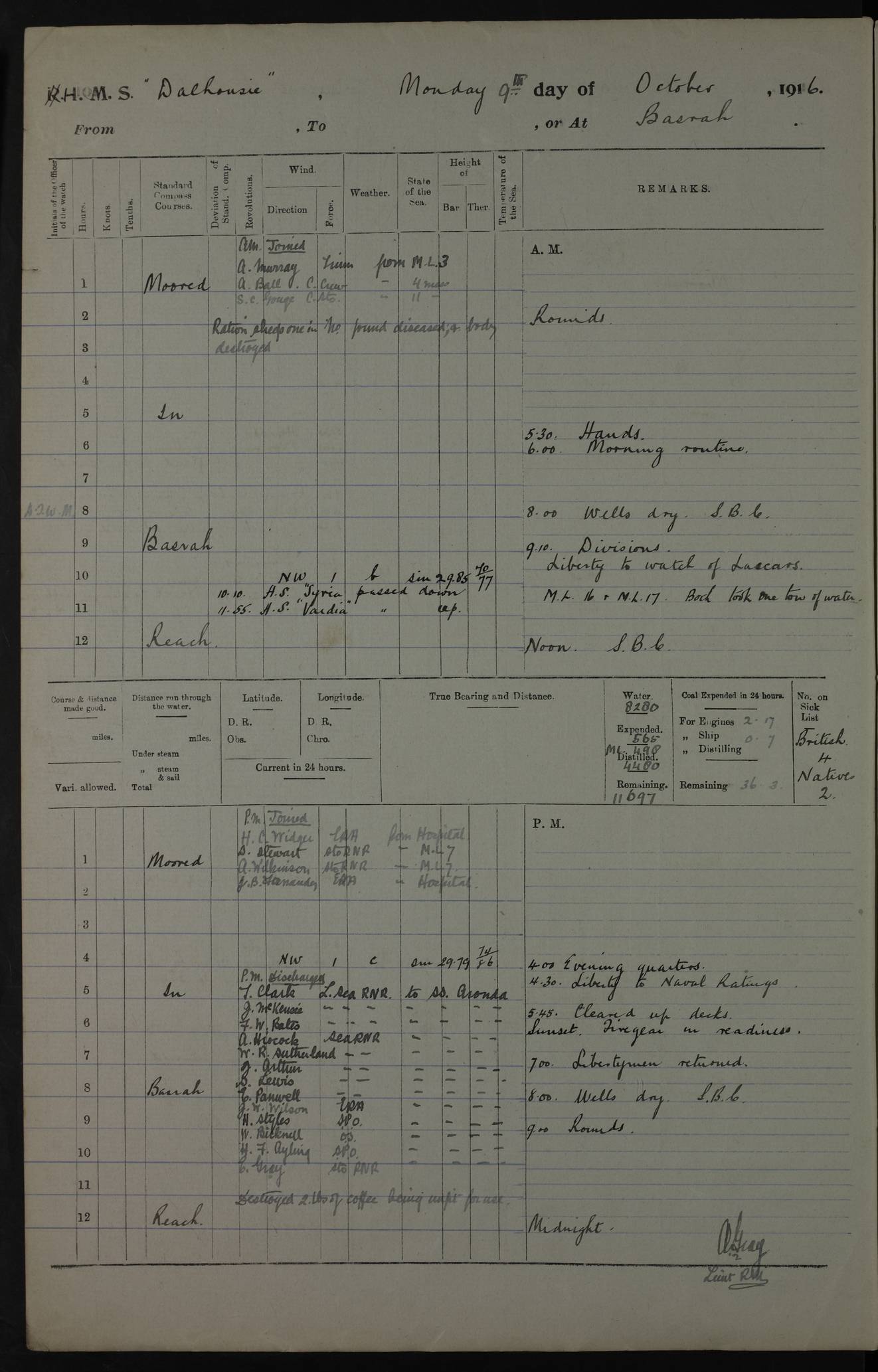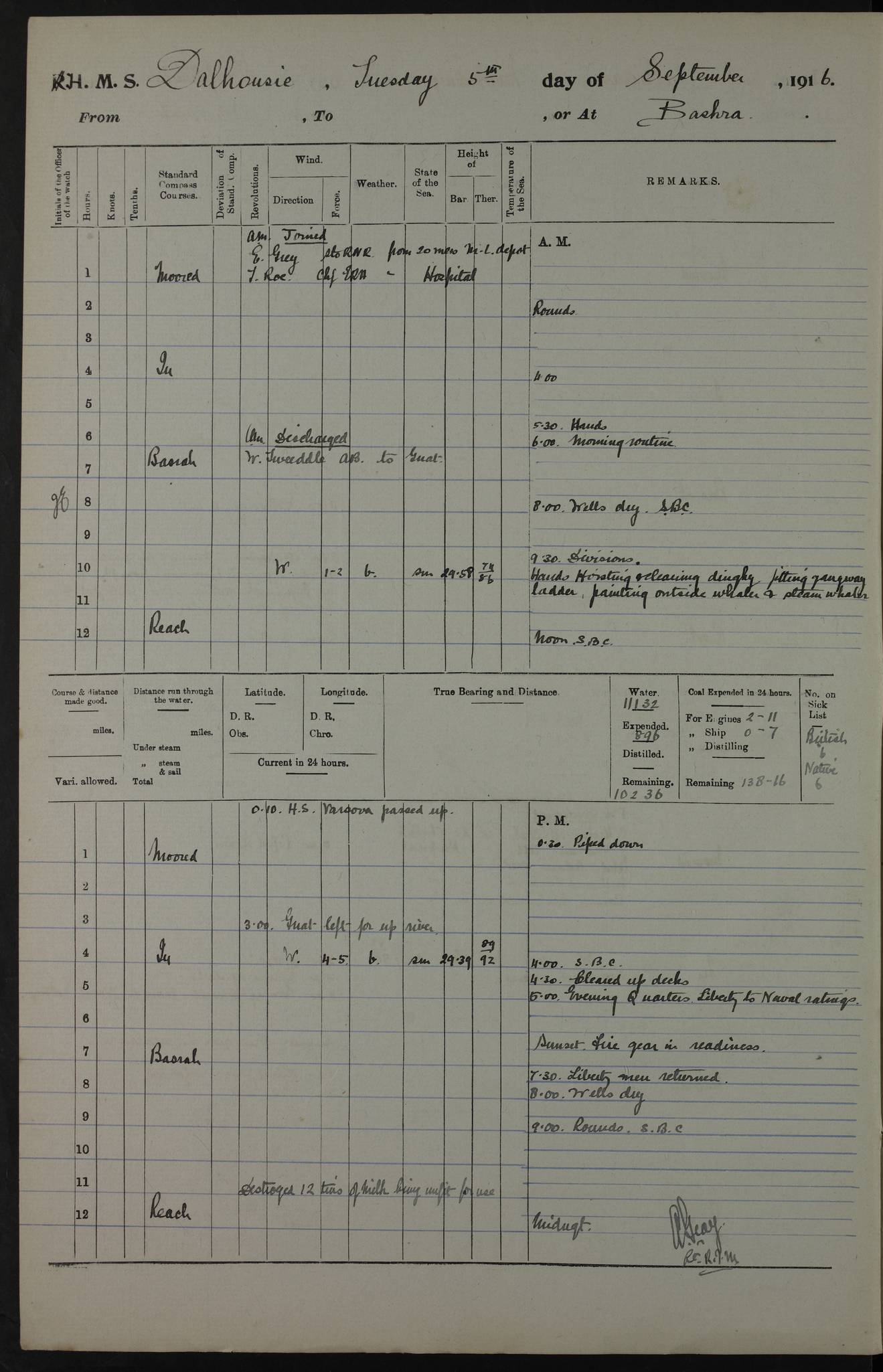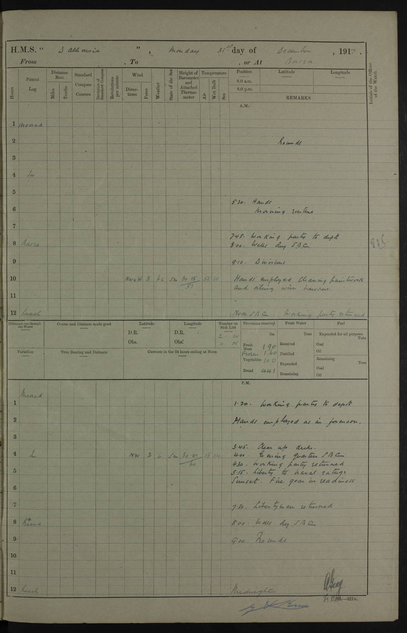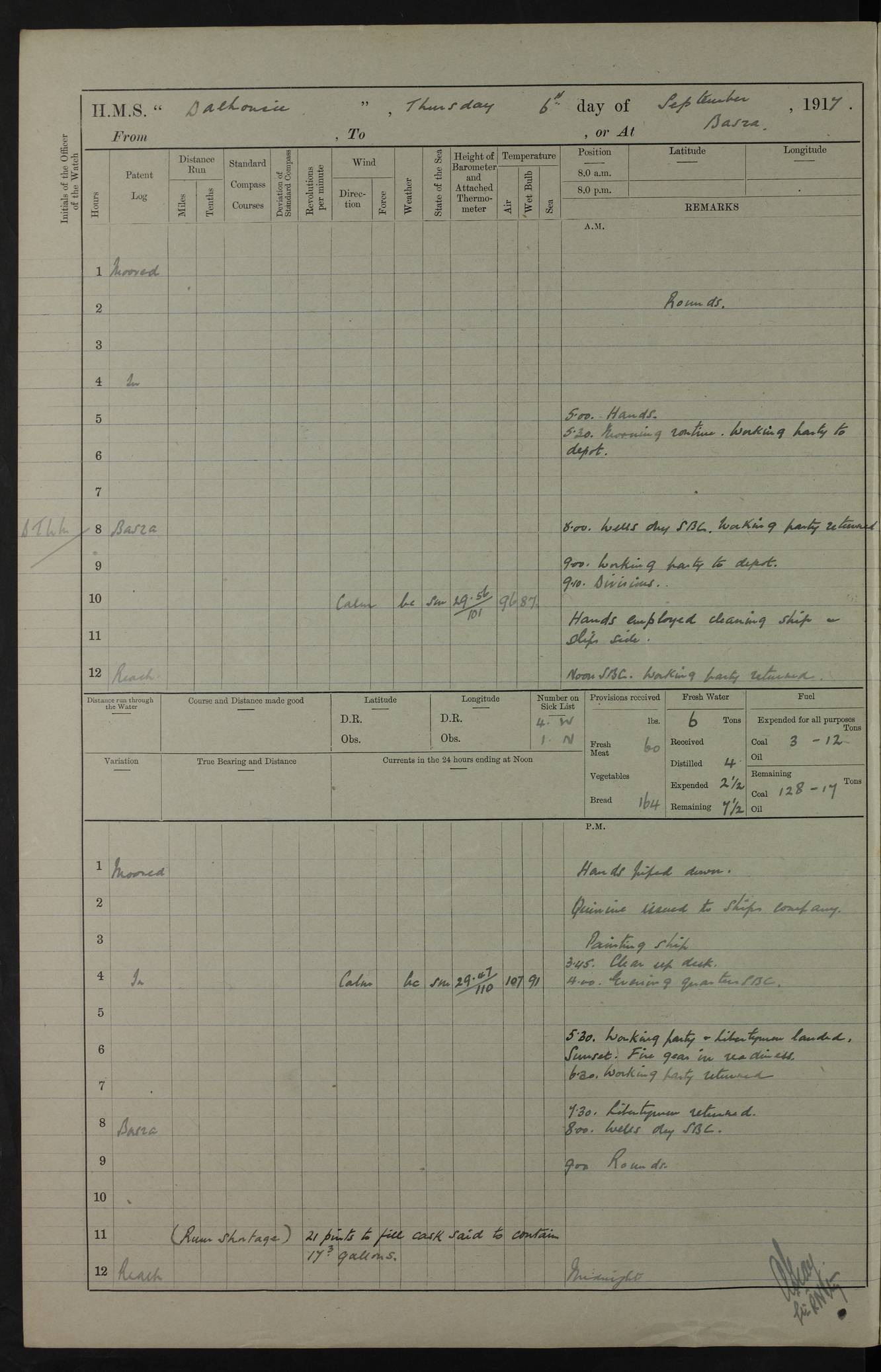 PM - Discharged To Hospital: H Widger, Engine Room Artificer - PW Harrison, Stoker Royal Navy Reserve To Motor Launch 11: J W Whitfield, Stoker 4ef4fa93e53e0a0c910056e2: (https://s3.amazonaws.com:443/oldweather/ADM53-39392/0018_0.jpg) 31 August 1916 Place: Basrah Lat 30.5269, Long 47.8407 2:00am: Rounds 5:05am: Hospital Ship SYRIA passed down 5:30am: Hands 6:00am: Morning Routine 8:00am: Wells dry – Signal Books Correct 9:30am: Divisions - Hands cleaning ship 11:00am: Drew Three Thousand Rupees from the Field treasury 12:00pm: Signal Books Correct – Issued Quinine to ship’s company 12:30pm: Piped Down 3:30pm: 4:00pm: Signal Books Correct 4:30pm: Cleared up decks 5:00pm: Evening Quarters – Leave to Watch of Naval Ratings 7:00pm: Sunset - Fire Gear in readiness 7:30pm: Liberty men returned 8:00pm: Wells dry - Signal Books Correct 9:00pm: Rounds - Signal Books Correct 11:00pm: Destroyed 19 tins Milk being unfit for use. AM – Joined From Motor Launch Depot: M. McMillan, Able Seaman From 5 Mess: T. Jackson, Petty Officer 1st From 4 Mess: T Golden, Stoker – J Tunney, Royal Navy Reserve Trawler Section From 10 Mess: J Donegan Royal Navy Reserve Trawler Section