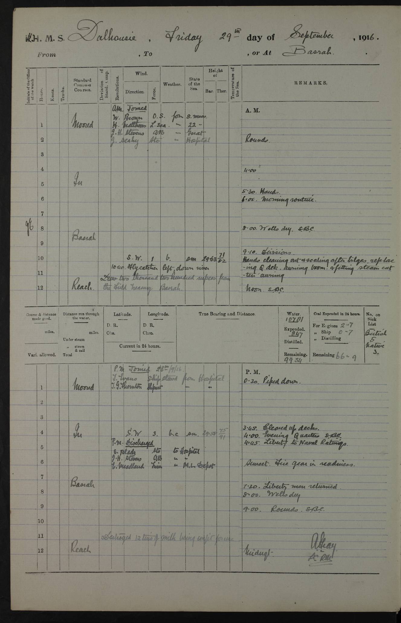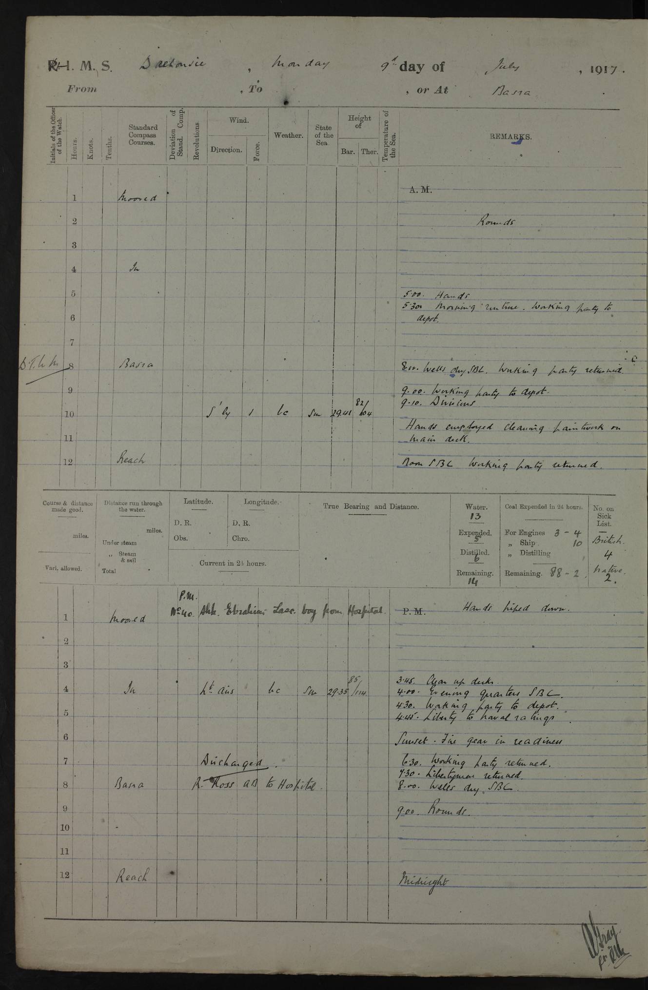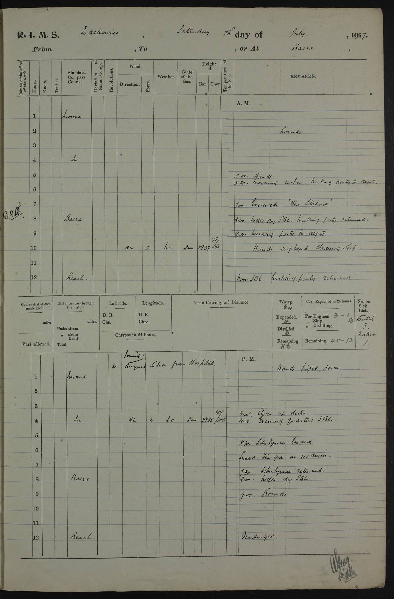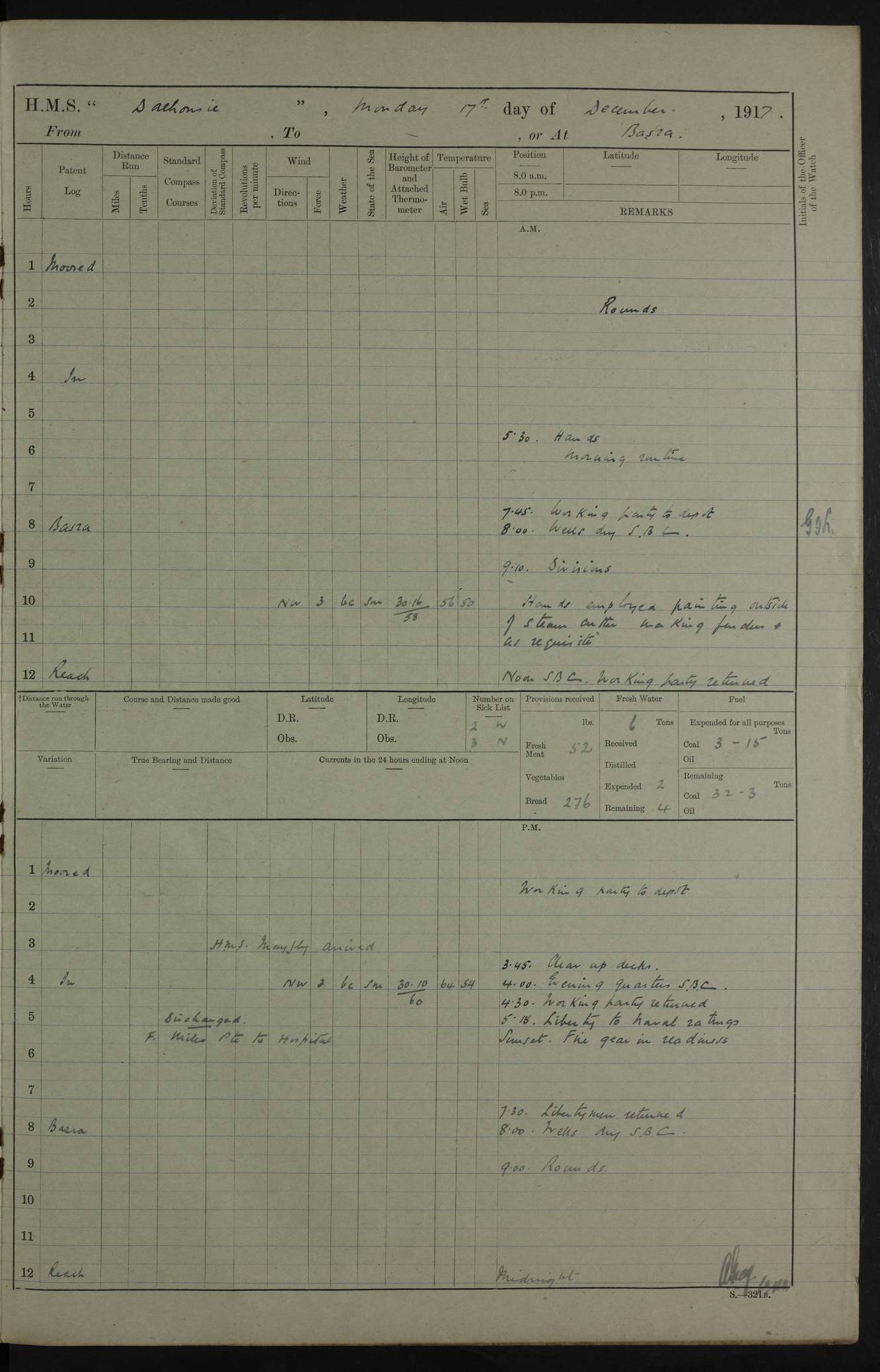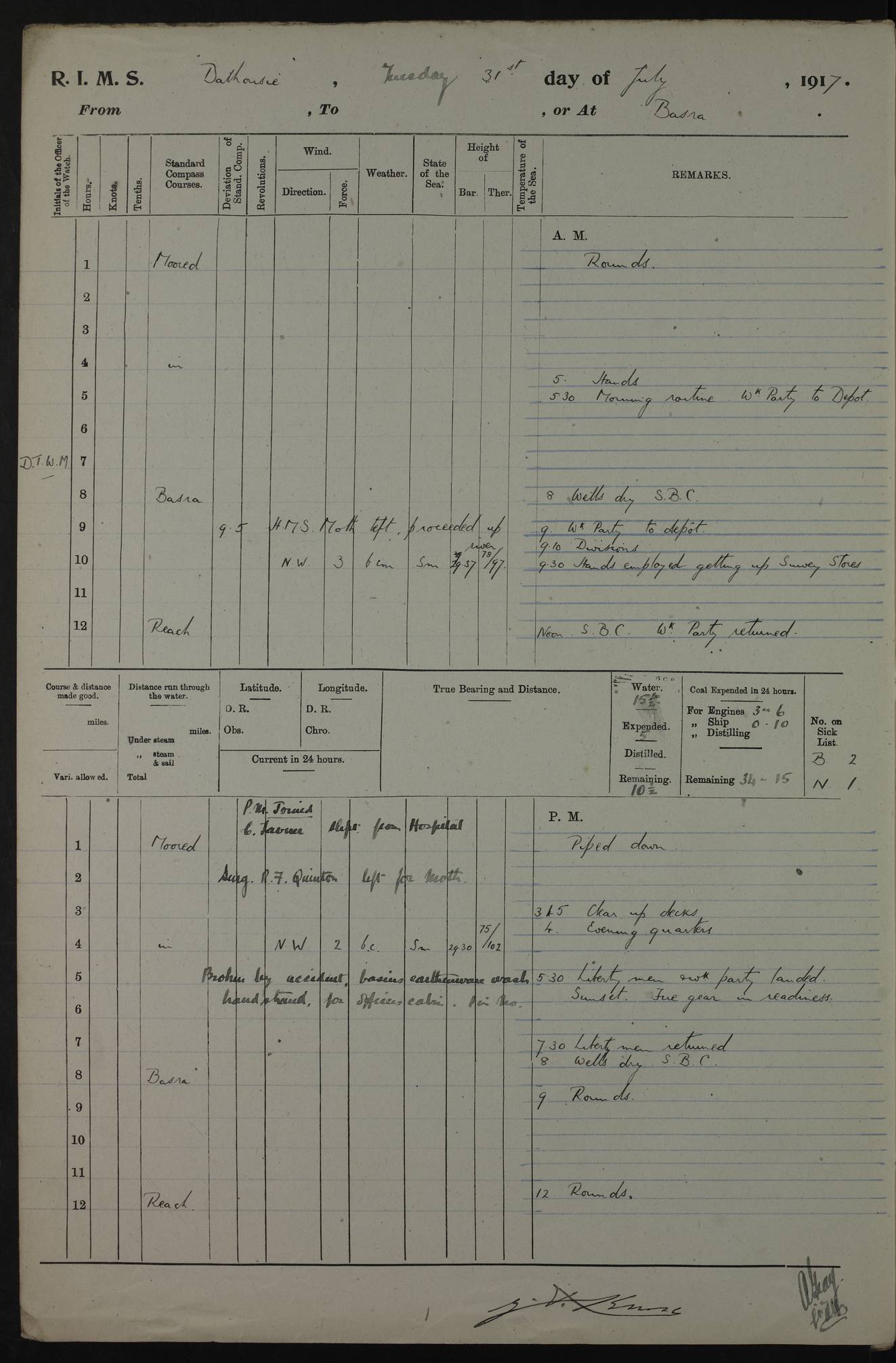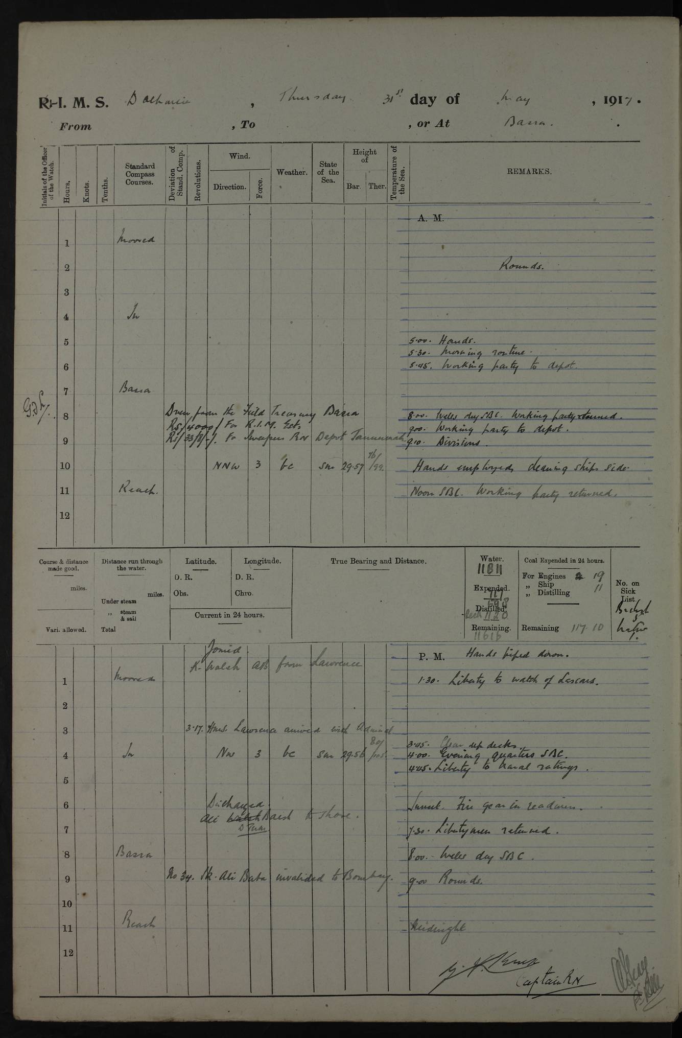 PM - Discharged To Hospital: H Widger, Engine Room Artificer - PW Harrison, Stoker Royal Navy Reserve To Motor Launch 11: J W Whitfield, Stoker 4ef4fa93e53e0a0c910056e2: (https://s3.amazonaws.com:443/oldweather/ADM53-39392/0018_0.jpg) 31 August 1916 Place: Basrah Lat 30.5269, Long 47.8407 2:00am: Rounds 5:05am: Hospital Ship SYRIA passed down 5:30am: Hands 6:00am: Morning Routine 8:00am: Wells dry – Signal Books Correct 9:30am: Divisions - Hands cleaning ship 11:00am: Drew Three Thousand Rupees from the Field treasury 12:00pm: Signal Books Correct – Issued Quinine to ship’s company 12:30pm: Piped Down 3:30pm: 4:00pm: Signal Books Correct 4:30pm: Cleared up decks 5:00pm: Evening Quarters – Leave to Watch of Naval Ratings 7:00pm: Sunset - Fire Gear in readiness 7:30pm: Liberty men returned 8:00pm: Wells dry - Signal Books Correct 9:00pm: Rounds - Signal Books Correct 11:00pm: Destroyed 19 tins Milk being unfit for use. AM – Joined From Motor Launch Depot: M. McMillan, Able Seaman From 5 Mess: T. Jackson, Petty Officer 1st From 4 Mess: T Golden, Stoker – J Tunney, Royal Navy Reserve Trawler Section From 10 Mess: J Donegan Royal Navy Reserve Trawler Section