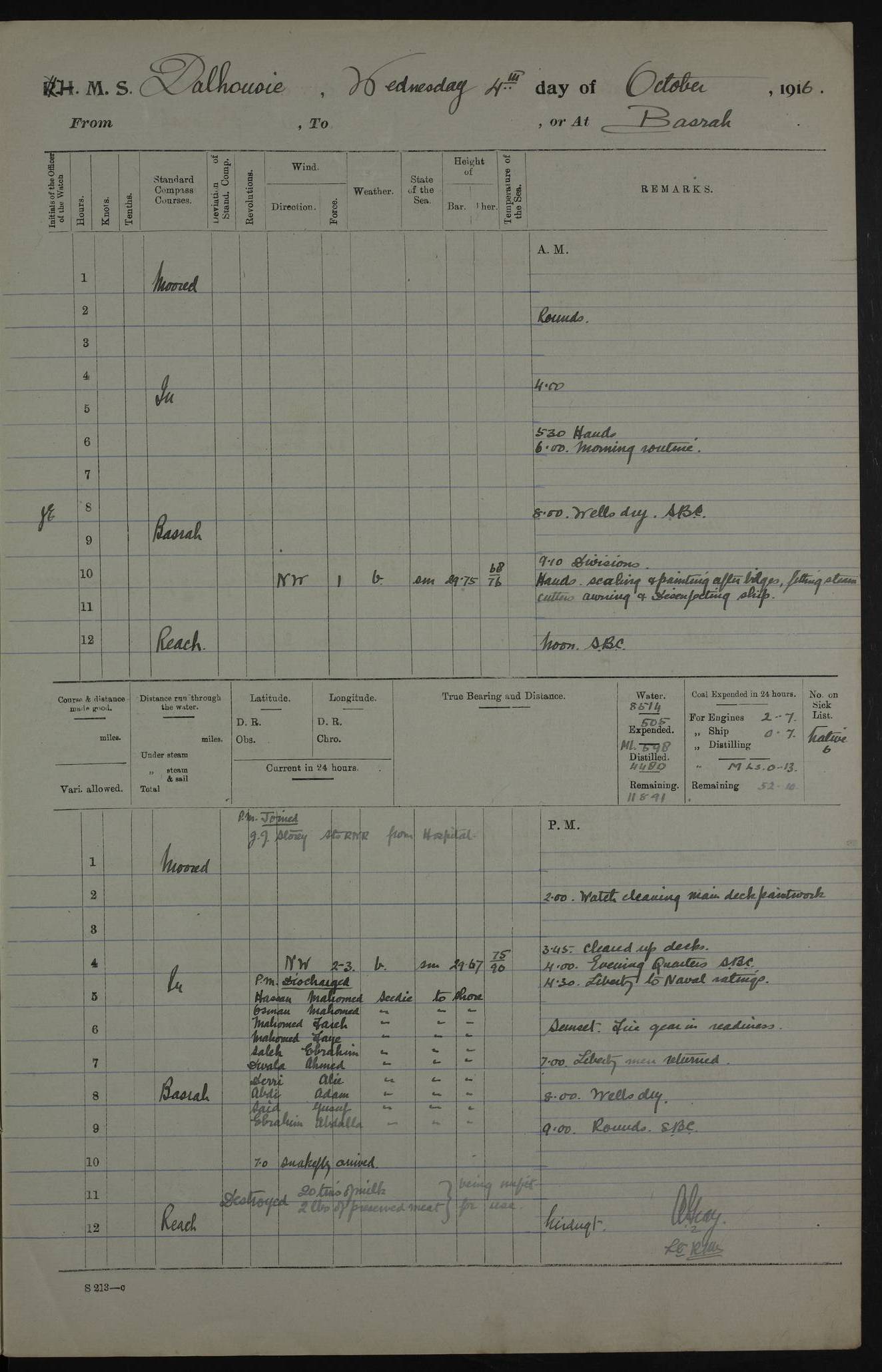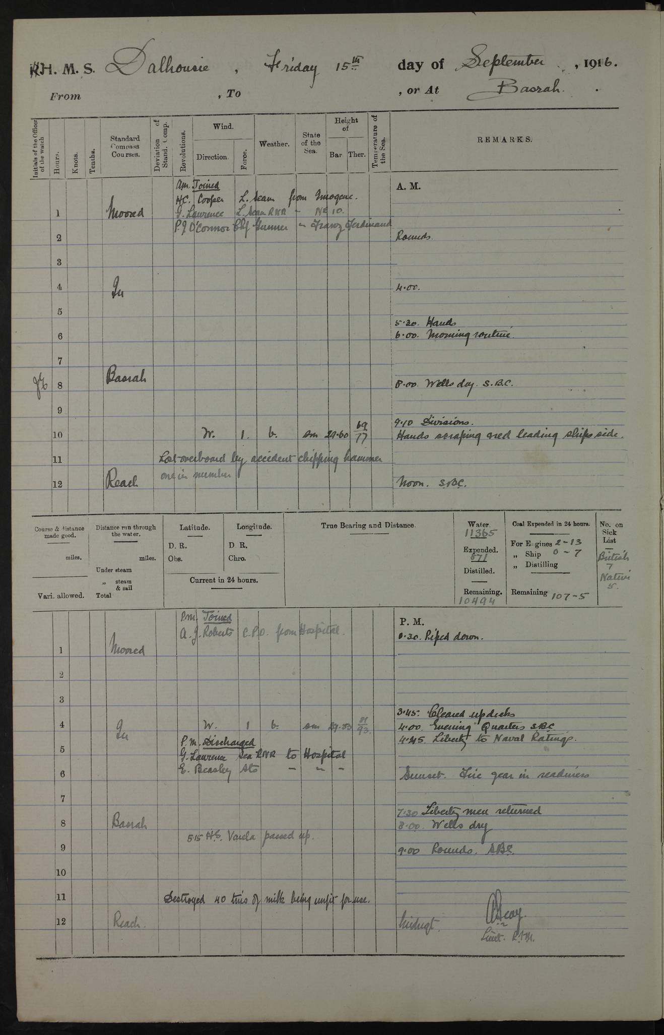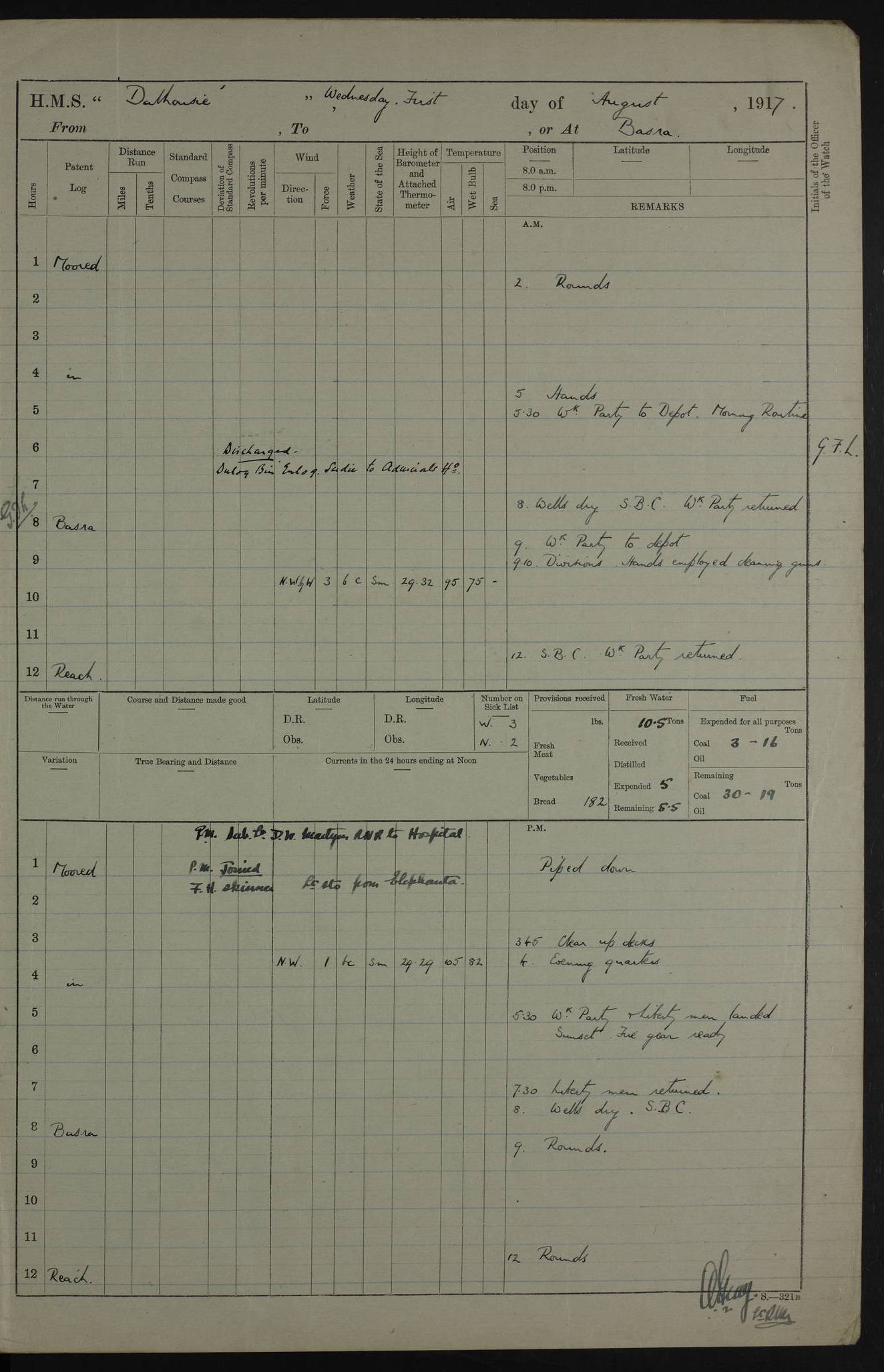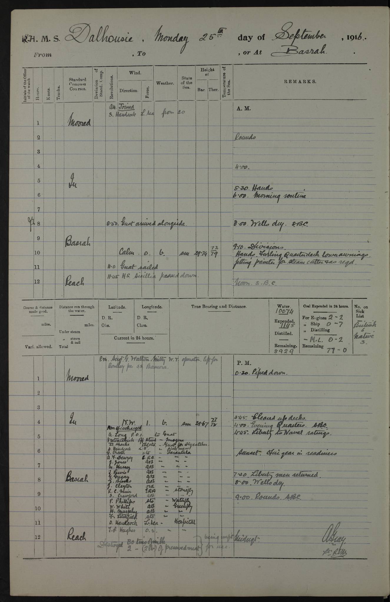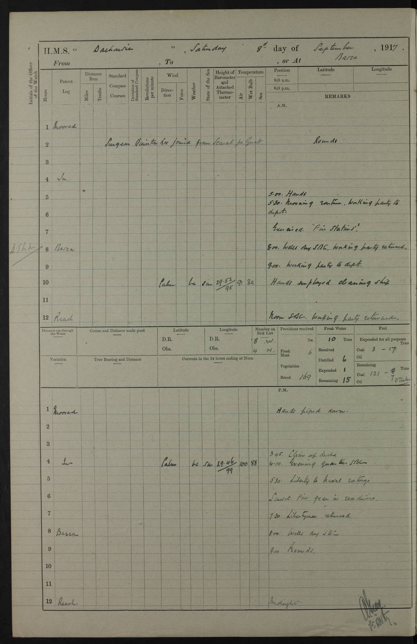 PM - Discharged To Hospital: H Widger, Engine Room Artificer - PW Harrison, Stoker Royal Navy Reserve To Motor Launch 11: J W Whitfield, Stoker 4ef4fa93e53e0a0c910056e2: (https://s3.amazonaws.com:443/oldweather/ADM53-39392/0018_0.jpg) 31 August 1916 Place: Basrah Lat 30.5269, Long 47.8407 2:00am: Rounds 5:05am: Hospital Ship SYRIA passed down 5:30am: Hands 6:00am: Morning Routine 8:00am: Wells dry – Signal Books Correct 9:30am: Divisions - Hands cleaning ship 11:00am: Drew Three Thousand Rupees from the Field treasury 12:00pm: Signal Books Correct – Issued Quinine to ship’s company 12:30pm: Piped Down 3:30pm: 4:00pm: Signal Books Correct 4:30pm: Cleared up decks 5:00pm: Evening Quarters – Leave to Watch of Naval Ratings 7:00pm: Sunset - Fire Gear in readiness 7:30pm: Liberty men returned 8:00pm: Wells dry - Signal Books Correct 9:00pm: Rounds - Signal Books Correct 11:00pm: Destroyed 19 tins Milk being unfit for use. AM – Joined From Motor Launch Depot: M. McMillan, Able Seaman From 5 Mess: T. Jackson, Petty Officer 1st From 4 Mess: T Golden, Stoker – J Tunney, Royal Navy Reserve Trawler Section From 10 Mess: J Donegan Royal Navy Reserve Trawler Section