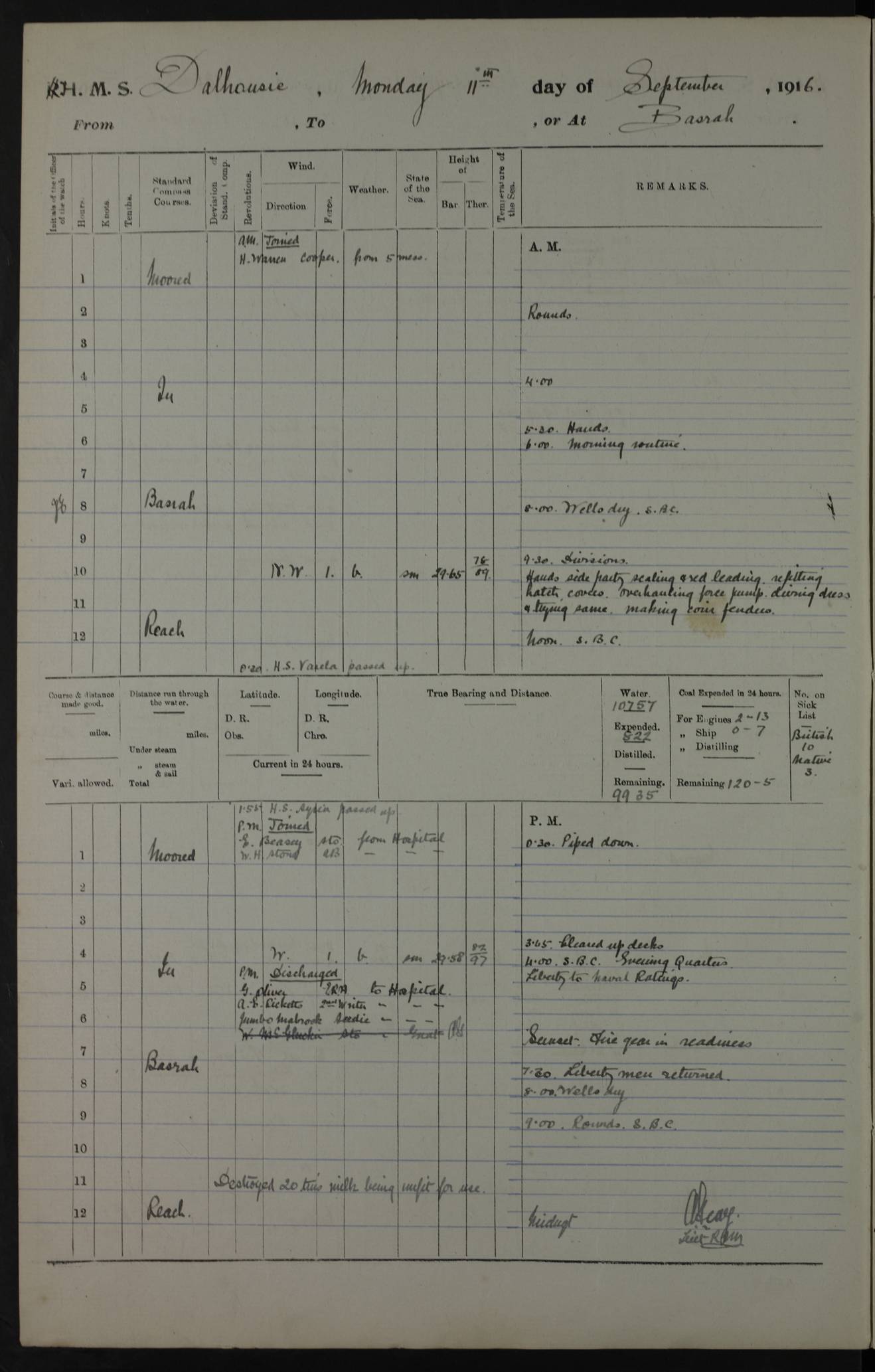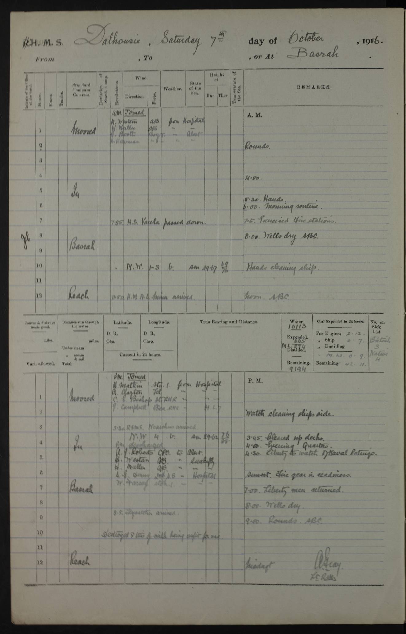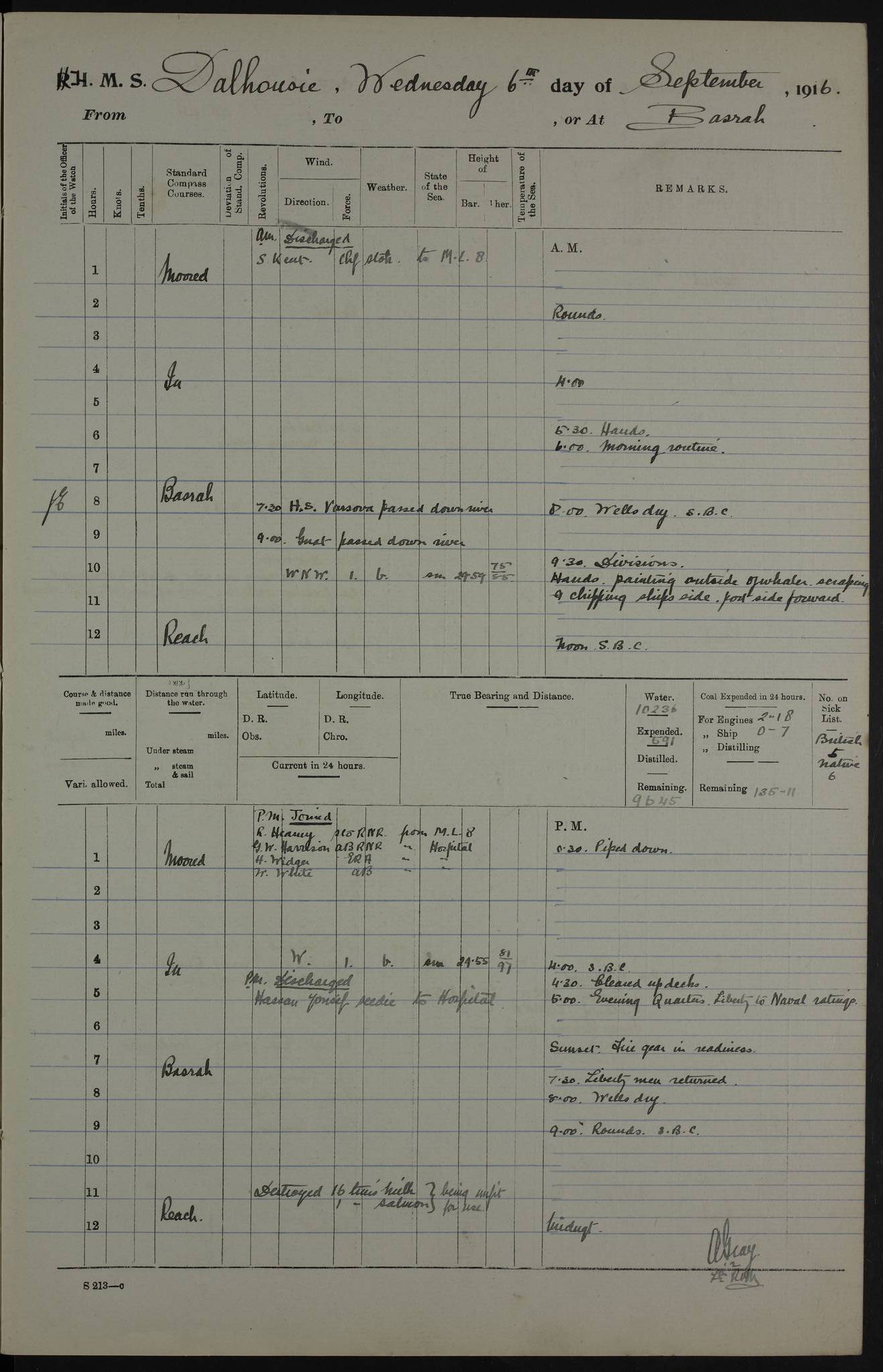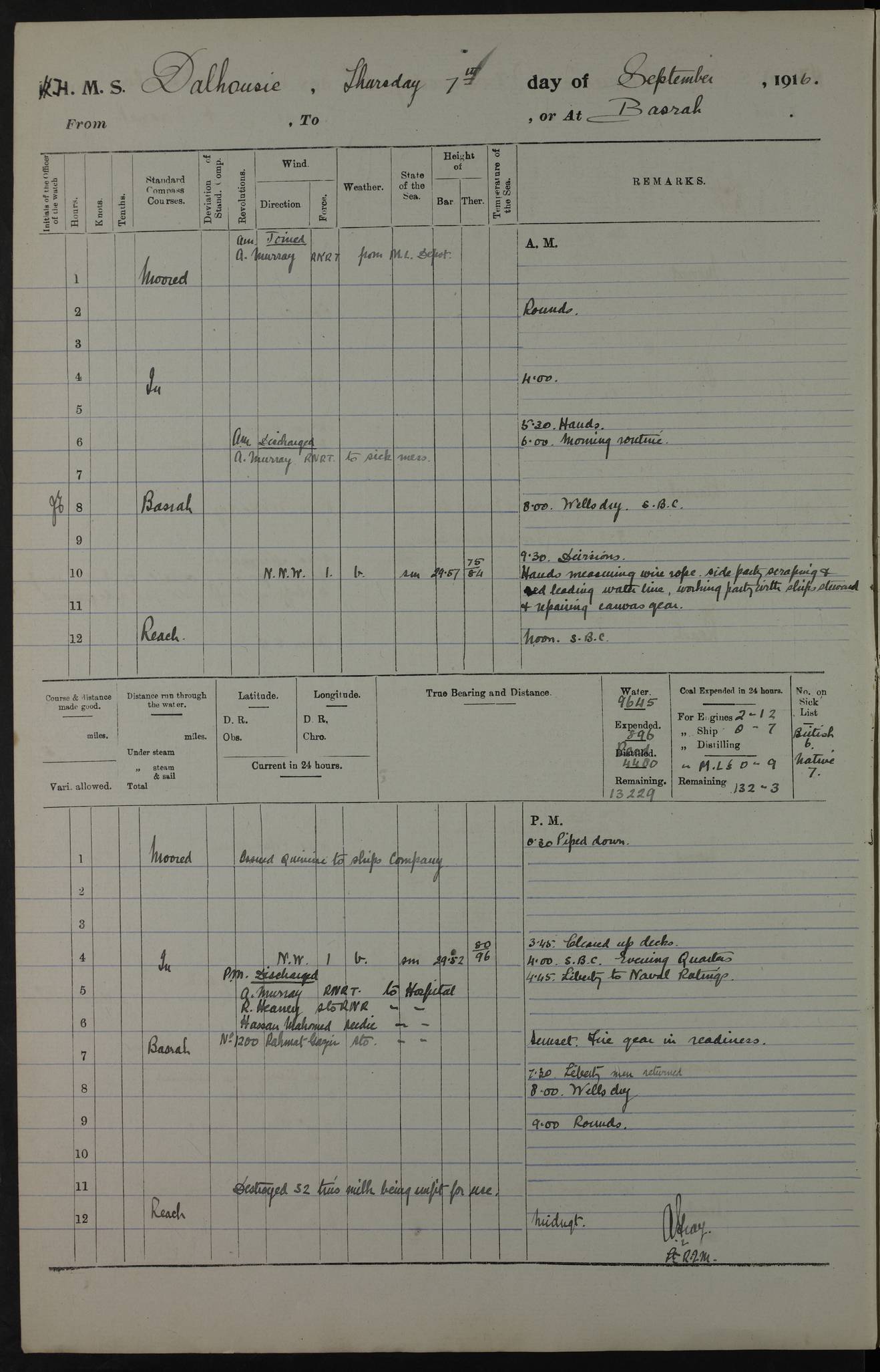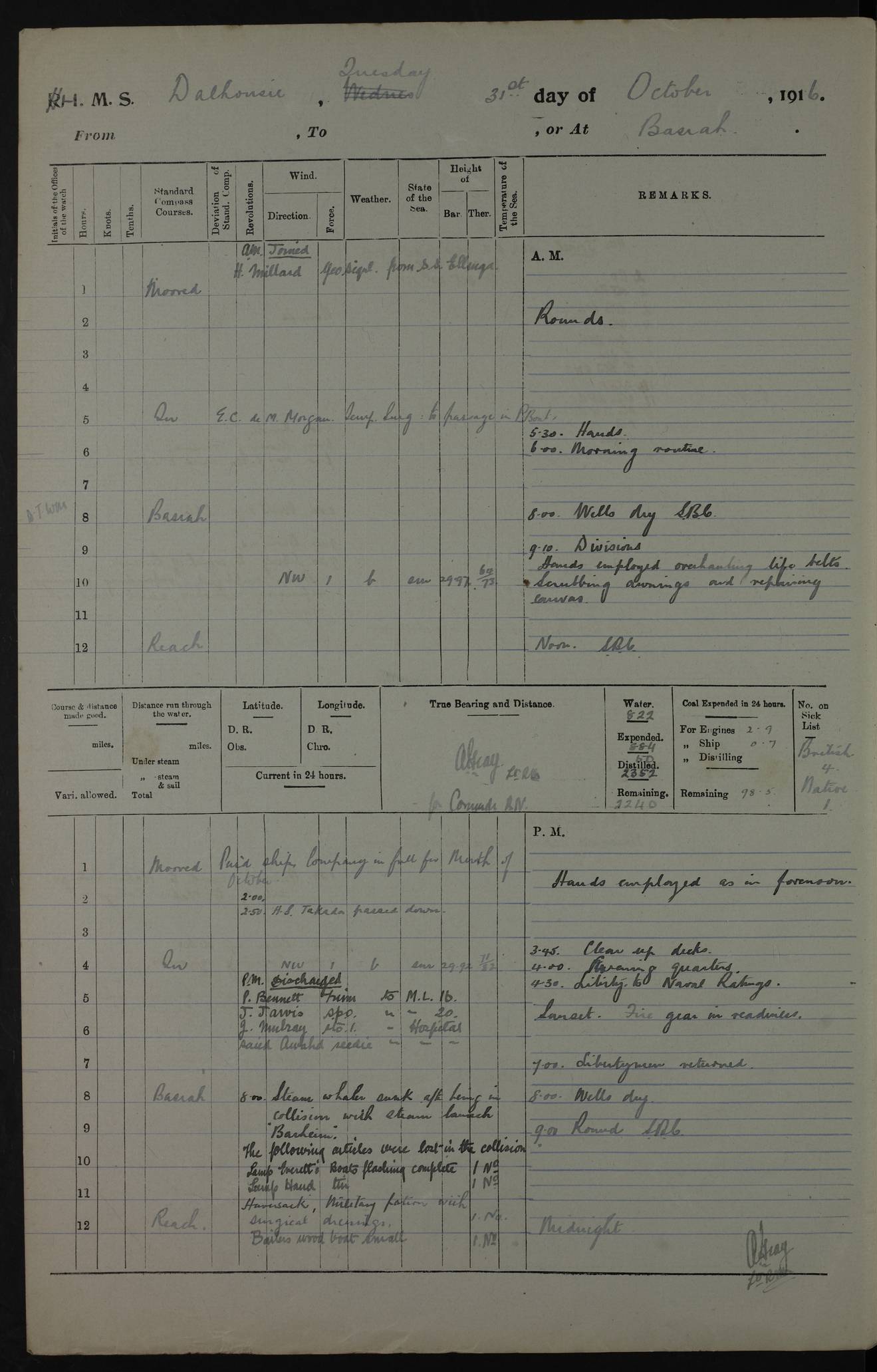 PM - Discharged To Hospital: H Widger, Engine Room Artificer - PW Harrison, Stoker Royal Navy Reserve To Motor Launch 11: J W Whitfield, Stoker 4ef4fa93e53e0a0c910056e2: (https://s3.amazonaws.com:443/oldweather/ADM53-39392/0018_0.jpg) 31 August 1916 Place: Basrah Lat 30.5269, Long 47.8407 2:00am: Rounds 5:05am: Hospital Ship SYRIA passed down 5:30am: Hands 6:00am: Morning Routine 8:00am: Wells dry – Signal Books Correct 9:30am: Divisions - Hands cleaning ship 11:00am: Drew Three Thousand Rupees from the Field treasury 12:00pm: Signal Books Correct – Issued Quinine to ship’s company 12:30pm: Piped Down 3:30pm: 4:00pm: Signal Books Correct 4:30pm: Cleared up decks 5:00pm: Evening Quarters – Leave to Watch of Naval Ratings 7:00pm: Sunset - Fire Gear in readiness 7:30pm: Liberty men returned 8:00pm: Wells dry - Signal Books Correct 9:00pm: Rounds - Signal Books Correct 11:00pm: Destroyed 19 tins Milk being unfit for use. AM – Joined From Motor Launch Depot: M. McMillan, Able Seaman From 5 Mess: T. Jackson, Petty Officer 1st From 4 Mess: T Golden, Stoker – J Tunney, Royal Navy Reserve Trawler Section From 10 Mess: J Donegan Royal Navy Reserve Trawler Section