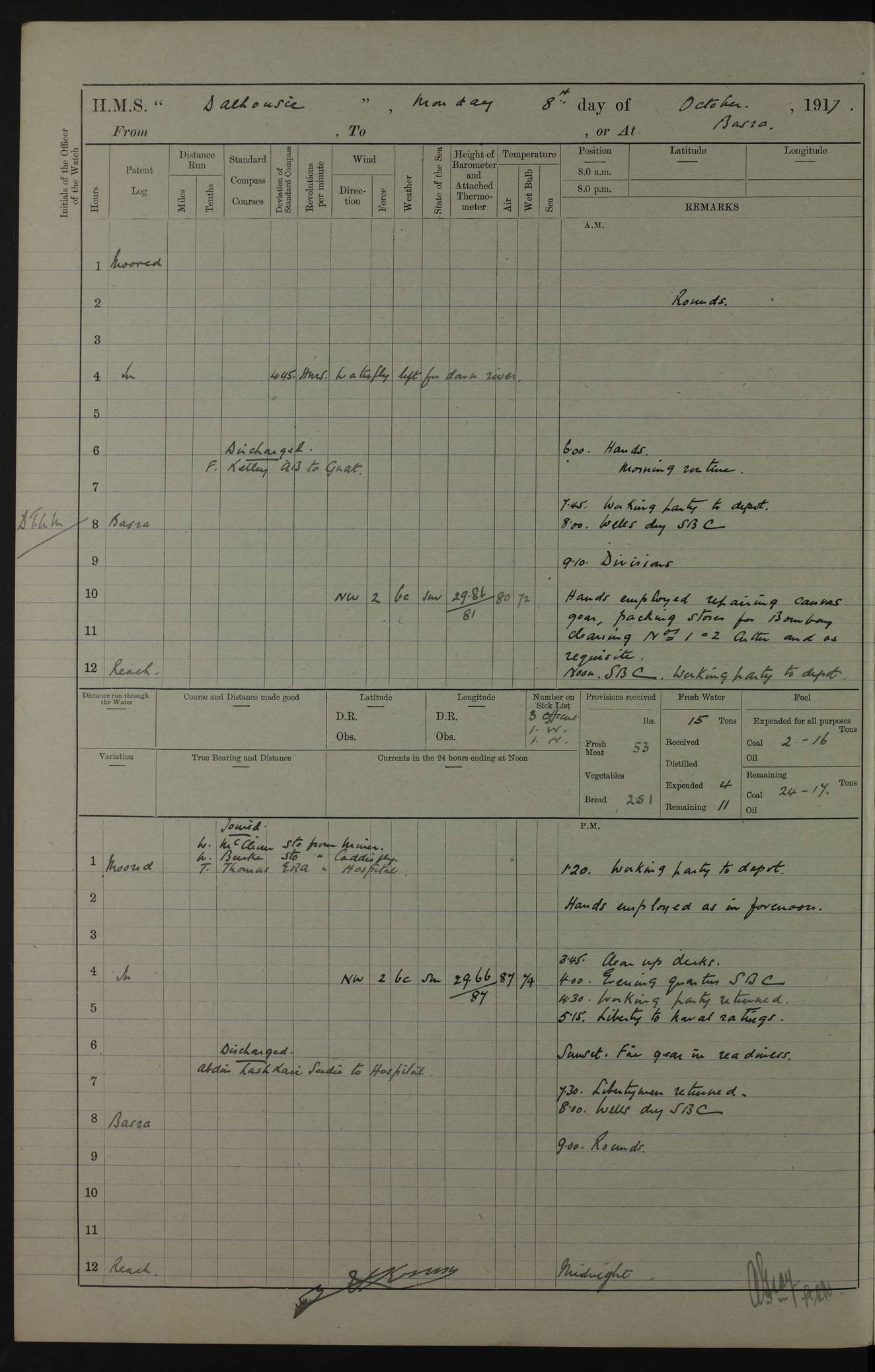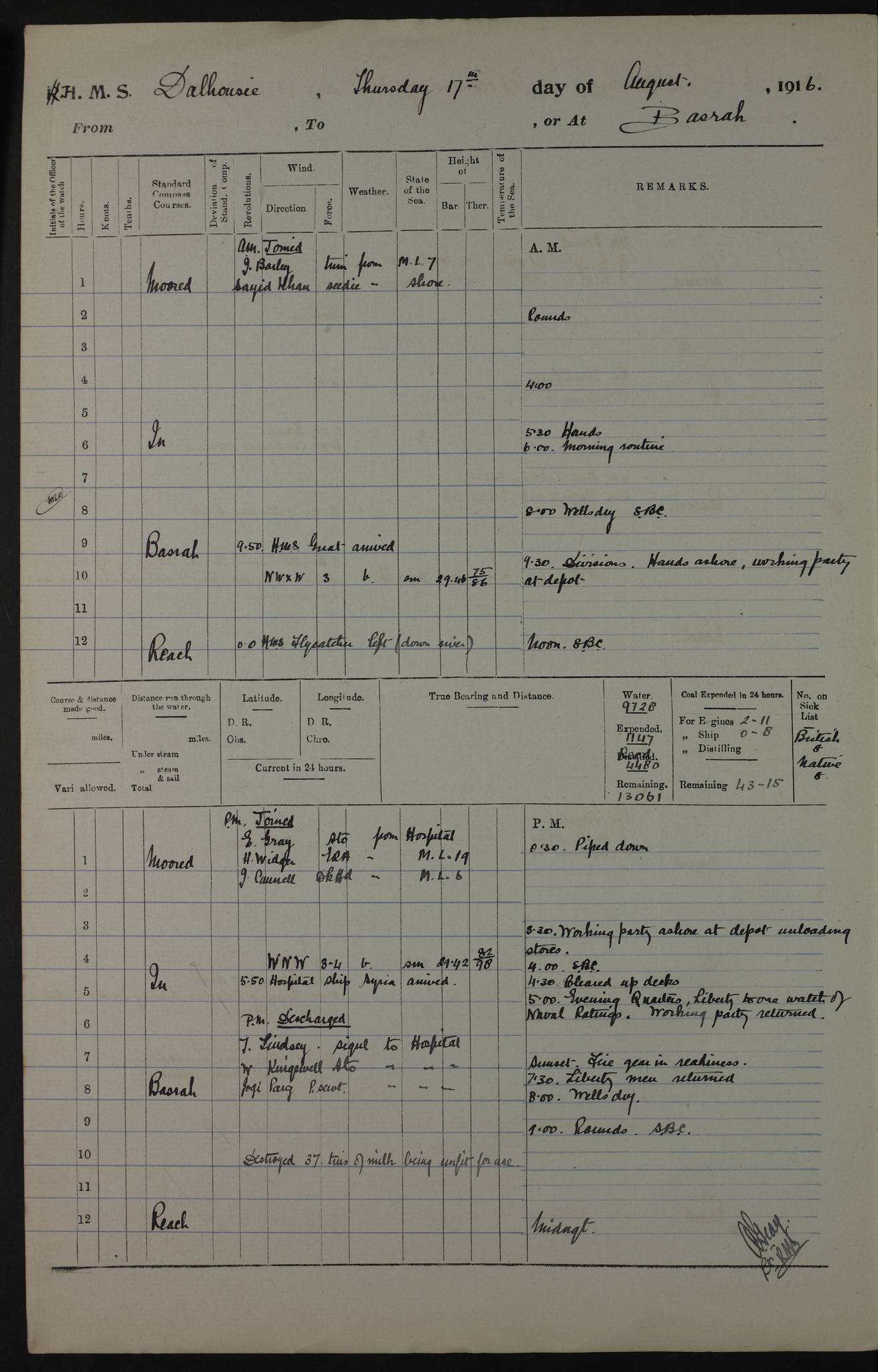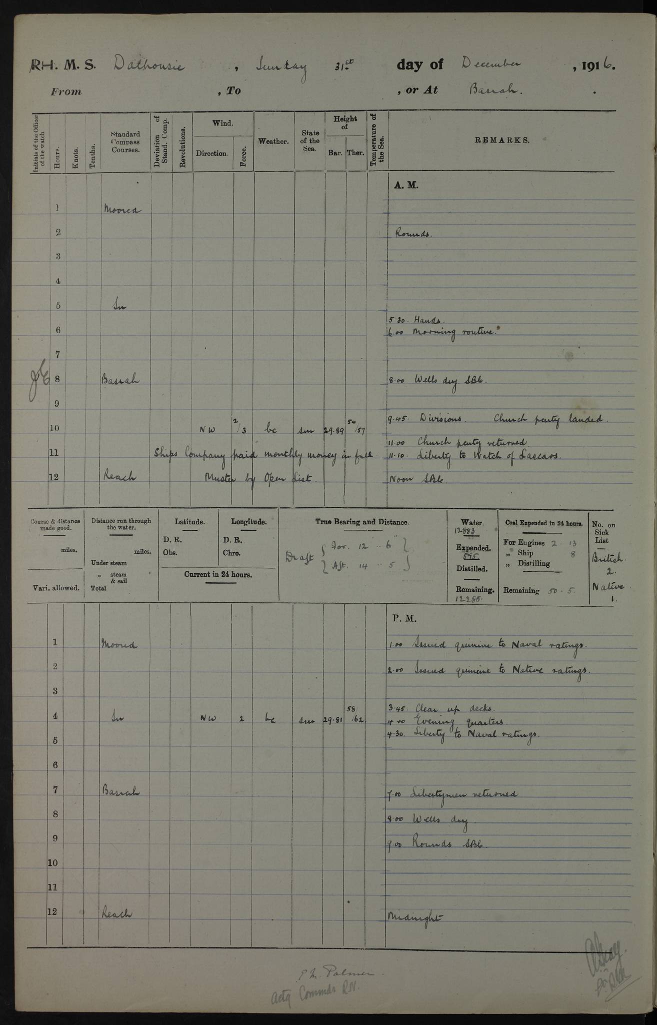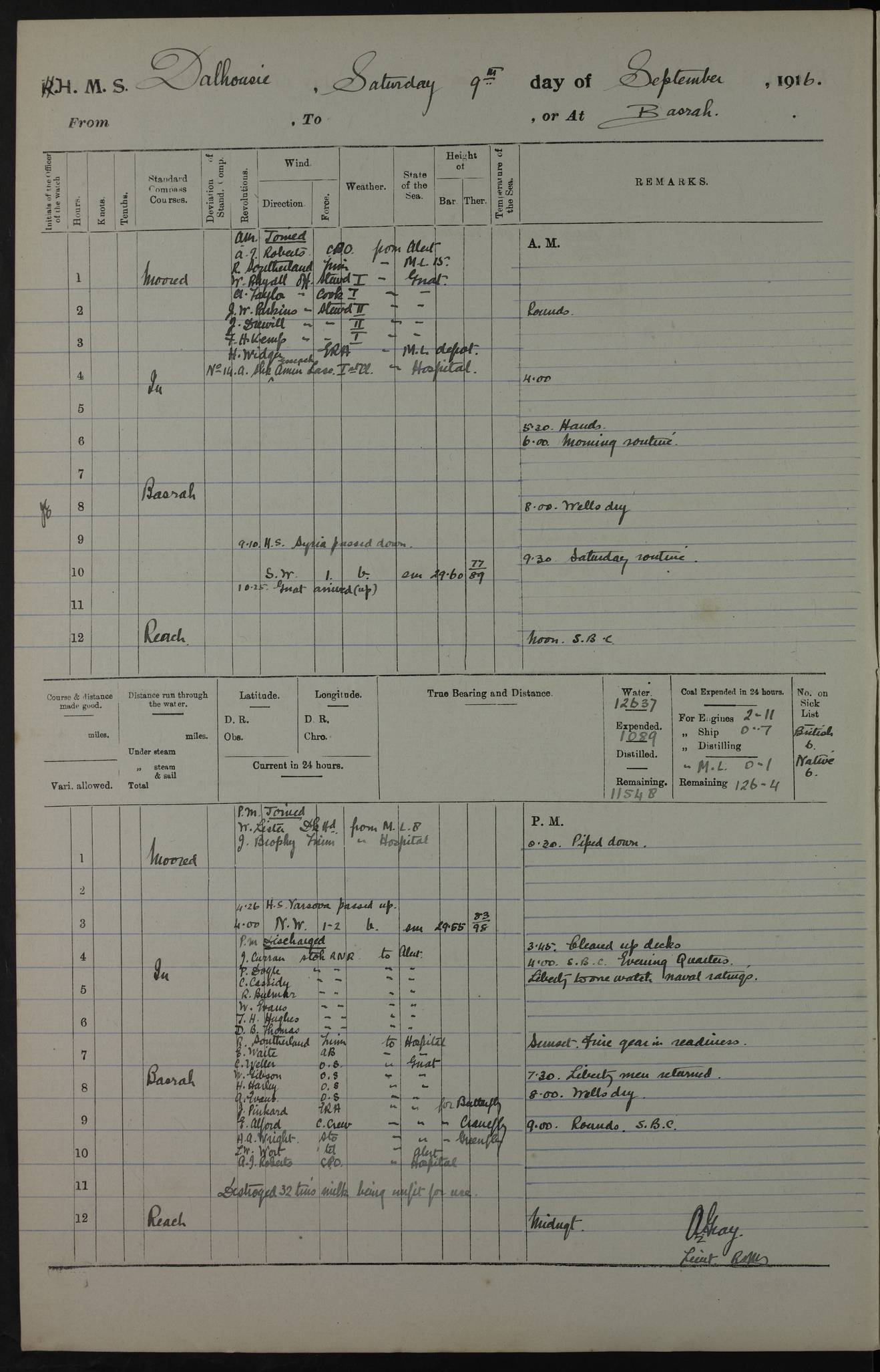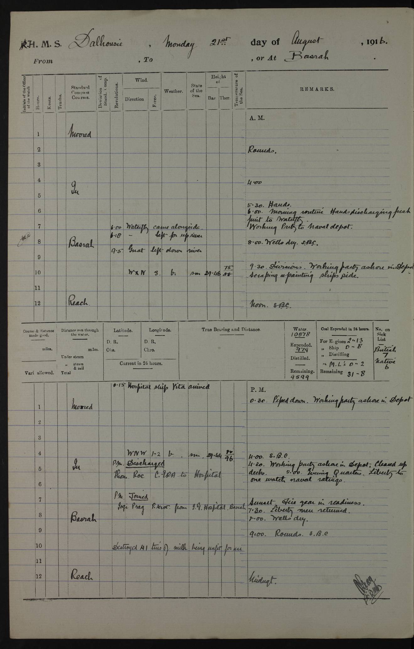 PM - Discharged To Hospital: H Widger, Engine Room Artificer - PW Harrison, Stoker Royal Navy Reserve To Motor Launch 11: J W Whitfield, Stoker 4ef4fa93e53e0a0c910056e2: (https://s3.amazonaws.com:443/oldweather/ADM53-39392/0018_0.jpg) 31 August 1916 Place: Basrah Lat 30.5269, Long 47.8407 2:00am: Rounds 5:05am: Hospital Ship SYRIA passed down 5:30am: Hands 6:00am: Morning Routine 8:00am: Wells dry – Signal Books Correct 9:30am: Divisions - Hands cleaning ship 11:00am: Drew Three Thousand Rupees from the Field treasury 12:00pm: Signal Books Correct – Issued Quinine to ship’s company 12:30pm: Piped Down 3:30pm: 4:00pm: Signal Books Correct 4:30pm: Cleared up decks 5:00pm: Evening Quarters – Leave to Watch of Naval Ratings 7:00pm: Sunset - Fire Gear in readiness 7:30pm: Liberty men returned 8:00pm: Wells dry - Signal Books Correct 9:00pm: Rounds - Signal Books Correct 11:00pm: Destroyed 19 tins Milk being unfit for use. AM – Joined From Motor Launch Depot: M. McMillan, Able Seaman From 5 Mess: T. Jackson, Petty Officer 1st From 4 Mess: T Golden, Stoker – J Tunney, Royal Navy Reserve Trawler Section From 10 Mess: J Donegan Royal Navy Reserve Trawler Section