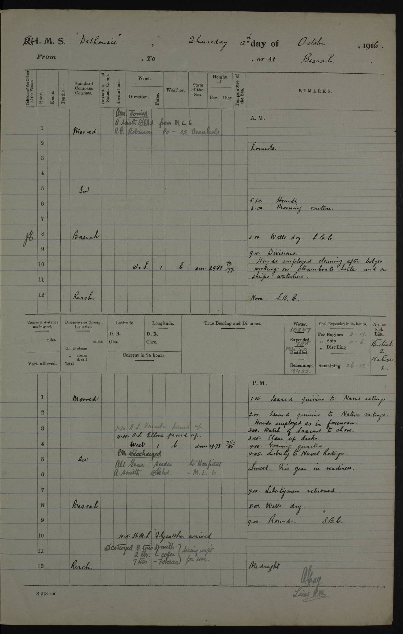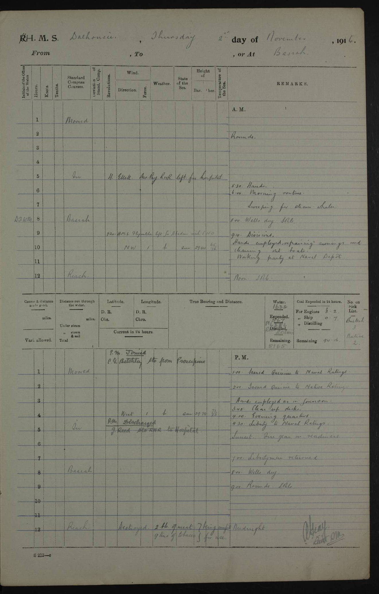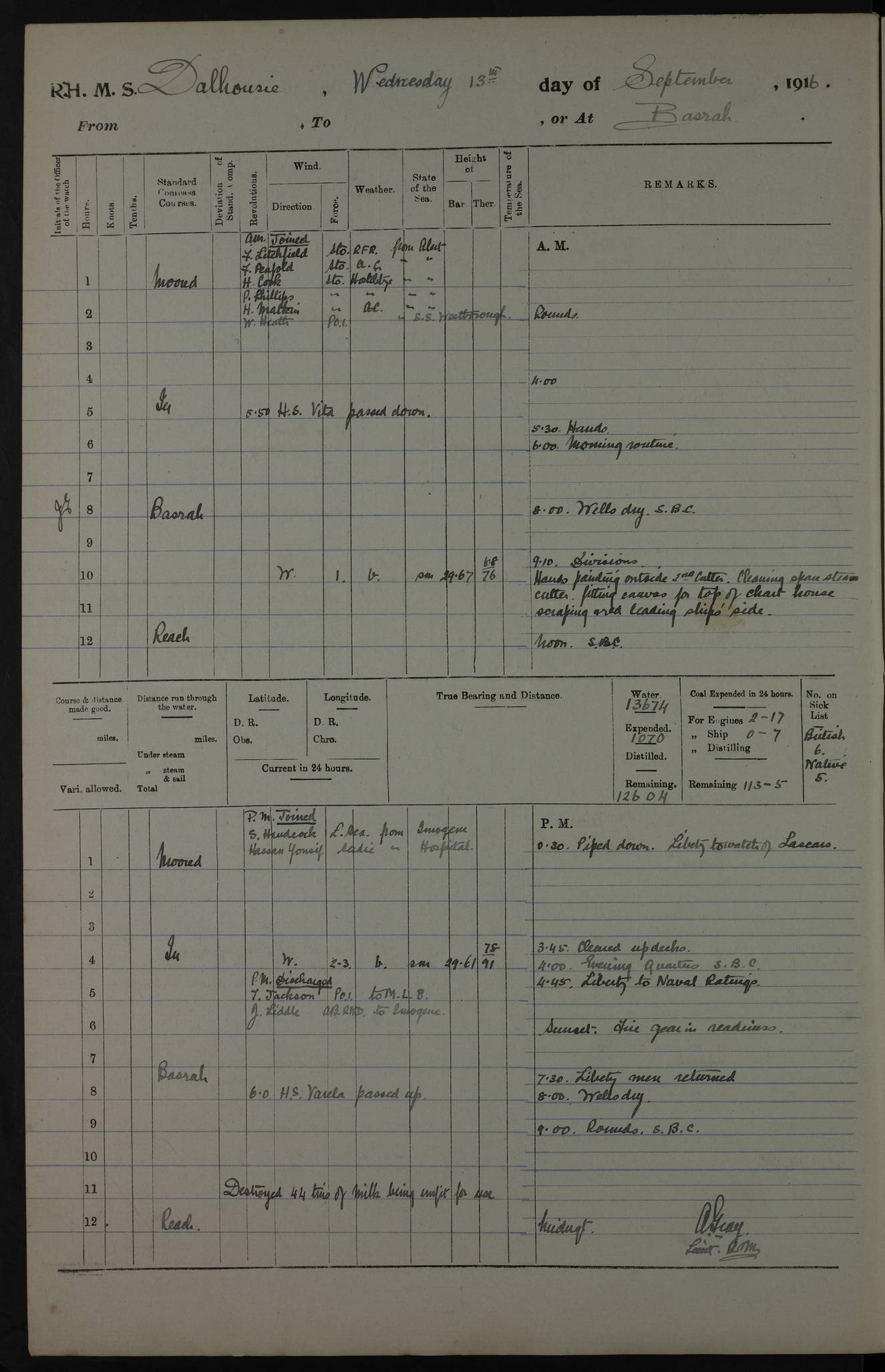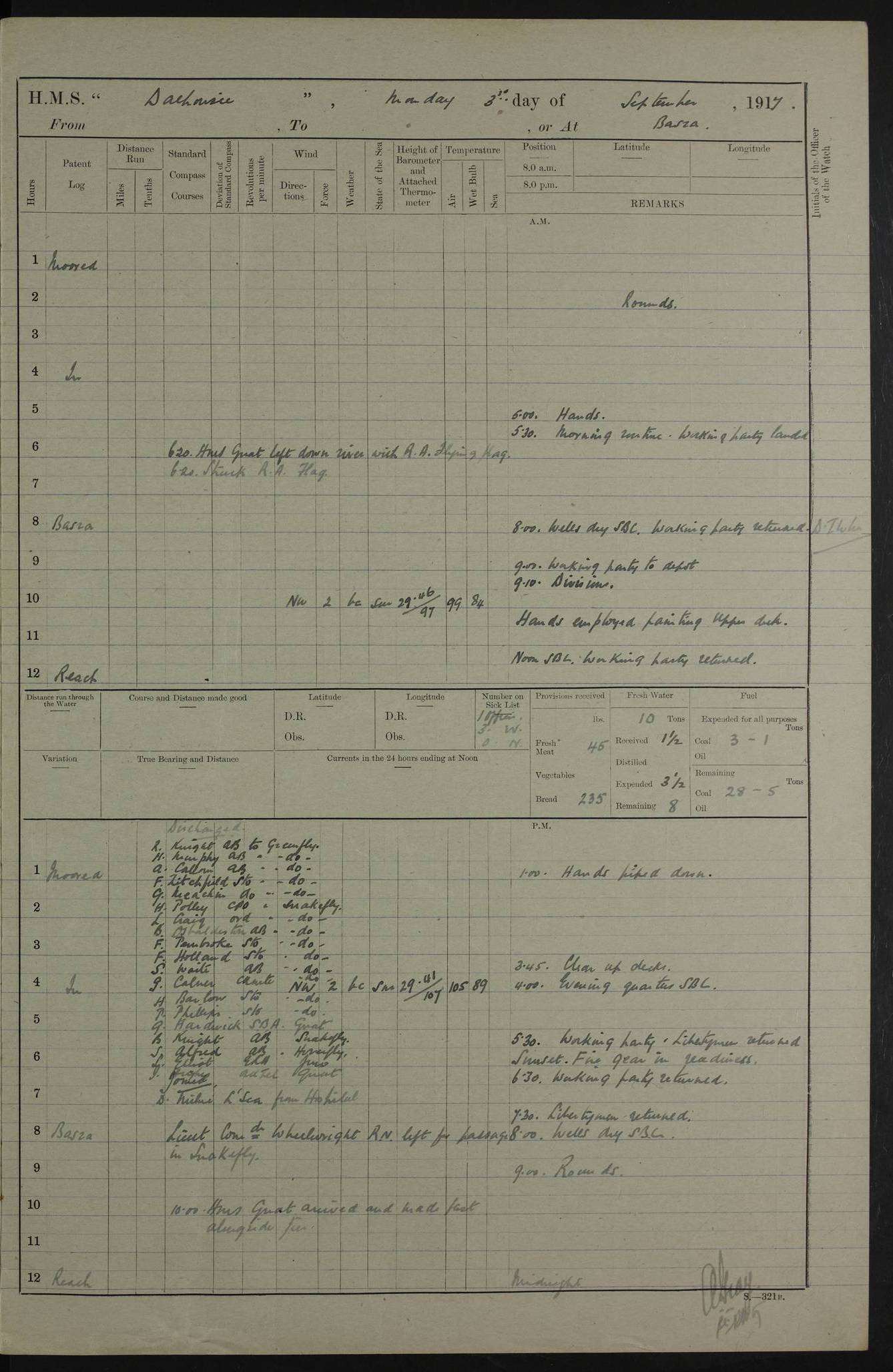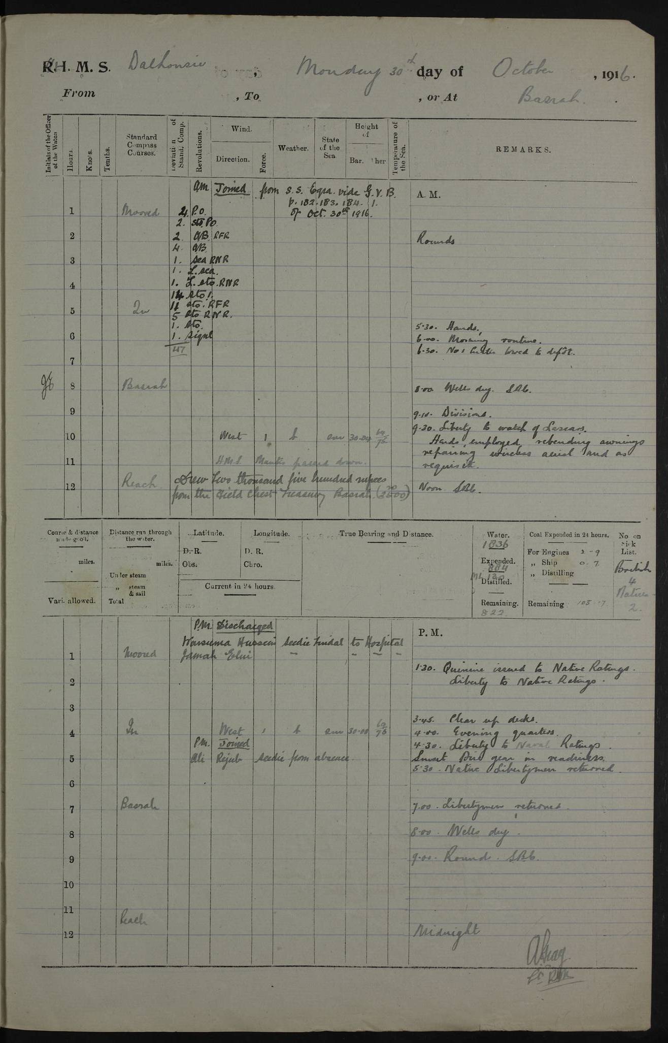 PM - Discharged To Hospital: H Widger, Engine Room Artificer - PW Harrison, Stoker Royal Navy Reserve To Motor Launch 11: J W Whitfield, Stoker 4ef4fa93e53e0a0c910056e2: (https://s3.amazonaws.com:443/oldweather/ADM53-39392/0018_0.jpg) 31 August 1916 Place: Basrah Lat 30.5269, Long 47.8407 2:00am: Rounds 5:05am: Hospital Ship SYRIA passed down 5:30am: Hands 6:00am: Morning Routine 8:00am: Wells dry – Signal Books Correct 9:30am: Divisions - Hands cleaning ship 11:00am: Drew Three Thousand Rupees from the Field treasury 12:00pm: Signal Books Correct – Issued Quinine to ship’s company 12:30pm: Piped Down 3:30pm: 4:00pm: Signal Books Correct 4:30pm: Cleared up decks 5:00pm: Evening Quarters – Leave to Watch of Naval Ratings 7:00pm: Sunset - Fire Gear in readiness 7:30pm: Liberty men returned 8:00pm: Wells dry - Signal Books Correct 9:00pm: Rounds - Signal Books Correct 11:00pm: Destroyed 19 tins Milk being unfit for use. AM – Joined From Motor Launch Depot: M. McMillan, Able Seaman From 5 Mess: T. Jackson, Petty Officer 1st From 4 Mess: T Golden, Stoker – J Tunney, Royal Navy Reserve Trawler Section From 10 Mess: J Donegan Royal Navy Reserve Trawler Section