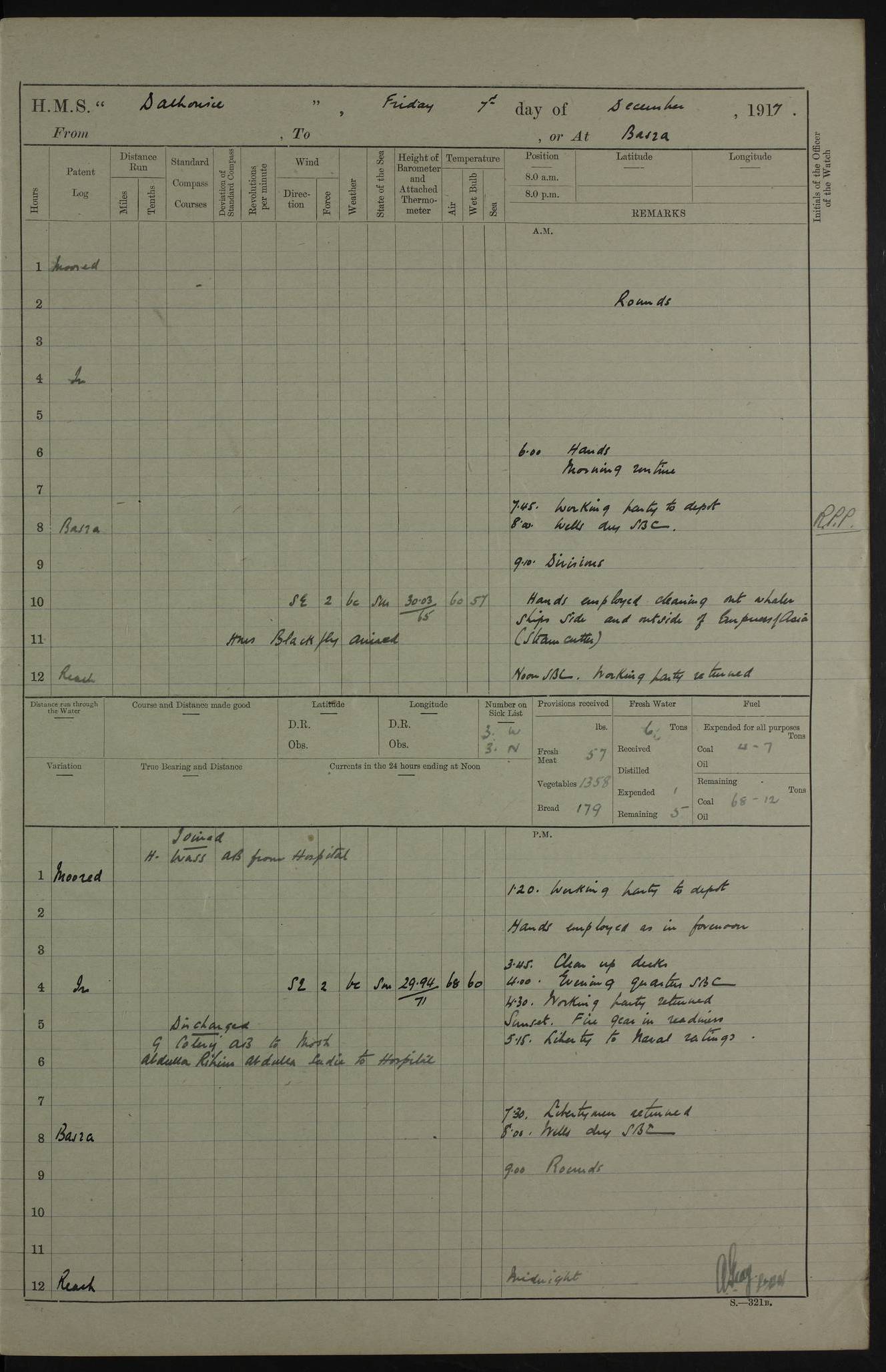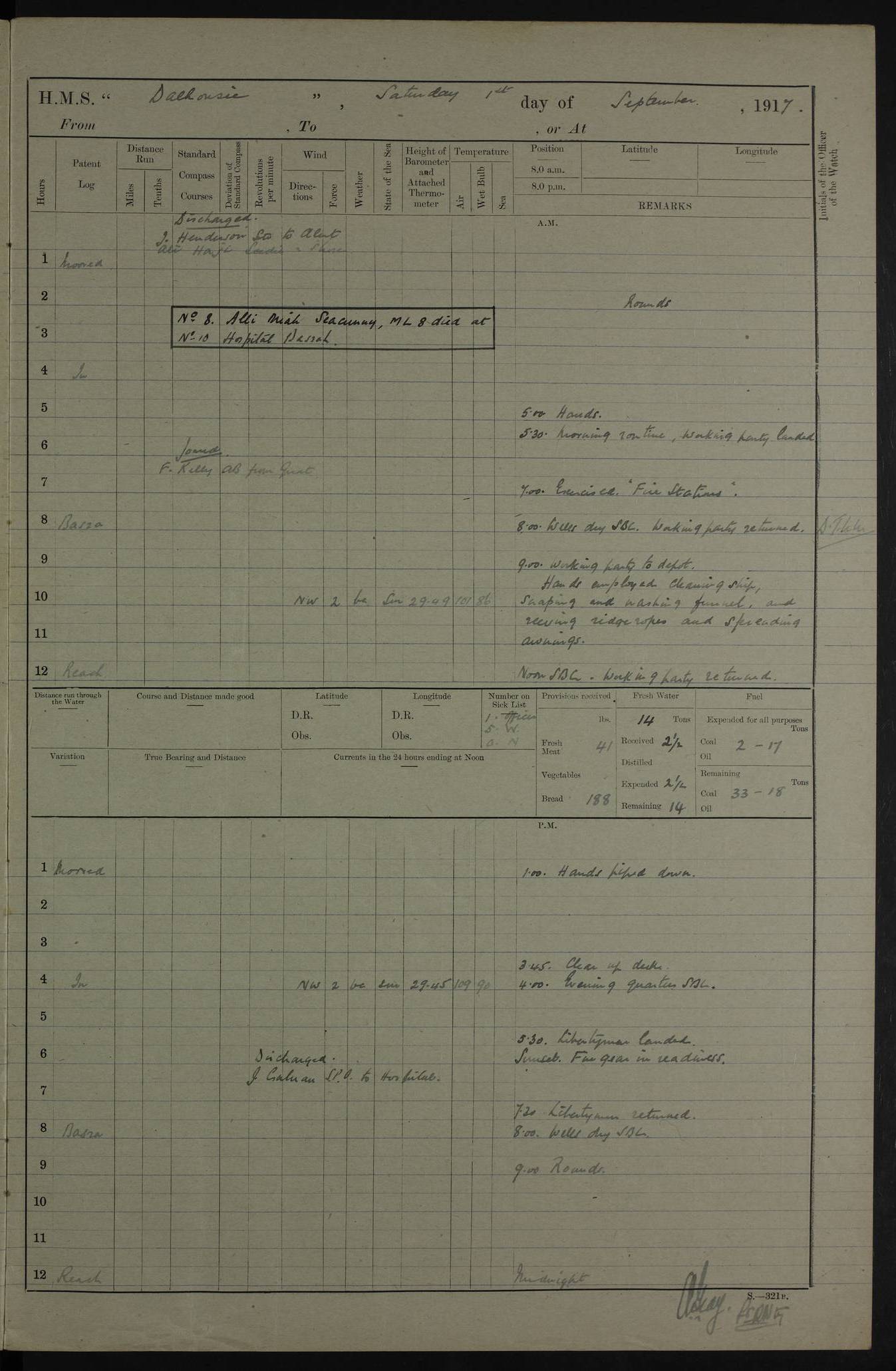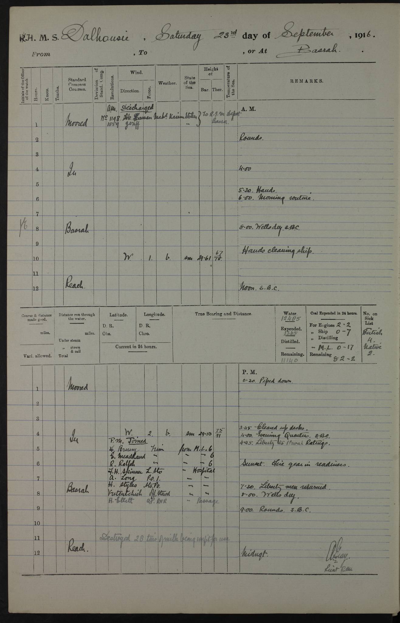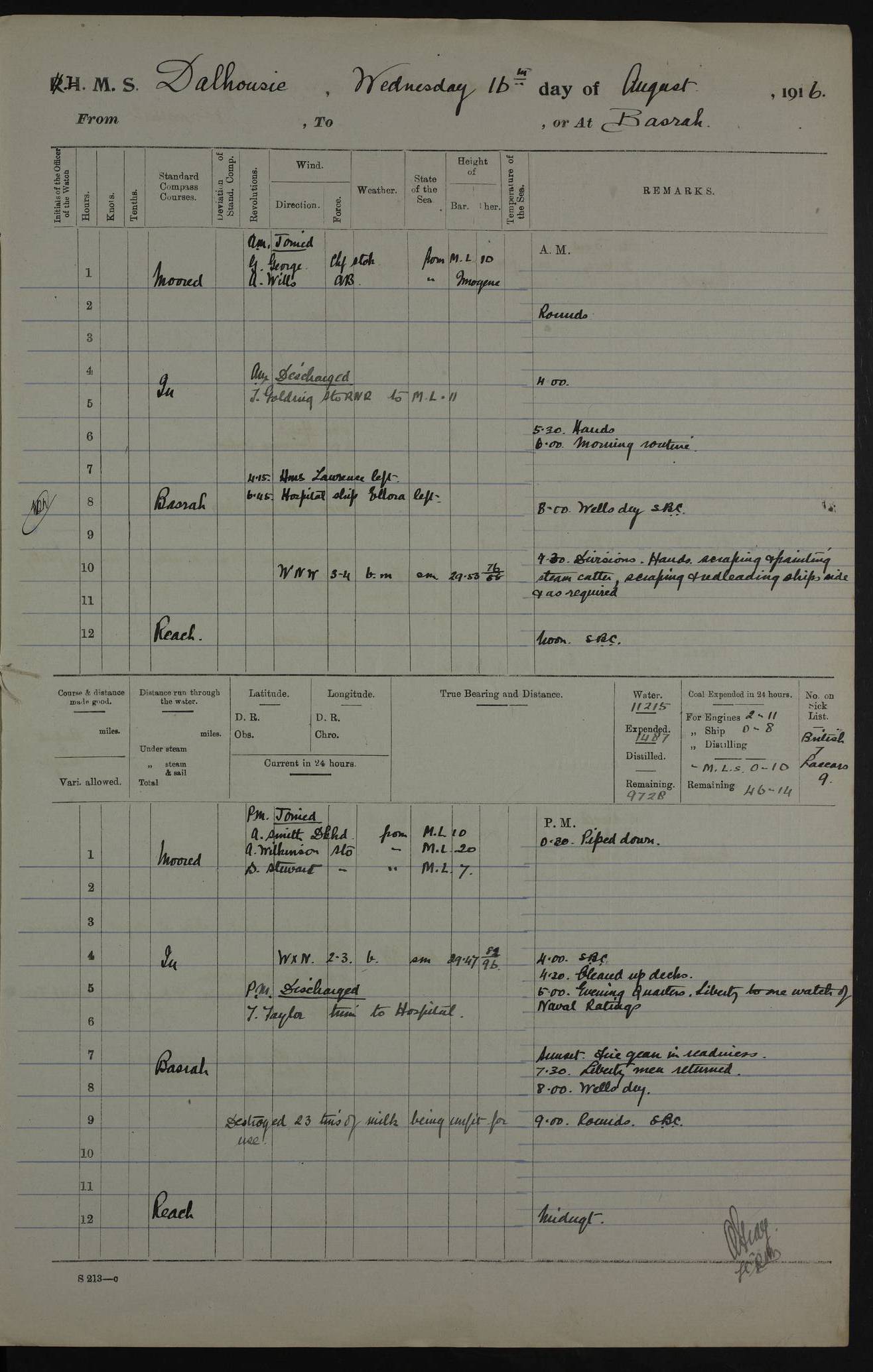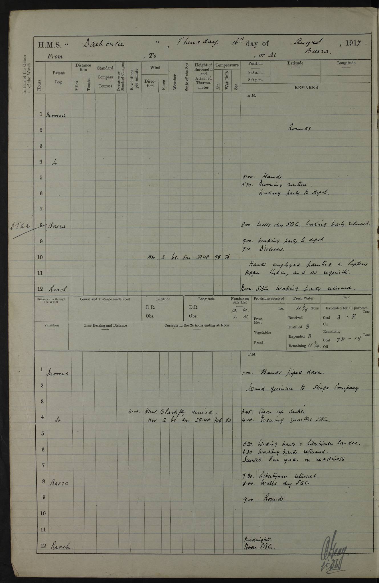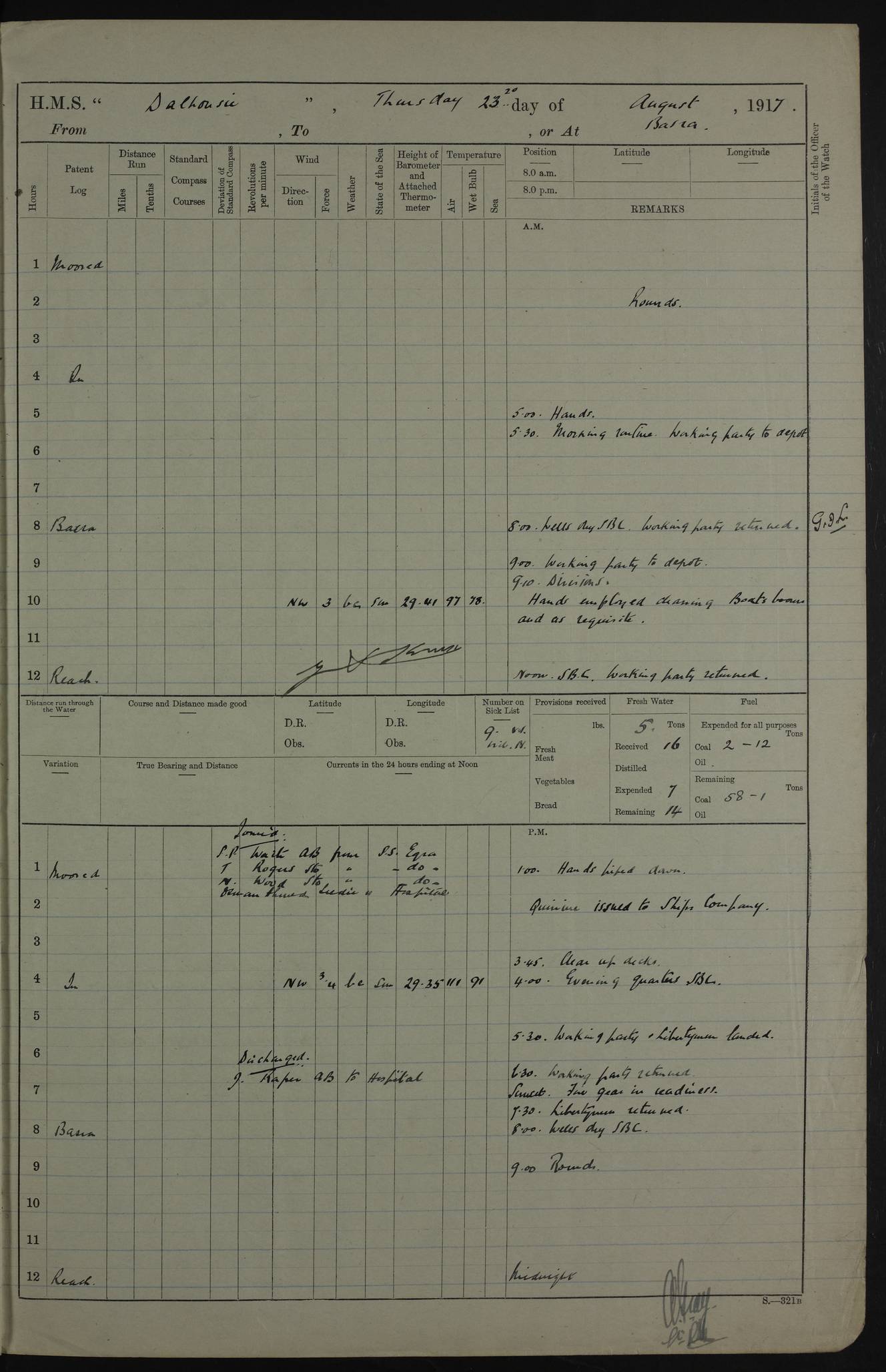 PM - Discharged To Hospital: H Widger, Engine Room Artificer - PW Harrison, Stoker Royal Navy Reserve To Motor Launch 11: J W Whitfield, Stoker 4ef4fa93e53e0a0c910056e2: (https://s3.amazonaws.com:443/oldweather/ADM53-39392/0018_0.jpg) 31 August 1916 Place: Basrah Lat 30.5269, Long 47.8407 2:00am: Rounds 5:05am: Hospital Ship SYRIA passed down 5:30am: Hands 6:00am: Morning Routine 8:00am: Wells dry – Signal Books Correct 9:30am: Divisions - Hands cleaning ship 11:00am: Drew Three Thousand Rupees from the Field treasury 12:00pm: Signal Books Correct – Issued Quinine to ship’s company 12:30pm: Piped Down 3:30pm: 4:00pm: Signal Books Correct 4:30pm: Cleared up decks 5:00pm: Evening Quarters – Leave to Watch of Naval Ratings 7:00pm: Sunset - Fire Gear in readiness 7:30pm: Liberty men returned 8:00pm: Wells dry - Signal Books Correct 9:00pm: Rounds - Signal Books Correct 11:00pm: Destroyed 19 tins Milk being unfit for use. AM – Joined From Motor Launch Depot: M. McMillan, Able Seaman From 5 Mess: T. Jackson, Petty Officer 1st From 4 Mess: T Golden, Stoker – J Tunney, Royal Navy Reserve Trawler Section From 10 Mess: J Donegan Royal Navy Reserve Trawler Section