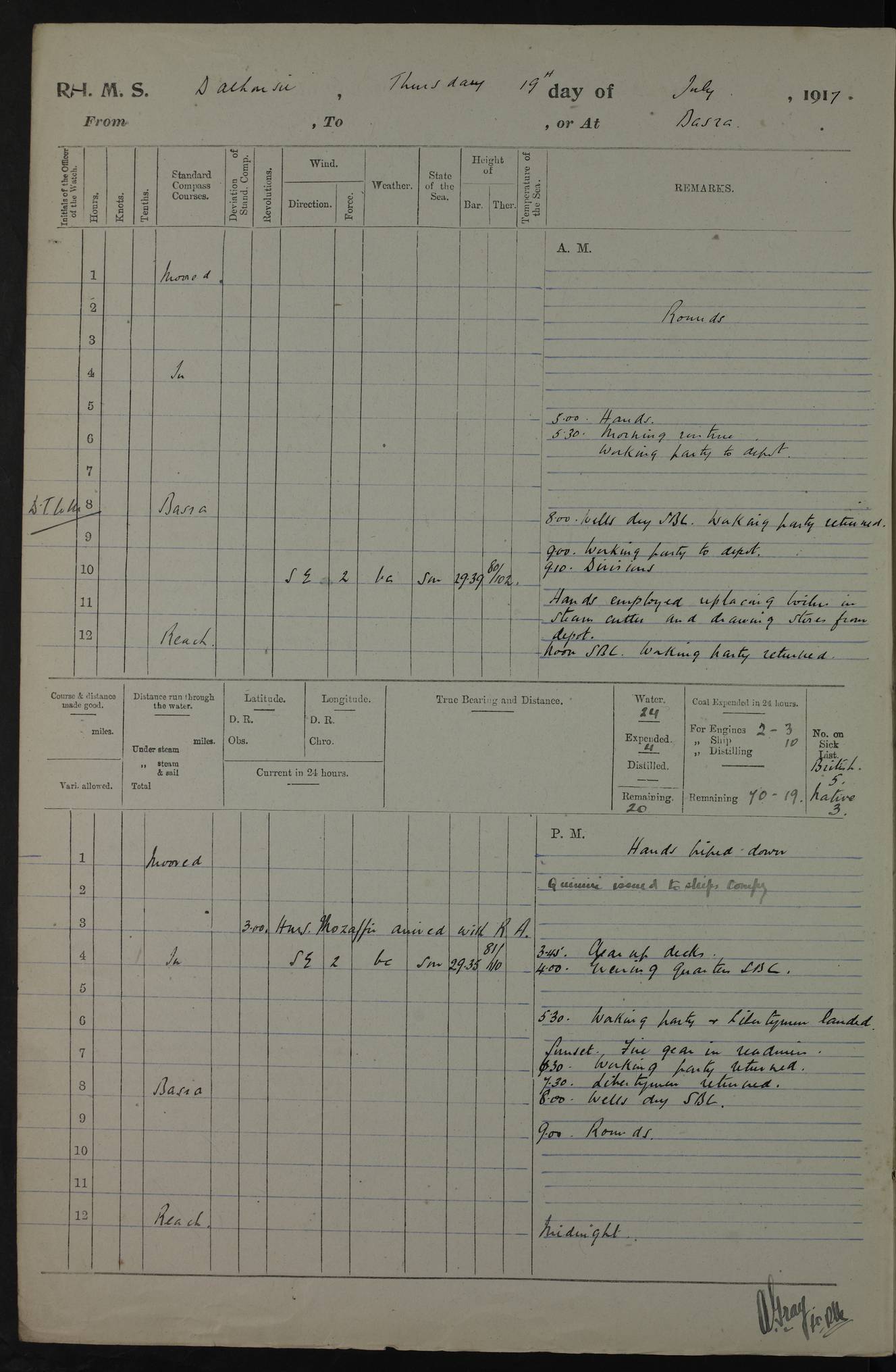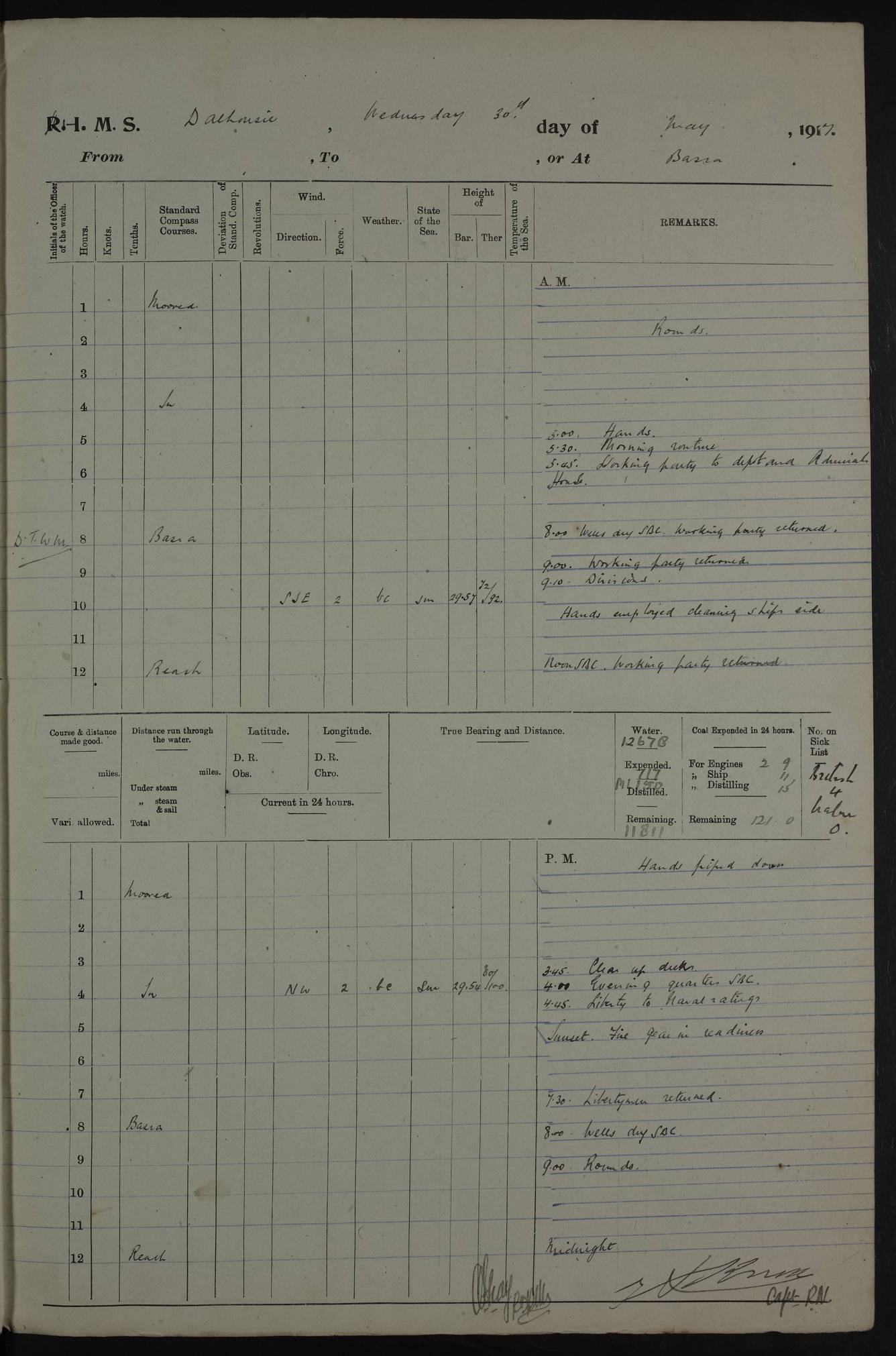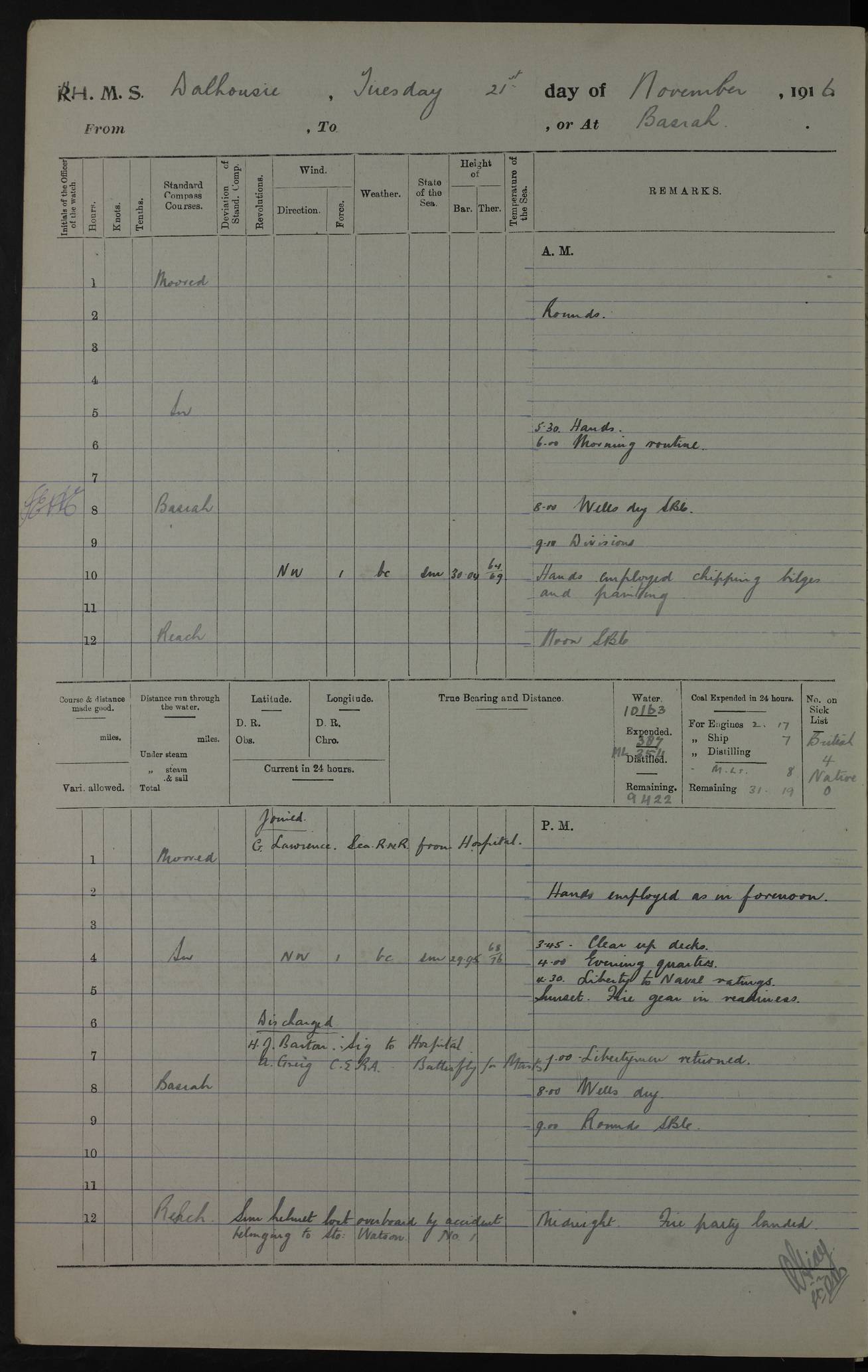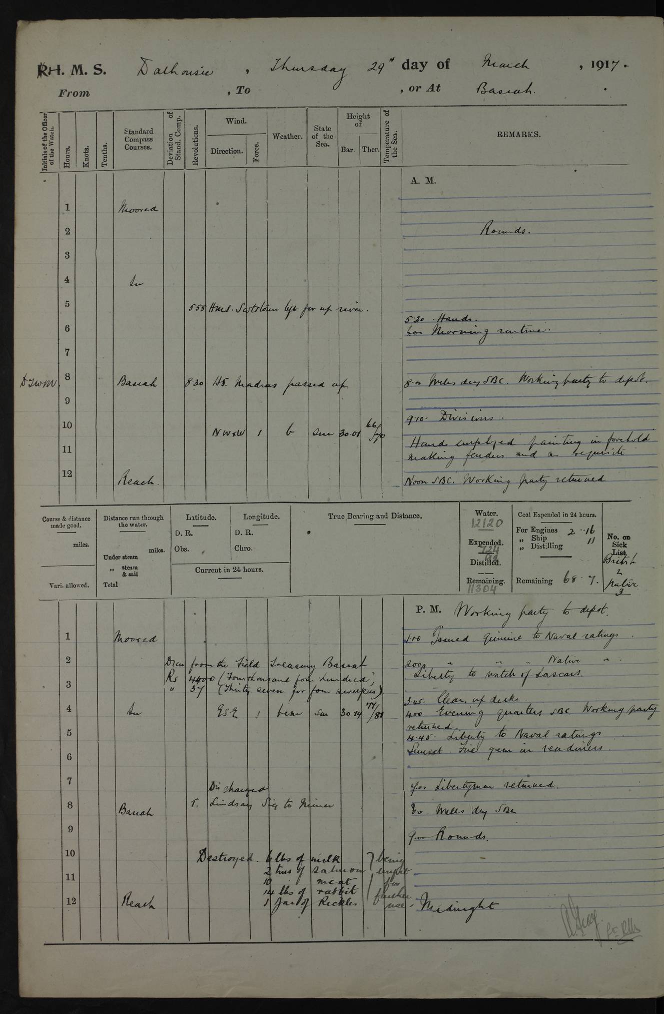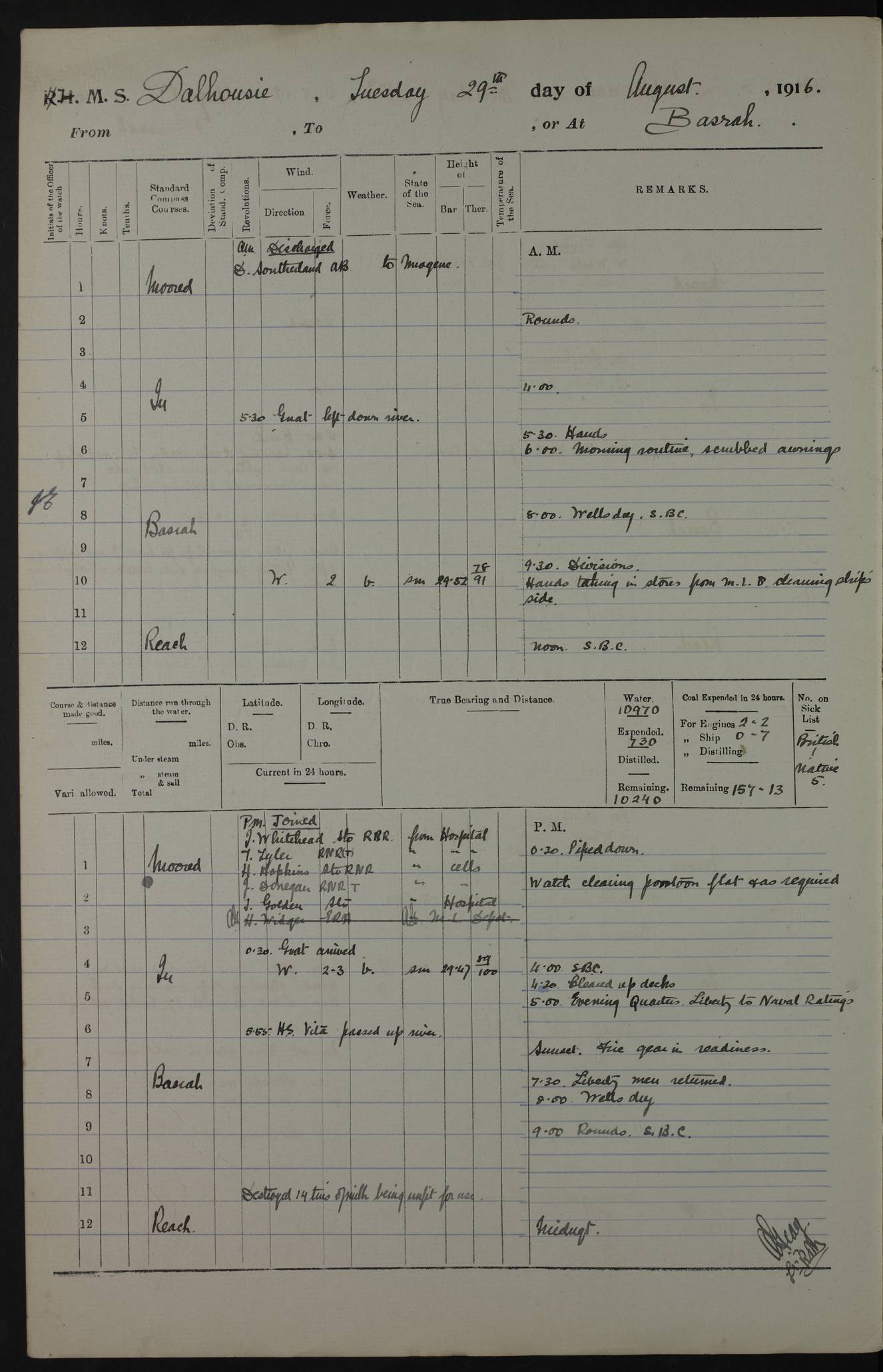 PM - Discharged To Hospital: H Widger, Engine Room Artificer - PW Harrison, Stoker Royal Navy Reserve To Motor Launch 11: J W Whitfield, Stoker 4ef4fa93e53e0a0c910056e2: (https://s3.amazonaws.com:443/oldweather/ADM53-39392/0018_0.jpg) 31 August 1916 Place: Basrah Lat 30.5269, Long 47.8407 2:00am: Rounds 5:05am: Hospital Ship SYRIA passed down 5:30am: Hands 6:00am: Morning Routine 8:00am: Wells dry – Signal Books Correct 9:30am: Divisions - Hands cleaning ship 11:00am: Drew Three Thousand Rupees from the Field treasury 12:00pm: Signal Books Correct – Issued Quinine to ship’s company 12:30pm: Piped Down 3:30pm: 4:00pm: Signal Books Correct 4:30pm: Cleared up decks 5:00pm: Evening Quarters – Leave to Watch of Naval Ratings 7:00pm: Sunset - Fire Gear in readiness 7:30pm: Liberty men returned 8:00pm: Wells dry - Signal Books Correct 9:00pm: Rounds - Signal Books Correct 11:00pm: Destroyed 19 tins Milk being unfit for use. AM – Joined From Motor Launch Depot: M. McMillan, Able Seaman From 5 Mess: T. Jackson, Petty Officer 1st From 4 Mess: T Golden, Stoker – J Tunney, Royal Navy Reserve Trawler Section From 10 Mess: J Donegan Royal Navy Reserve Trawler Section