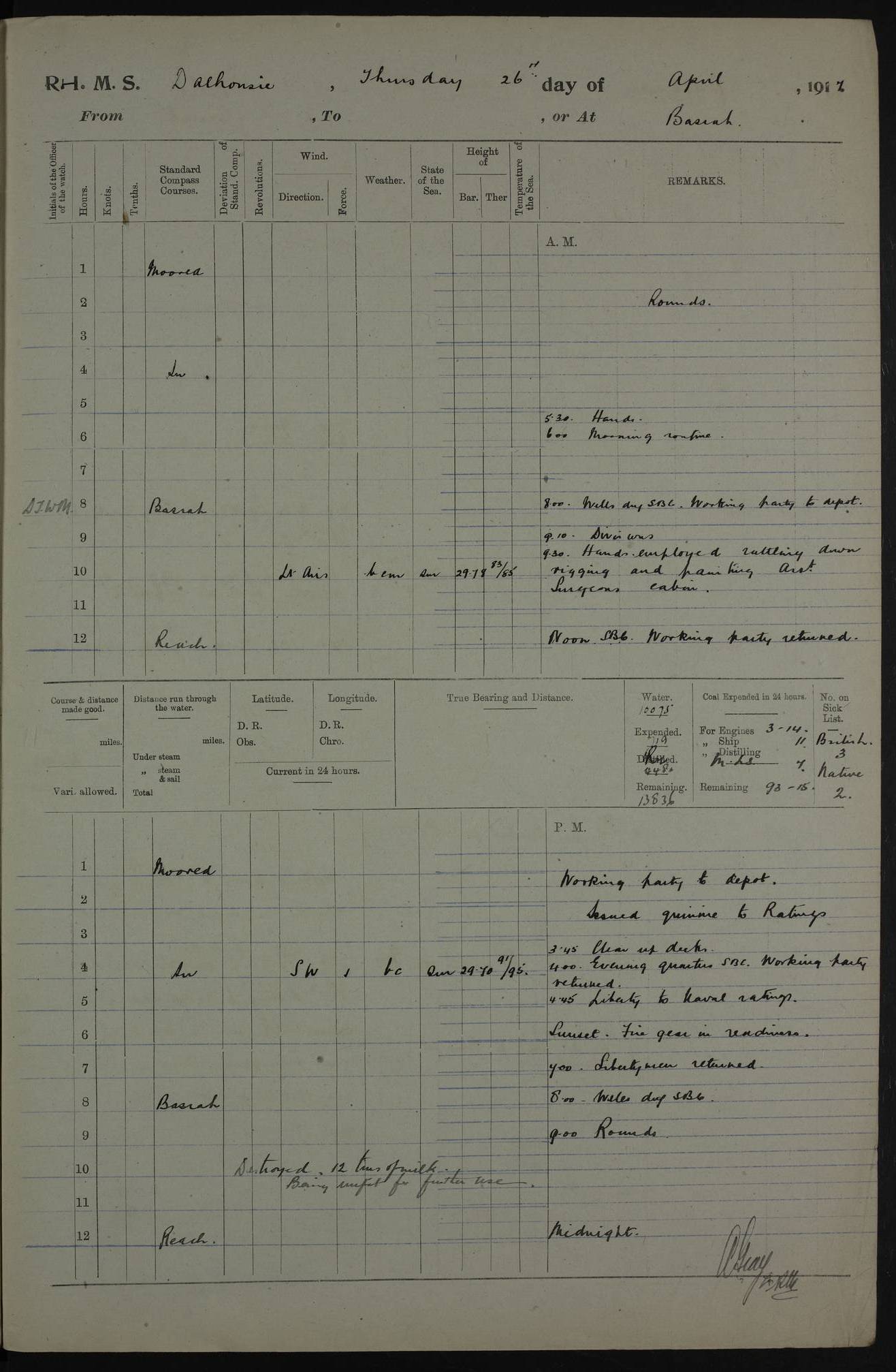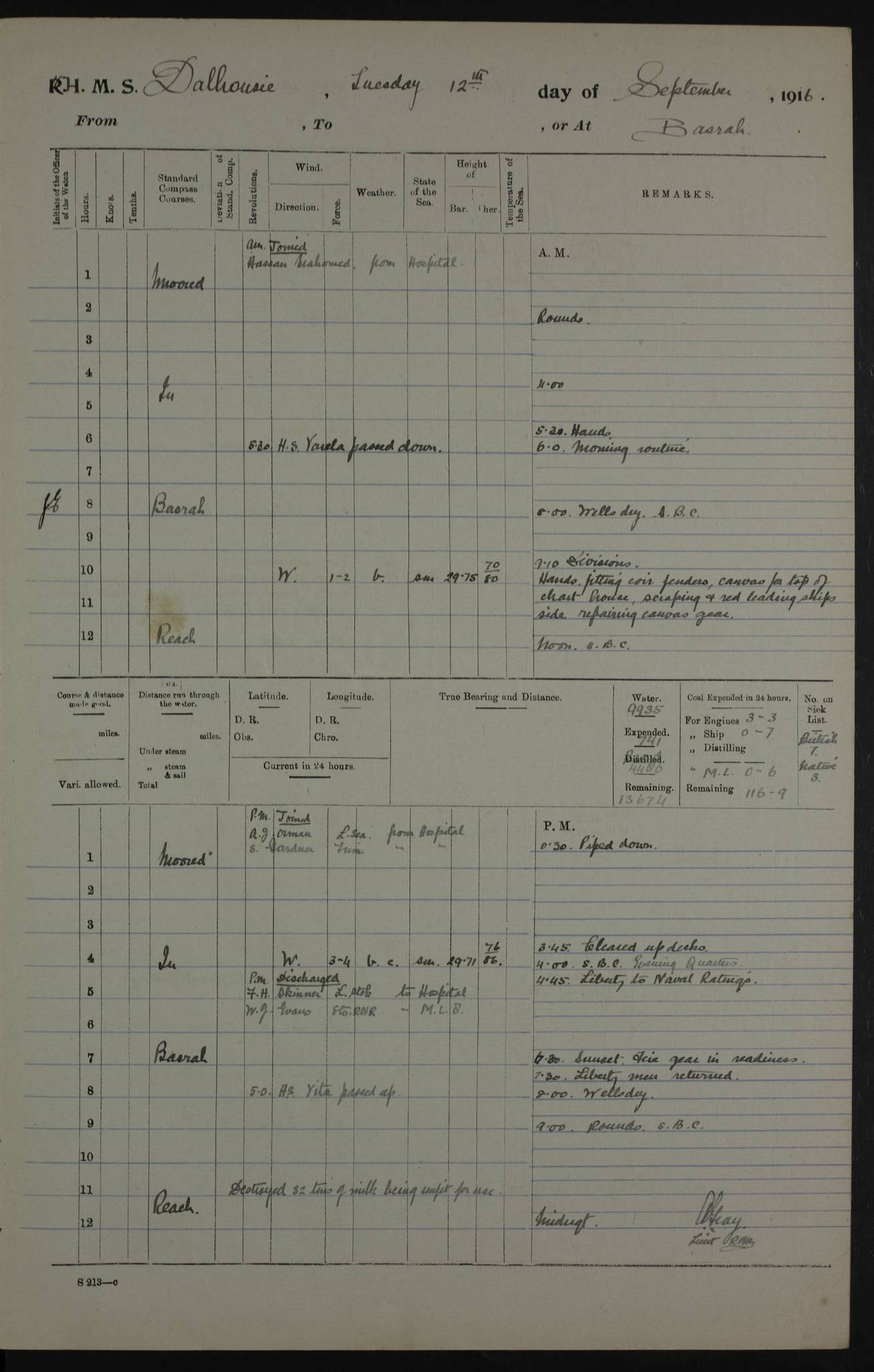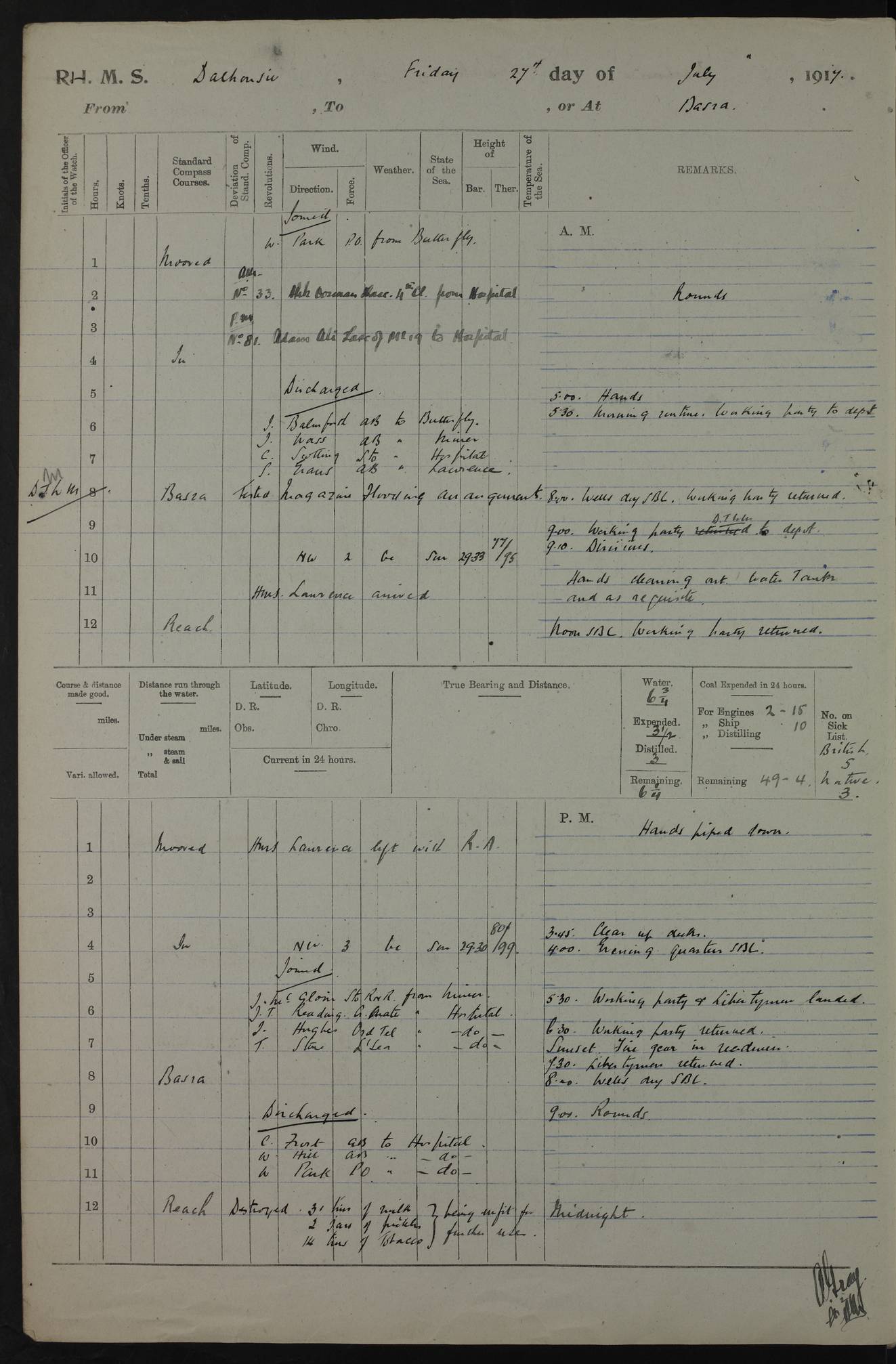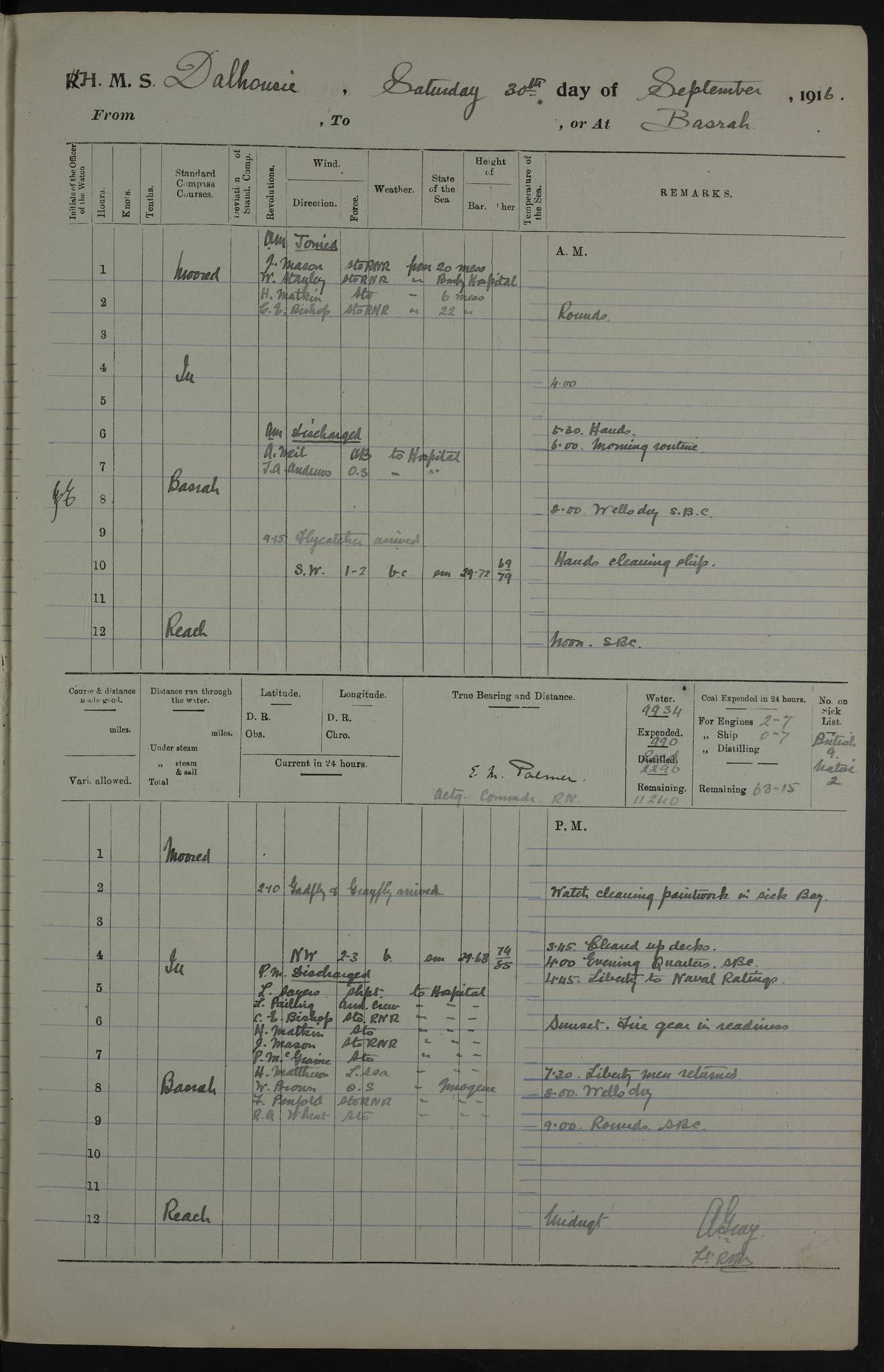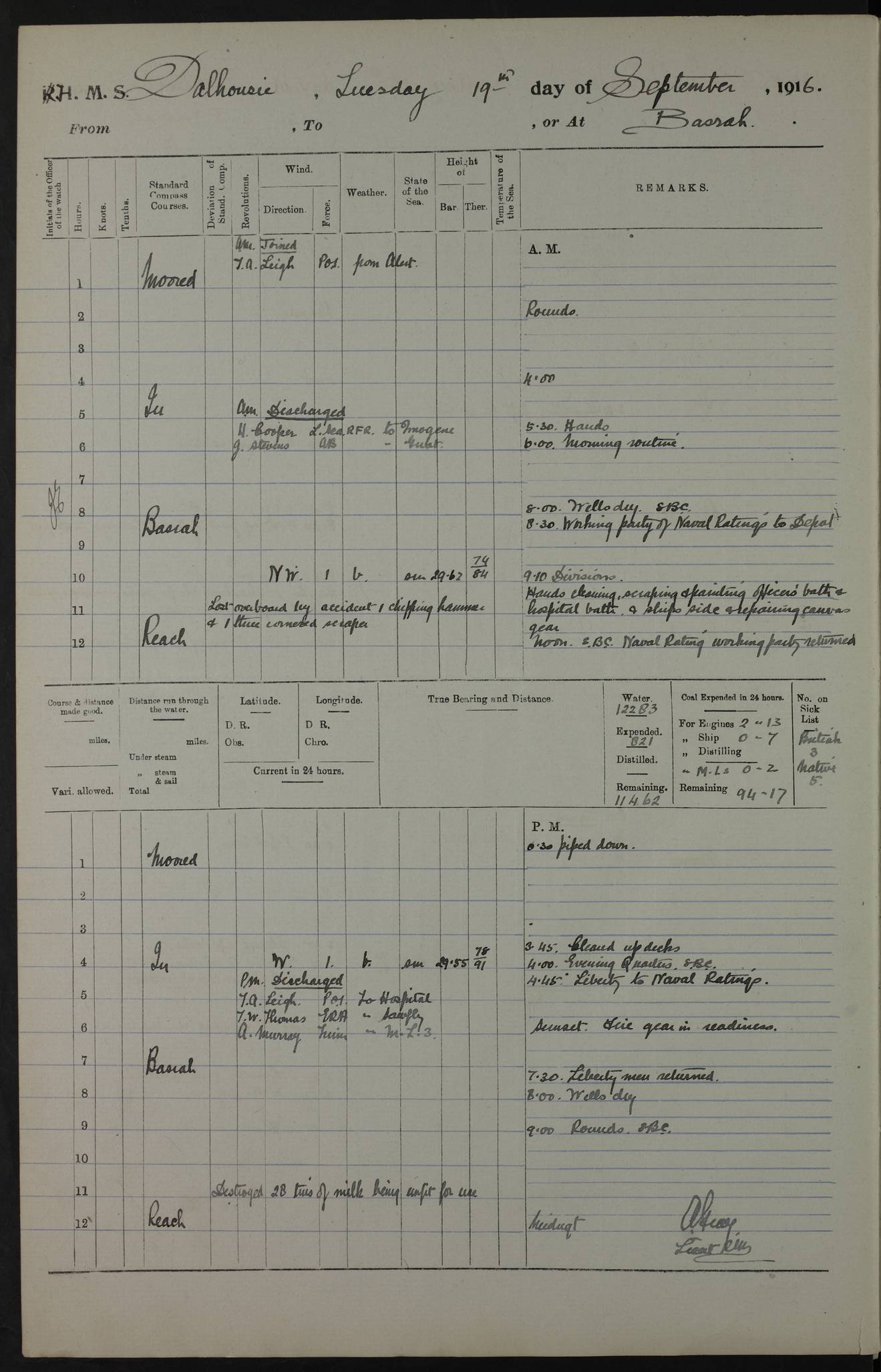 PM - Discharged To Hospital: H Widger, Engine Room Artificer - PW Harrison, Stoker Royal Navy Reserve To Motor Launch 11: J W Whitfield, Stoker 4ef4fa93e53e0a0c910056e2: (https://s3.amazonaws.com:443/oldweather/ADM53-39392/0018_0.jpg) 31 August 1916 Place: Basrah Lat 30.5269, Long 47.8407 2:00am: Rounds 5:05am: Hospital Ship SYRIA passed down 5:30am: Hands 6:00am: Morning Routine 8:00am: Wells dry – Signal Books Correct 9:30am: Divisions - Hands cleaning ship 11:00am: Drew Three Thousand Rupees from the Field treasury 12:00pm: Signal Books Correct – Issued Quinine to ship’s company 12:30pm: Piped Down 3:30pm: 4:00pm: Signal Books Correct 4:30pm: Cleared up decks 5:00pm: Evening Quarters – Leave to Watch of Naval Ratings 7:00pm: Sunset - Fire Gear in readiness 7:30pm: Liberty men returned 8:00pm: Wells dry - Signal Books Correct 9:00pm: Rounds - Signal Books Correct 11:00pm: Destroyed 19 tins Milk being unfit for use. AM – Joined From Motor Launch Depot: M. McMillan, Able Seaman From 5 Mess: T. Jackson, Petty Officer 1st From 4 Mess: T Golden, Stoker – J Tunney, Royal Navy Reserve Trawler Section From 10 Mess: J Donegan Royal Navy Reserve Trawler Section