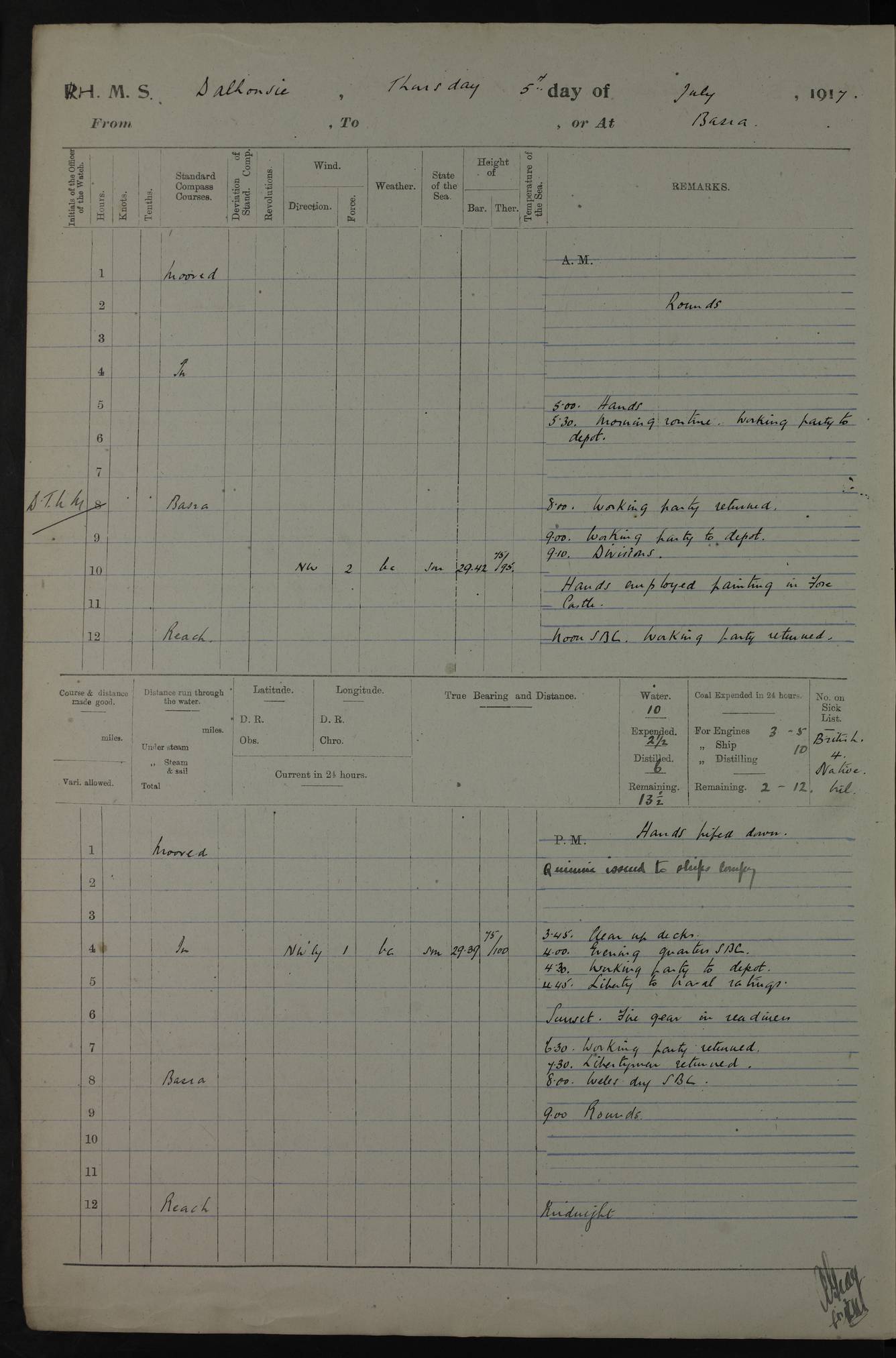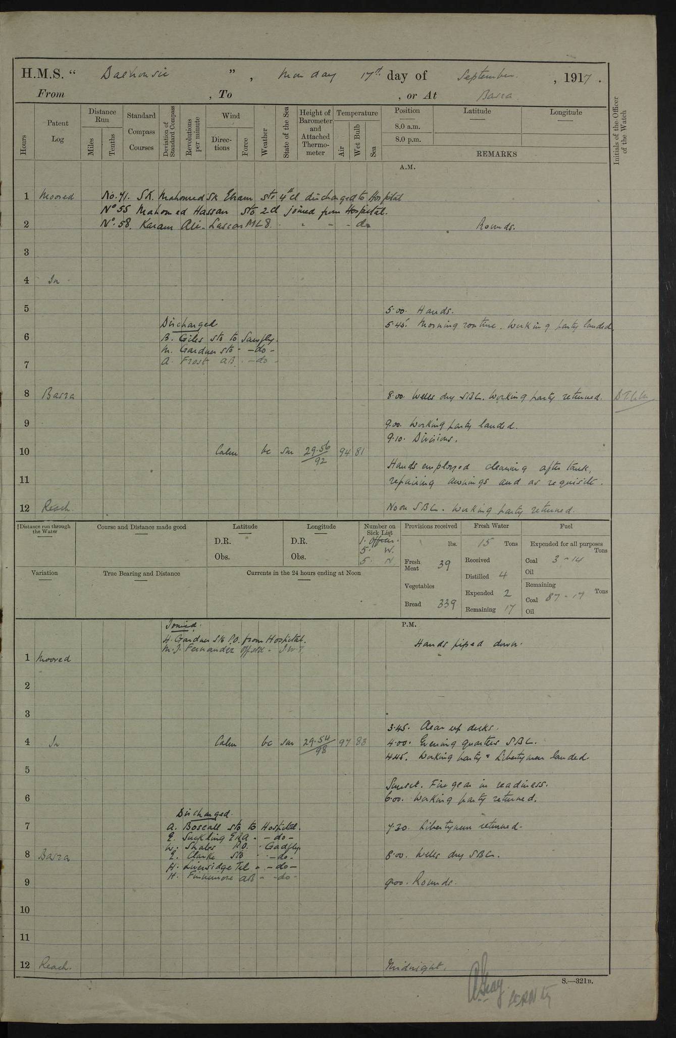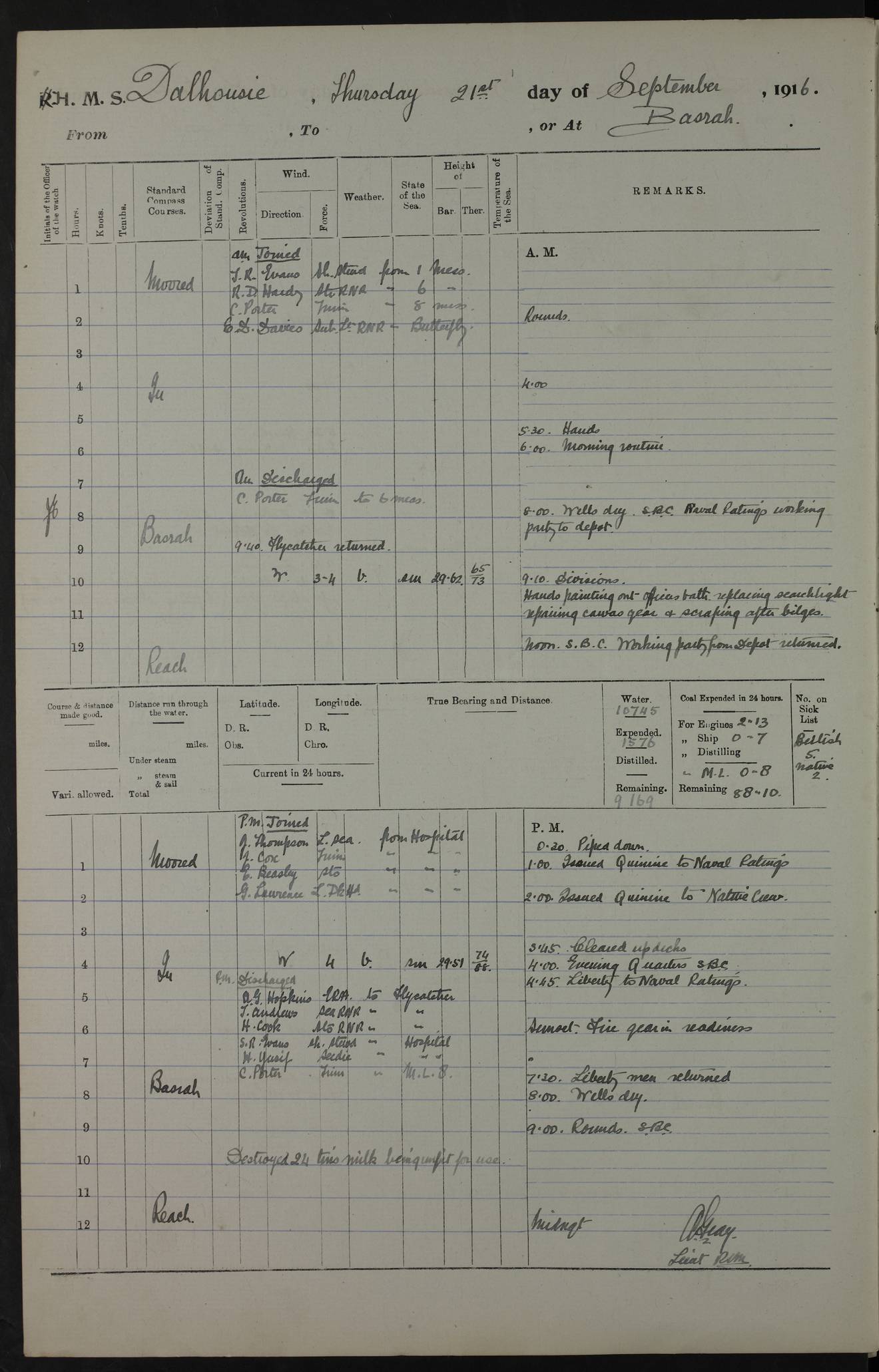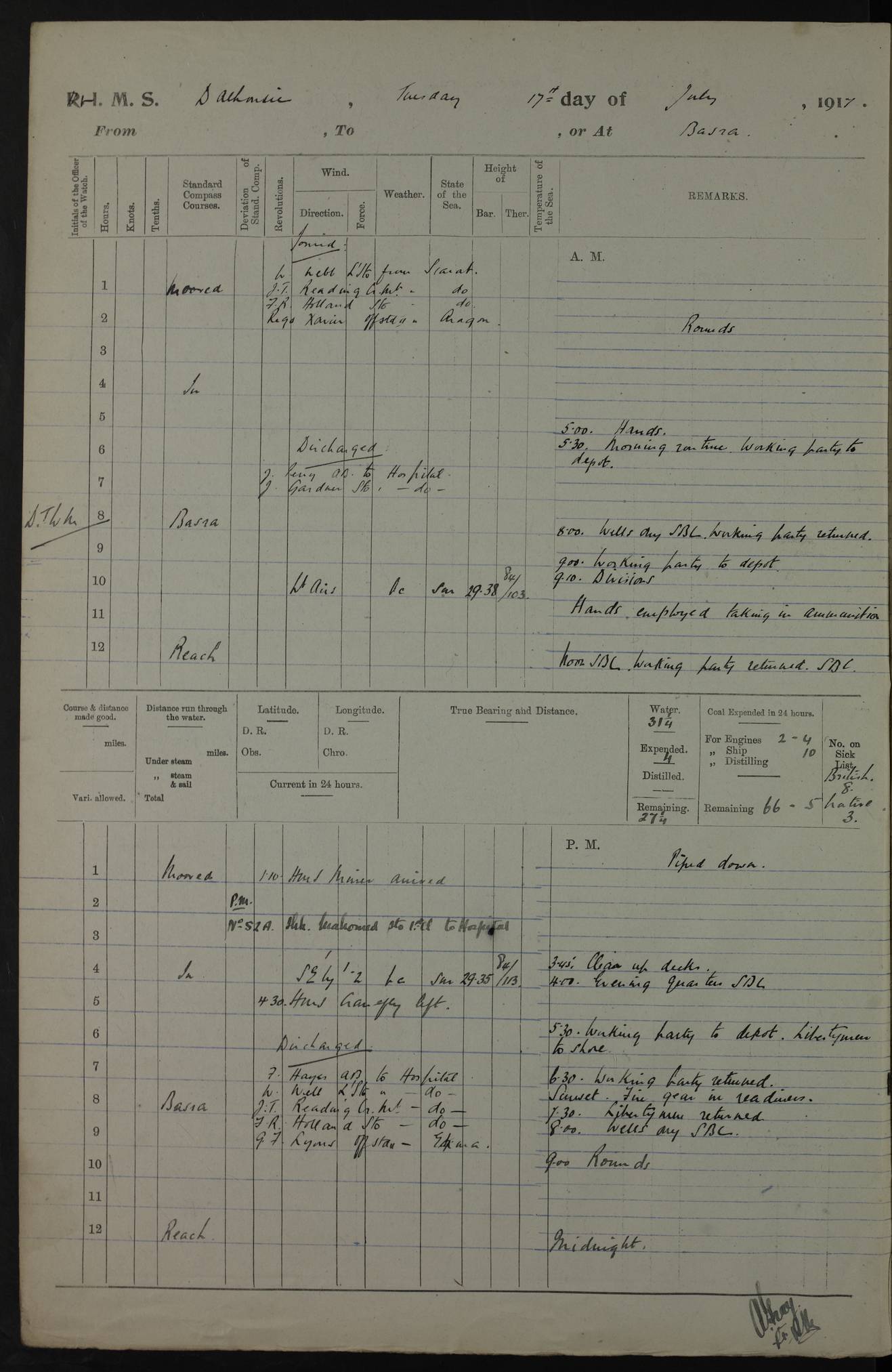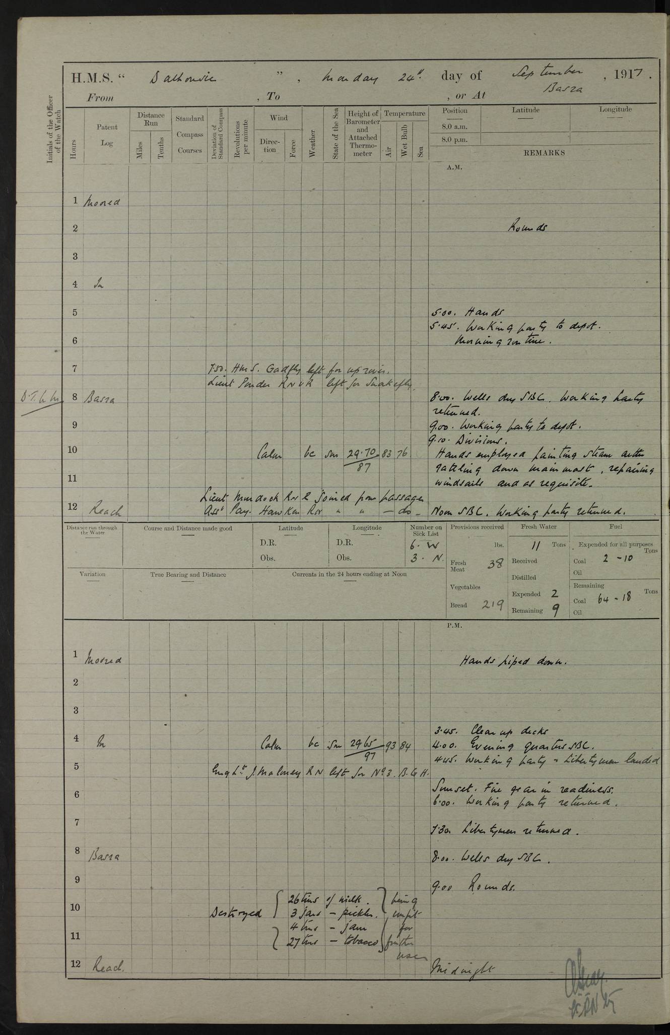 PM - Discharged To Hospital: H Widger, Engine Room Artificer - PW Harrison, Stoker Royal Navy Reserve To Motor Launch 11: J W Whitfield, Stoker 4ef4fa93e53e0a0c910056e2: (https://s3.amazonaws.com:443/oldweather/ADM53-39392/0018_0.jpg) 31 August 1916 Place: Basrah Lat 30.5269, Long 47.8407 2:00am: Rounds 5:05am: Hospital Ship SYRIA passed down 5:30am: Hands 6:00am: Morning Routine 8:00am: Wells dry – Signal Books Correct 9:30am: Divisions - Hands cleaning ship 11:00am: Drew Three Thousand Rupees from the Field treasury 12:00pm: Signal Books Correct – Issued Quinine to ship’s company 12:30pm: Piped Down 3:30pm: 4:00pm: Signal Books Correct 4:30pm: Cleared up decks 5:00pm: Evening Quarters – Leave to Watch of Naval Ratings 7:00pm: Sunset - Fire Gear in readiness 7:30pm: Liberty men returned 8:00pm: Wells dry - Signal Books Correct 9:00pm: Rounds - Signal Books Correct 11:00pm: Destroyed 19 tins Milk being unfit for use. AM – Joined From Motor Launch Depot: M. McMillan, Able Seaman From 5 Mess: T. Jackson, Petty Officer 1st From 4 Mess: T Golden, Stoker – J Tunney, Royal Navy Reserve Trawler Section From 10 Mess: J Donegan Royal Navy Reserve Trawler Section