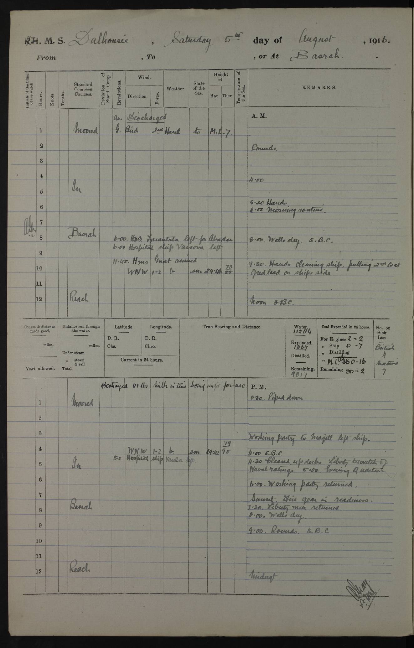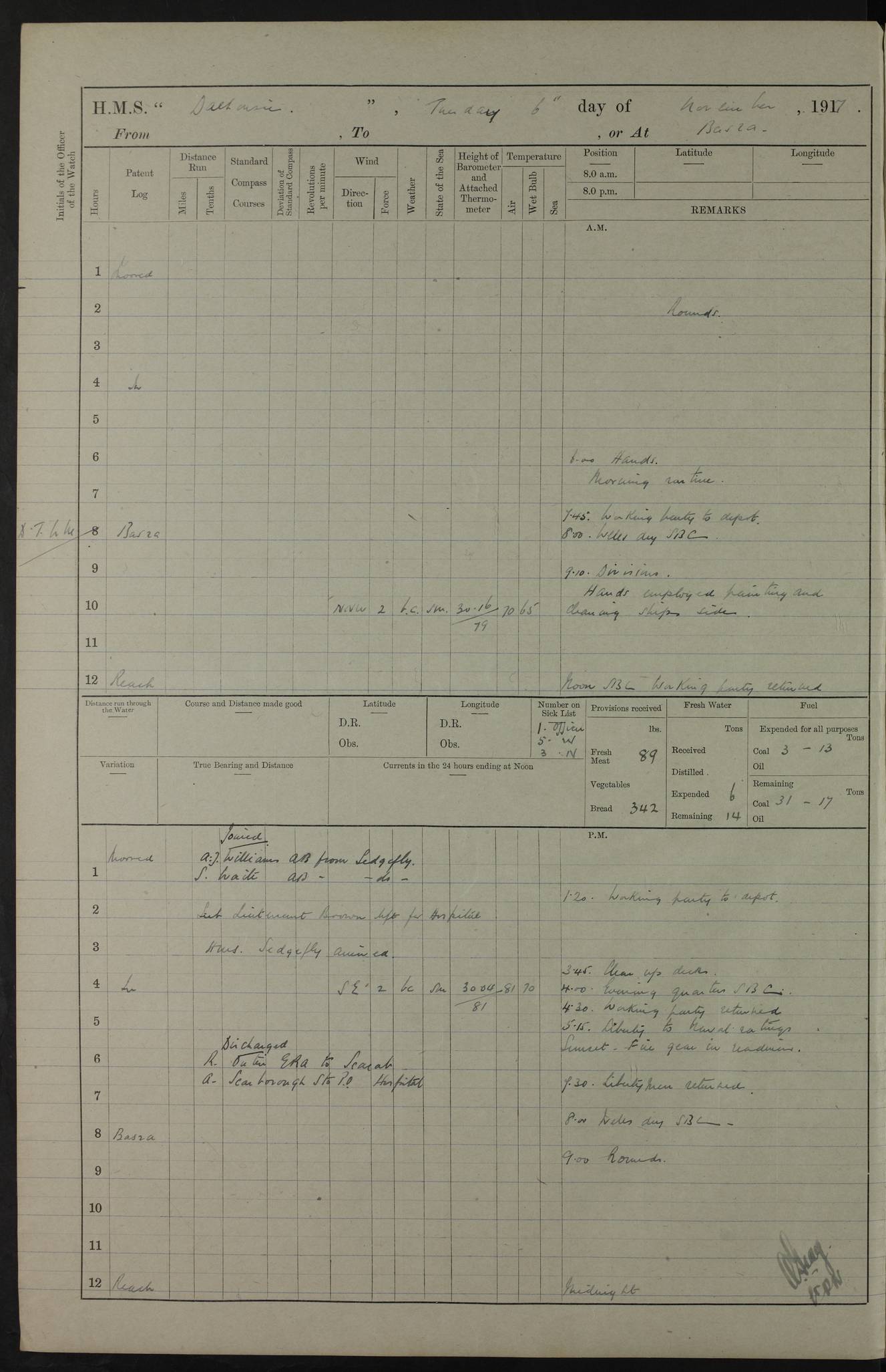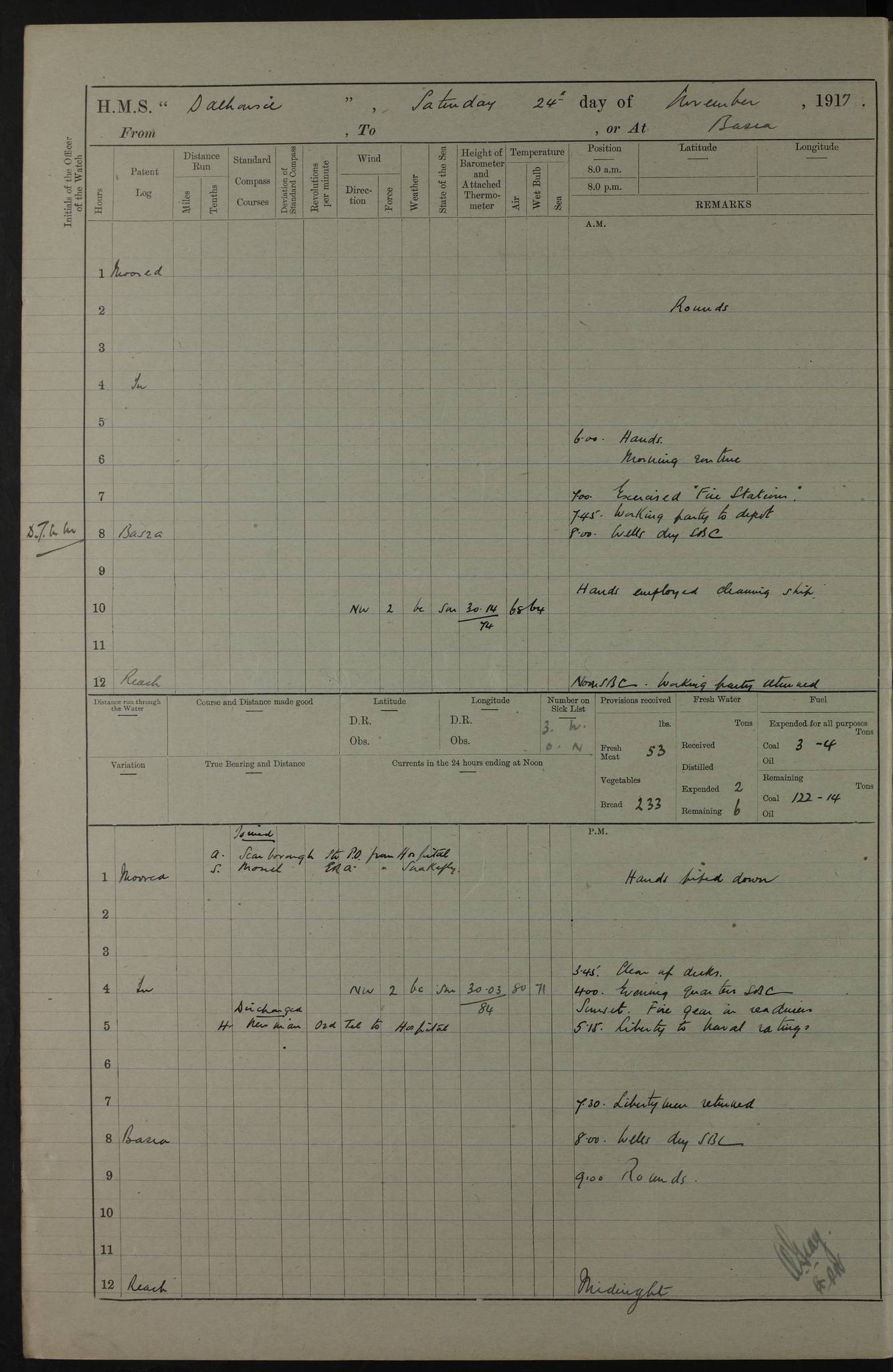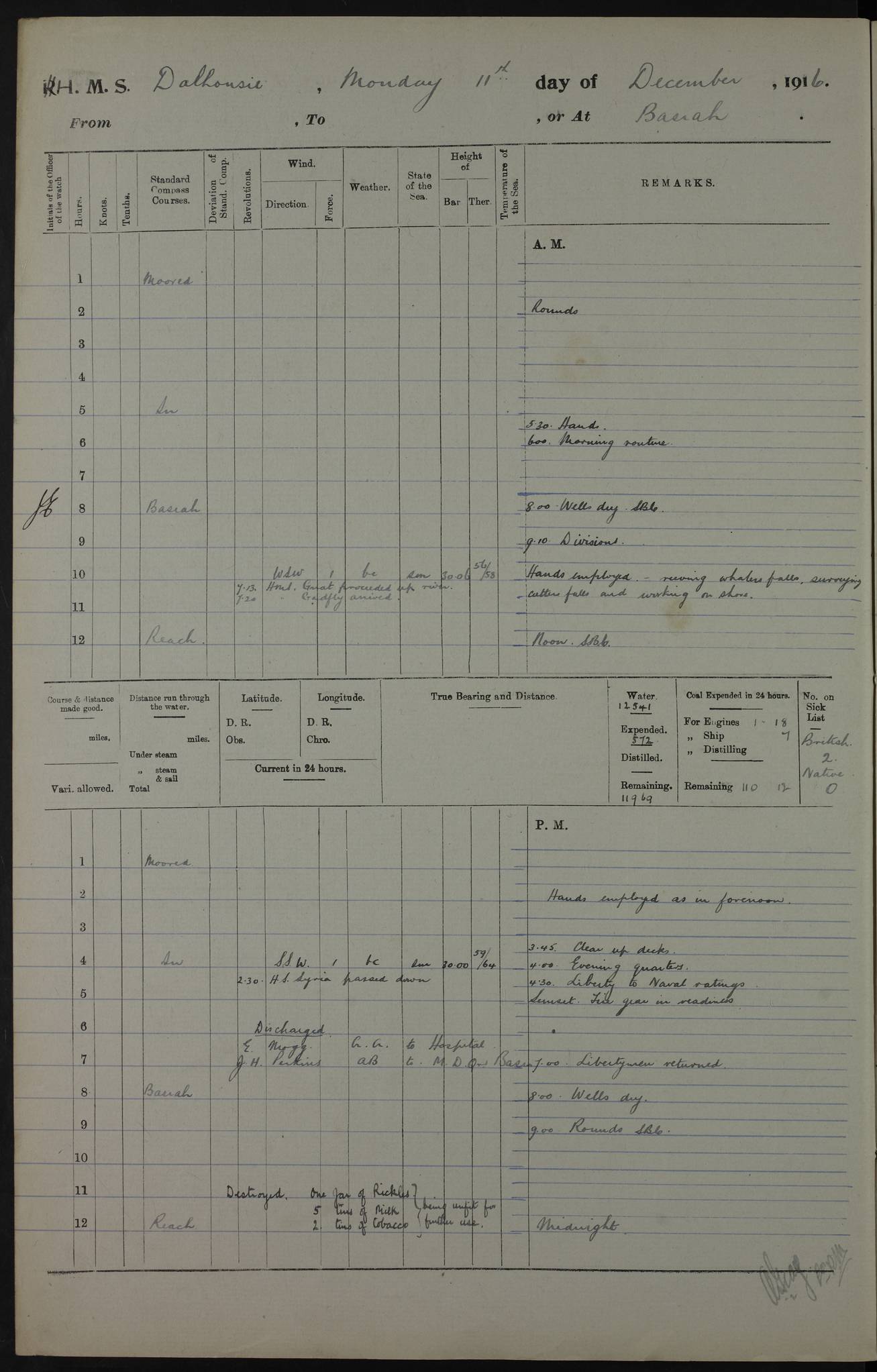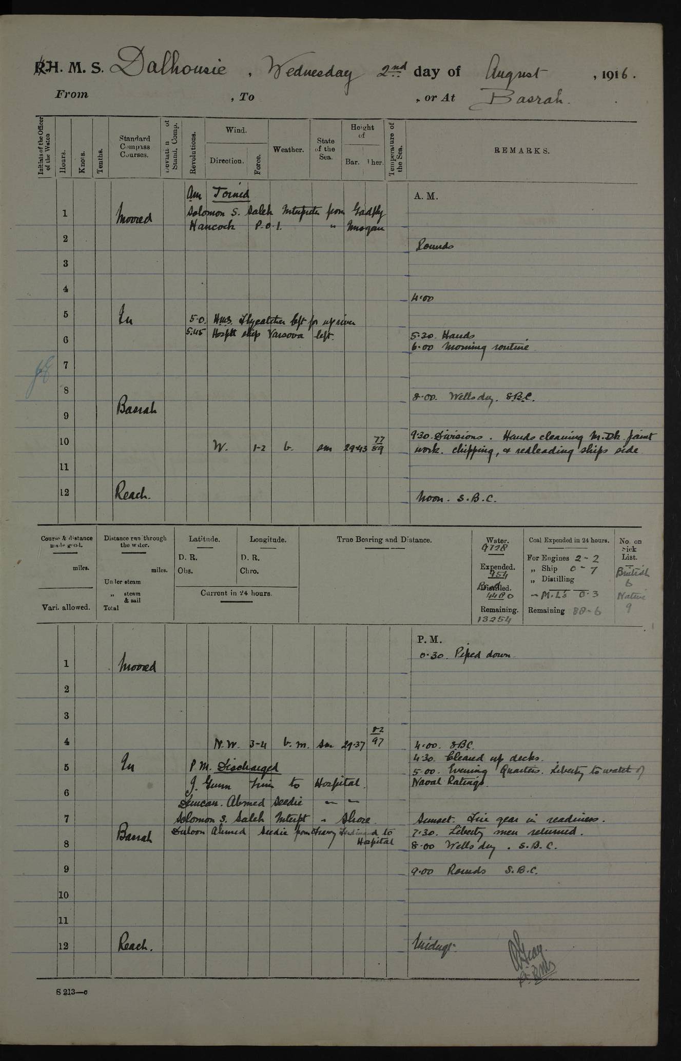 PM - Discharged To Hospital: H Widger, Engine Room Artificer - PW Harrison, Stoker Royal Navy Reserve To Motor Launch 11: J W Whitfield, Stoker 4ef4fa93e53e0a0c910056e2: (https://s3.amazonaws.com:443/oldweather/ADM53-39392/0018_0.jpg) 31 August 1916 Place: Basrah Lat 30.5269, Long 47.8407 2:00am: Rounds 5:05am: Hospital Ship SYRIA passed down 5:30am: Hands 6:00am: Morning Routine 8:00am: Wells dry – Signal Books Correct 9:30am: Divisions - Hands cleaning ship 11:00am: Drew Three Thousand Rupees from the Field treasury 12:00pm: Signal Books Correct – Issued Quinine to ship’s company 12:30pm: Piped Down 3:30pm: 4:00pm: Signal Books Correct 4:30pm: Cleared up decks 5:00pm: Evening Quarters – Leave to Watch of Naval Ratings 7:00pm: Sunset - Fire Gear in readiness 7:30pm: Liberty men returned 8:00pm: Wells dry - Signal Books Correct 9:00pm: Rounds - Signal Books Correct 11:00pm: Destroyed 19 tins Milk being unfit for use. AM – Joined From Motor Launch Depot: M. McMillan, Able Seaman From 5 Mess: T. Jackson, Petty Officer 1st From 4 Mess: T Golden, Stoker – J Tunney, Royal Navy Reserve Trawler Section From 10 Mess: J Donegan Royal Navy Reserve Trawler Section
