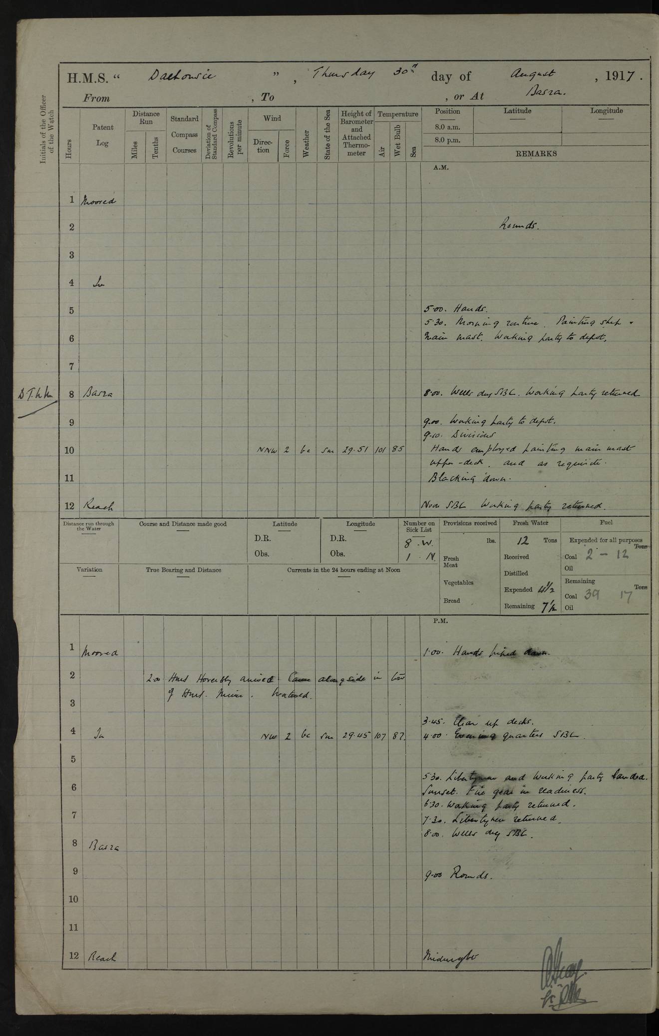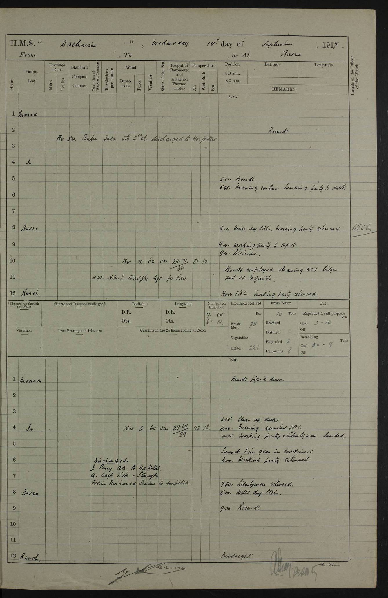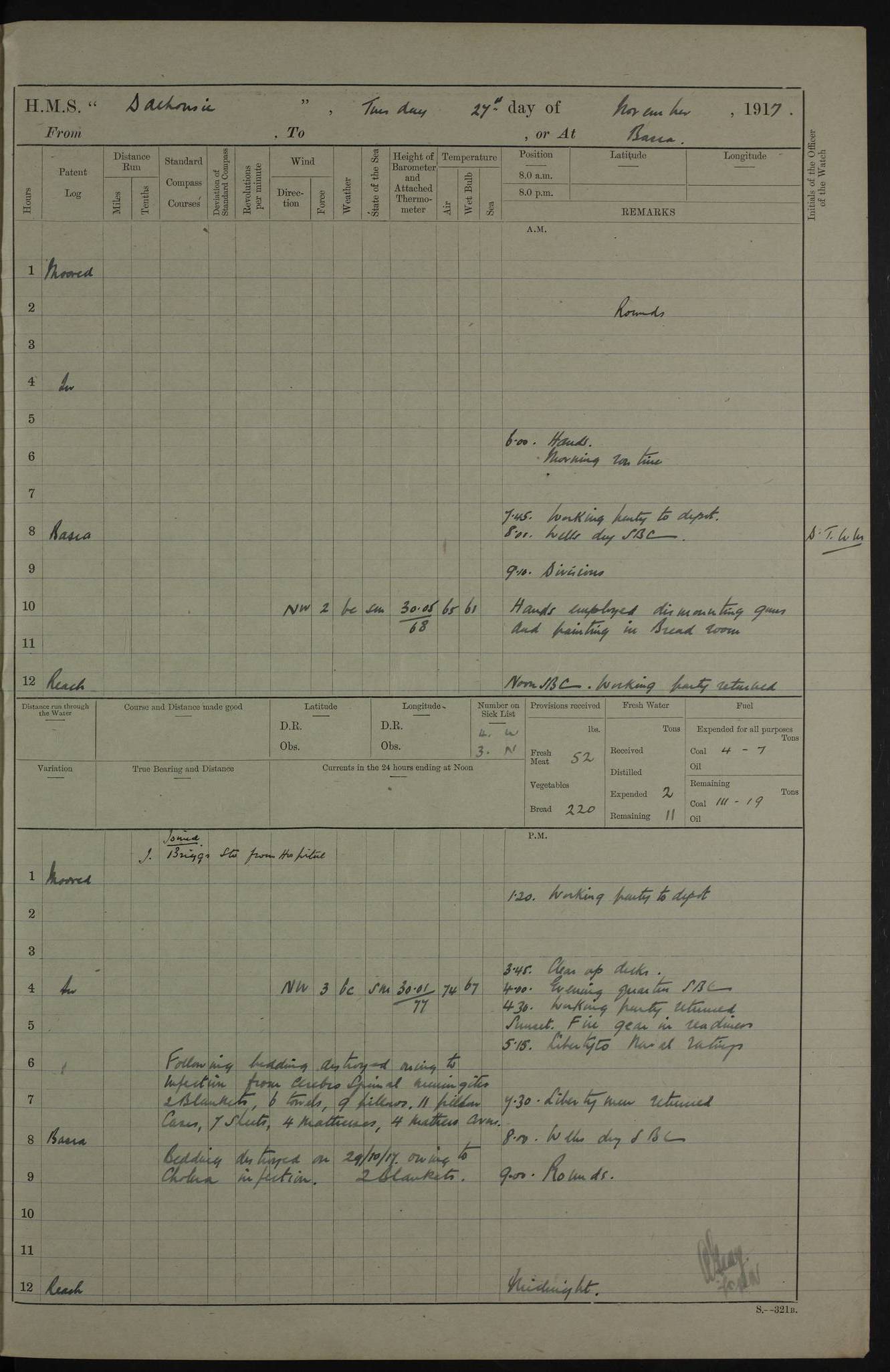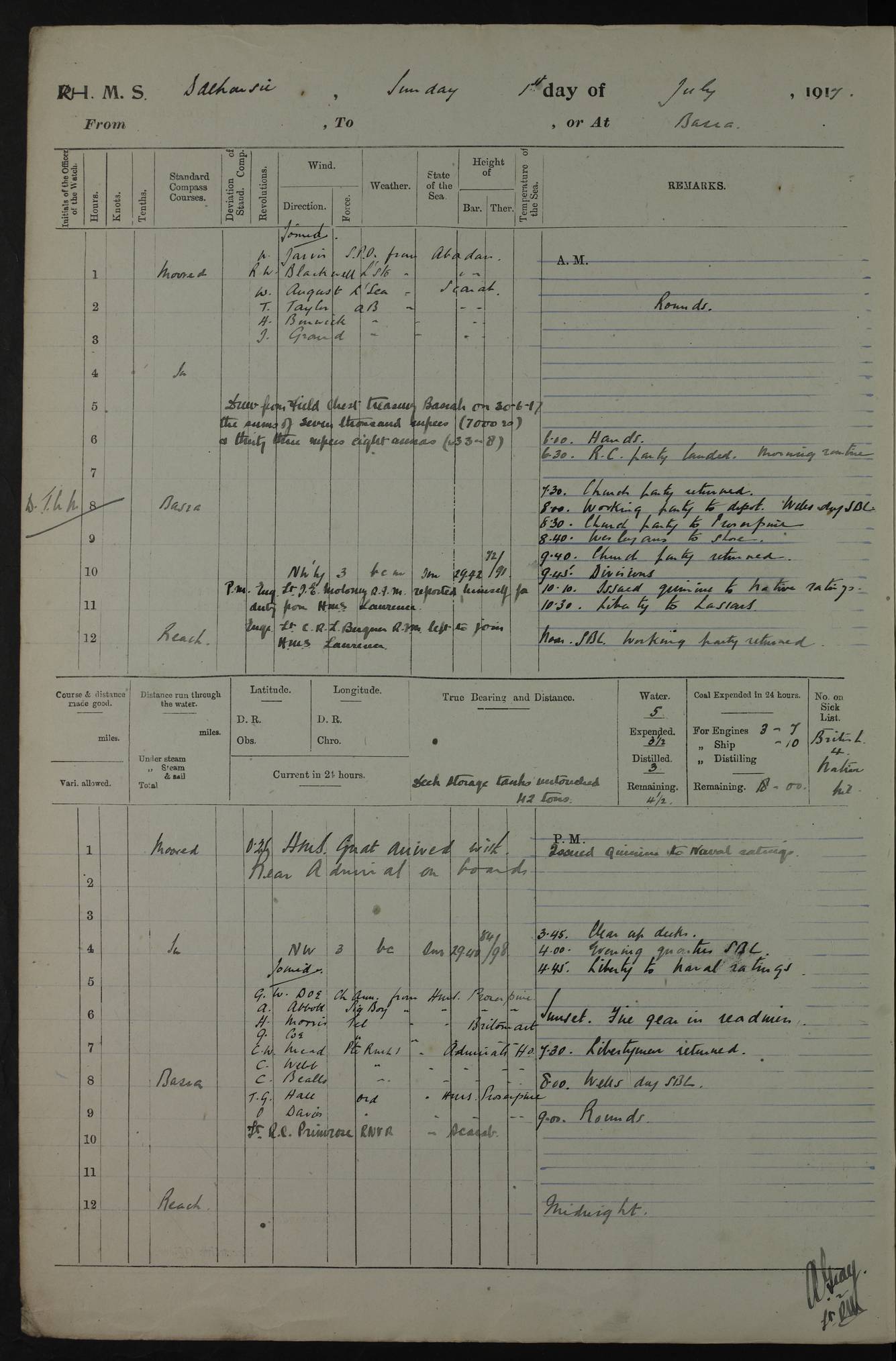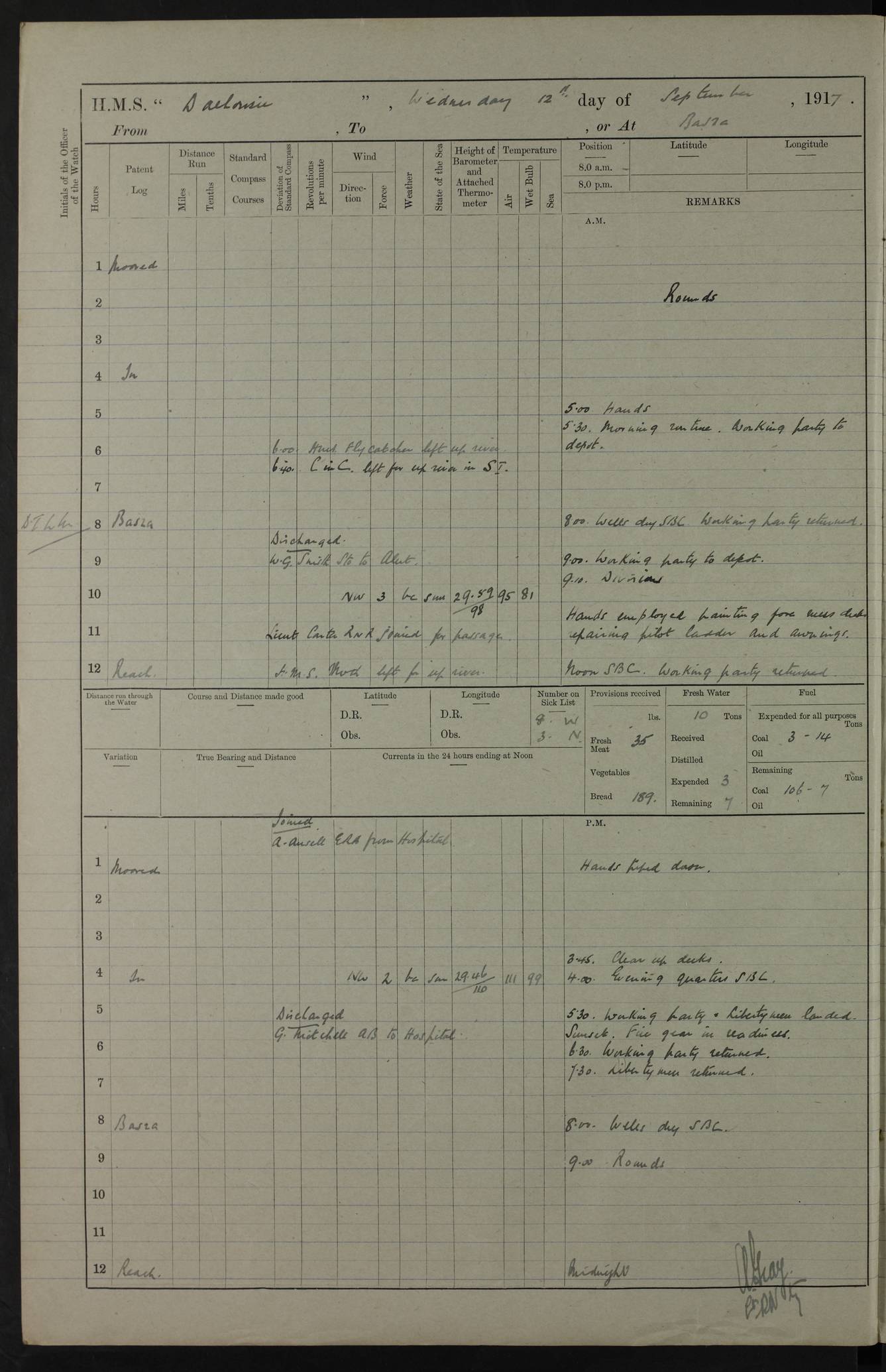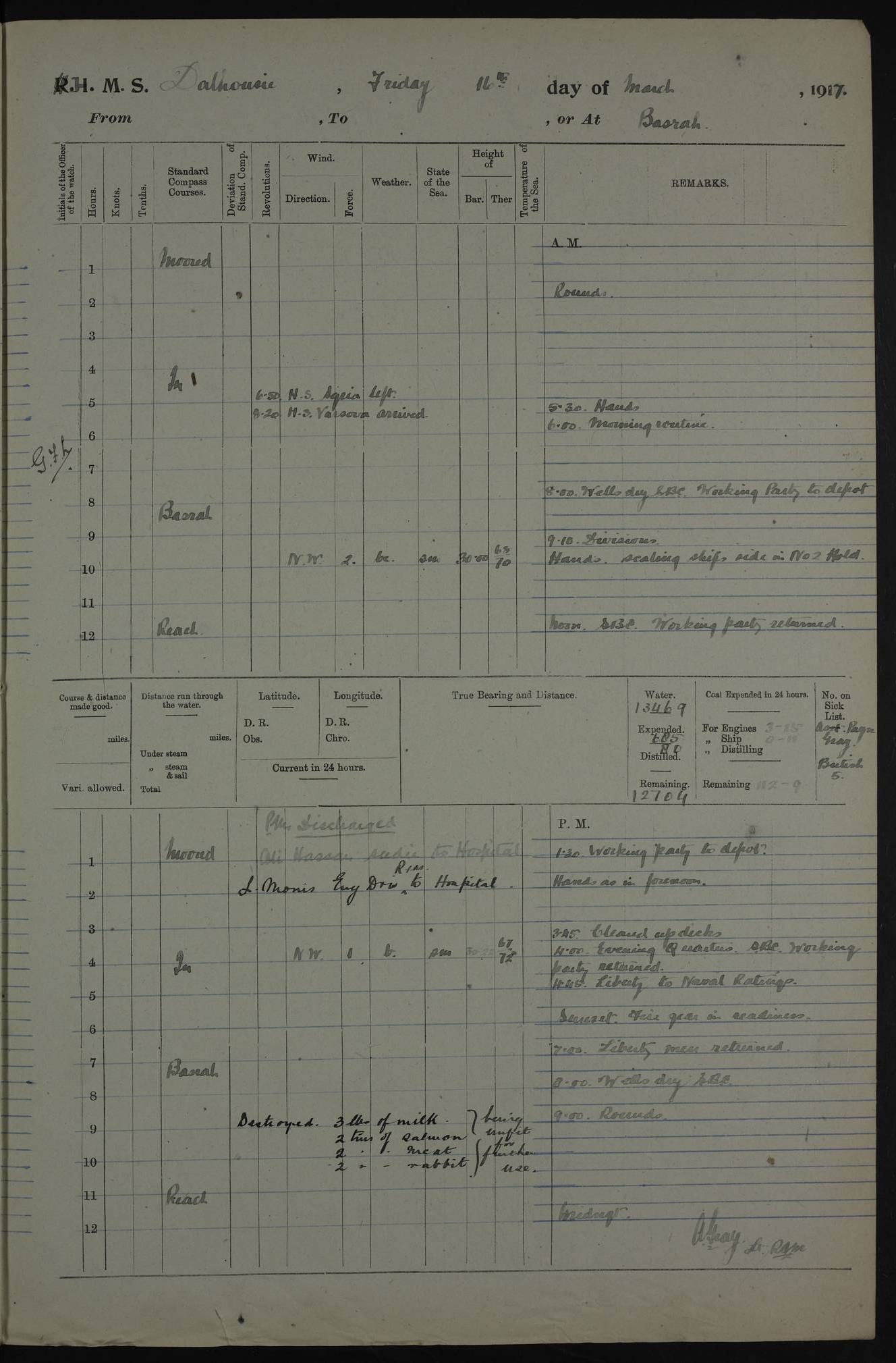 PM - Discharged To Hospital: H Widger, Engine Room Artificer - PW Harrison, Stoker Royal Navy Reserve To Motor Launch 11: J W Whitfield, Stoker 4ef4fa93e53e0a0c910056e2: (https://s3.amazonaws.com:443/oldweather/ADM53-39392/0018_0.jpg) 31 August 1916 Place: Basrah Lat 30.5269, Long 47.8407 2:00am: Rounds 5:05am: Hospital Ship SYRIA passed down 5:30am: Hands 6:00am: Morning Routine 8:00am: Wells dry – Signal Books Correct 9:30am: Divisions - Hands cleaning ship 11:00am: Drew Three Thousand Rupees from the Field treasury 12:00pm: Signal Books Correct – Issued Quinine to ship’s company 12:30pm: Piped Down 3:30pm: 4:00pm: Signal Books Correct 4:30pm: Cleared up decks 5:00pm: Evening Quarters – Leave to Watch of Naval Ratings 7:00pm: Sunset - Fire Gear in readiness 7:30pm: Liberty men returned 8:00pm: Wells dry - Signal Books Correct 9:00pm: Rounds - Signal Books Correct 11:00pm: Destroyed 19 tins Milk being unfit for use. AM – Joined From Motor Launch Depot: M. McMillan, Able Seaman From 5 Mess: T. Jackson, Petty Officer 1st From 4 Mess: T Golden, Stoker – J Tunney, Royal Navy Reserve Trawler Section From 10 Mess: J Donegan Royal Navy Reserve Trawler Section