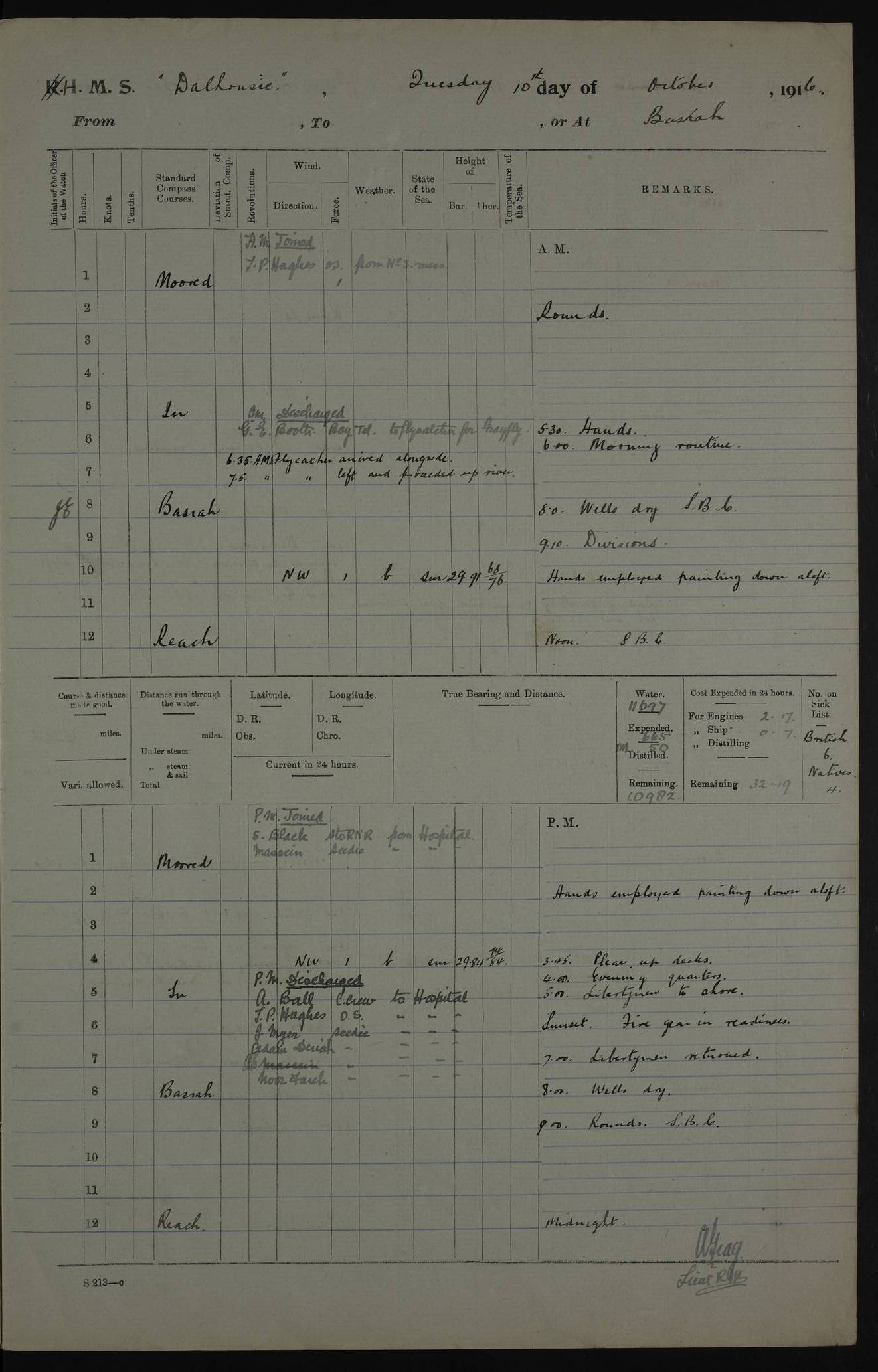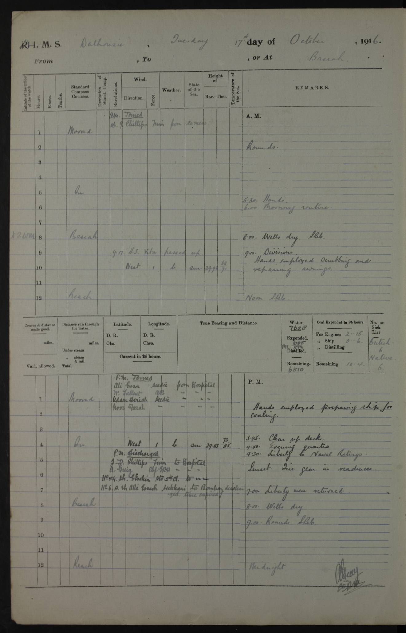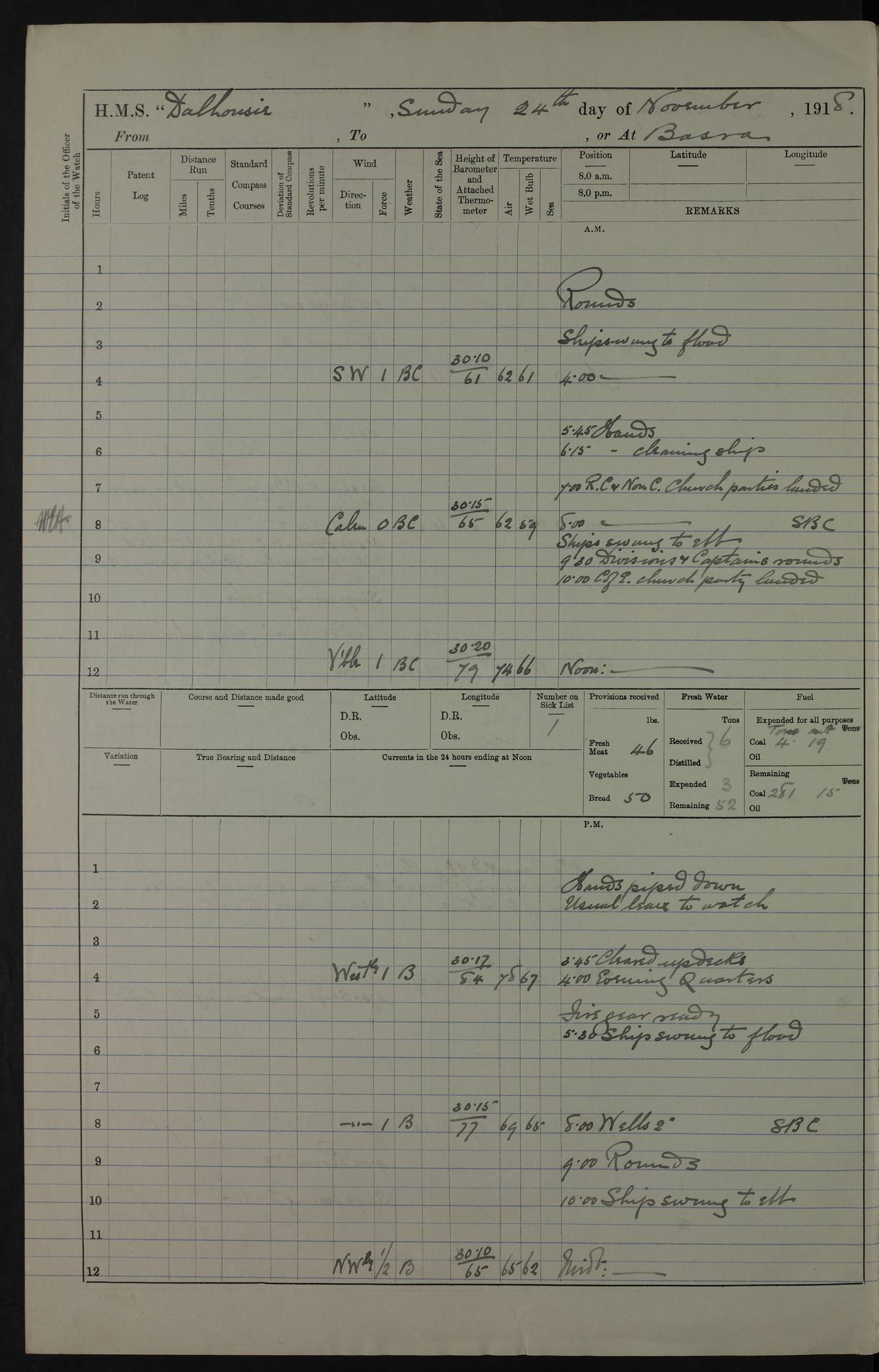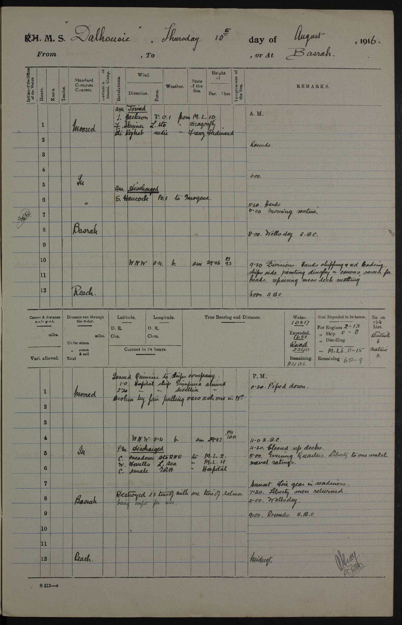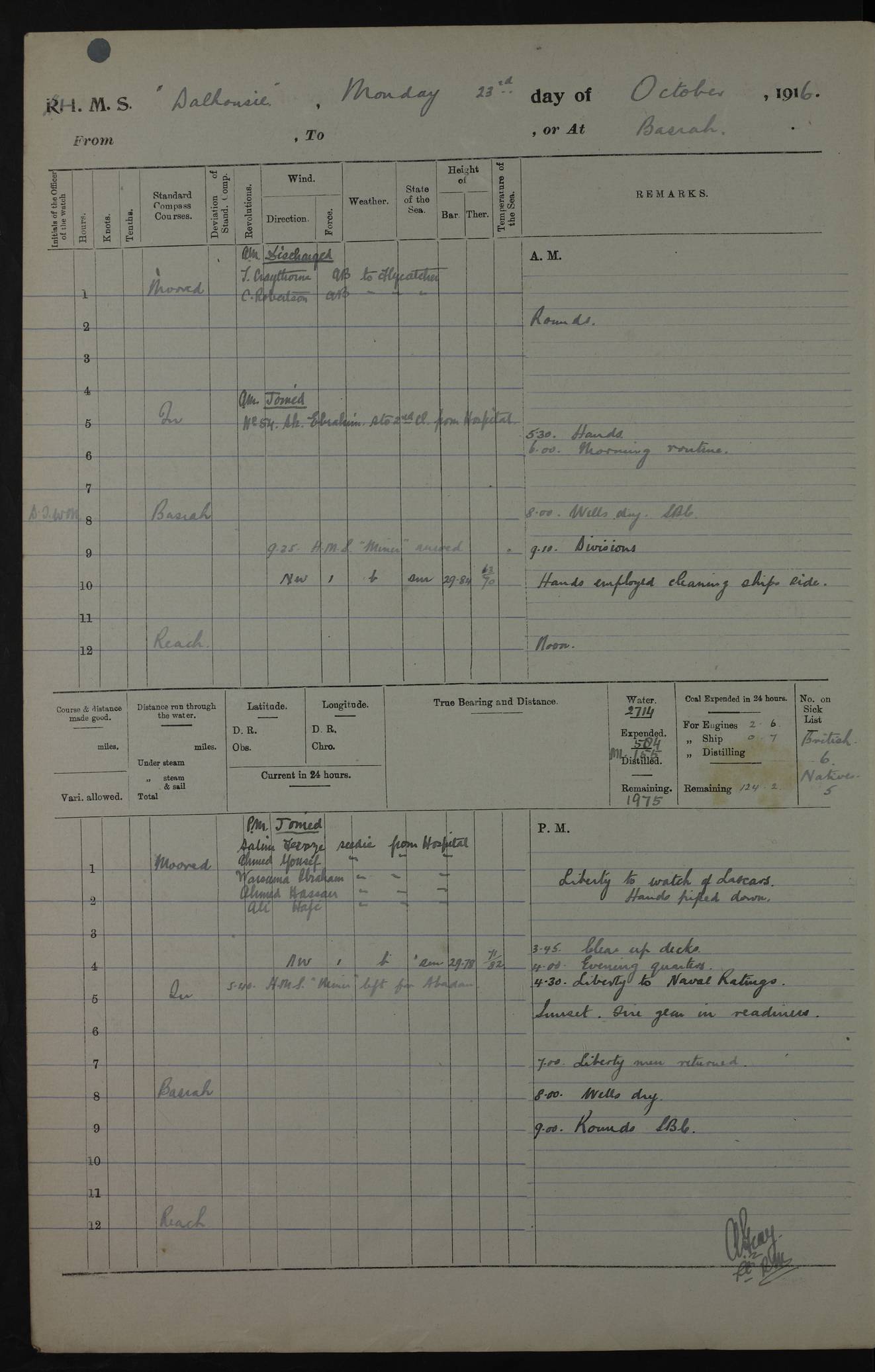 PM - Discharged To Hospital: H Widger, Engine Room Artificer - PW Harrison, Stoker Royal Navy Reserve To Motor Launch 11: J W Whitfield, Stoker 4ef4fa93e53e0a0c910056e2: (https://s3.amazonaws.com:443/oldweather/ADM53-39392/0018_0.jpg) 31 August 1916 Place: Basrah Lat 30.5269, Long 47.8407 2:00am: Rounds 5:05am: Hospital Ship SYRIA passed down 5:30am: Hands 6:00am: Morning Routine 8:00am: Wells dry – Signal Books Correct 9:30am: Divisions - Hands cleaning ship 11:00am: Drew Three Thousand Rupees from the Field treasury 12:00pm: Signal Books Correct – Issued Quinine to ship’s company 12:30pm: Piped Down 3:30pm: 4:00pm: Signal Books Correct 4:30pm: Cleared up decks 5:00pm: Evening Quarters – Leave to Watch of Naval Ratings 7:00pm: Sunset - Fire Gear in readiness 7:30pm: Liberty men returned 8:00pm: Wells dry - Signal Books Correct 9:00pm: Rounds - Signal Books Correct 11:00pm: Destroyed 19 tins Milk being unfit for use. AM – Joined From Motor Launch Depot: M. McMillan, Able Seaman From 5 Mess: T. Jackson, Petty Officer 1st From 4 Mess: T Golden, Stoker – J Tunney, Royal Navy Reserve Trawler Section From 10 Mess: J Donegan Royal Navy Reserve Trawler Section