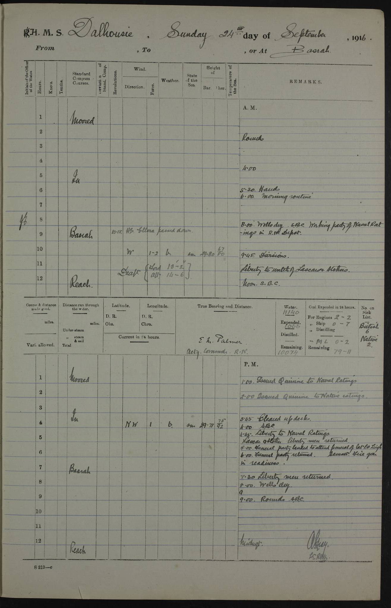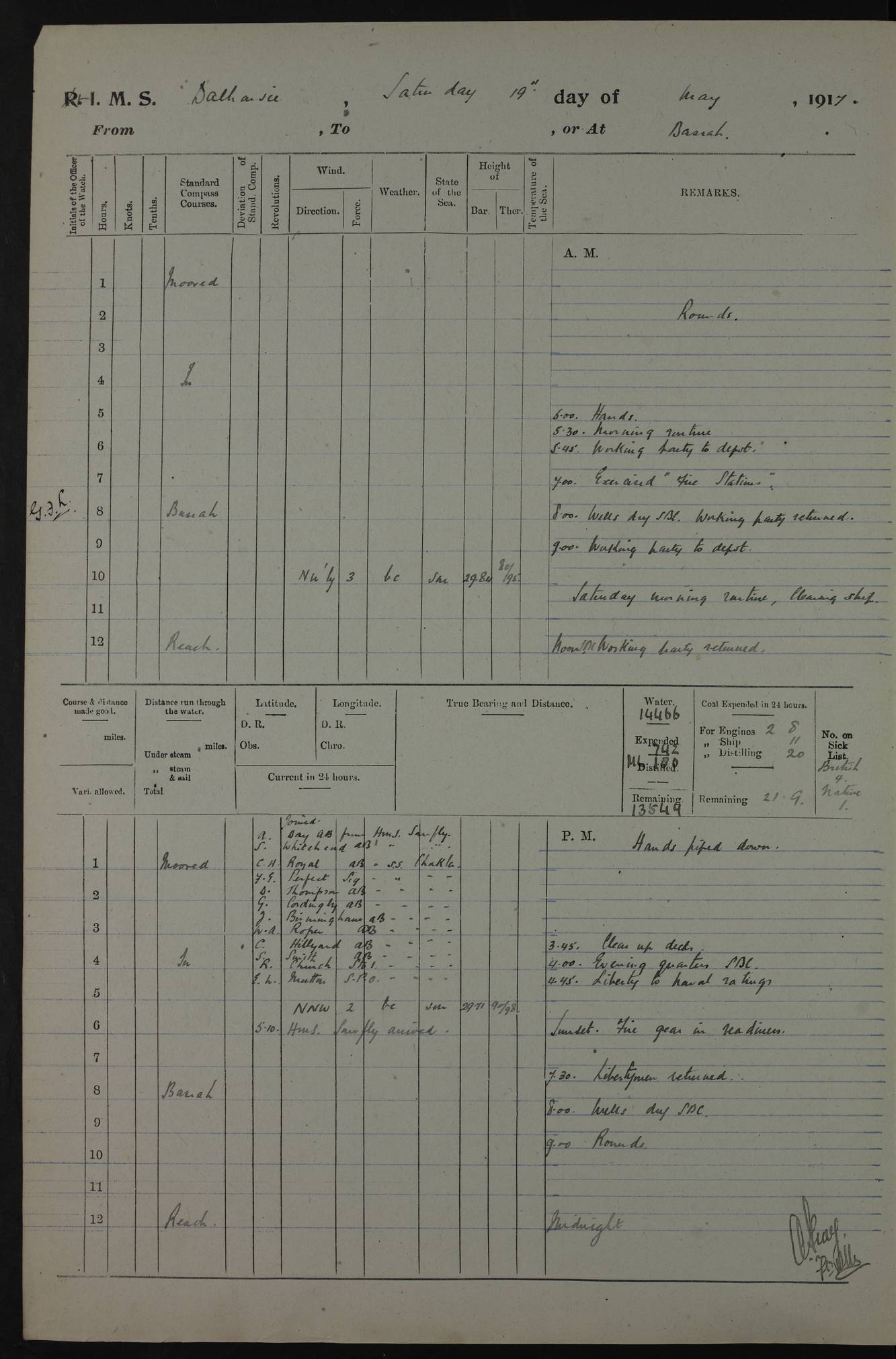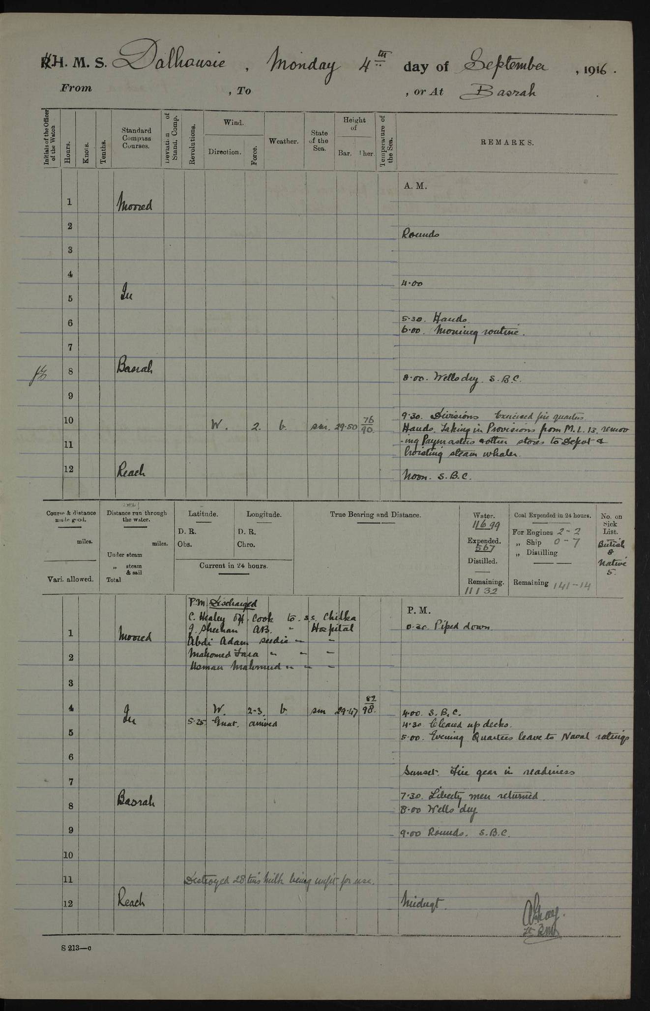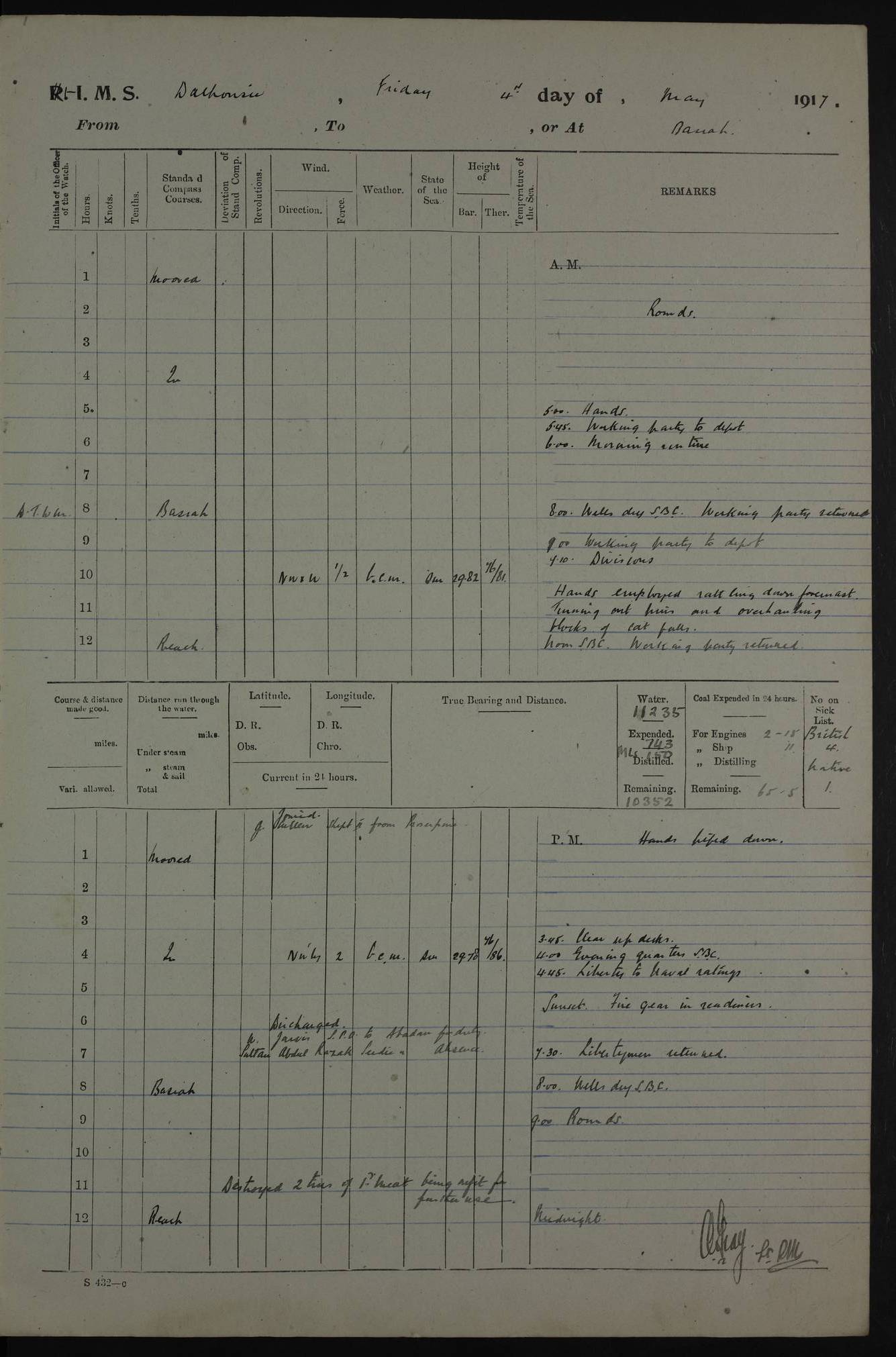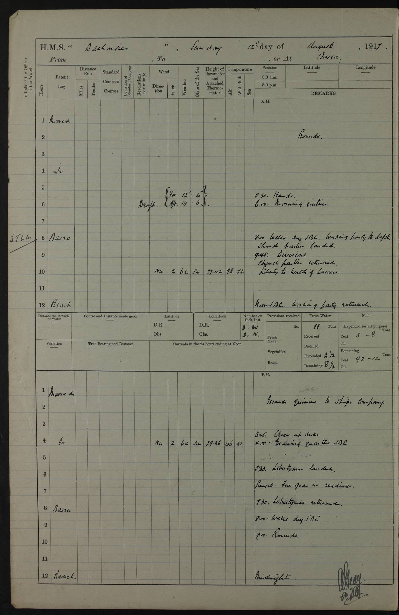 PM - Discharged To Hospital: H Widger, Engine Room Artificer - PW Harrison, Stoker Royal Navy Reserve To Motor Launch 11: J W Whitfield, Stoker 4ef4fa93e53e0a0c910056e2: (https://s3.amazonaws.com:443/oldweather/ADM53-39392/0018_0.jpg) 31 August 1916 Place: Basrah Lat 30.5269, Long 47.8407 2:00am: Rounds 5:05am: Hospital Ship SYRIA passed down 5:30am: Hands 6:00am: Morning Routine 8:00am: Wells dry – Signal Books Correct 9:30am: Divisions - Hands cleaning ship 11:00am: Drew Three Thousand Rupees from the Field treasury 12:00pm: Signal Books Correct – Issued Quinine to ship’s company 12:30pm: Piped Down 3:30pm: 4:00pm: Signal Books Correct 4:30pm: Cleared up decks 5:00pm: Evening Quarters – Leave to Watch of Naval Ratings 7:00pm: Sunset - Fire Gear in readiness 7:30pm: Liberty men returned 8:00pm: Wells dry - Signal Books Correct 9:00pm: Rounds - Signal Books Correct 11:00pm: Destroyed 19 tins Milk being unfit for use. AM – Joined From Motor Launch Depot: M. McMillan, Able Seaman From 5 Mess: T. Jackson, Petty Officer 1st From 4 Mess: T Golden, Stoker – J Tunney, Royal Navy Reserve Trawler Section From 10 Mess: J Donegan Royal Navy Reserve Trawler Section