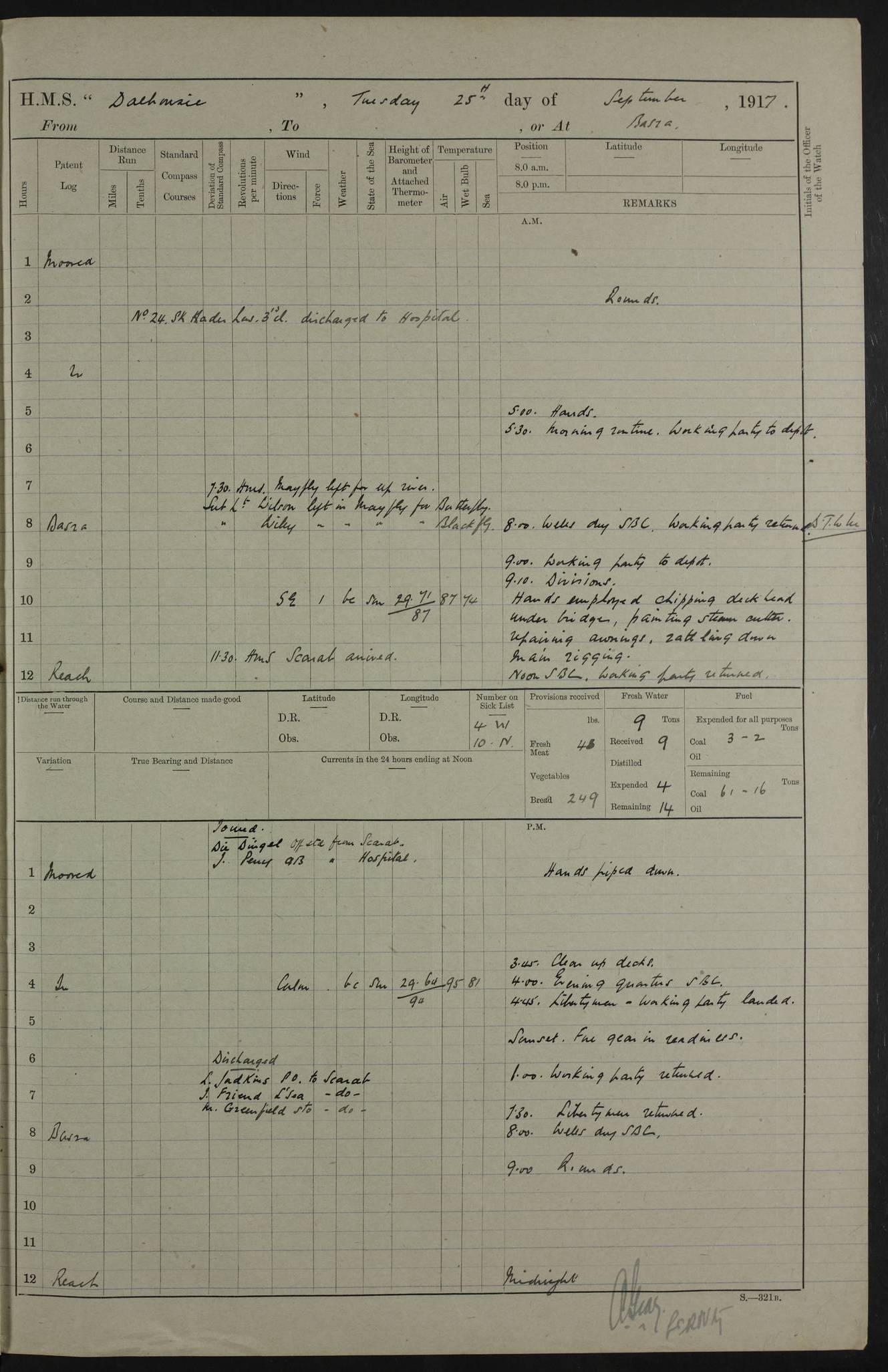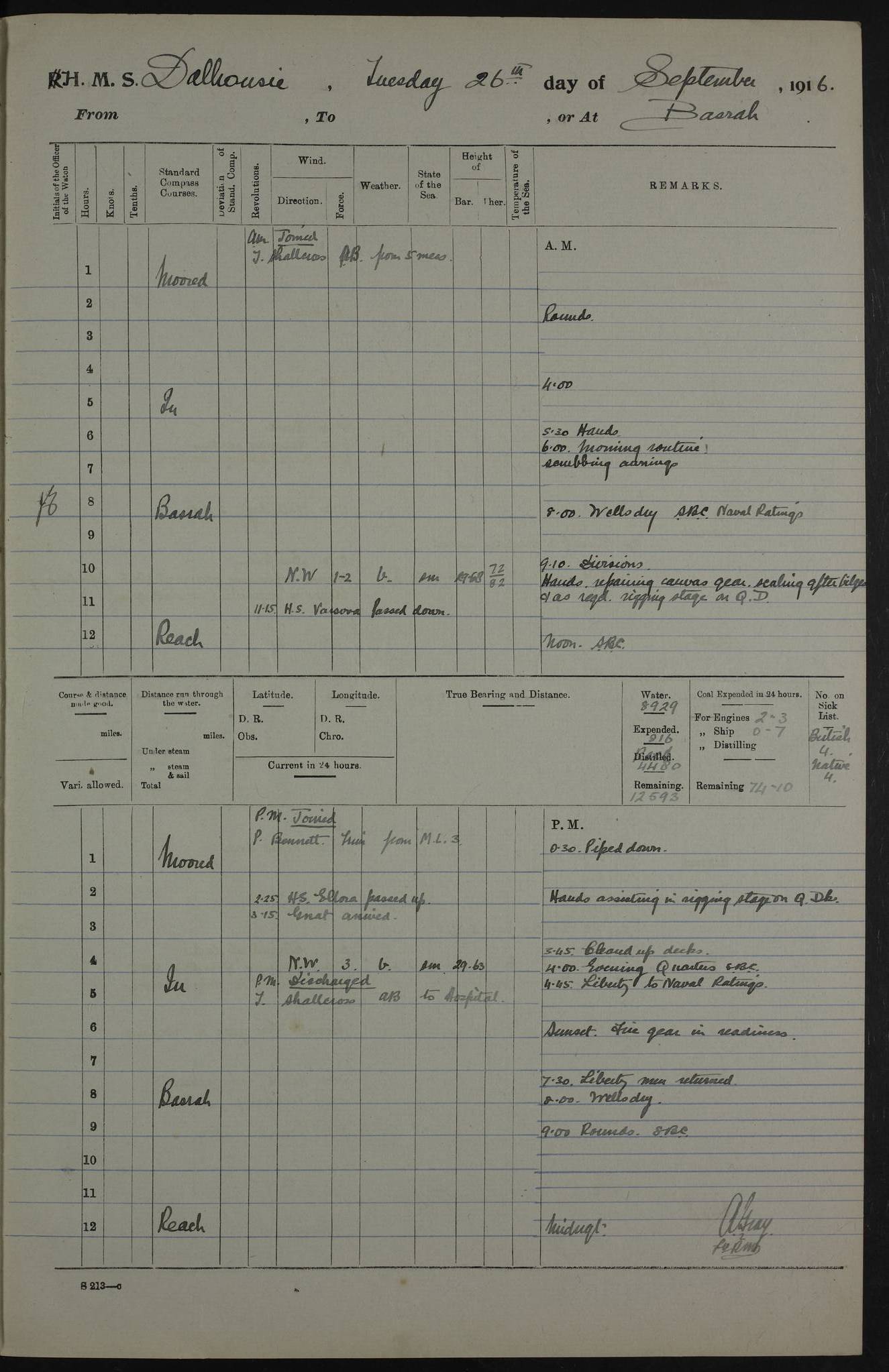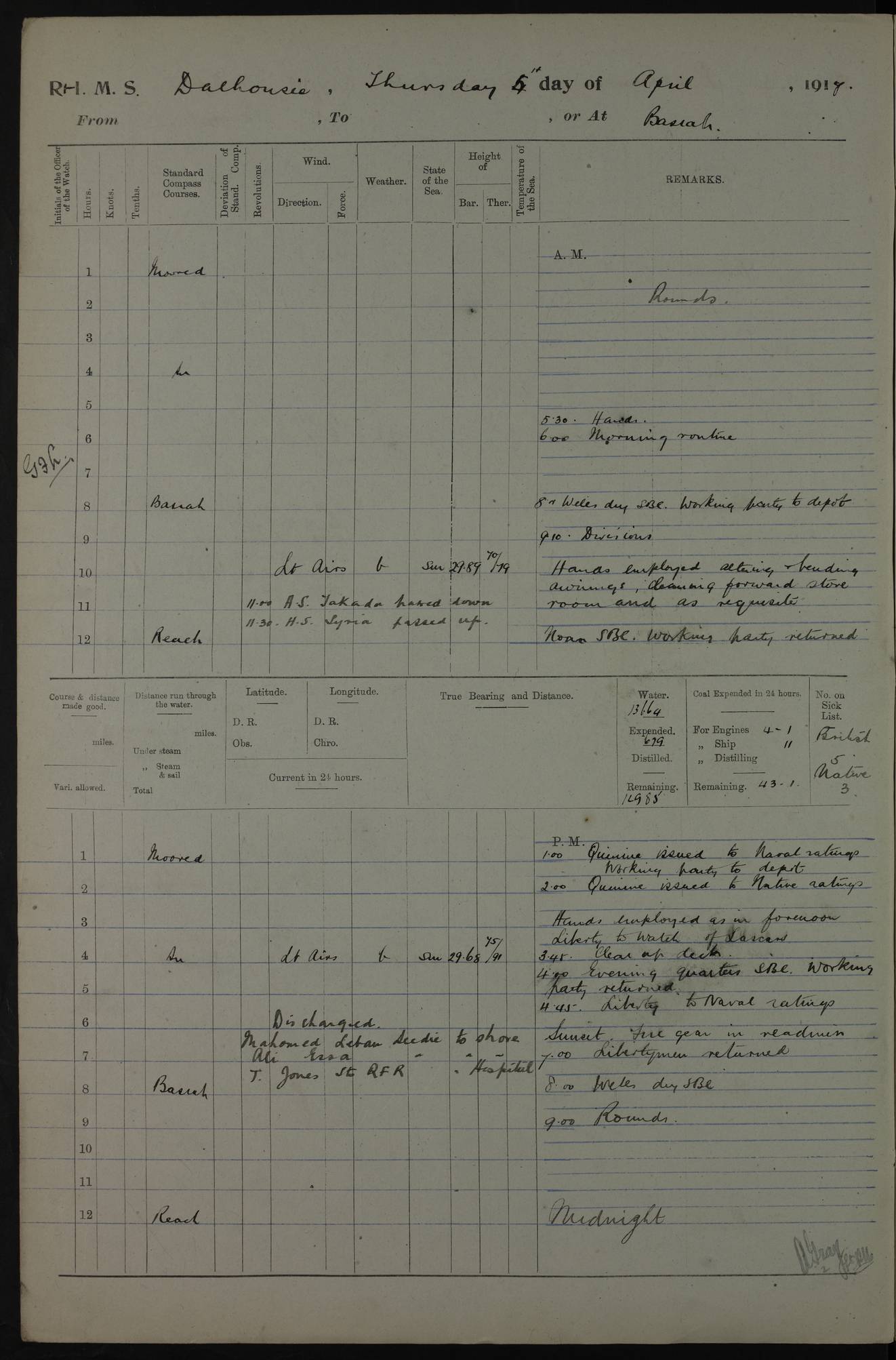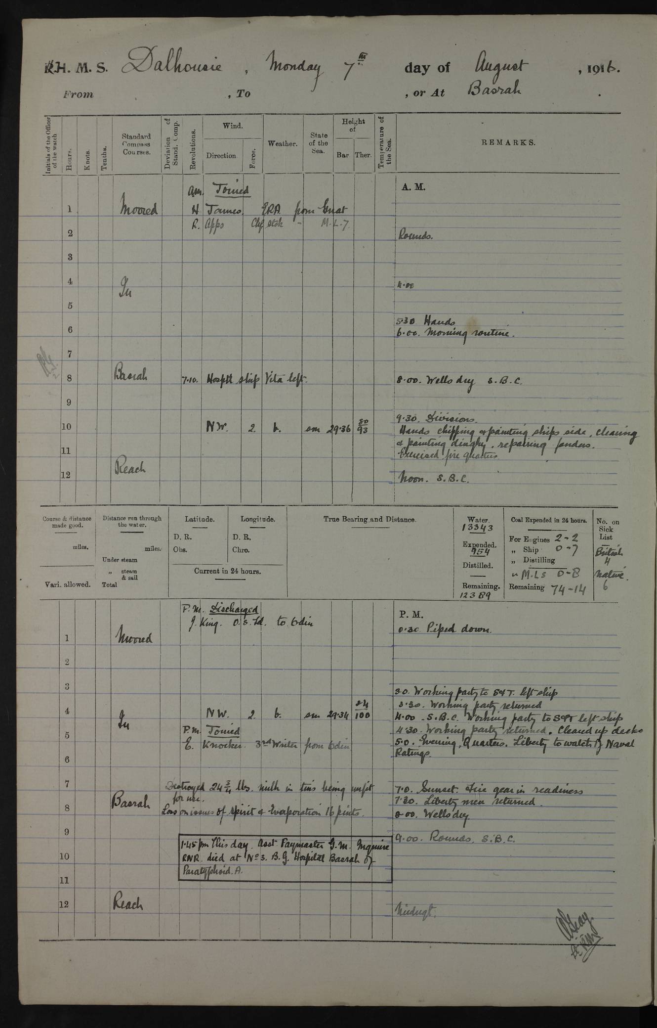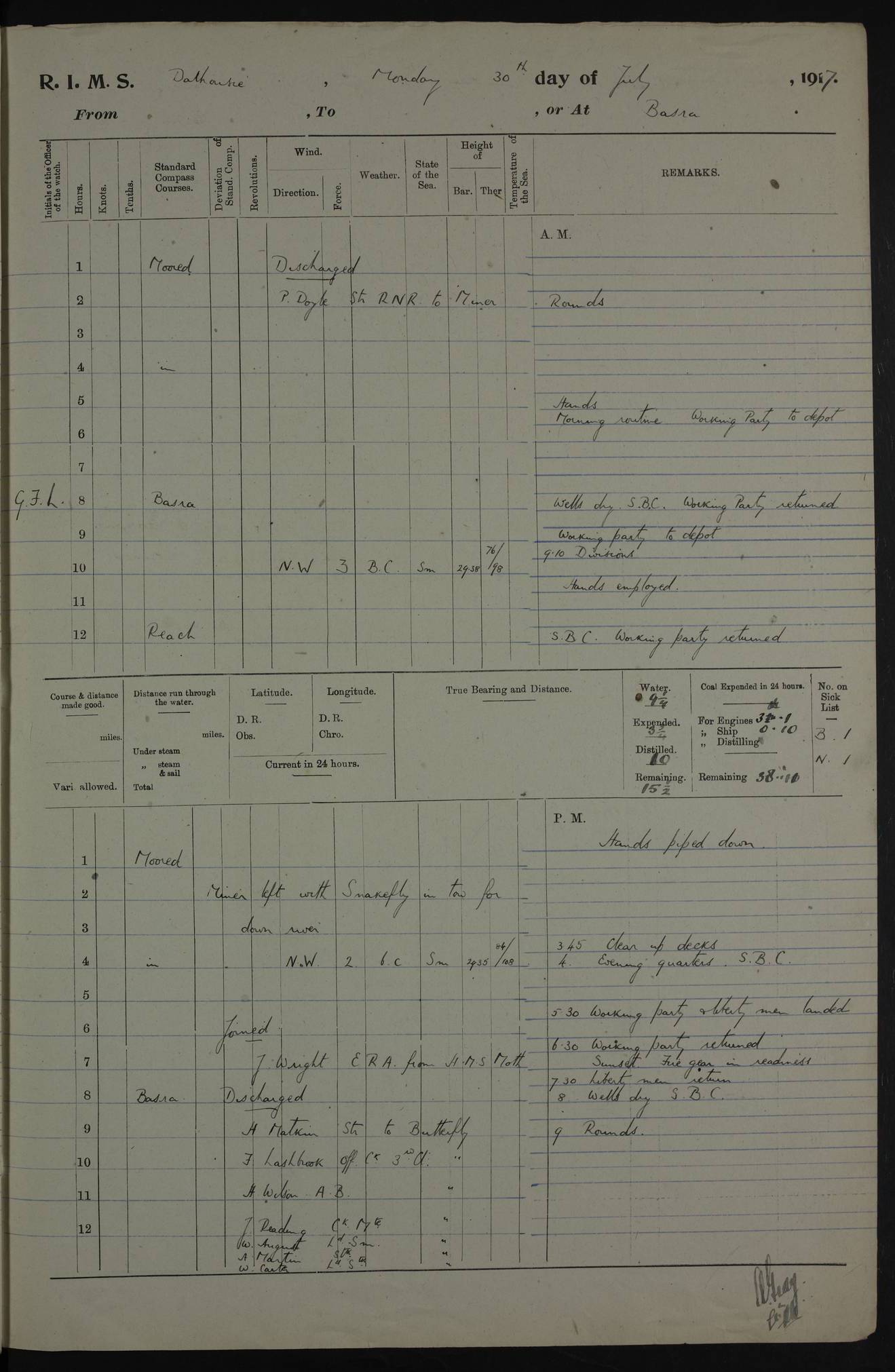 PM - Discharged To Hospital: H Widger, Engine Room Artificer - PW Harrison, Stoker Royal Navy Reserve To Motor Launch 11: J W Whitfield, Stoker 4ef4fa93e53e0a0c910056e2: (https://s3.amazonaws.com:443/oldweather/ADM53-39392/0018_0.jpg) 31 August 1916 Place: Basrah Lat 30.5269, Long 47.8407 2:00am: Rounds 5:05am: Hospital Ship SYRIA passed down 5:30am: Hands 6:00am: Morning Routine 8:00am: Wells dry – Signal Books Correct 9:30am: Divisions - Hands cleaning ship 11:00am: Drew Three Thousand Rupees from the Field treasury 12:00pm: Signal Books Correct – Issued Quinine to ship’s company 12:30pm: Piped Down 3:30pm: 4:00pm: Signal Books Correct 4:30pm: Cleared up decks 5:00pm: Evening Quarters – Leave to Watch of Naval Ratings 7:00pm: Sunset - Fire Gear in readiness 7:30pm: Liberty men returned 8:00pm: Wells dry - Signal Books Correct 9:00pm: Rounds - Signal Books Correct 11:00pm: Destroyed 19 tins Milk being unfit for use. AM – Joined From Motor Launch Depot: M. McMillan, Able Seaman From 5 Mess: T. Jackson, Petty Officer 1st From 4 Mess: T Golden, Stoker – J Tunney, Royal Navy Reserve Trawler Section From 10 Mess: J Donegan Royal Navy Reserve Trawler Section