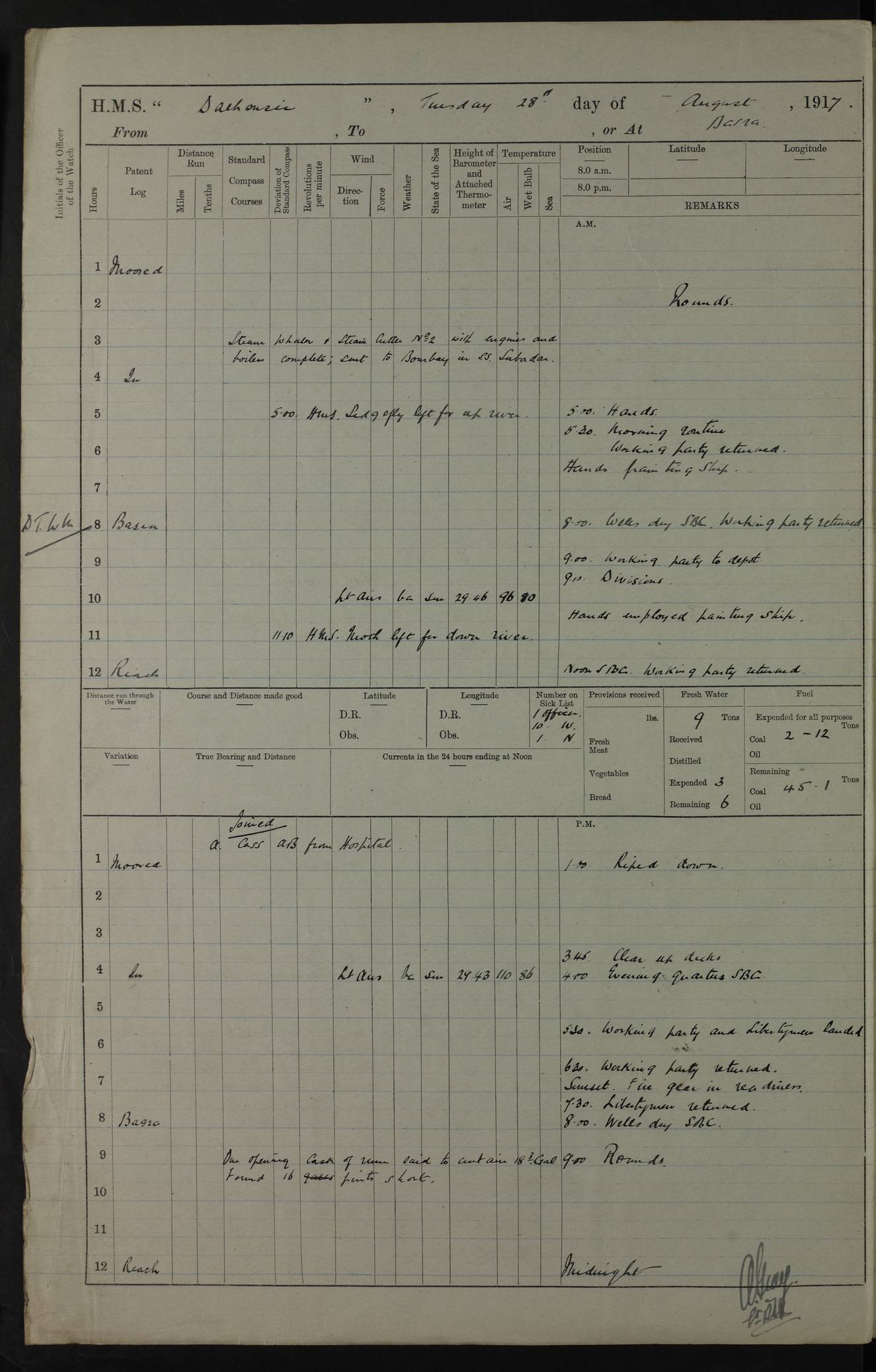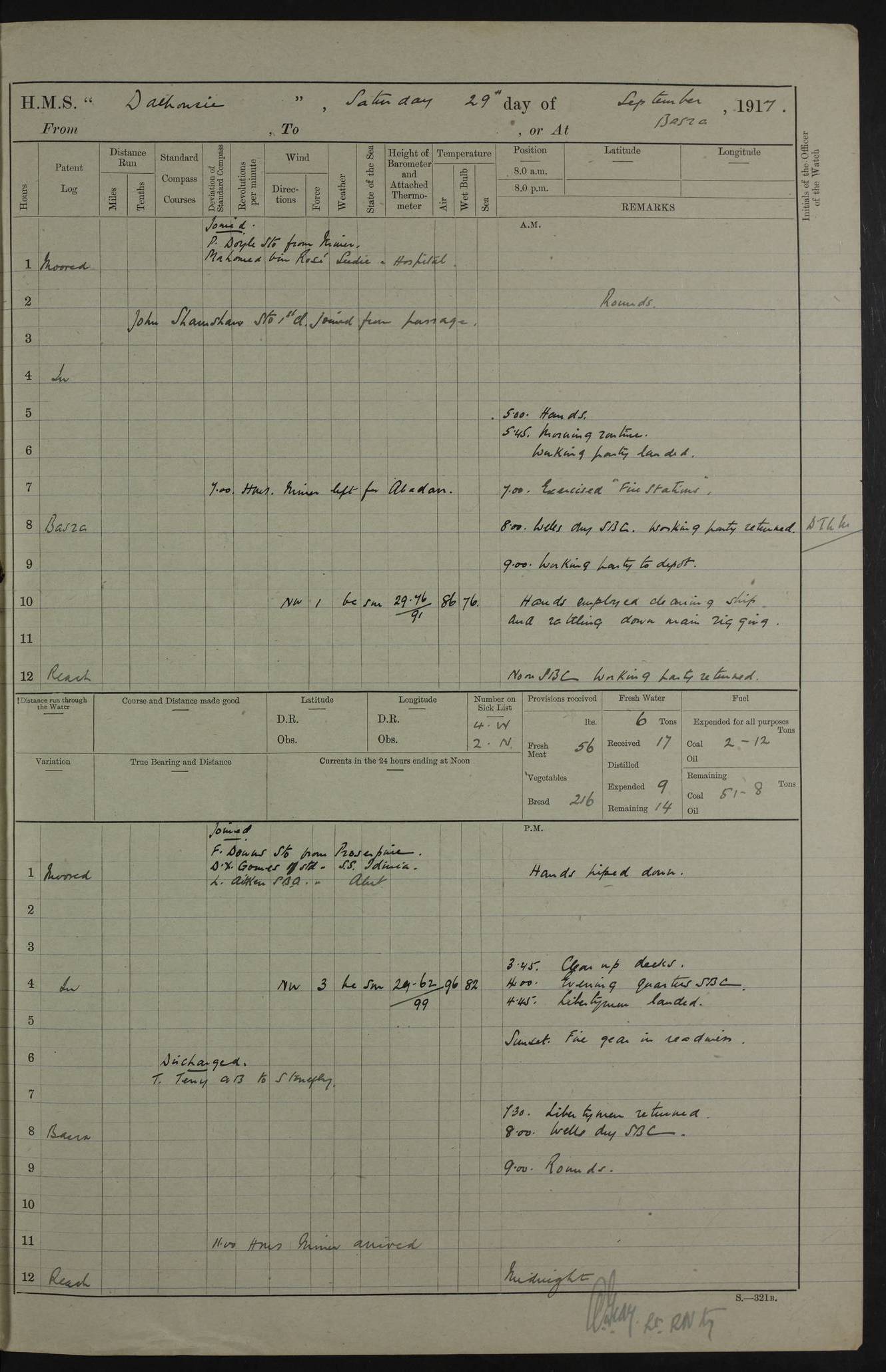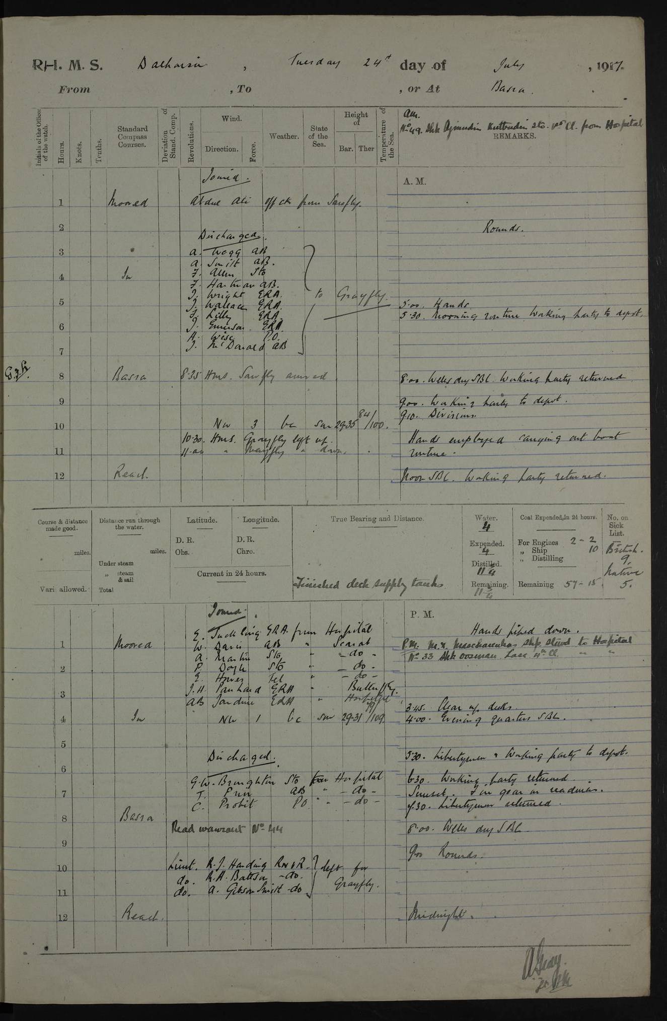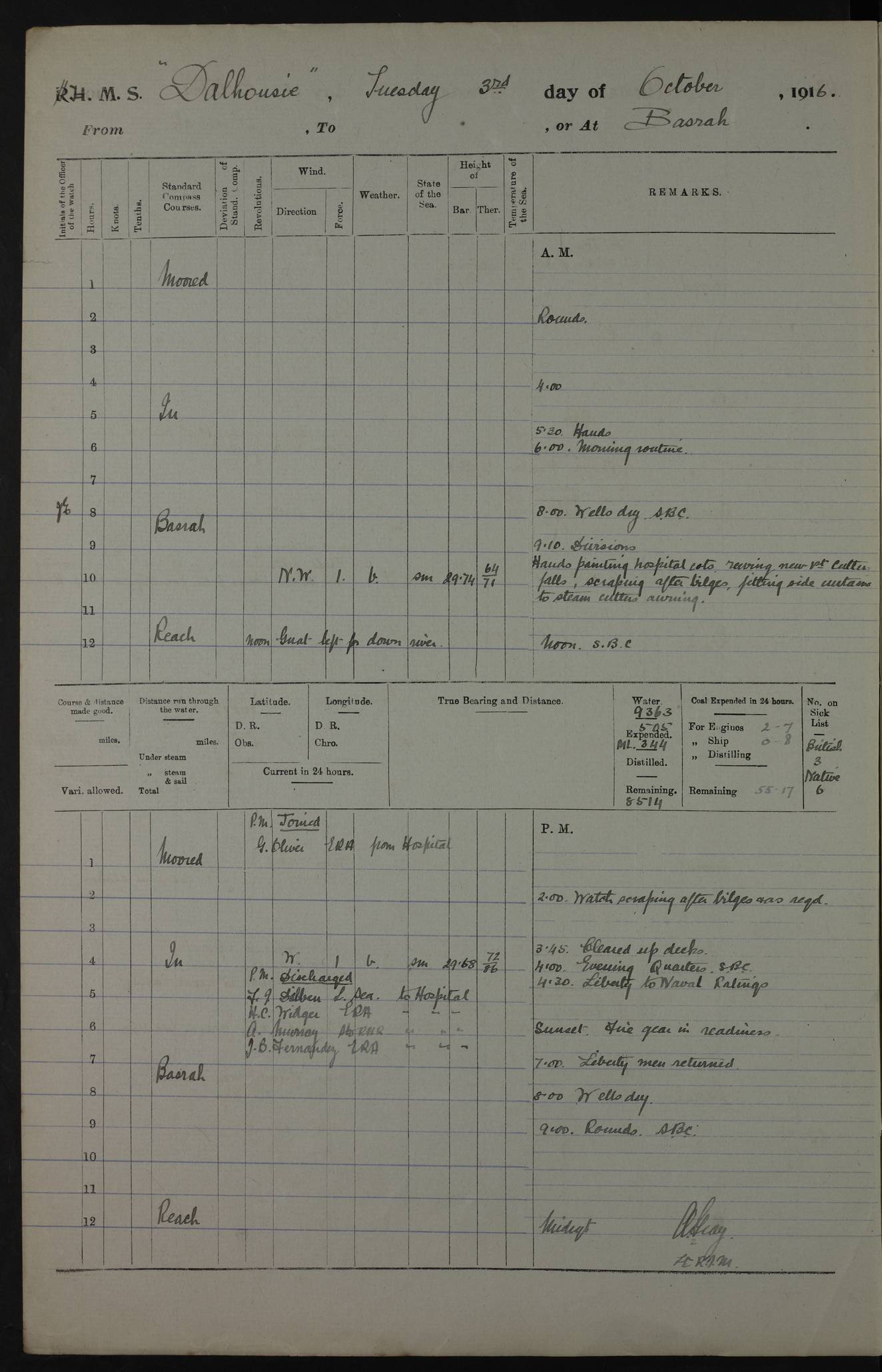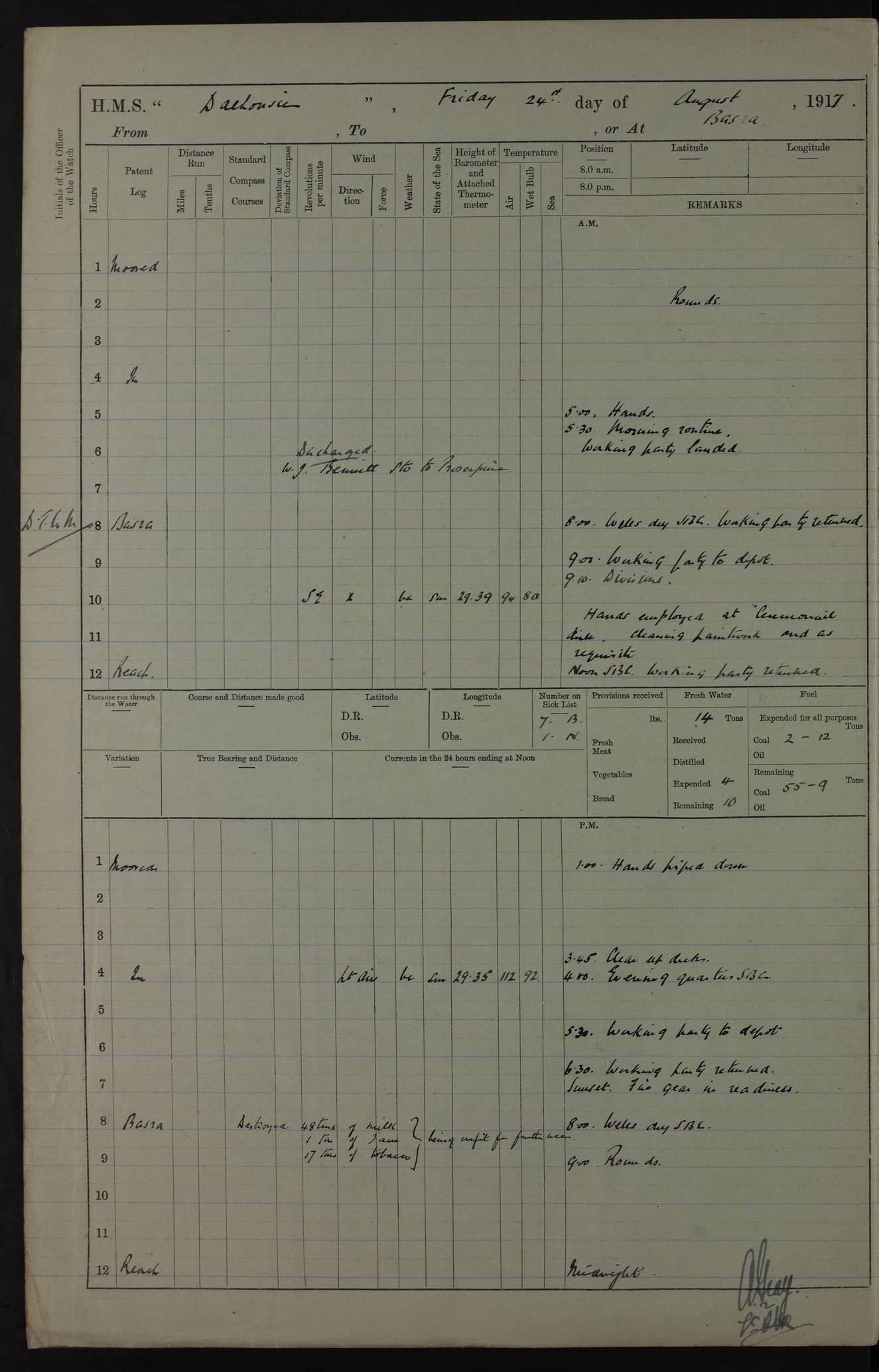 PM - Discharged To Hospital: H Widger, Engine Room Artificer - PW Harrison, Stoker Royal Navy Reserve To Motor Launch 11: J W Whitfield, Stoker 4ef4fa93e53e0a0c910056e2: (https://s3.amazonaws.com:443/oldweather/ADM53-39392/0018_0.jpg) 31 August 1916 Place: Basrah Lat 30.5269, Long 47.8407 2:00am: Rounds 5:05am: Hospital Ship SYRIA passed down 5:30am: Hands 6:00am: Morning Routine 8:00am: Wells dry – Signal Books Correct 9:30am: Divisions - Hands cleaning ship 11:00am: Drew Three Thousand Rupees from the Field treasury 12:00pm: Signal Books Correct – Issued Quinine to ship’s company 12:30pm: Piped Down 3:30pm: 4:00pm: Signal Books Correct 4:30pm: Cleared up decks 5:00pm: Evening Quarters – Leave to Watch of Naval Ratings 7:00pm: Sunset - Fire Gear in readiness 7:30pm: Liberty men returned 8:00pm: Wells dry - Signal Books Correct 9:00pm: Rounds - Signal Books Correct 11:00pm: Destroyed 19 tins Milk being unfit for use. AM – Joined From Motor Launch Depot: M. McMillan, Able Seaman From 5 Mess: T. Jackson, Petty Officer 1st From 4 Mess: T Golden, Stoker – J Tunney, Royal Navy Reserve Trawler Section From 10 Mess: J Donegan Royal Navy Reserve Trawler Section