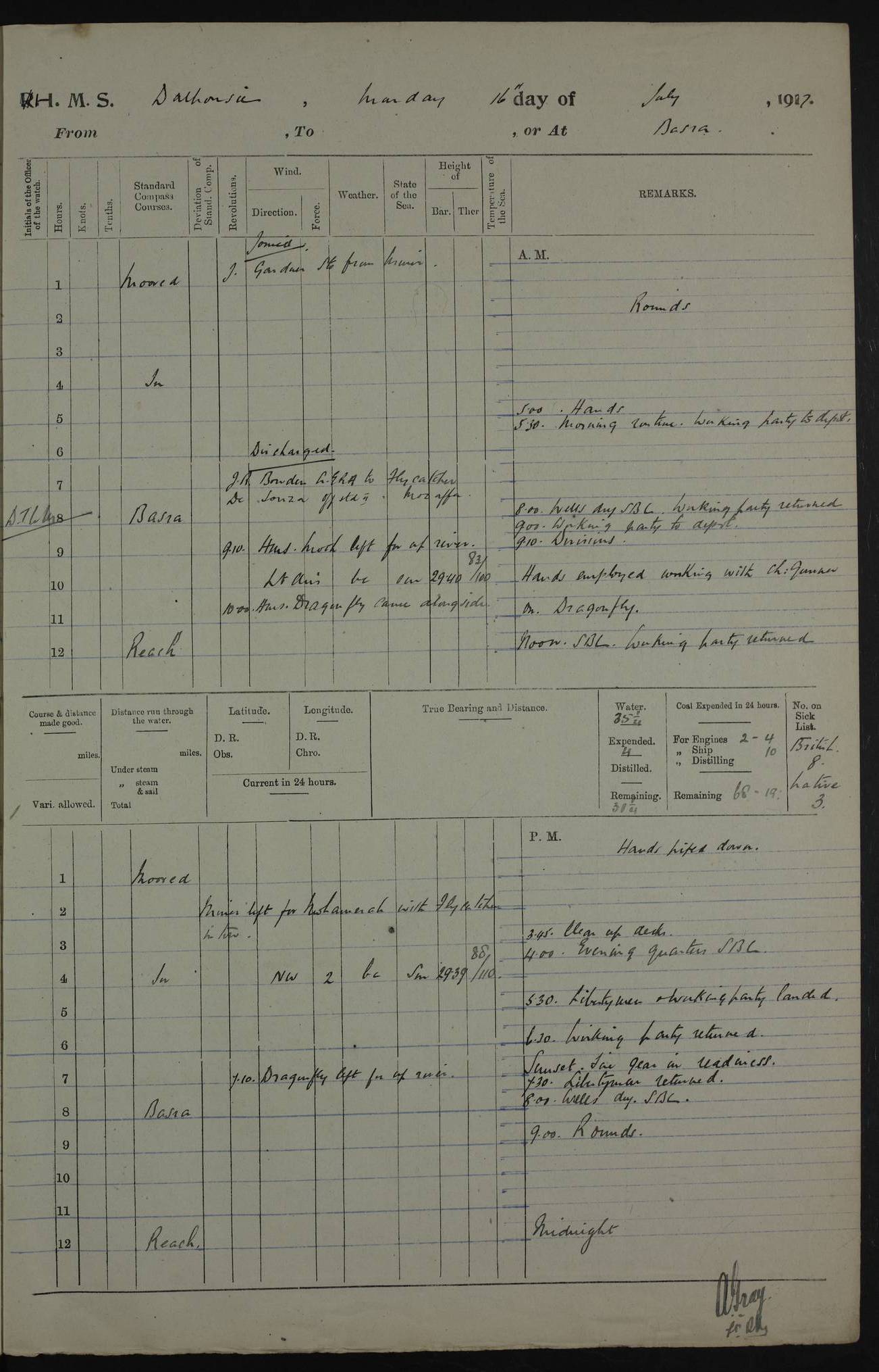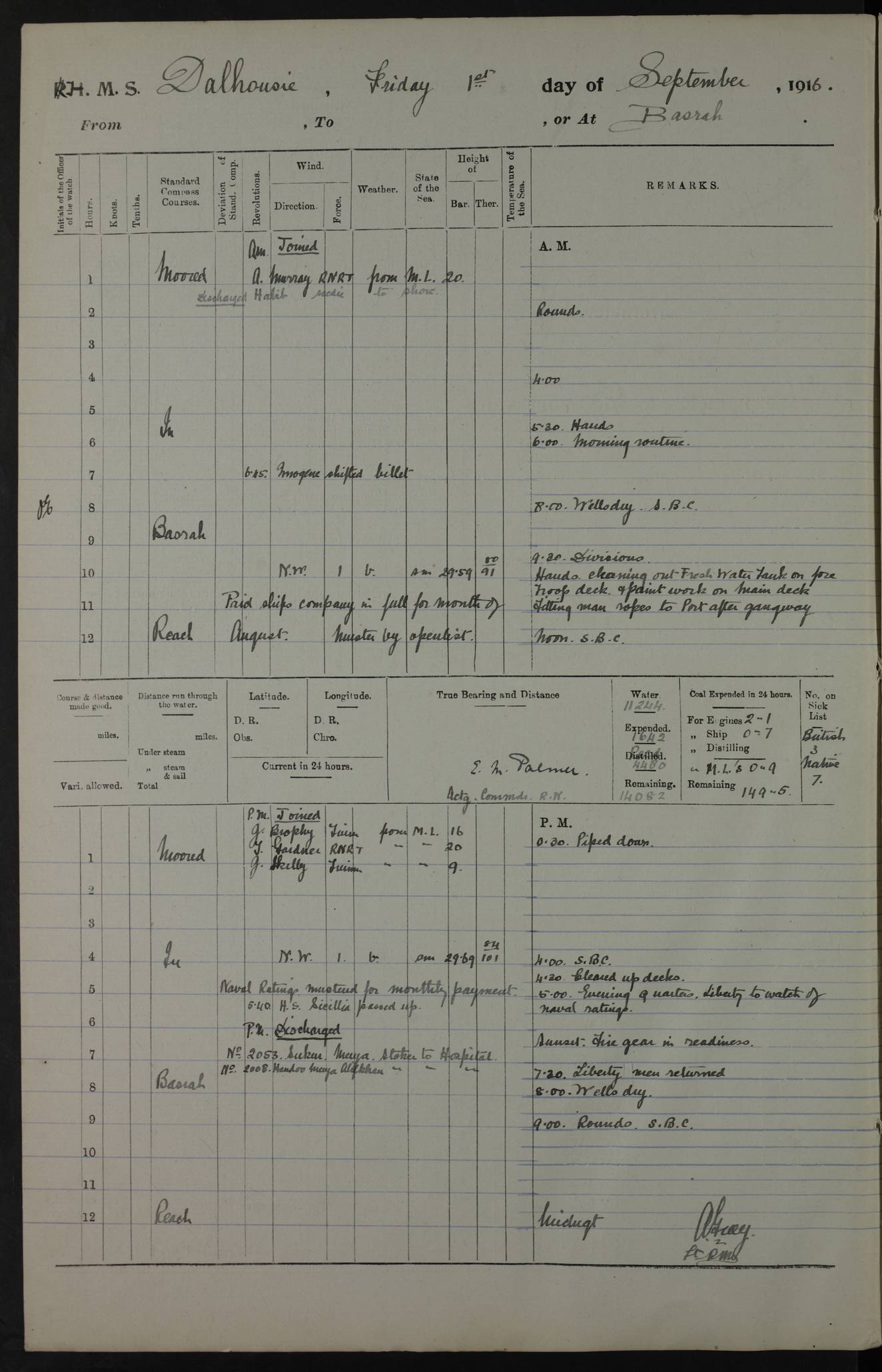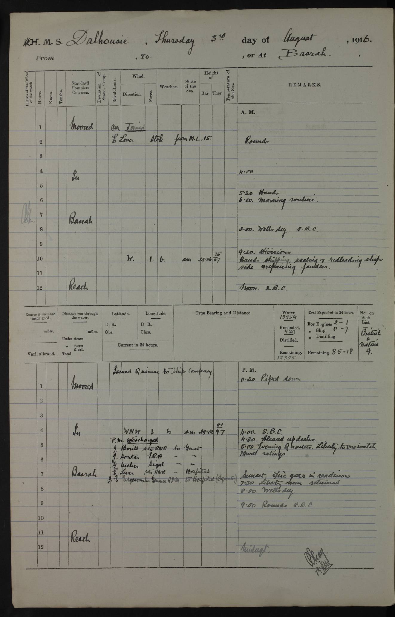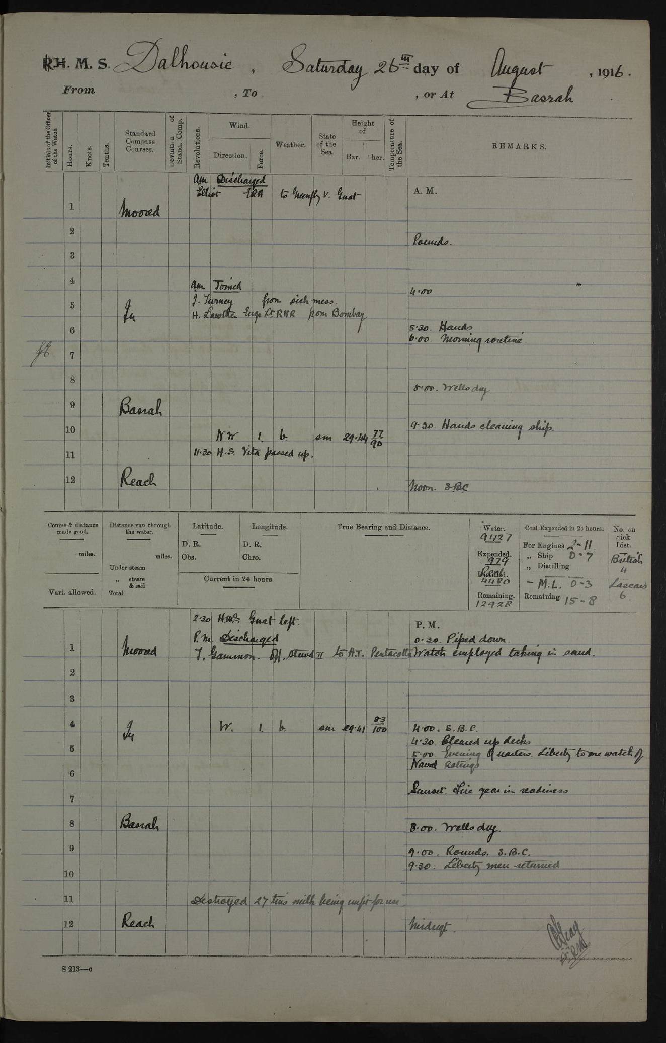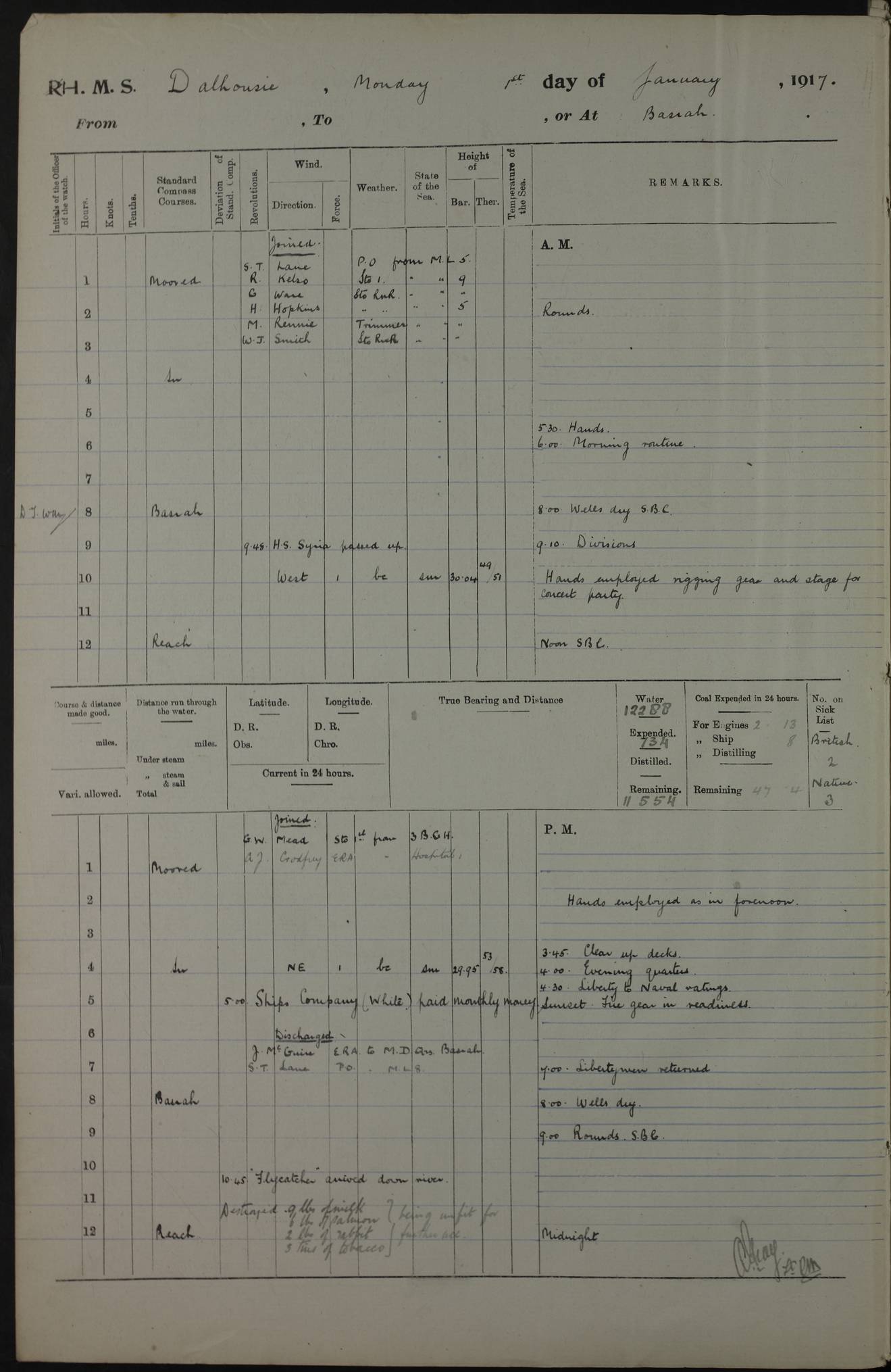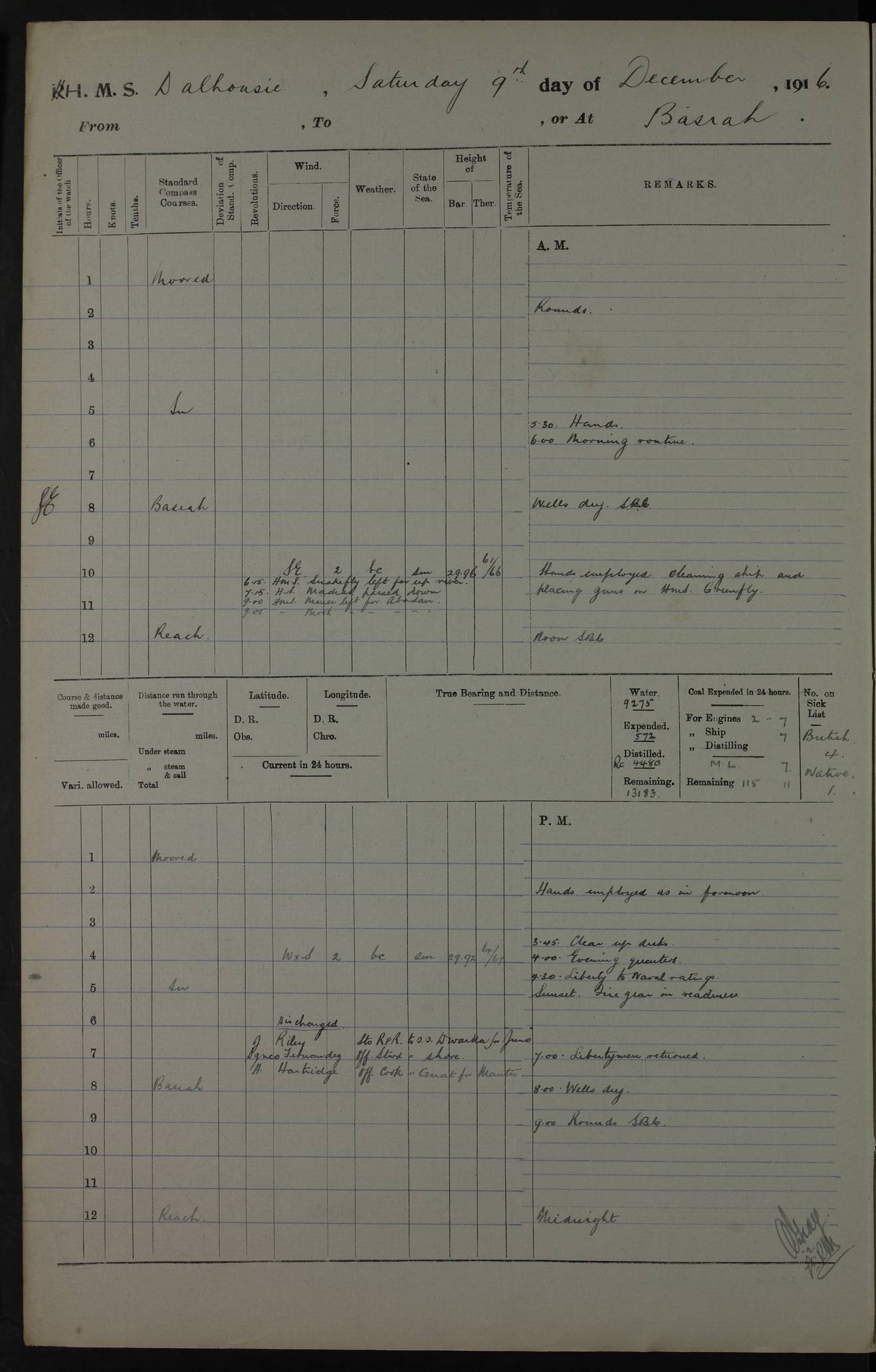PM - Discharged To Hospital: H Widger, Engine Room Artificer - PW Harrison, Stoker Royal Navy Reserve To Motor Launch 11: J W Whitfield, Stoker 4ef4fa93e53e0a0c910056e2: (https://s3.amazonaws.com:443/oldweather/ADM53-39392/0018_0.jpg) 31 August 1916 Place: Basrah Lat 30.5269, Long 47.8407 2:00am: Rounds 5:05am: Hospital Ship SYRIA passed down 5:30am: Hands 6:00am: Morning Routine 8:00am: Wells dry – Signal Books Correct 9:30am: Divisions - Hands cleaning ship 11:00am: Drew Three Thousand Rupees from the Field treasury 12:00pm: Signal Books Correct – Issued Quinine to ship’s company 12:30pm: Piped Down 3:30pm: 4:00pm: Signal Books Correct 4:30pm: Cleared up decks 5:00pm: Evening Quarters – Leave to Watch of Naval Ratings 7:00pm: Sunset - Fire Gear in readiness 7:30pm: Liberty men returned 8:00pm: Wells dry - Signal Books Correct 9:00pm: Rounds - Signal Books Correct 11:00pm: Destroyed 19 tins Milk being unfit for use. AM – Joined From Motor Launch Depot: M. McMillan, Able Seaman From 5 Mess: T. Jackson, Petty Officer 1st From 4 Mess: T Golden, Stoker – J Tunney, Royal Navy Reserve Trawler Section From 10 Mess: J Donegan Royal Navy Reserve Trawler Section