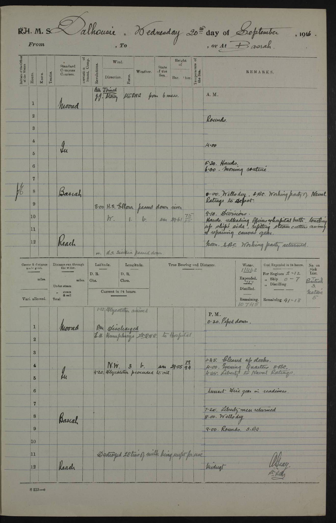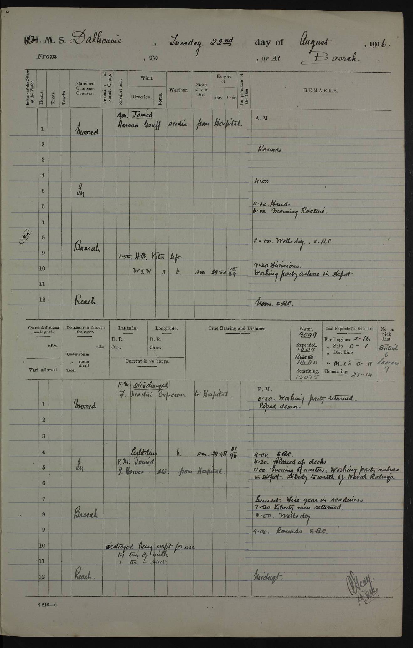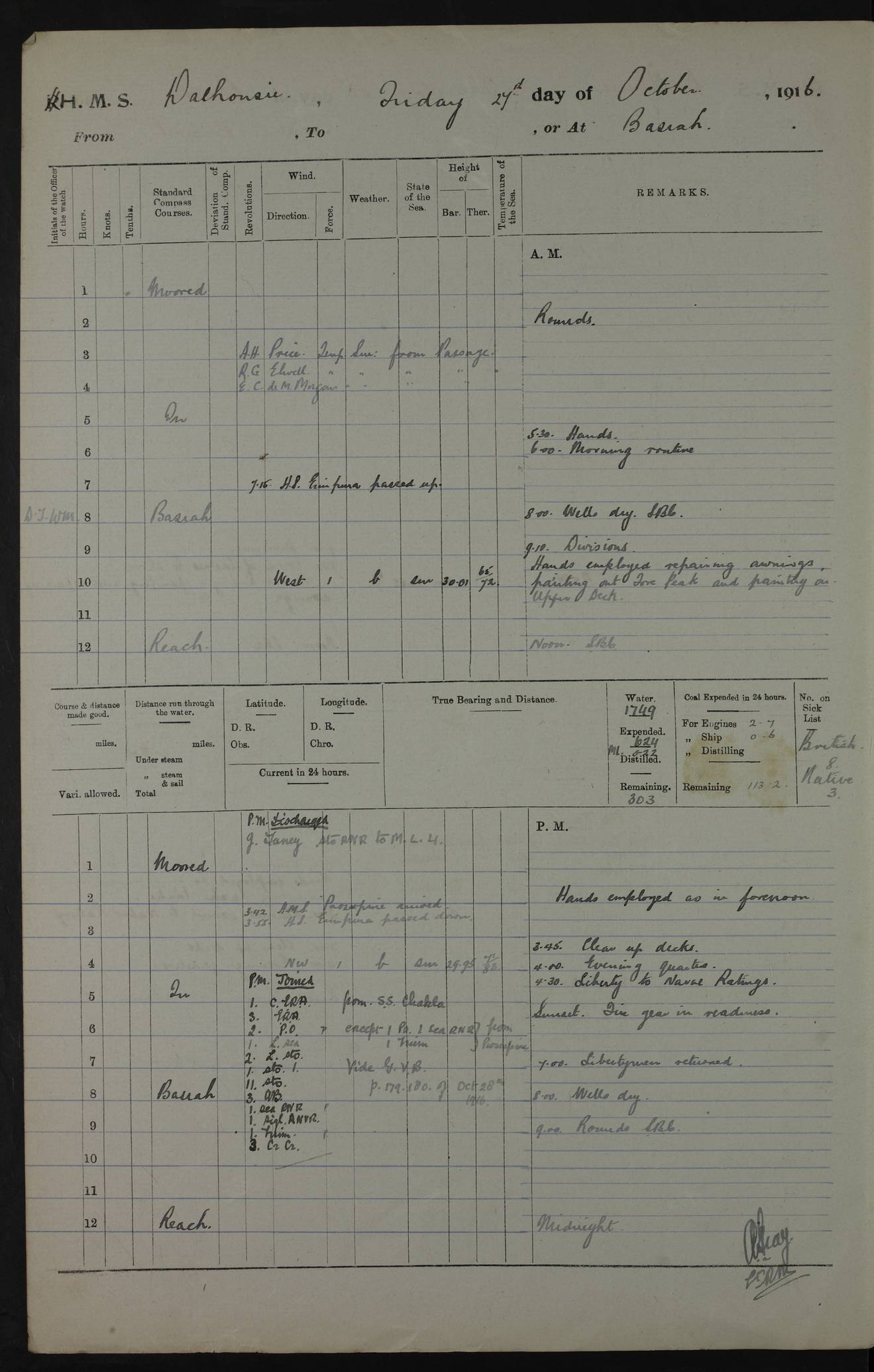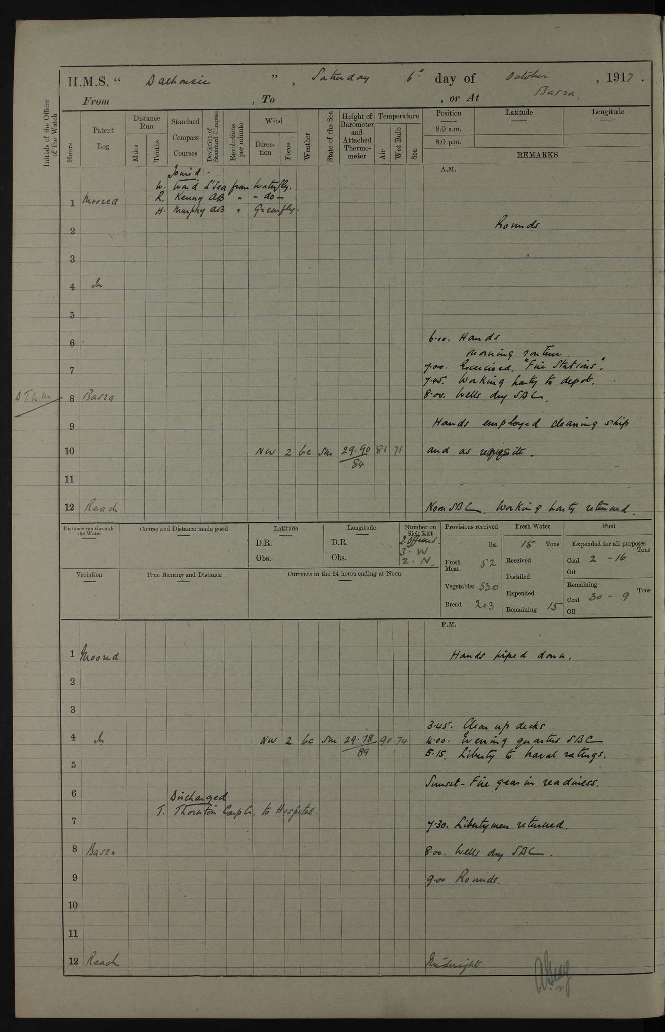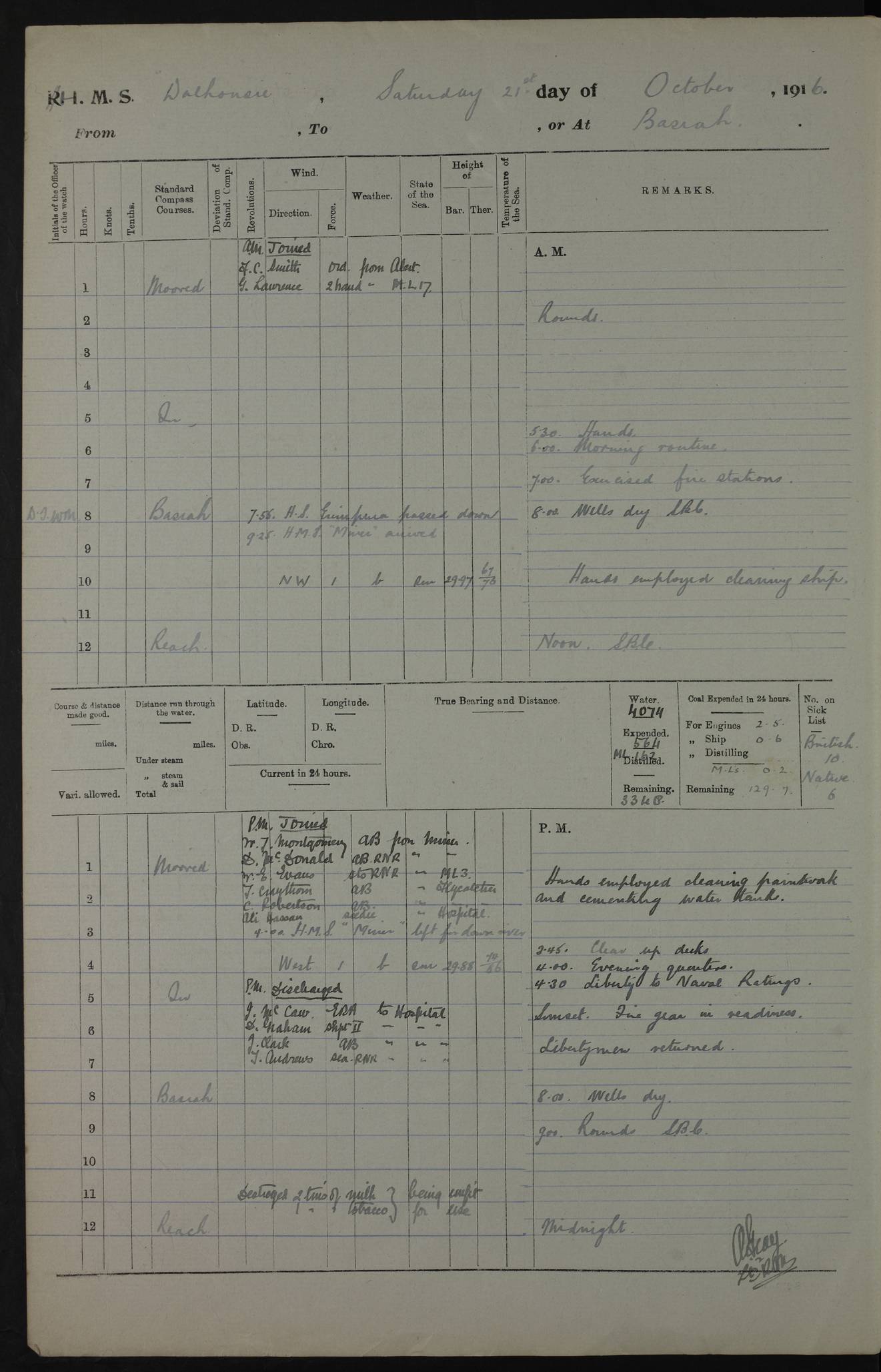 PM - Discharged To Hospital: H Widger, Engine Room Artificer - PW Harrison, Stoker Royal Navy Reserve To Motor Launch 11: J W Whitfield, Stoker 4ef4fa93e53e0a0c910056e2: (https://s3.amazonaws.com:443/oldweather/ADM53-39392/0018_0.jpg) 31 August 1916 Place: Basrah Lat 30.5269, Long 47.8407 2:00am: Rounds 5:05am: Hospital Ship SYRIA passed down 5:30am: Hands 6:00am: Morning Routine 8:00am: Wells dry – Signal Books Correct 9:30am: Divisions - Hands cleaning ship 11:00am: Drew Three Thousand Rupees from the Field treasury 12:00pm: Signal Books Correct – Issued Quinine to ship’s company 12:30pm: Piped Down 3:30pm: 4:00pm: Signal Books Correct 4:30pm: Cleared up decks 5:00pm: Evening Quarters – Leave to Watch of Naval Ratings 7:00pm: Sunset - Fire Gear in readiness 7:30pm: Liberty men returned 8:00pm: Wells dry - Signal Books Correct 9:00pm: Rounds - Signal Books Correct 11:00pm: Destroyed 19 tins Milk being unfit for use. AM – Joined From Motor Launch Depot: M. McMillan, Able Seaman From 5 Mess: T. Jackson, Petty Officer 1st From 4 Mess: T Golden, Stoker – J Tunney, Royal Navy Reserve Trawler Section From 10 Mess: J Donegan Royal Navy Reserve Trawler Section