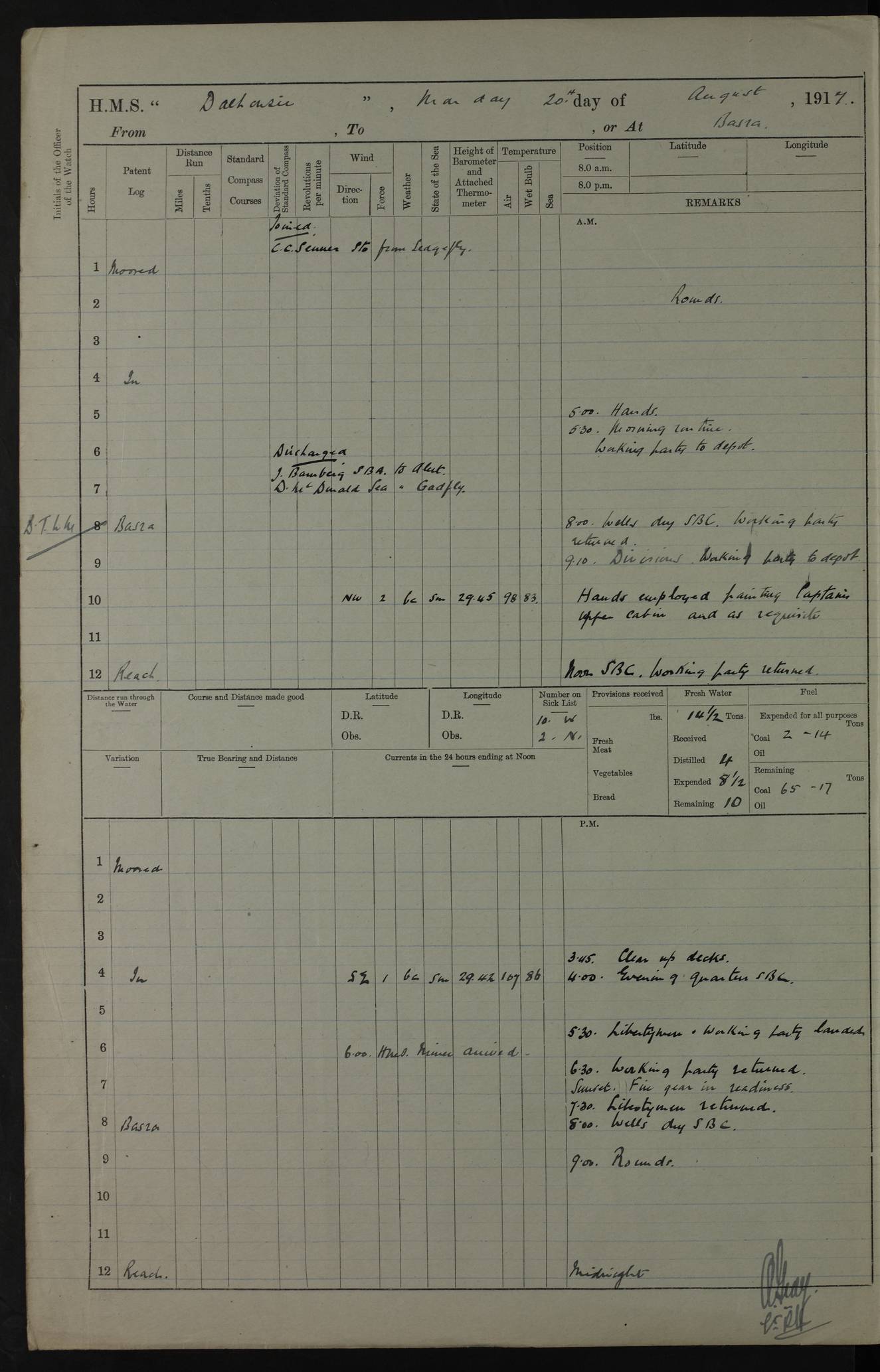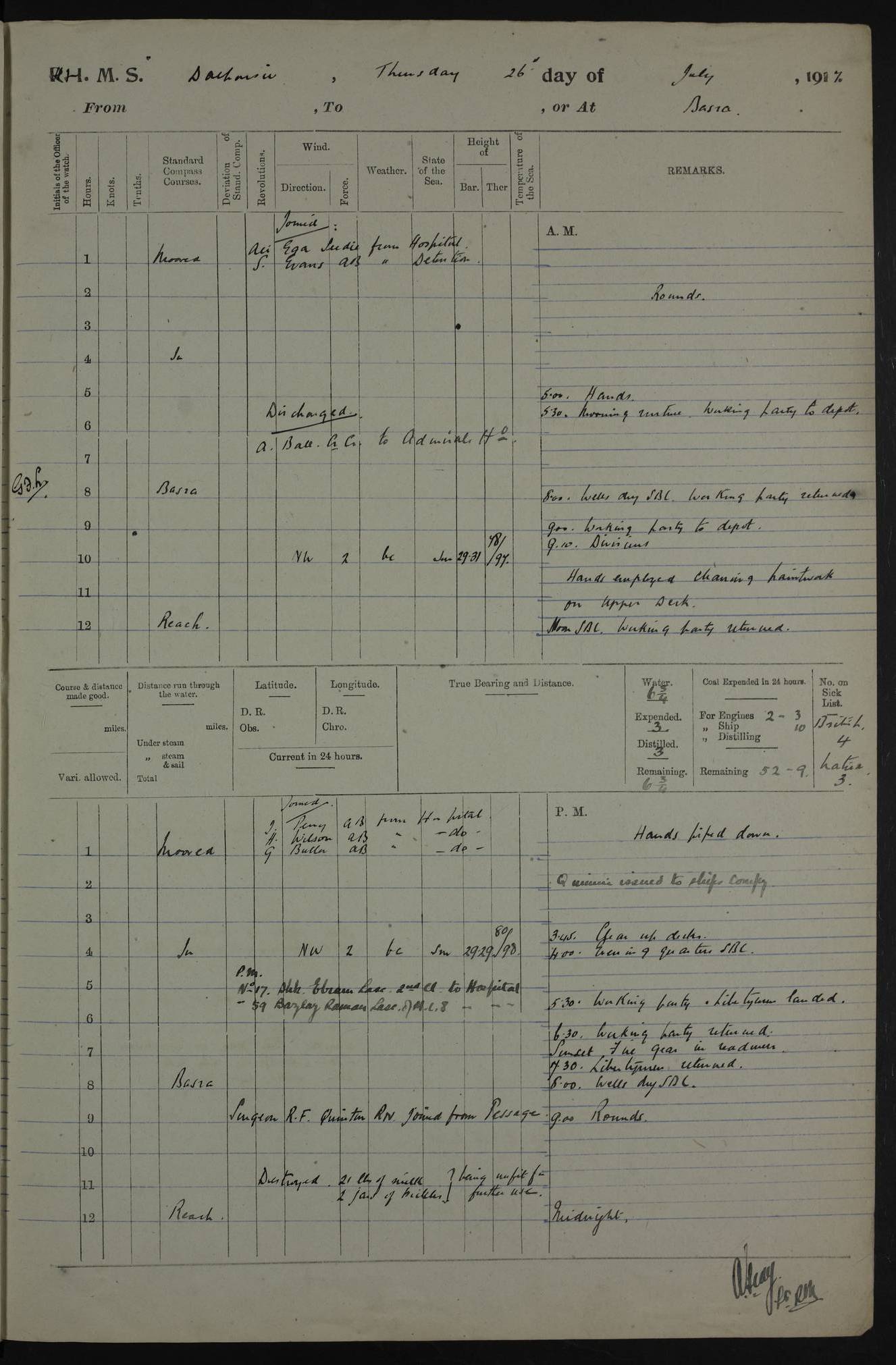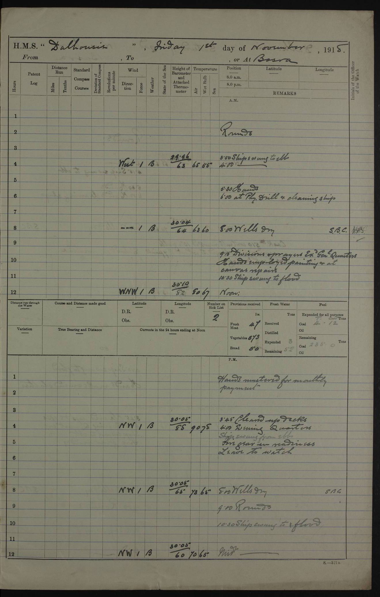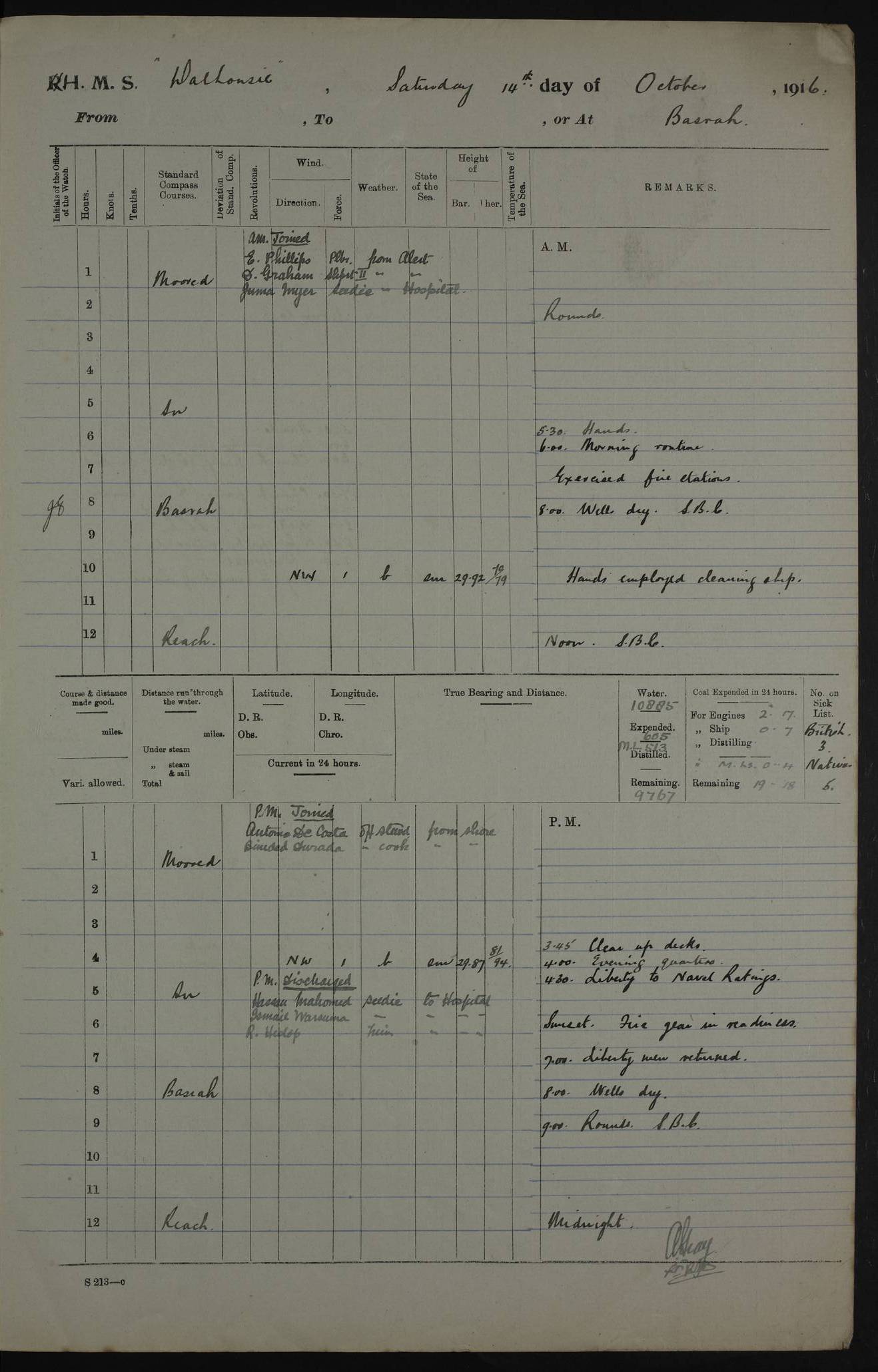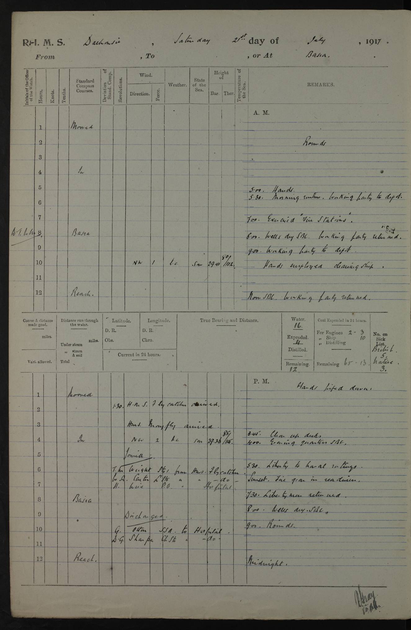 PM - Discharged To Hospital: H Widger, Engine Room Artificer - PW Harrison, Stoker Royal Navy Reserve To Motor Launch 11: J W Whitfield, Stoker 4ef4fa93e53e0a0c910056e2: (https://s3.amazonaws.com:443/oldweather/ADM53-39392/0018_0.jpg) 31 August 1916 Place: Basrah Lat 30.5269, Long 47.8407 2:00am: Rounds 5:05am: Hospital Ship SYRIA passed down 5:30am: Hands 6:00am: Morning Routine 8:00am: Wells dry – Signal Books Correct 9:30am: Divisions - Hands cleaning ship 11:00am: Drew Three Thousand Rupees from the Field treasury 12:00pm: Signal Books Correct – Issued Quinine to ship’s company 12:30pm: Piped Down 3:30pm: 4:00pm: Signal Books Correct 4:30pm: Cleared up decks 5:00pm: Evening Quarters – Leave to Watch of Naval Ratings 7:00pm: Sunset - Fire Gear in readiness 7:30pm: Liberty men returned 8:00pm: Wells dry - Signal Books Correct 9:00pm: Rounds - Signal Books Correct 11:00pm: Destroyed 19 tins Milk being unfit for use. AM – Joined From Motor Launch Depot: M. McMillan, Able Seaman From 5 Mess: T. Jackson, Petty Officer 1st From 4 Mess: T Golden, Stoker – J Tunney, Royal Navy Reserve Trawler Section From 10 Mess: J Donegan Royal Navy Reserve Trawler Section