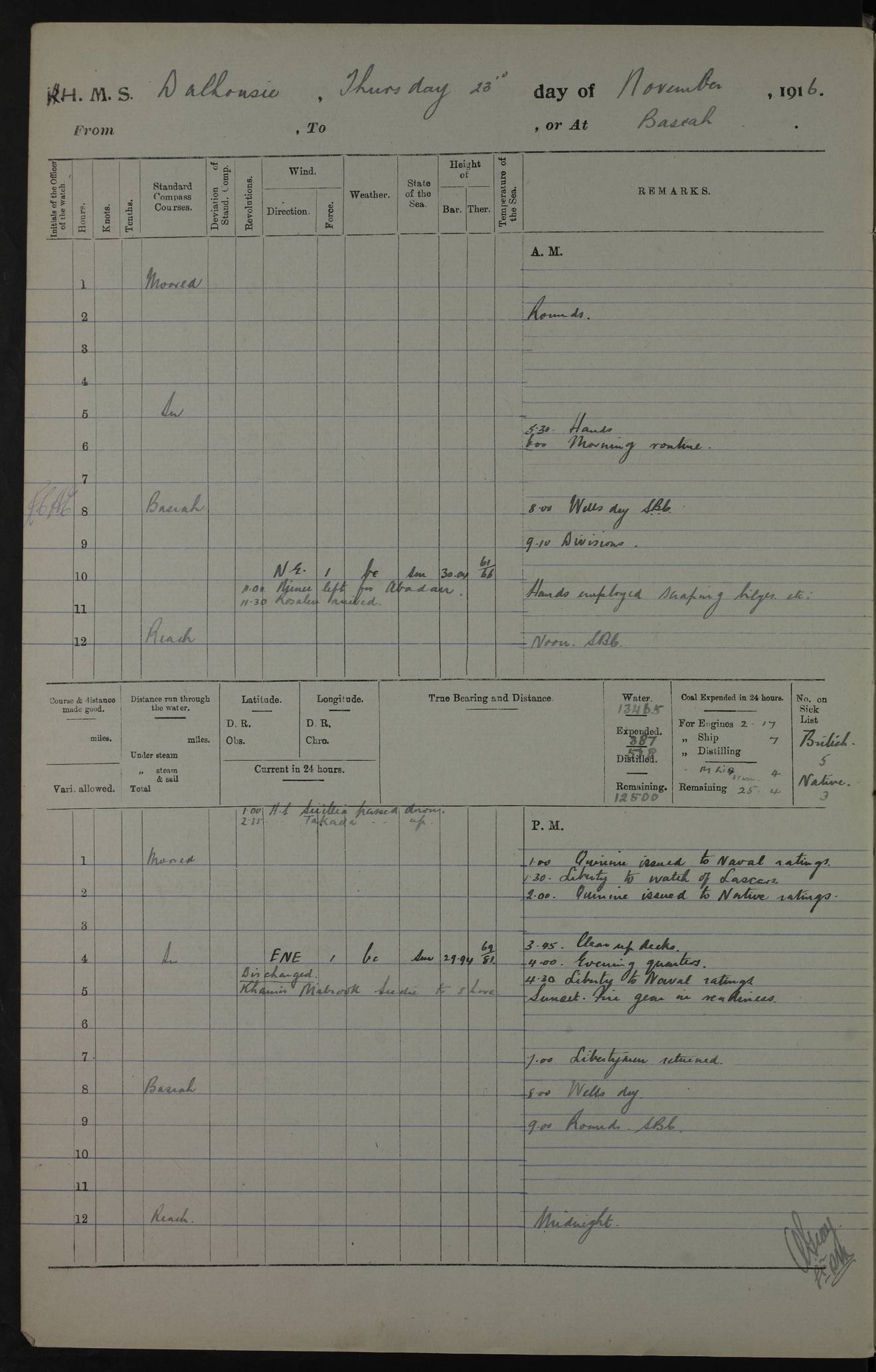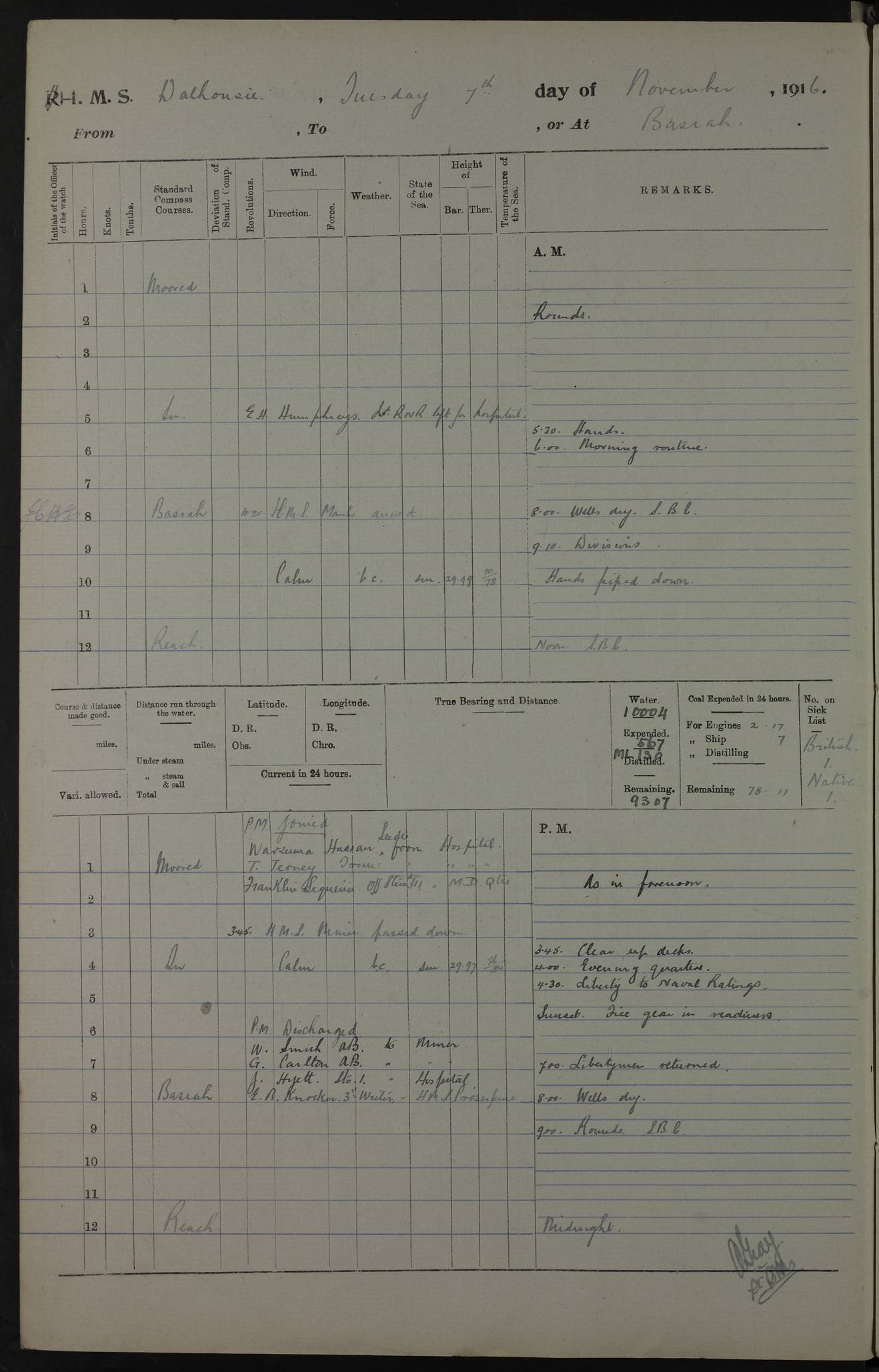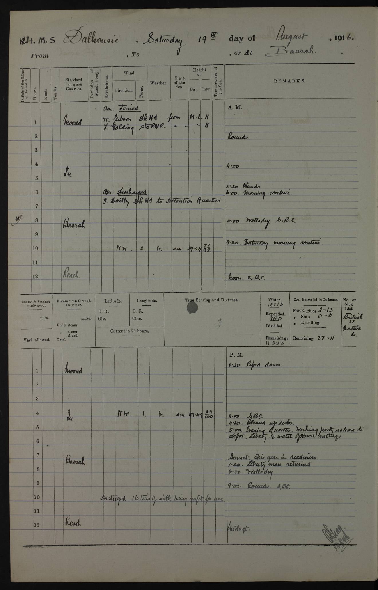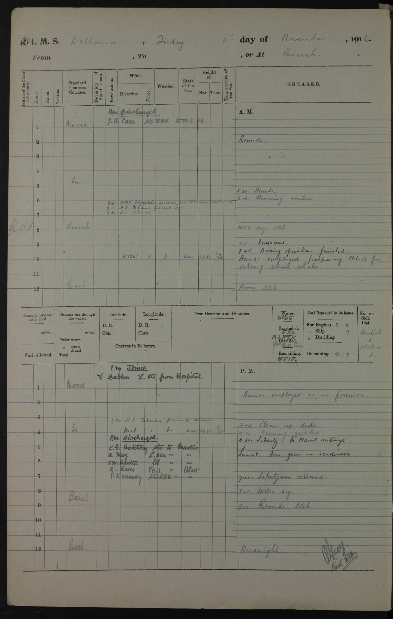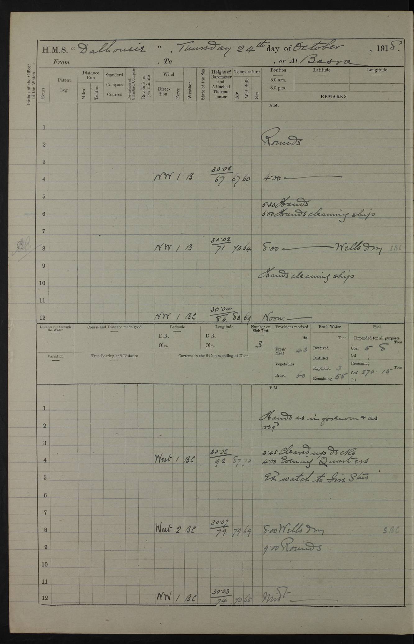 PM - Discharged To Hospital: H Widger, Engine Room Artificer - PW Harrison, Stoker Royal Navy Reserve To Motor Launch 11: J W Whitfield, Stoker 4ef4fa93e53e0a0c910056e2: (https://s3.amazonaws.com:443/oldweather/ADM53-39392/0018_0.jpg) 31 August 1916 Place: Basrah Lat 30.5269, Long 47.8407 2:00am: Rounds 5:05am: Hospital Ship SYRIA passed down 5:30am: Hands 6:00am: Morning Routine 8:00am: Wells dry – Signal Books Correct 9:30am: Divisions - Hands cleaning ship 11:00am: Drew Three Thousand Rupees from the Field treasury 12:00pm: Signal Books Correct – Issued Quinine to ship’s company 12:30pm: Piped Down 3:30pm: 4:00pm: Signal Books Correct 4:30pm: Cleared up decks 5:00pm: Evening Quarters – Leave to Watch of Naval Ratings 7:00pm: Sunset - Fire Gear in readiness 7:30pm: Liberty men returned 8:00pm: Wells dry - Signal Books Correct 9:00pm: Rounds - Signal Books Correct 11:00pm: Destroyed 19 tins Milk being unfit for use. AM – Joined From Motor Launch Depot: M. McMillan, Able Seaman From 5 Mess: T. Jackson, Petty Officer 1st From 4 Mess: T Golden, Stoker – J Tunney, Royal Navy Reserve Trawler Section From 10 Mess: J Donegan Royal Navy Reserve Trawler Section