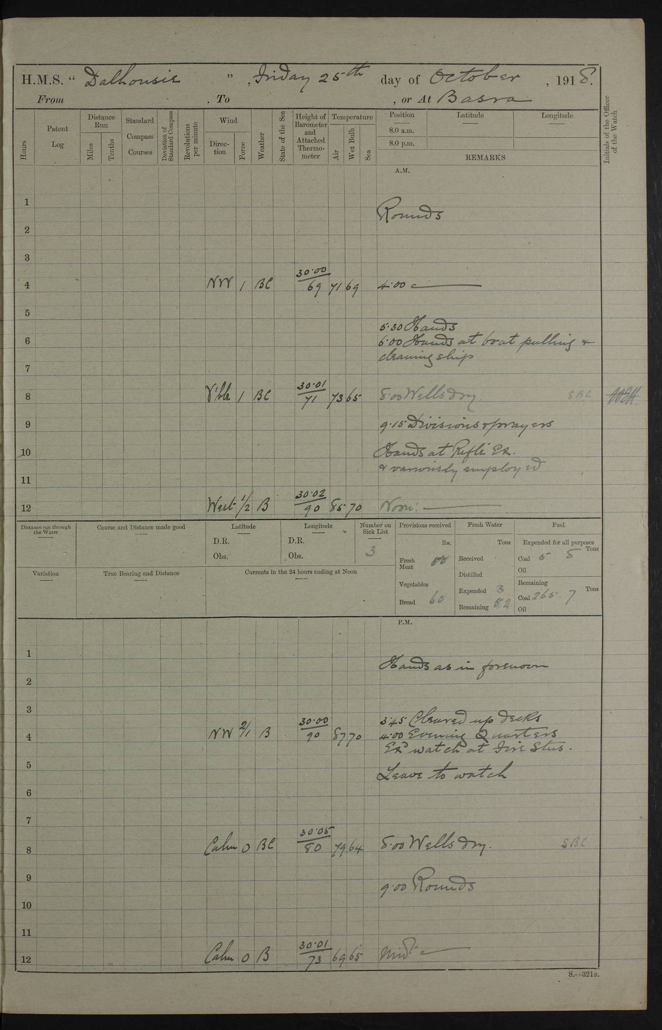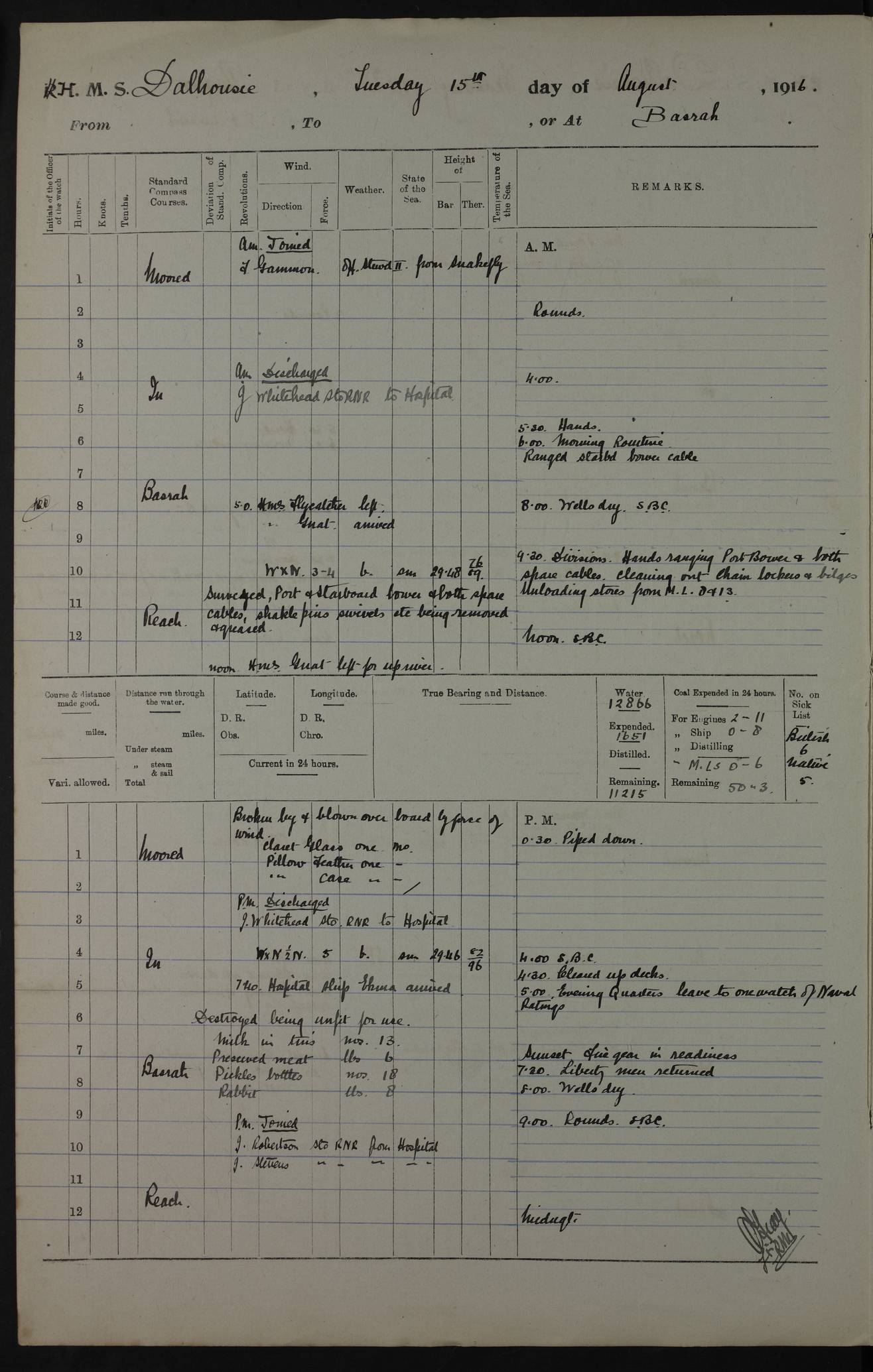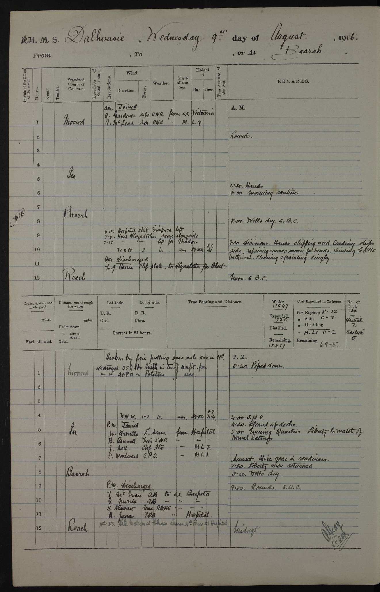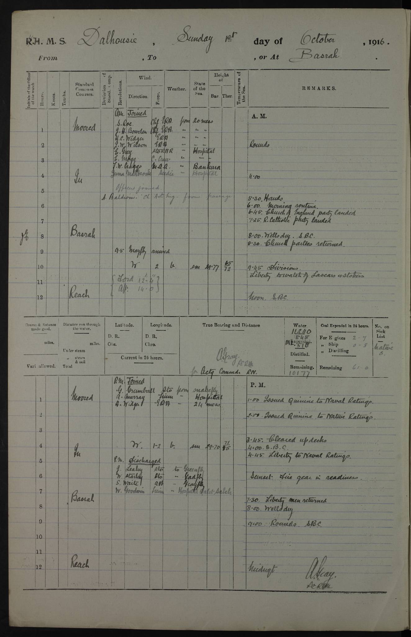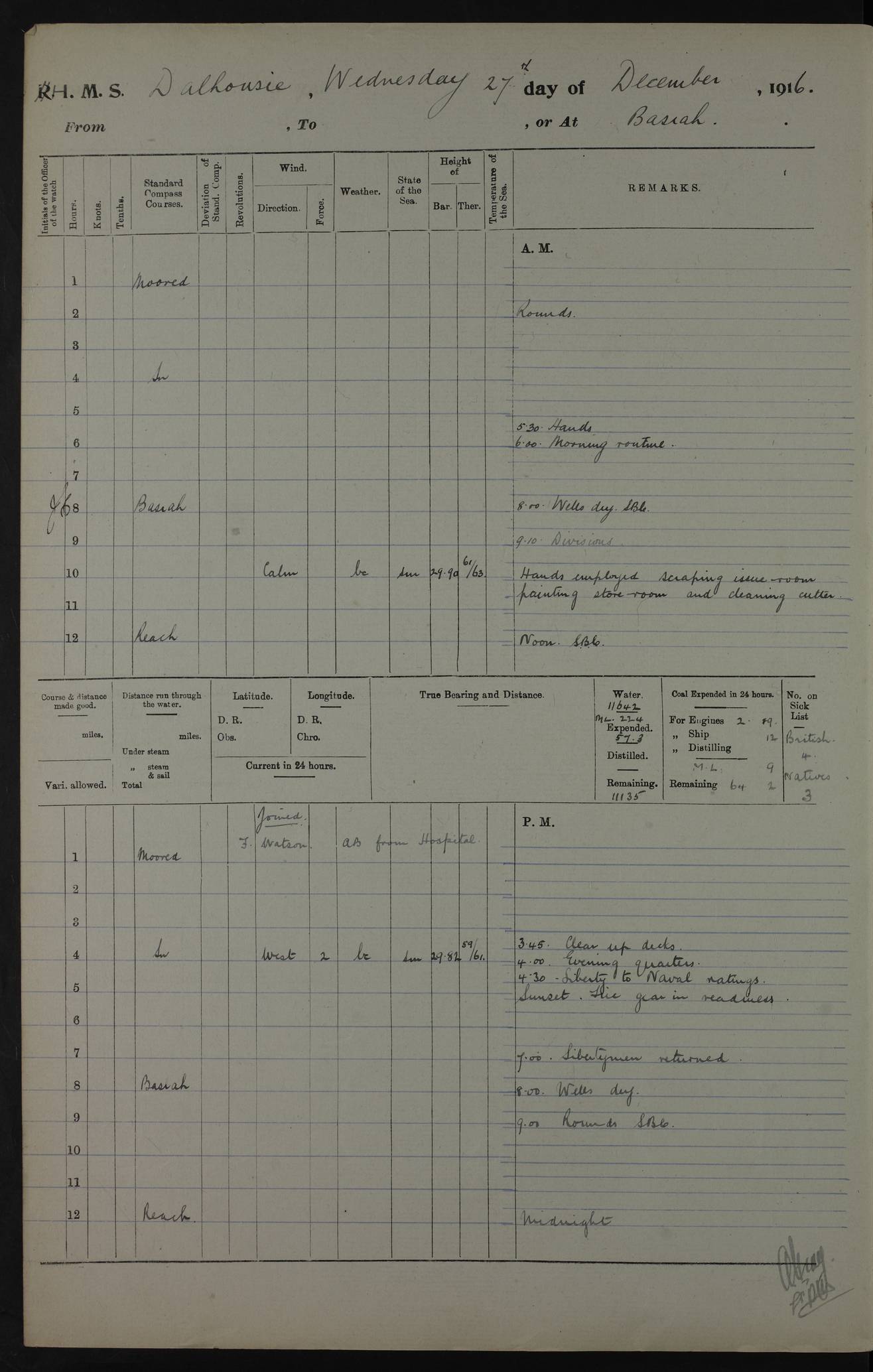 PM - Discharged To Hospital: H Widger, Engine Room Artificer - PW Harrison, Stoker Royal Navy Reserve To Motor Launch 11: J W Whitfield, Stoker 4ef4fa93e53e0a0c910056e2: (https://s3.amazonaws.com:443/oldweather/ADM53-39392/0018_0.jpg) 31 August 1916 Place: Basrah Lat 30.5269, Long 47.8407 2:00am: Rounds 5:05am: Hospital Ship SYRIA passed down 5:30am: Hands 6:00am: Morning Routine 8:00am: Wells dry – Signal Books Correct 9:30am: Divisions - Hands cleaning ship 11:00am: Drew Three Thousand Rupees from the Field treasury 12:00pm: Signal Books Correct – Issued Quinine to ship’s company 12:30pm: Piped Down 3:30pm: 4:00pm: Signal Books Correct 4:30pm: Cleared up decks 5:00pm: Evening Quarters – Leave to Watch of Naval Ratings 7:00pm: Sunset - Fire Gear in readiness 7:30pm: Liberty men returned 8:00pm: Wells dry - Signal Books Correct 9:00pm: Rounds - Signal Books Correct 11:00pm: Destroyed 19 tins Milk being unfit for use. AM – Joined From Motor Launch Depot: M. McMillan, Able Seaman From 5 Mess: T. Jackson, Petty Officer 1st From 4 Mess: T Golden, Stoker – J Tunney, Royal Navy Reserve Trawler Section From 10 Mess: J Donegan Royal Navy Reserve Trawler Section