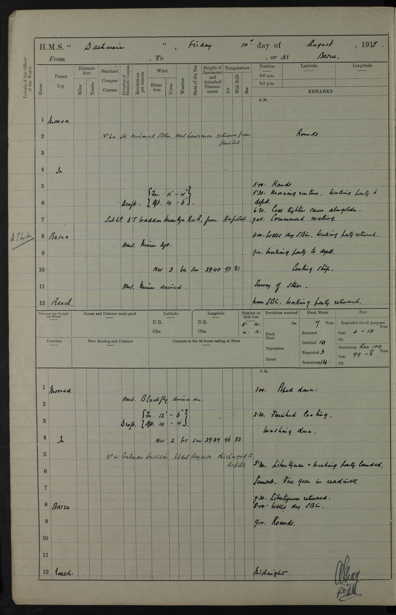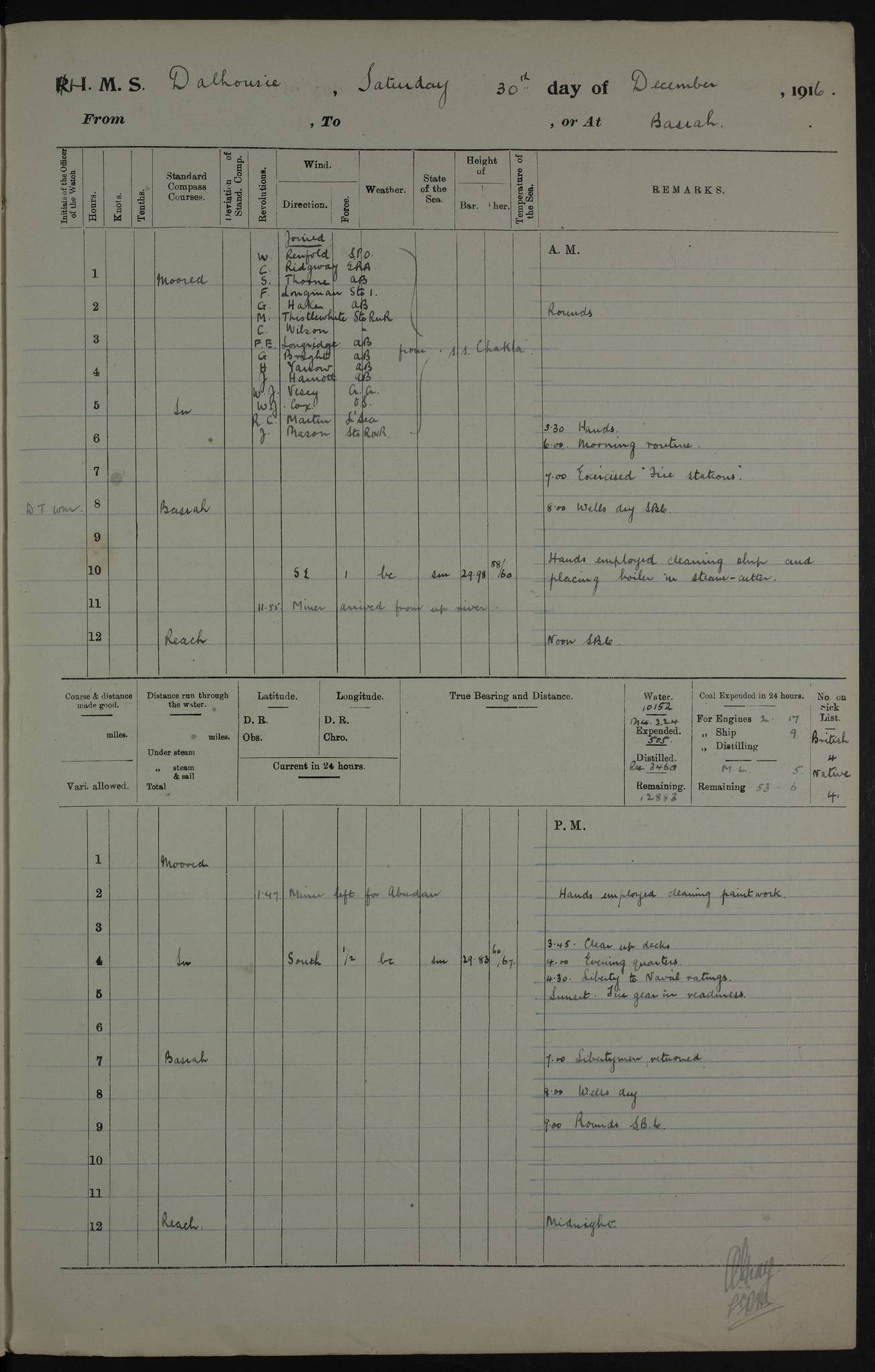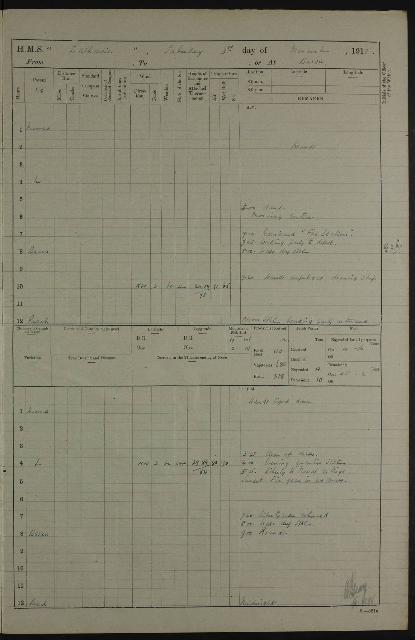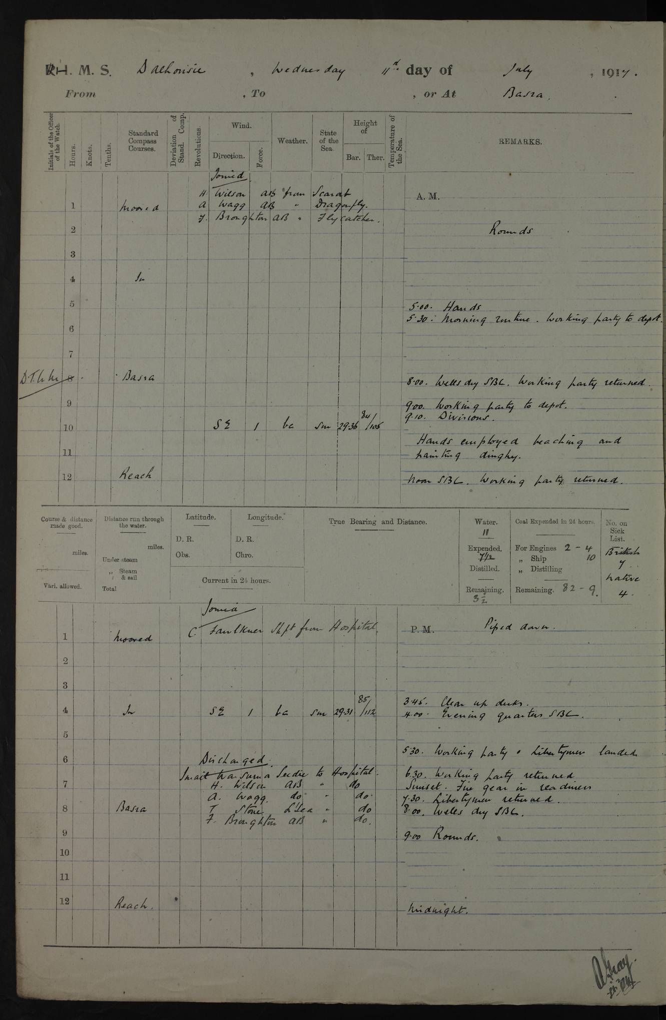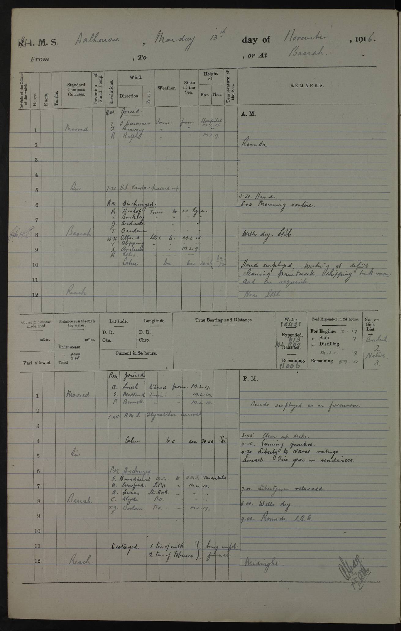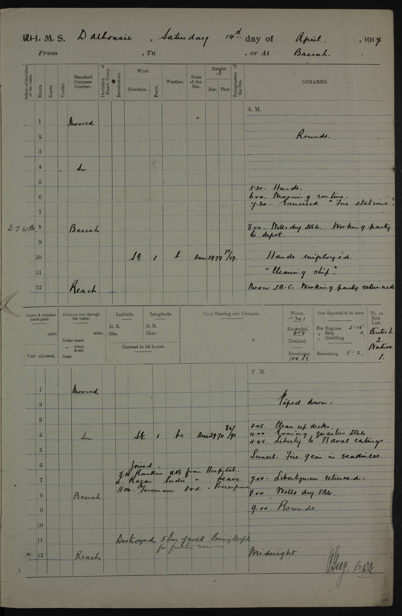 PM - Discharged To Hospital: H Widger, Engine Room Artificer - PW Harrison, Stoker Royal Navy Reserve To Motor Launch 11: J W Whitfield, Stoker 4ef4fa93e53e0a0c910056e2: (https://s3.amazonaws.com:443/oldweather/ADM53-39392/0018_0.jpg) 31 August 1916 Place: Basrah Lat 30.5269, Long 47.8407 2:00am: Rounds 5:05am: Hospital Ship SYRIA passed down 5:30am: Hands 6:00am: Morning Routine 8:00am: Wells dry – Signal Books Correct 9:30am: Divisions - Hands cleaning ship 11:00am: Drew Three Thousand Rupees from the Field treasury 12:00pm: Signal Books Correct – Issued Quinine to ship’s company 12:30pm: Piped Down 3:30pm: 4:00pm: Signal Books Correct 4:30pm: Cleared up decks 5:00pm: Evening Quarters – Leave to Watch of Naval Ratings 7:00pm: Sunset - Fire Gear in readiness 7:30pm: Liberty men returned 8:00pm: Wells dry - Signal Books Correct 9:00pm: Rounds - Signal Books Correct 11:00pm: Destroyed 19 tins Milk being unfit for use. AM – Joined From Motor Launch Depot: M. McMillan, Able Seaman From 5 Mess: T. Jackson, Petty Officer 1st From 4 Mess: T Golden, Stoker – J Tunney, Royal Navy Reserve Trawler Section From 10 Mess: J Donegan Royal Navy Reserve Trawler Section