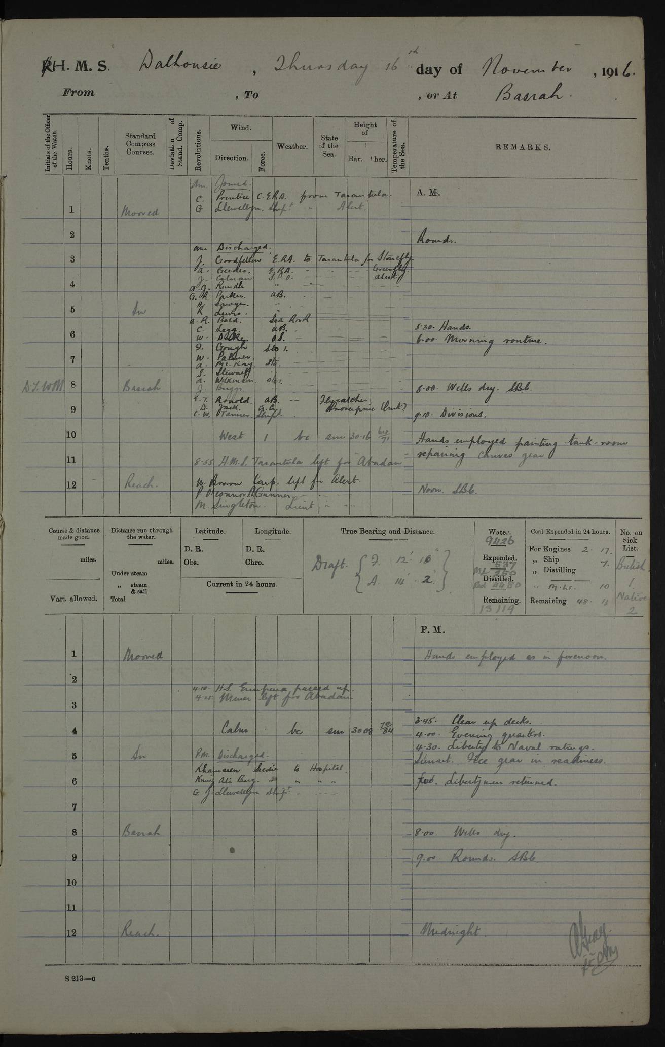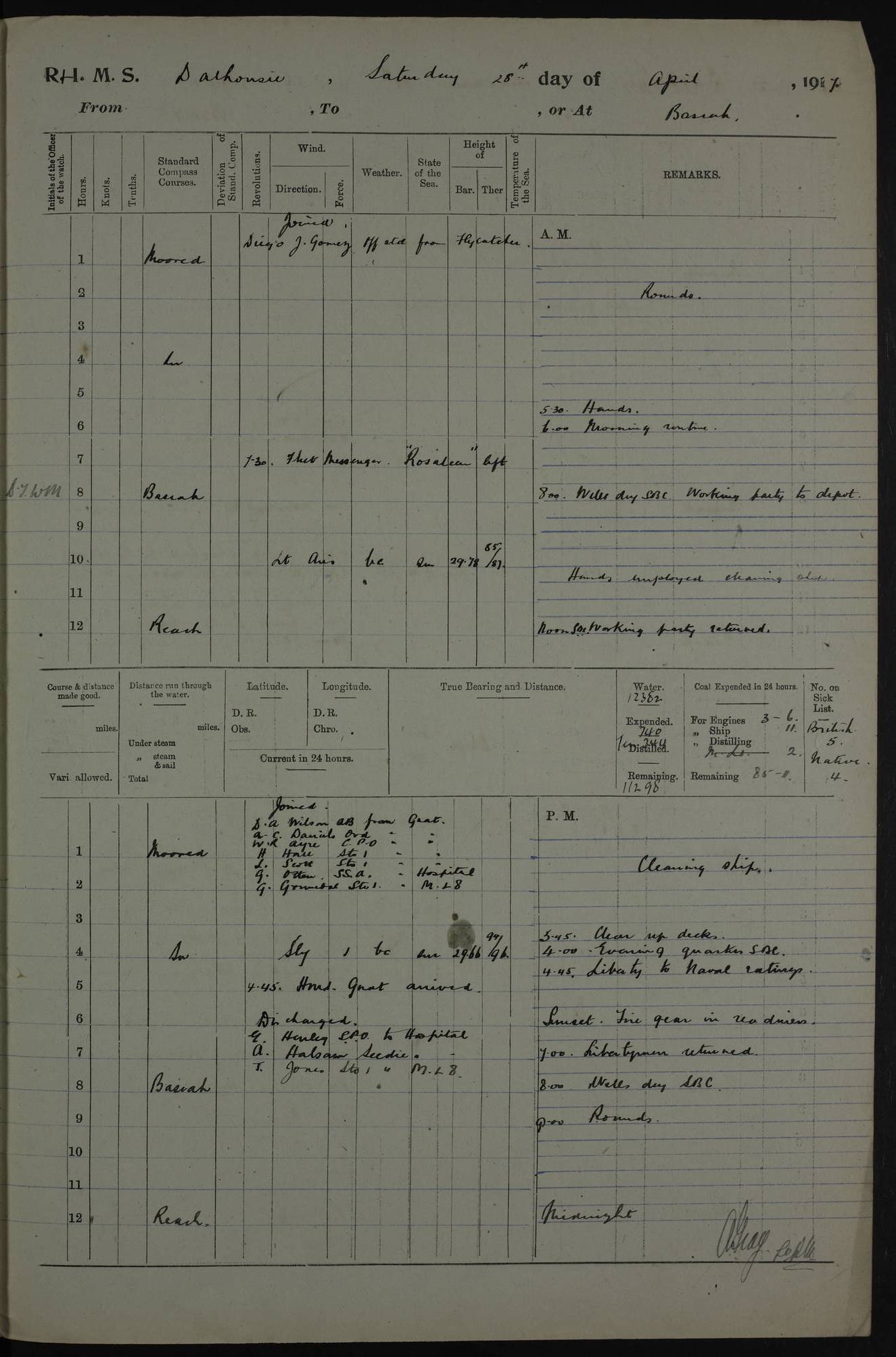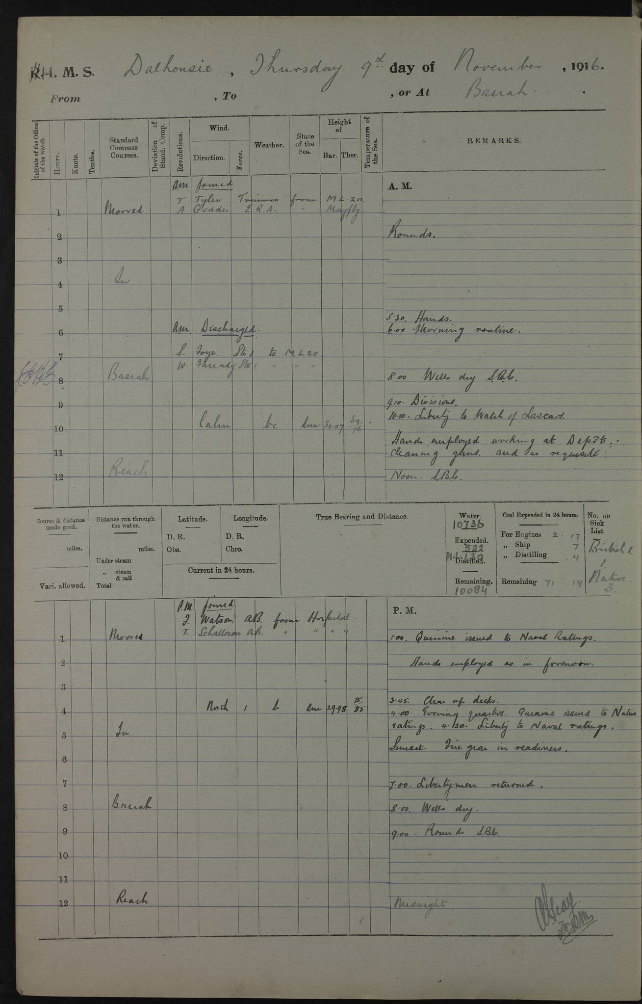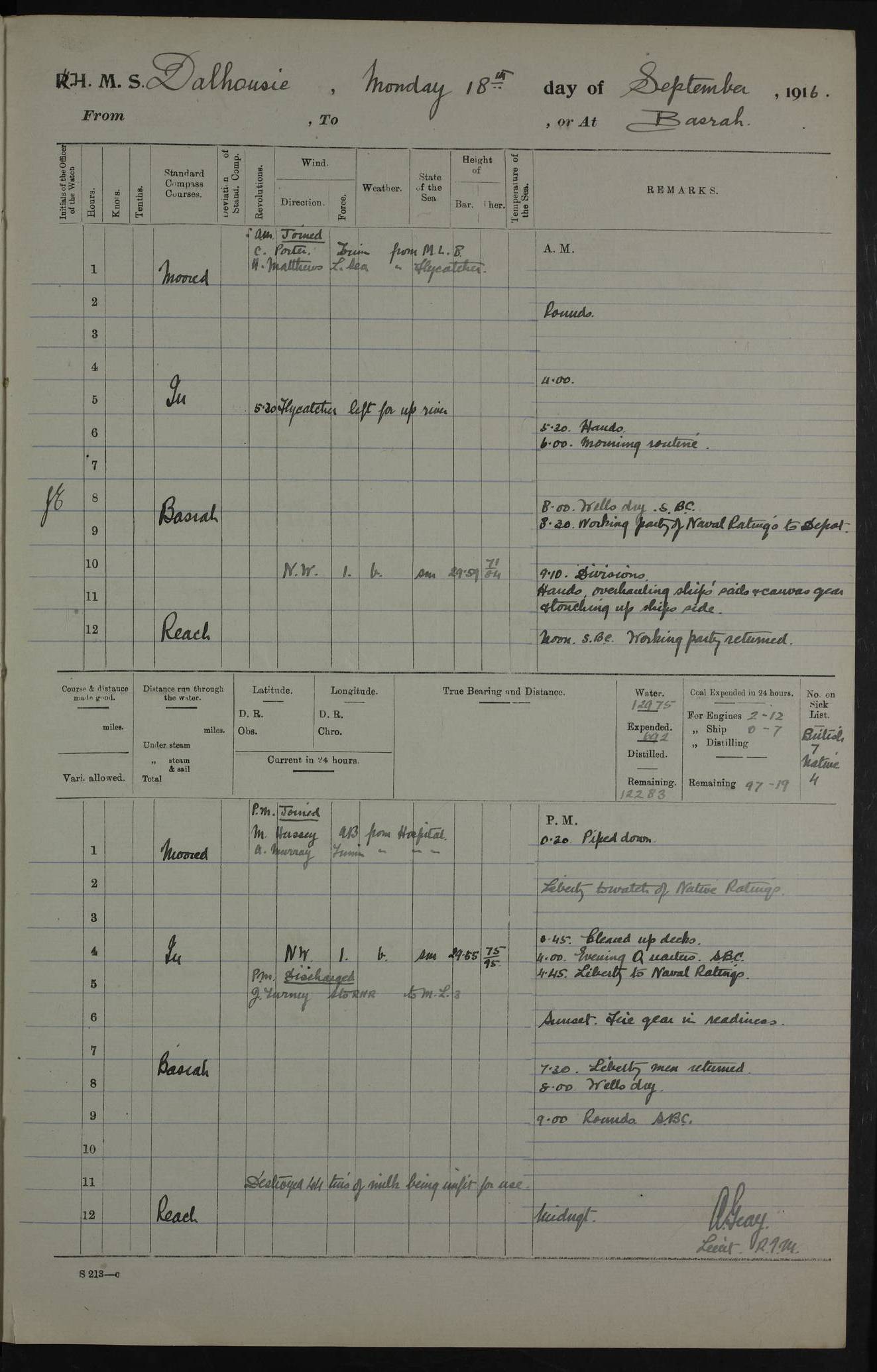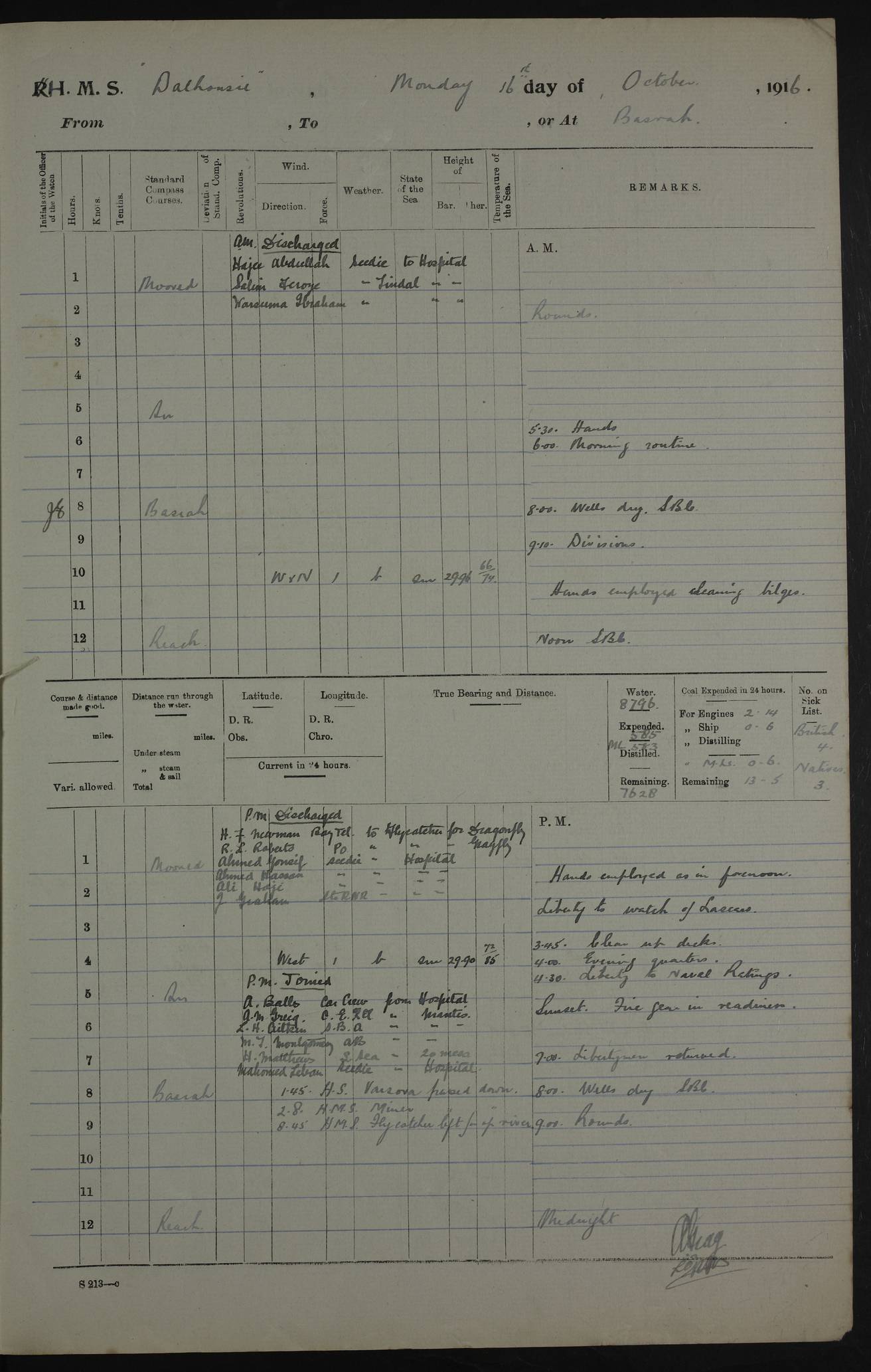PM - Discharged To Hospital: H Widger, Engine Room Artificer - PW Harrison, Stoker Royal Navy Reserve To Motor Launch 11: J W Whitfield, Stoker 4ef4fa93e53e0a0c910056e2: (https://s3.amazonaws.com:443/oldweather/ADM53-39392/0018_0.jpg) 31 August 1916 Place: Basrah Lat 30.5269, Long 47.8407 2:00am: Rounds 5:05am: Hospital Ship SYRIA passed down 5:30am: Hands 6:00am: Morning Routine 8:00am: Wells dry – Signal Books Correct 9:30am: Divisions - Hands cleaning ship 11:00am: Drew Three Thousand Rupees from the Field treasury 12:00pm: Signal Books Correct – Issued Quinine to ship’s company 12:30pm: Piped Down 3:30pm: 4:00pm: Signal Books Correct 4:30pm: Cleared up decks 5:00pm: Evening Quarters – Leave to Watch of Naval Ratings 7:00pm: Sunset - Fire Gear in readiness 7:30pm: Liberty men returned 8:00pm: Wells dry - Signal Books Correct 9:00pm: Rounds - Signal Books Correct 11:00pm: Destroyed 19 tins Milk being unfit for use. AM – Joined From Motor Launch Depot: M. McMillan, Able Seaman From 5 Mess: T. Jackson, Petty Officer 1st From 4 Mess: T Golden, Stoker – J Tunney, Royal Navy Reserve Trawler Section From 10 Mess: J Donegan Royal Navy Reserve Trawler Section