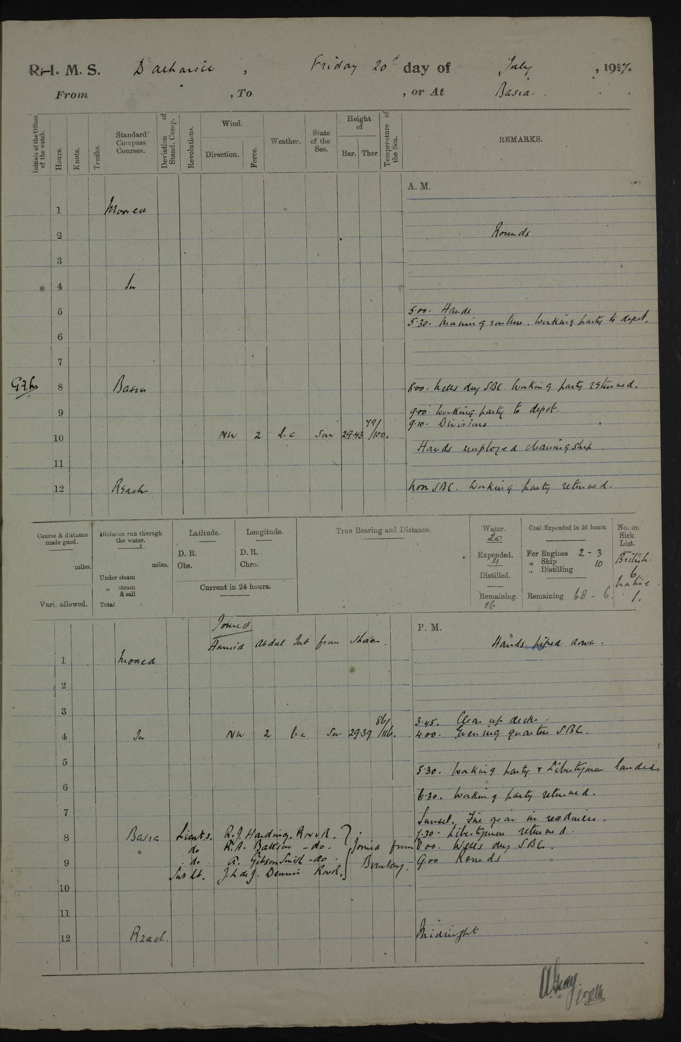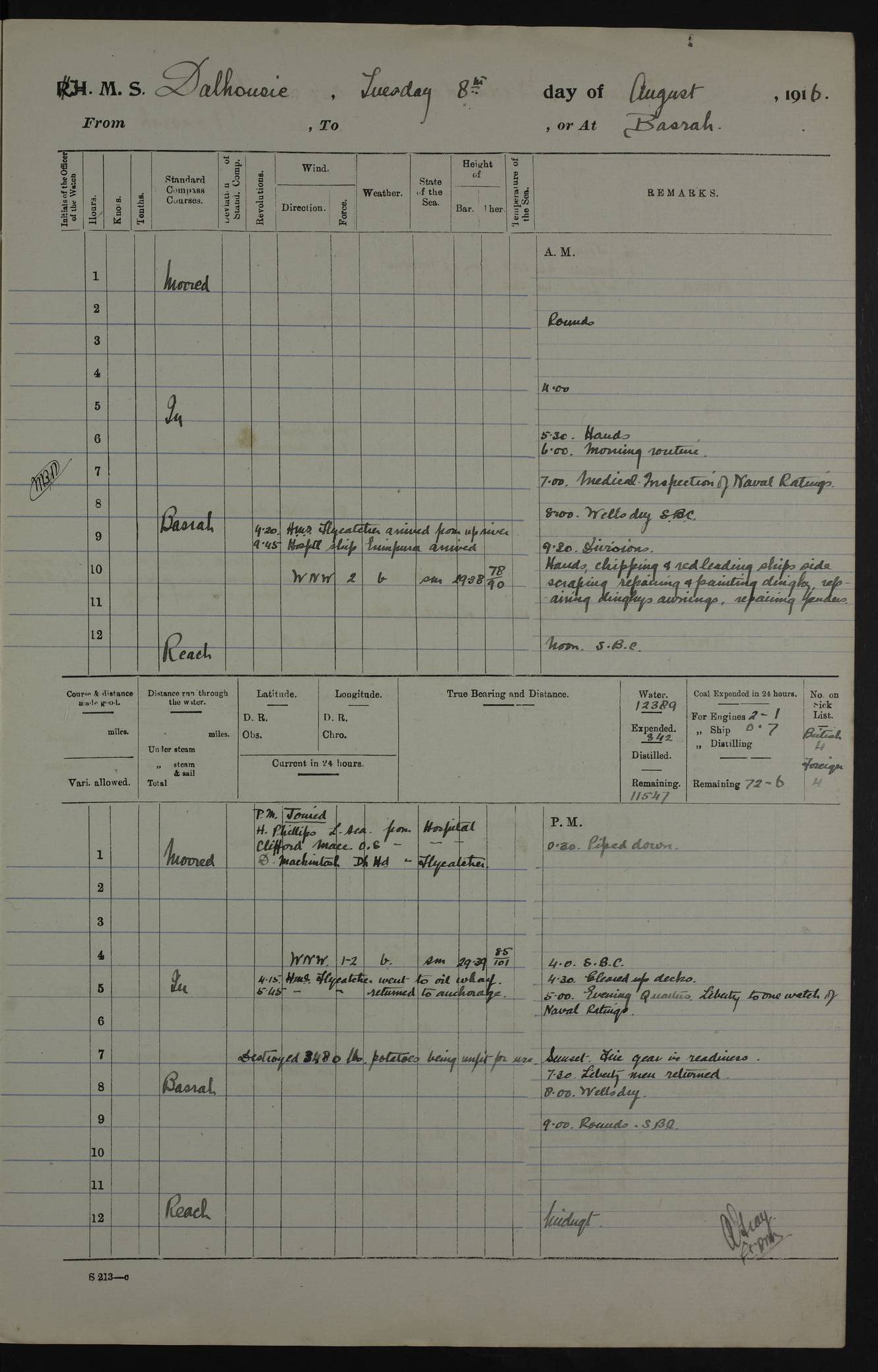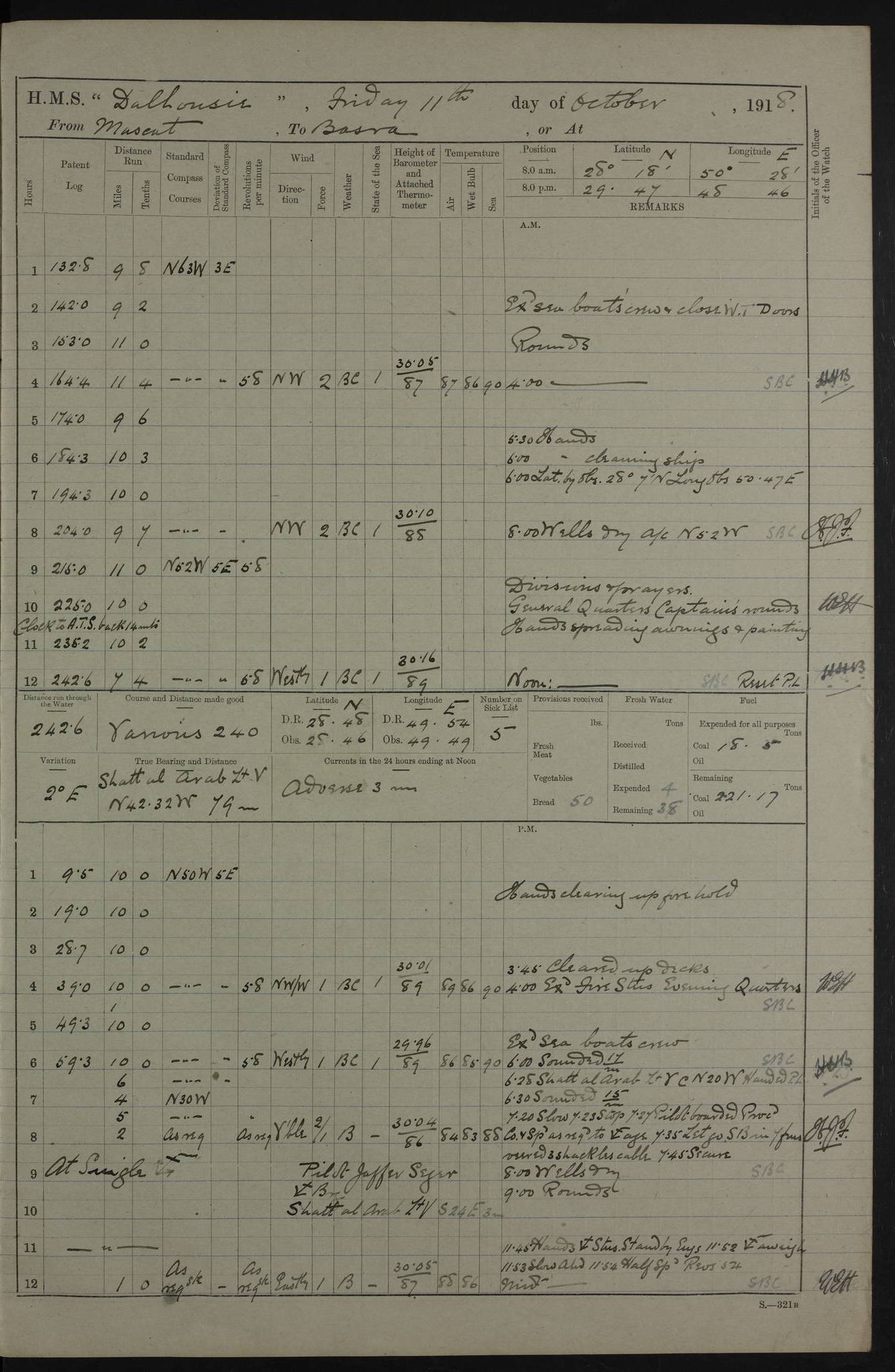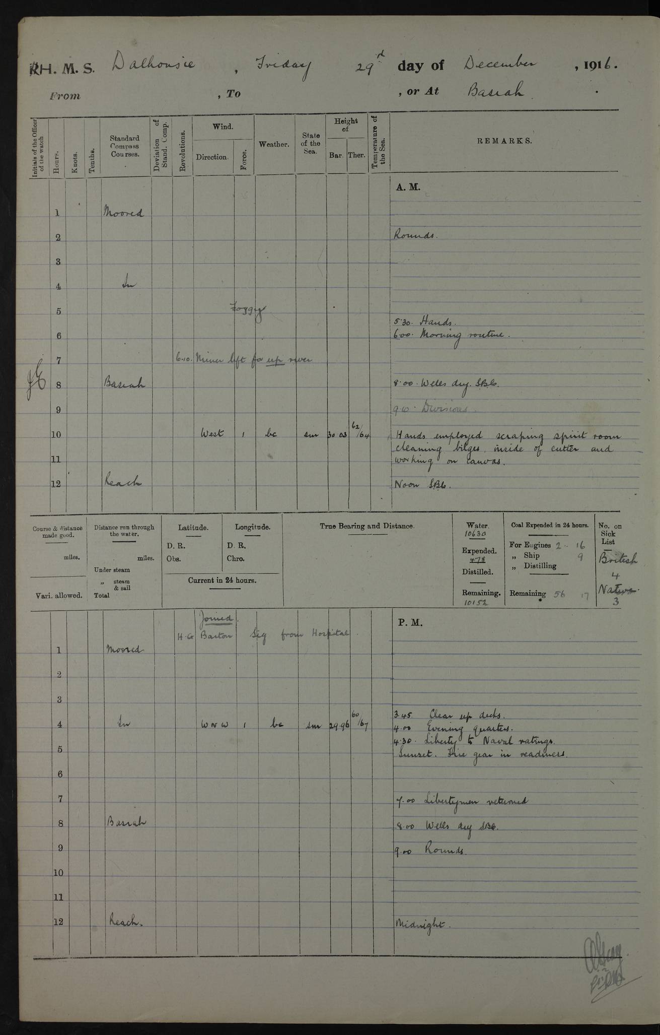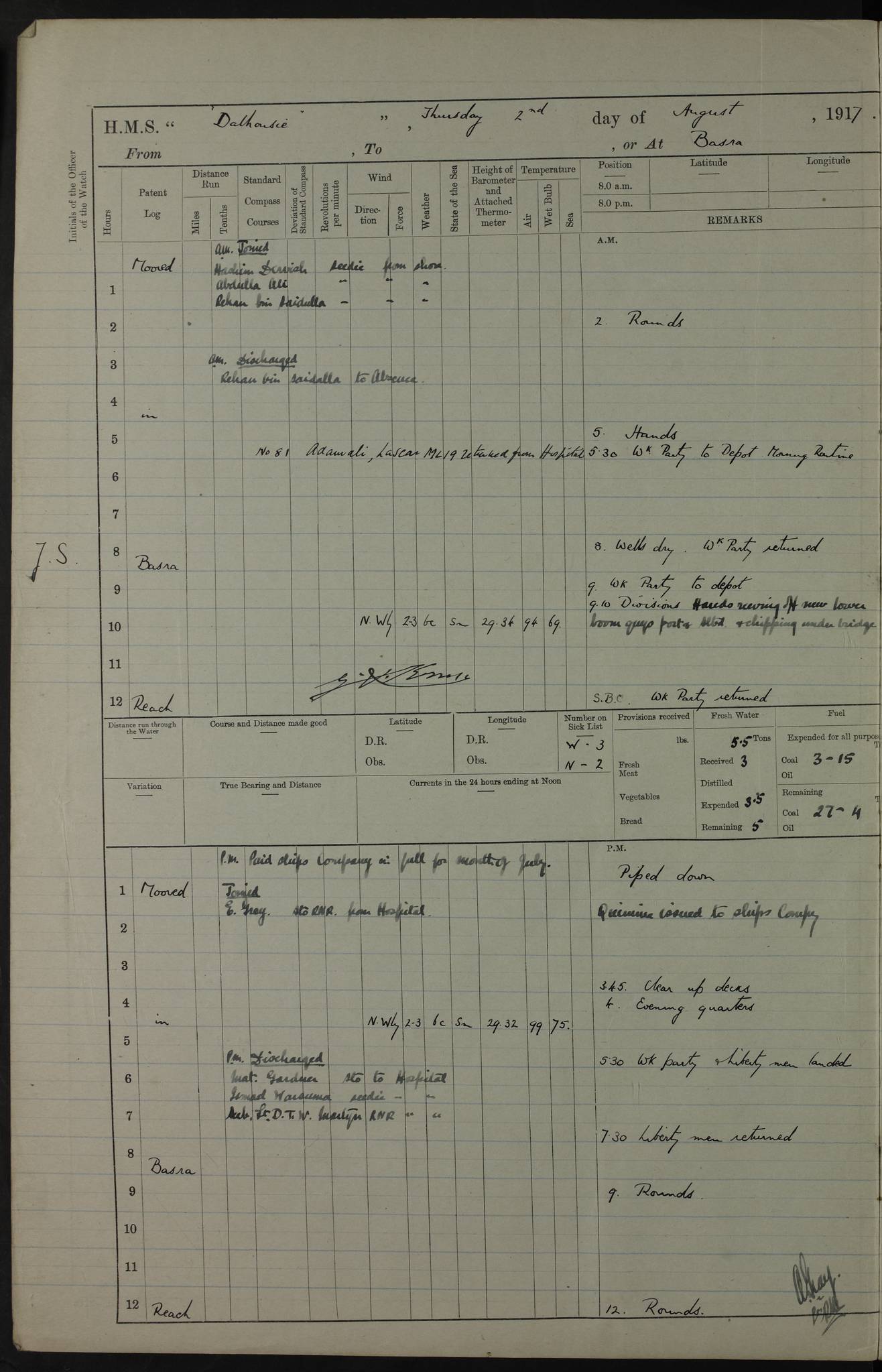 PM - Discharged To Hospital: H Widger, Engine Room Artificer - PW Harrison, Stoker Royal Navy Reserve To Motor Launch 11: J W Whitfield, Stoker 4ef4fa93e53e0a0c910056e2: (https://s3.amazonaws.com:443/oldweather/ADM53-39392/0018_0.jpg) 31 August 1916 Place: Basrah Lat 30.5269, Long 47.8407 2:00am: Rounds 5:05am: Hospital Ship SYRIA passed down 5:30am: Hands 6:00am: Morning Routine 8:00am: Wells dry – Signal Books Correct 9:30am: Divisions - Hands cleaning ship 11:00am: Drew Three Thousand Rupees from the Field treasury 12:00pm: Signal Books Correct – Issued Quinine to ship’s company 12:30pm: Piped Down 3:30pm: 4:00pm: Signal Books Correct 4:30pm: Cleared up decks 5:00pm: Evening Quarters – Leave to Watch of Naval Ratings 7:00pm: Sunset - Fire Gear in readiness 7:30pm: Liberty men returned 8:00pm: Wells dry - Signal Books Correct 9:00pm: Rounds - Signal Books Correct 11:00pm: Destroyed 19 tins Milk being unfit for use. AM – Joined From Motor Launch Depot: M. McMillan, Able Seaman From 5 Mess: T. Jackson, Petty Officer 1st From 4 Mess: T Golden, Stoker – J Tunney, Royal Navy Reserve Trawler Section From 10 Mess: J Donegan Royal Navy Reserve Trawler Section