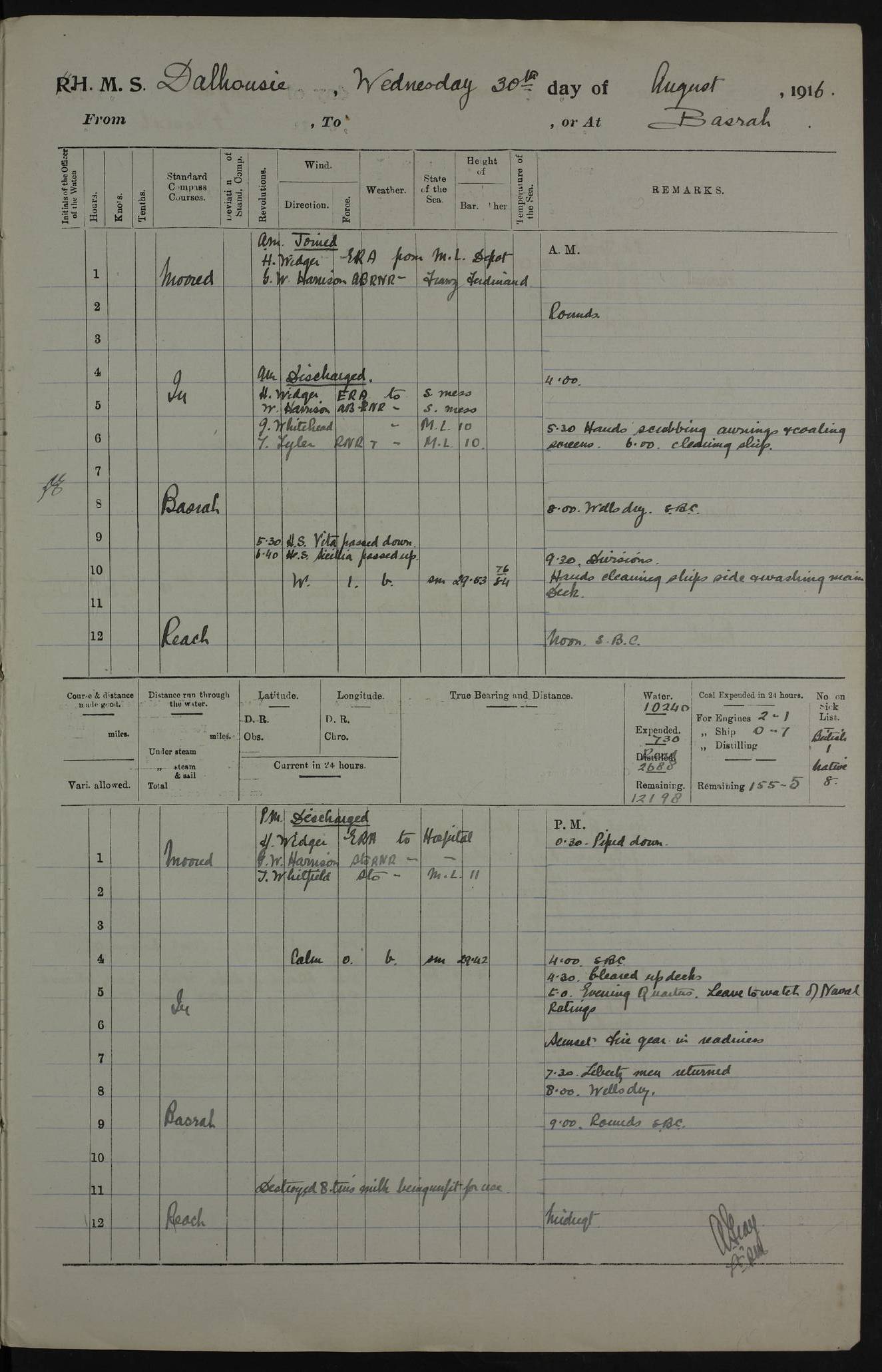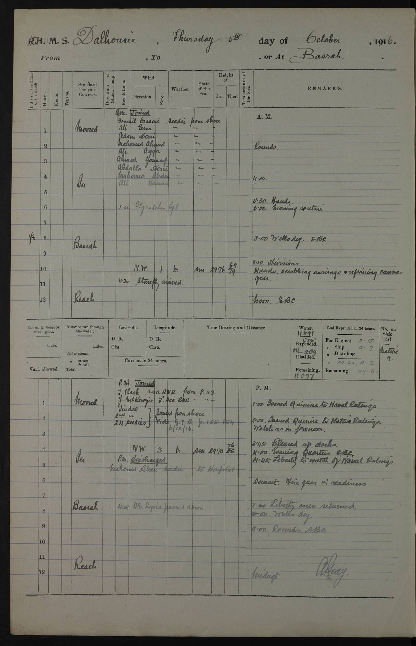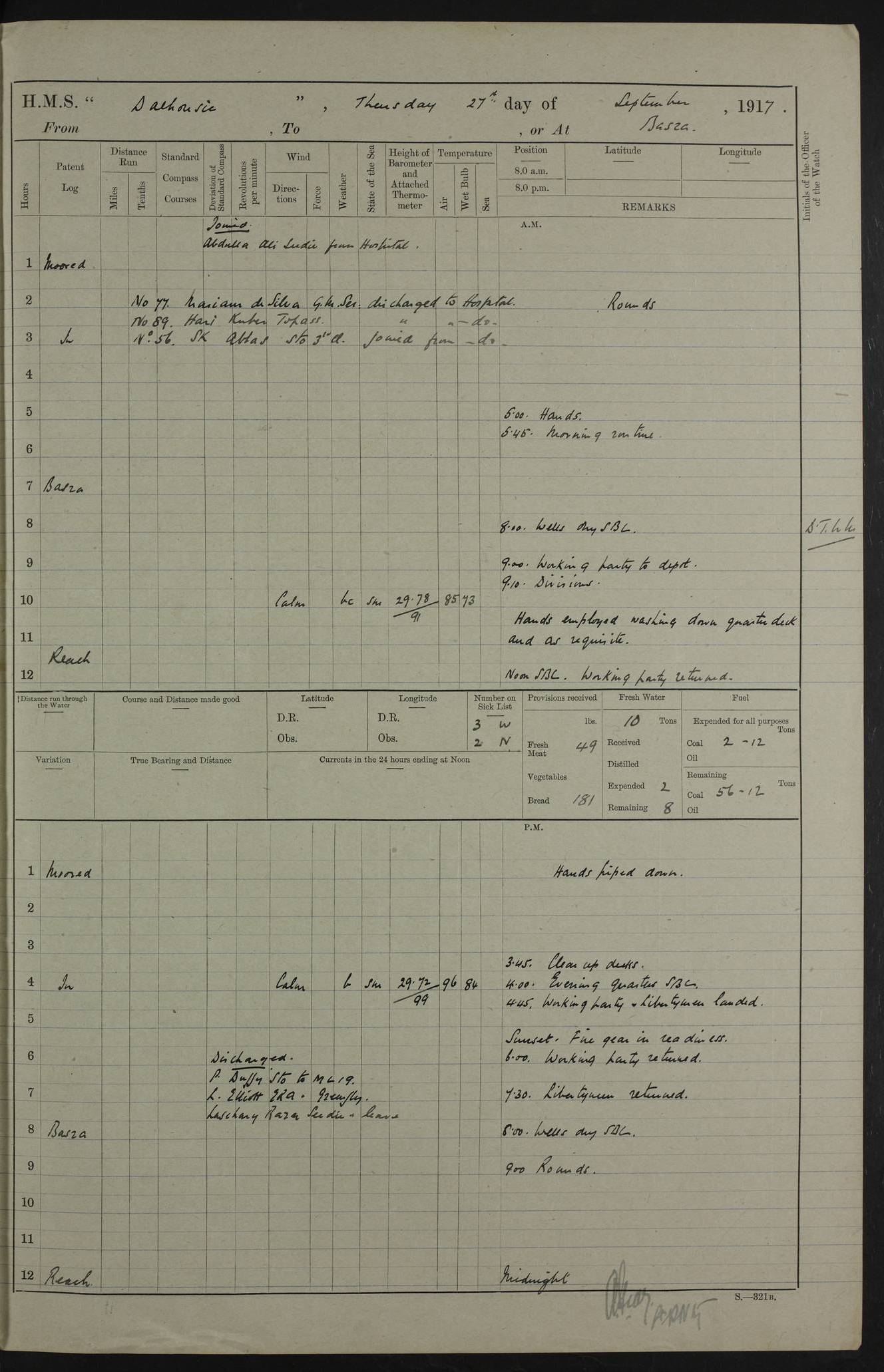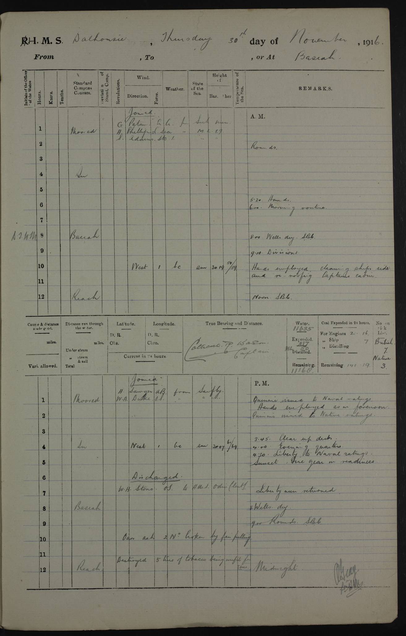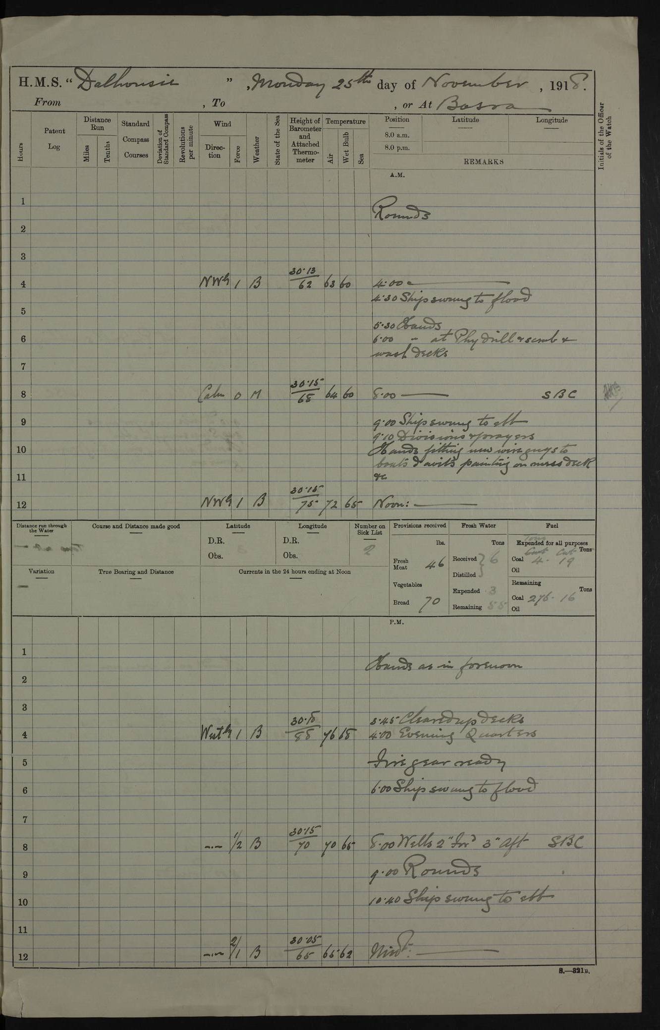 PM - Discharged To Hospital: H Widger, Engine Room Artificer - PW Harrison, Stoker Royal Navy Reserve To Motor Launch 11: J W Whitfield, Stoker 4ef4fa93e53e0a0c910056e2: (https://s3.amazonaws.com:443/oldweather/ADM53-39392/0018_0.jpg) 31 August 1916 Place: Basrah Lat 30.5269, Long 47.8407 2:00am: Rounds 5:05am: Hospital Ship SYRIA passed down 5:30am: Hands 6:00am: Morning Routine 8:00am: Wells dry – Signal Books Correct 9:30am: Divisions - Hands cleaning ship 11:00am: Drew Three Thousand Rupees from the Field treasury 12:00pm: Signal Books Correct – Issued Quinine to ship’s company 12:30pm: Piped Down 3:30pm: 4:00pm: Signal Books Correct 4:30pm: Cleared up decks 5:00pm: Evening Quarters – Leave to Watch of Naval Ratings 7:00pm: Sunset - Fire Gear in readiness 7:30pm: Liberty men returned 8:00pm: Wells dry - Signal Books Correct 9:00pm: Rounds - Signal Books Correct 11:00pm: Destroyed 19 tins Milk being unfit for use. AM – Joined From Motor Launch Depot: M. McMillan, Able Seaman From 5 Mess: T. Jackson, Petty Officer 1st From 4 Mess: T Golden, Stoker – J Tunney, Royal Navy Reserve Trawler Section From 10 Mess: J Donegan Royal Navy Reserve Trawler Section