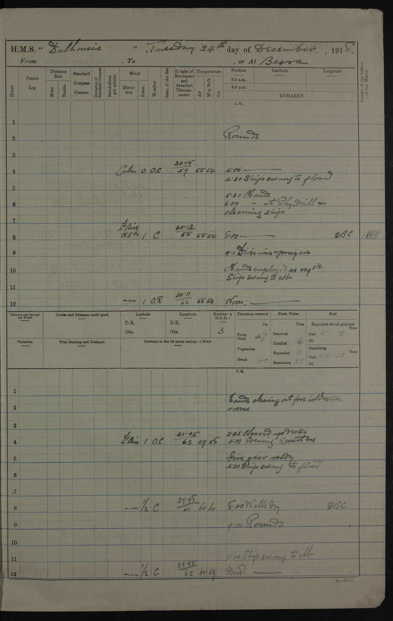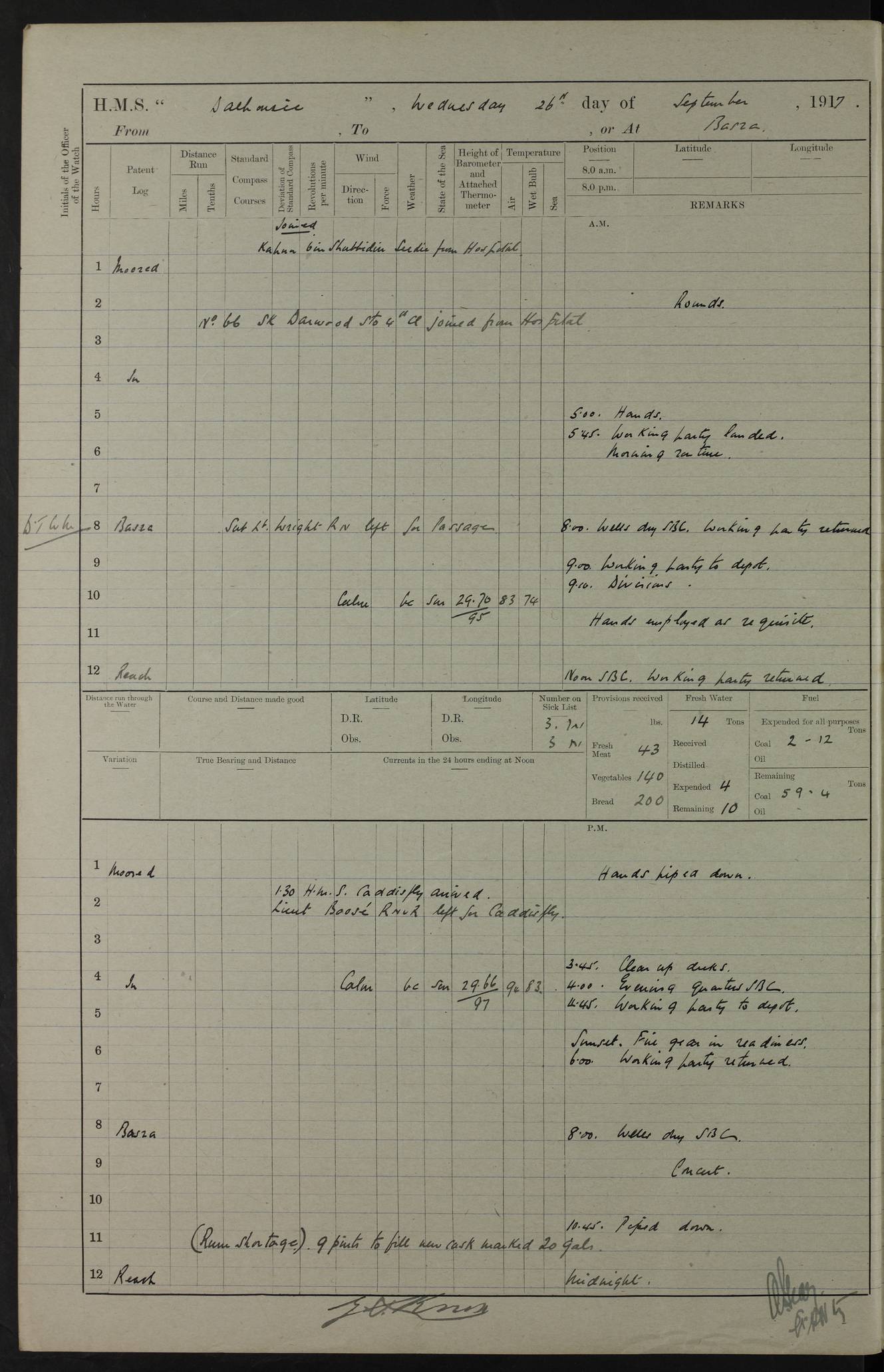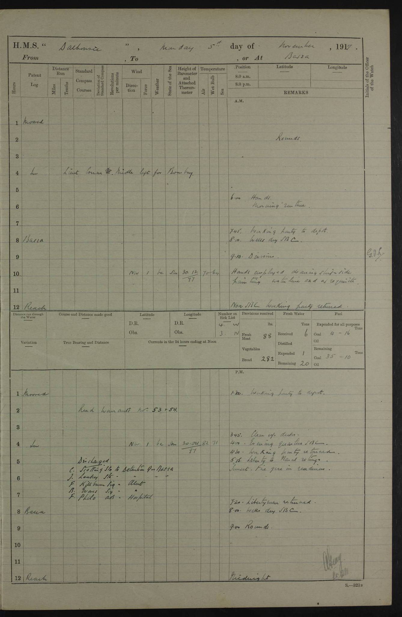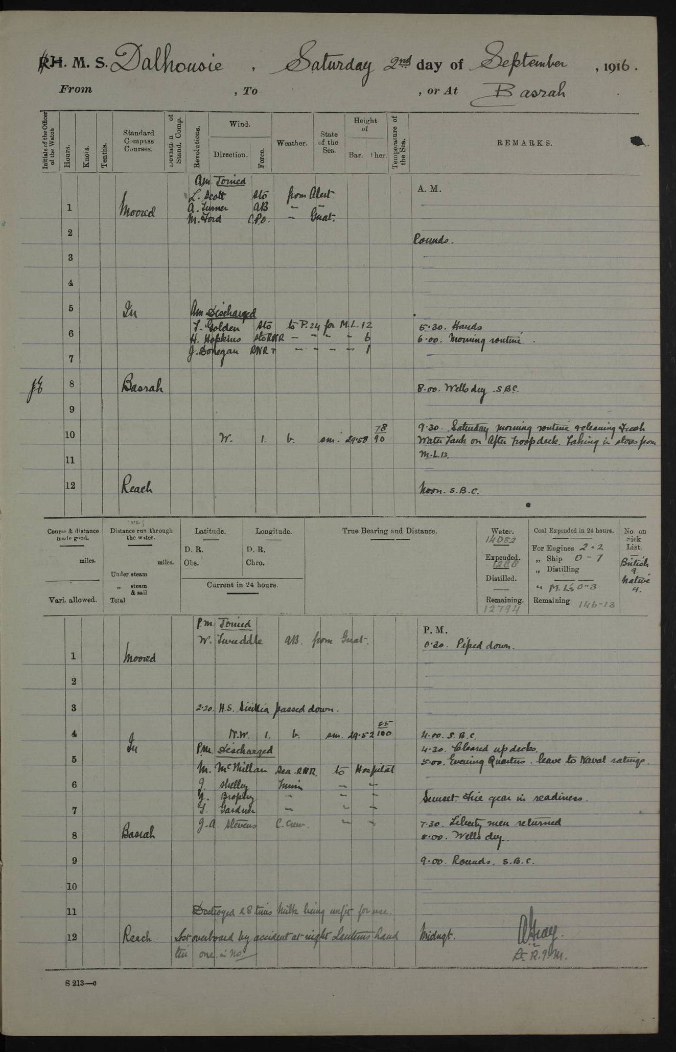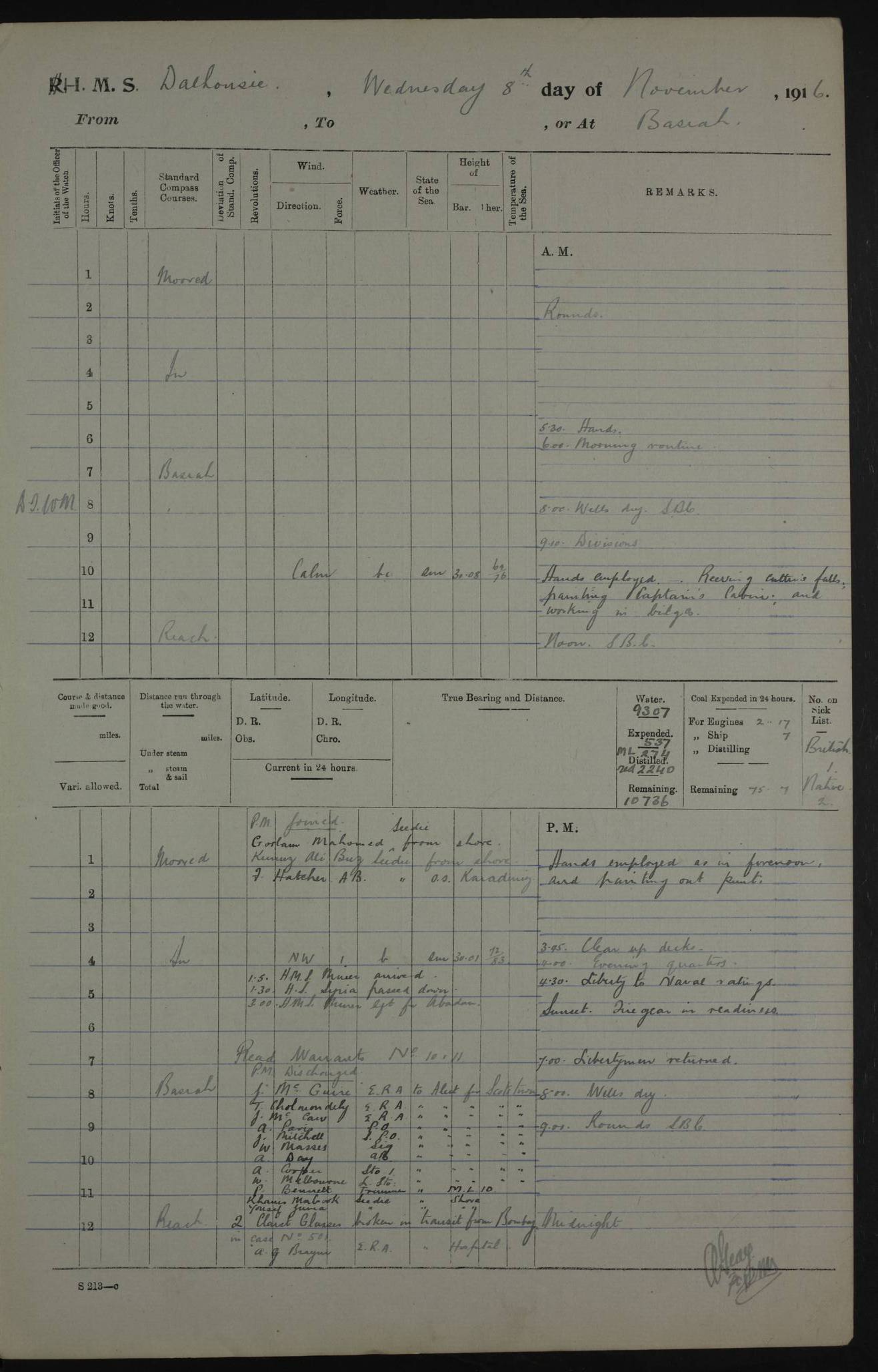 PM - Discharged To Hospital: H Widger, Engine Room Artificer - PW Harrison, Stoker Royal Navy Reserve To Motor Launch 11: J W Whitfield, Stoker 4ef4fa93e53e0a0c910056e2: (https://s3.amazonaws.com:443/oldweather/ADM53-39392/0018_0.jpg) 31 August 1916 Place: Basrah Lat 30.5269, Long 47.8407 2:00am: Rounds 5:05am: Hospital Ship SYRIA passed down 5:30am: Hands 6:00am: Morning Routine 8:00am: Wells dry – Signal Books Correct 9:30am: Divisions - Hands cleaning ship 11:00am: Drew Three Thousand Rupees from the Field treasury 12:00pm: Signal Books Correct – Issued Quinine to ship’s company 12:30pm: Piped Down 3:30pm: 4:00pm: Signal Books Correct 4:30pm: Cleared up decks 5:00pm: Evening Quarters – Leave to Watch of Naval Ratings 7:00pm: Sunset - Fire Gear in readiness 7:30pm: Liberty men returned 8:00pm: Wells dry - Signal Books Correct 9:00pm: Rounds - Signal Books Correct 11:00pm: Destroyed 19 tins Milk being unfit for use. AM – Joined From Motor Launch Depot: M. McMillan, Able Seaman From 5 Mess: T. Jackson, Petty Officer 1st From 4 Mess: T Golden, Stoker – J Tunney, Royal Navy Reserve Trawler Section From 10 Mess: J Donegan Royal Navy Reserve Trawler Section