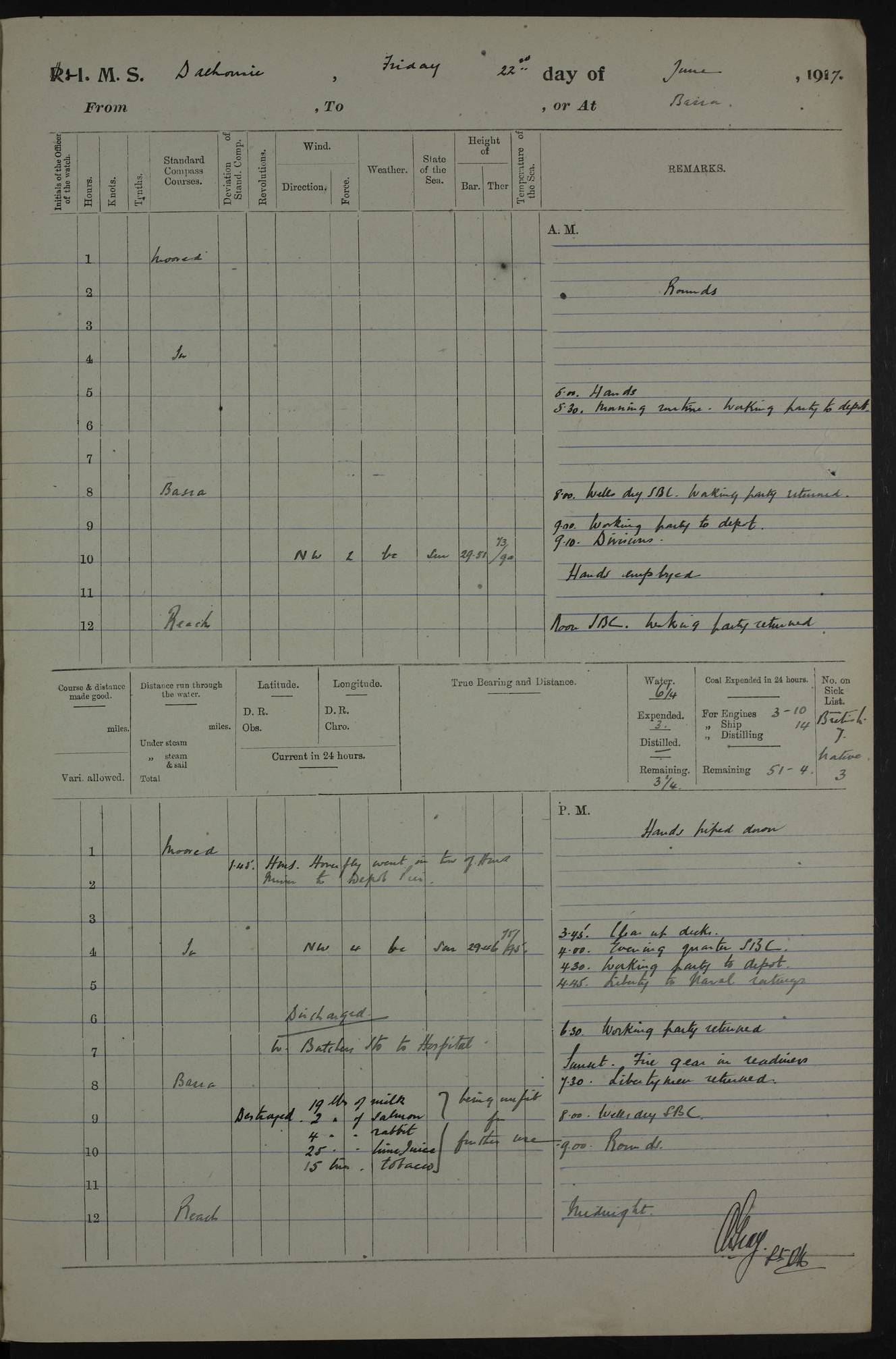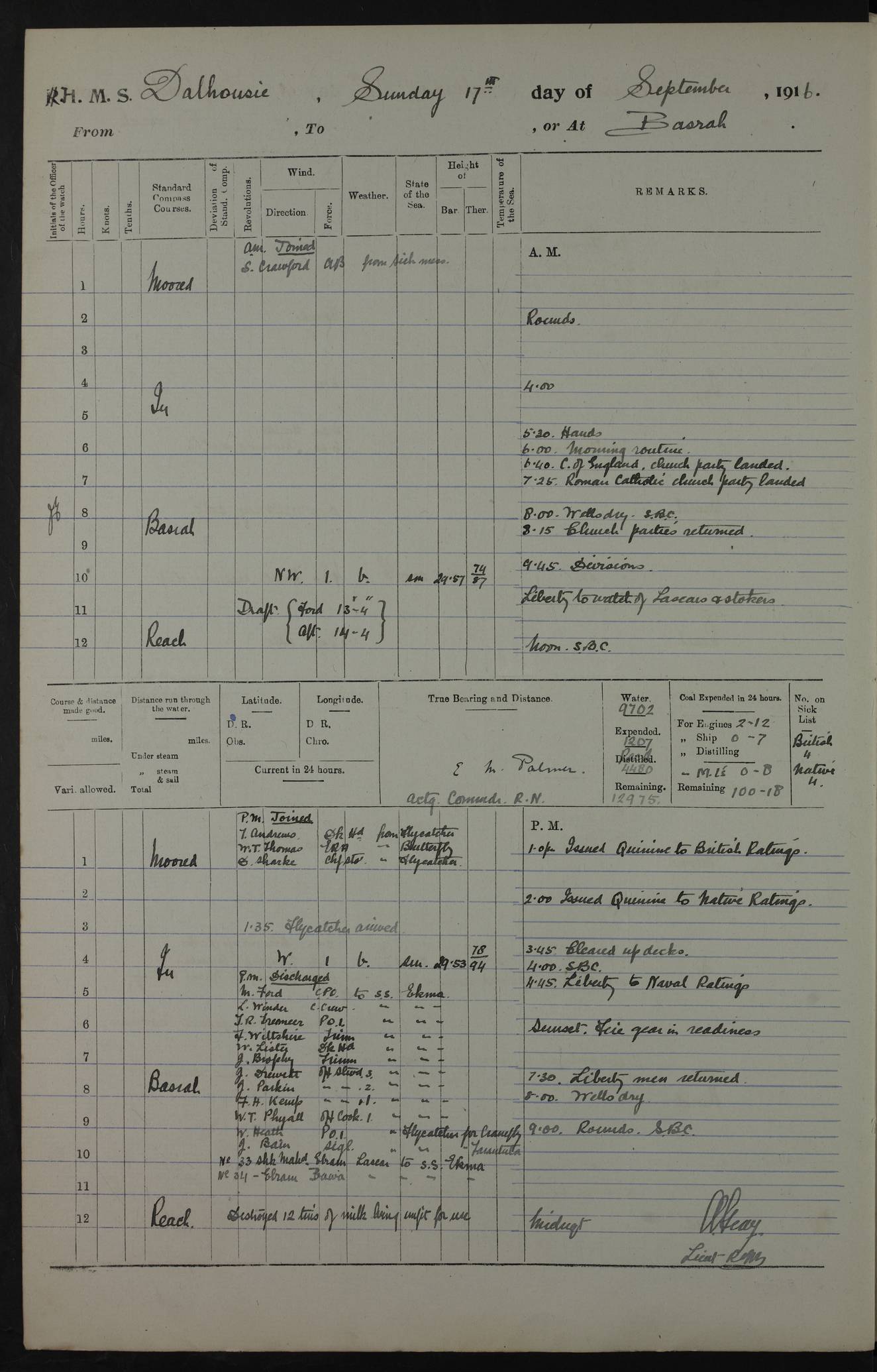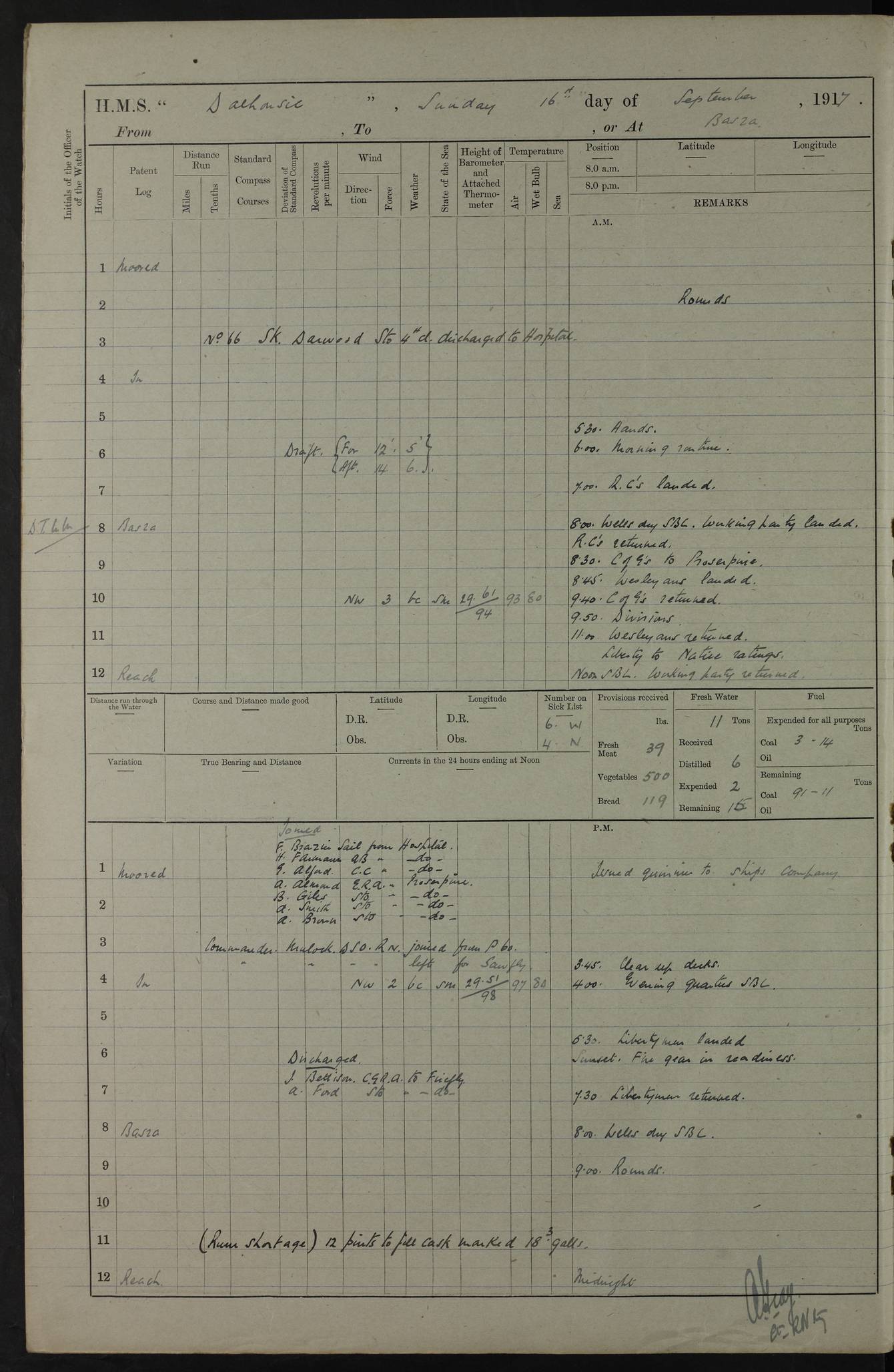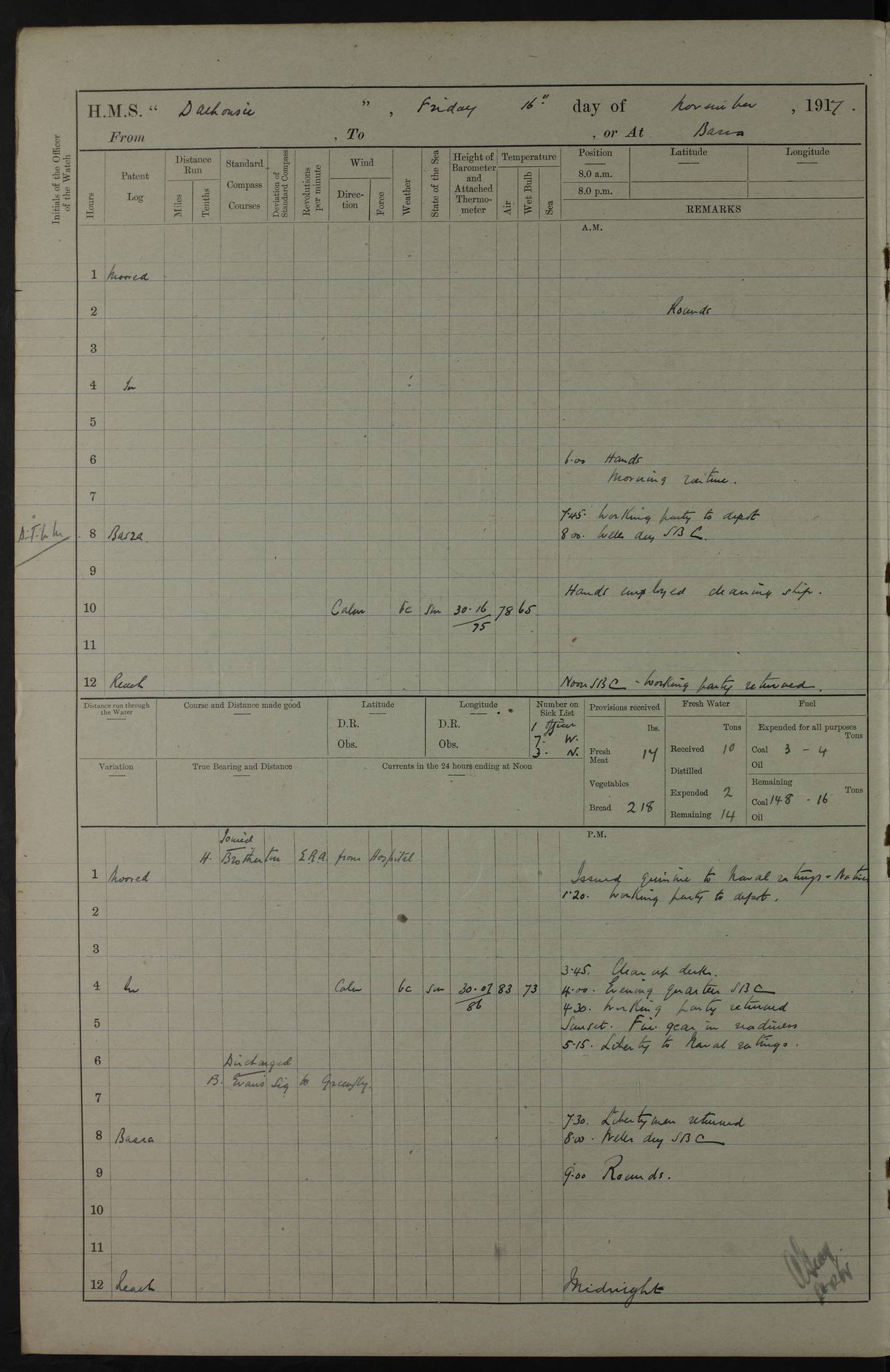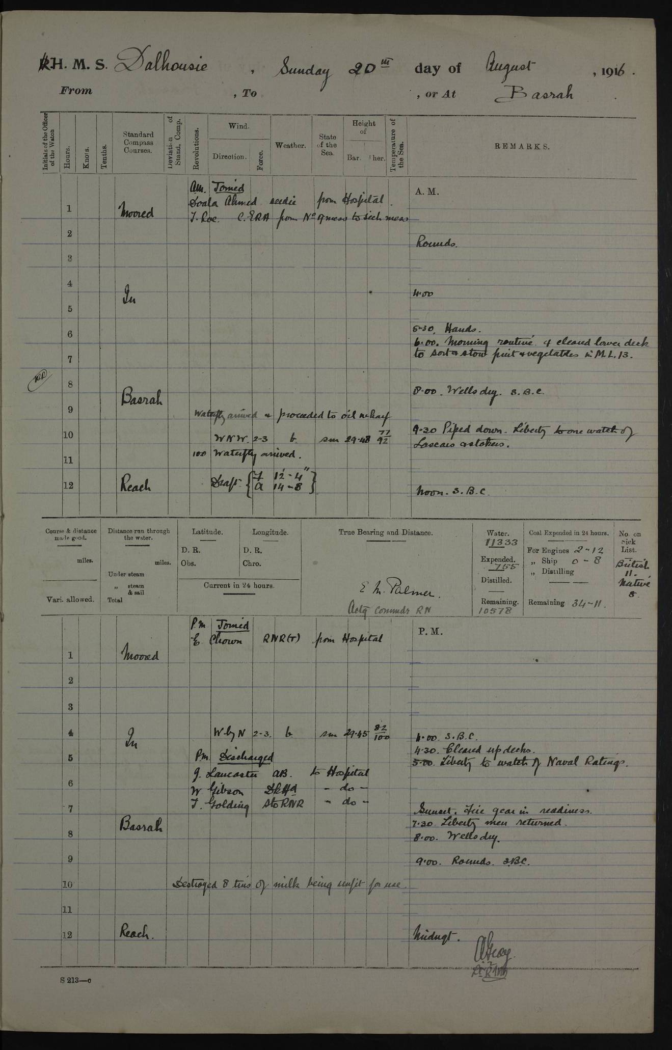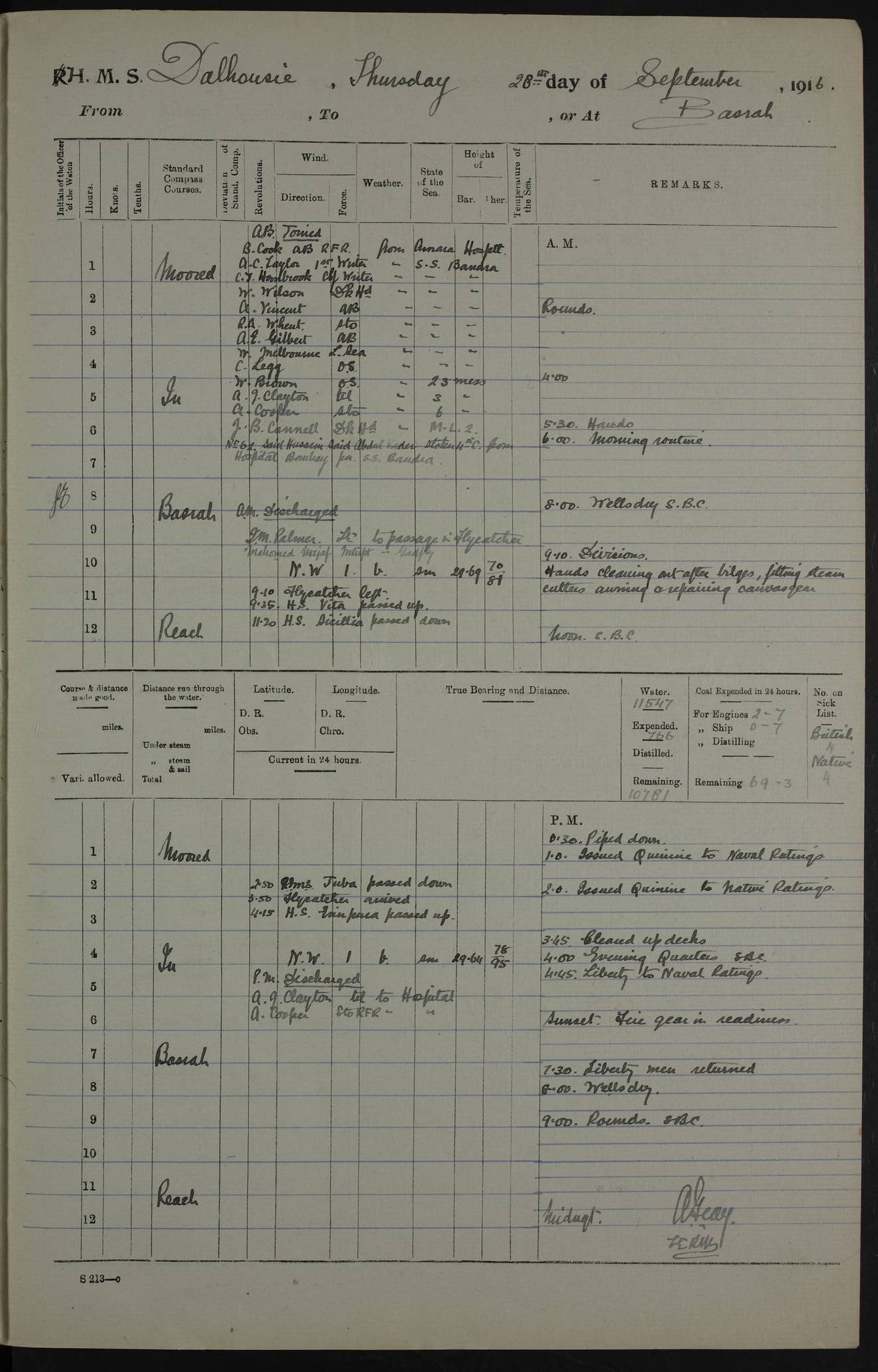 PM - Discharged To Hospital: H Widger, Engine Room Artificer - PW Harrison, Stoker Royal Navy Reserve To Motor Launch 11: J W Whitfield, Stoker 4ef4fa93e53e0a0c910056e2: (https://s3.amazonaws.com:443/oldweather/ADM53-39392/0018_0.jpg) 31 August 1916 Place: Basrah Lat 30.5269, Long 47.8407 2:00am: Rounds 5:05am: Hospital Ship SYRIA passed down 5:30am: Hands 6:00am: Morning Routine 8:00am: Wells dry – Signal Books Correct 9:30am: Divisions - Hands cleaning ship 11:00am: Drew Three Thousand Rupees from the Field treasury 12:00pm: Signal Books Correct – Issued Quinine to ship’s company 12:30pm: Piped Down 3:30pm: 4:00pm: Signal Books Correct 4:30pm: Cleared up decks 5:00pm: Evening Quarters – Leave to Watch of Naval Ratings 7:00pm: Sunset - Fire Gear in readiness 7:30pm: Liberty men returned 8:00pm: Wells dry - Signal Books Correct 9:00pm: Rounds - Signal Books Correct 11:00pm: Destroyed 19 tins Milk being unfit for use. AM – Joined From Motor Launch Depot: M. McMillan, Able Seaman From 5 Mess: T. Jackson, Petty Officer 1st From 4 Mess: T Golden, Stoker – J Tunney, Royal Navy Reserve Trawler Section From 10 Mess: J Donegan Royal Navy Reserve Trawler Section