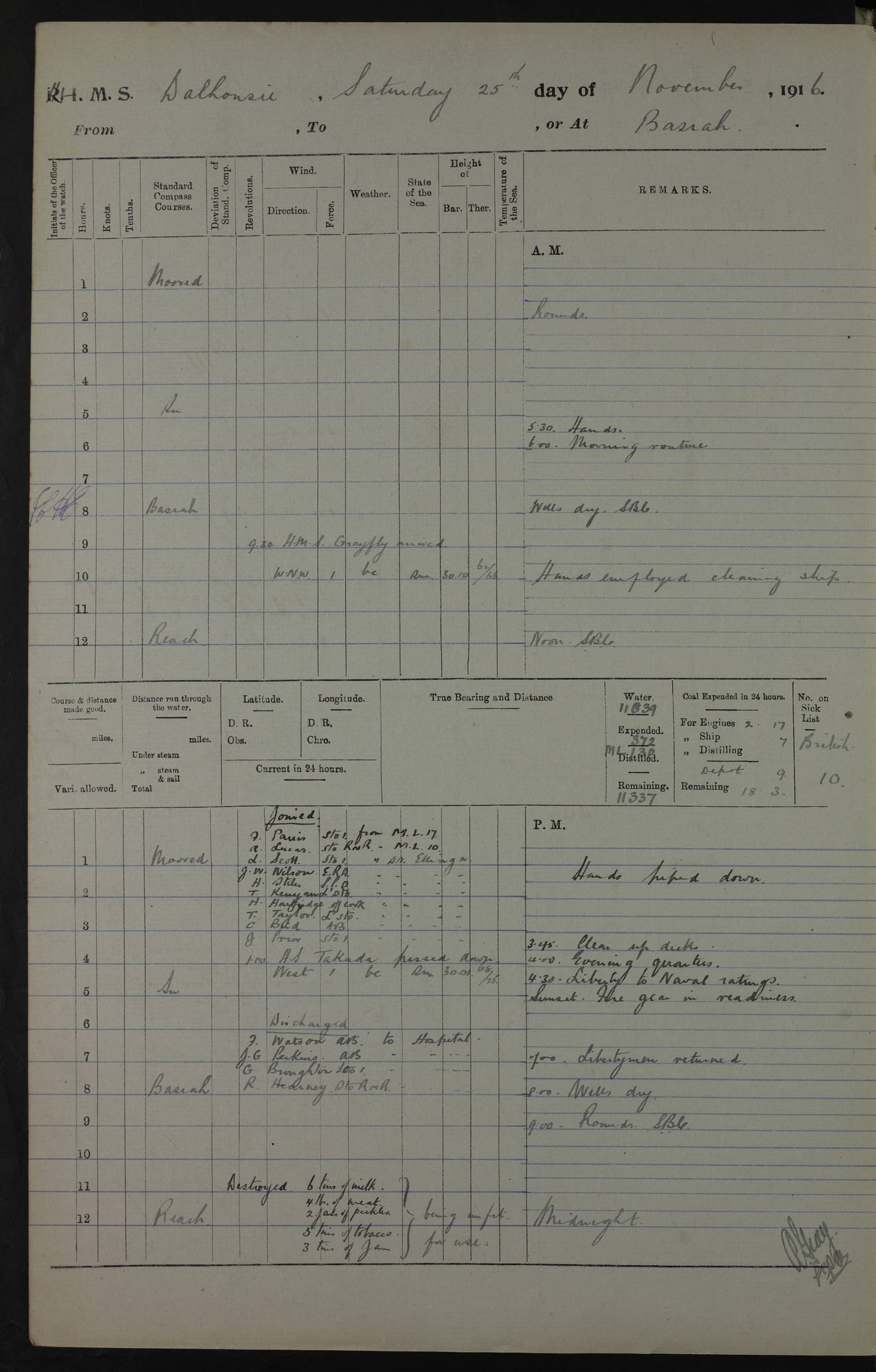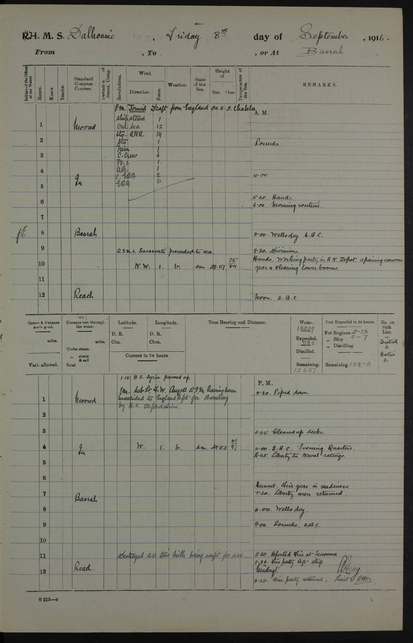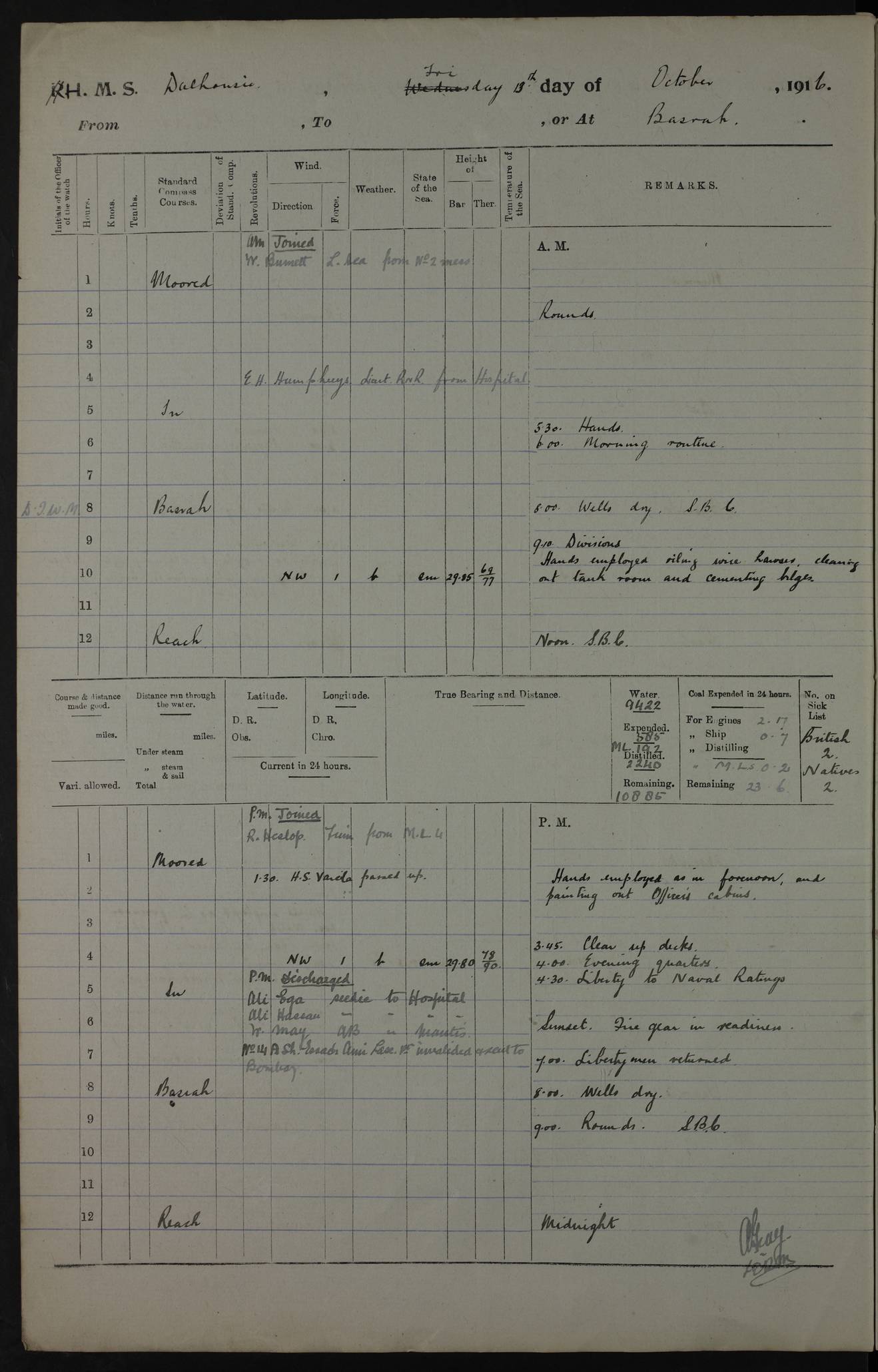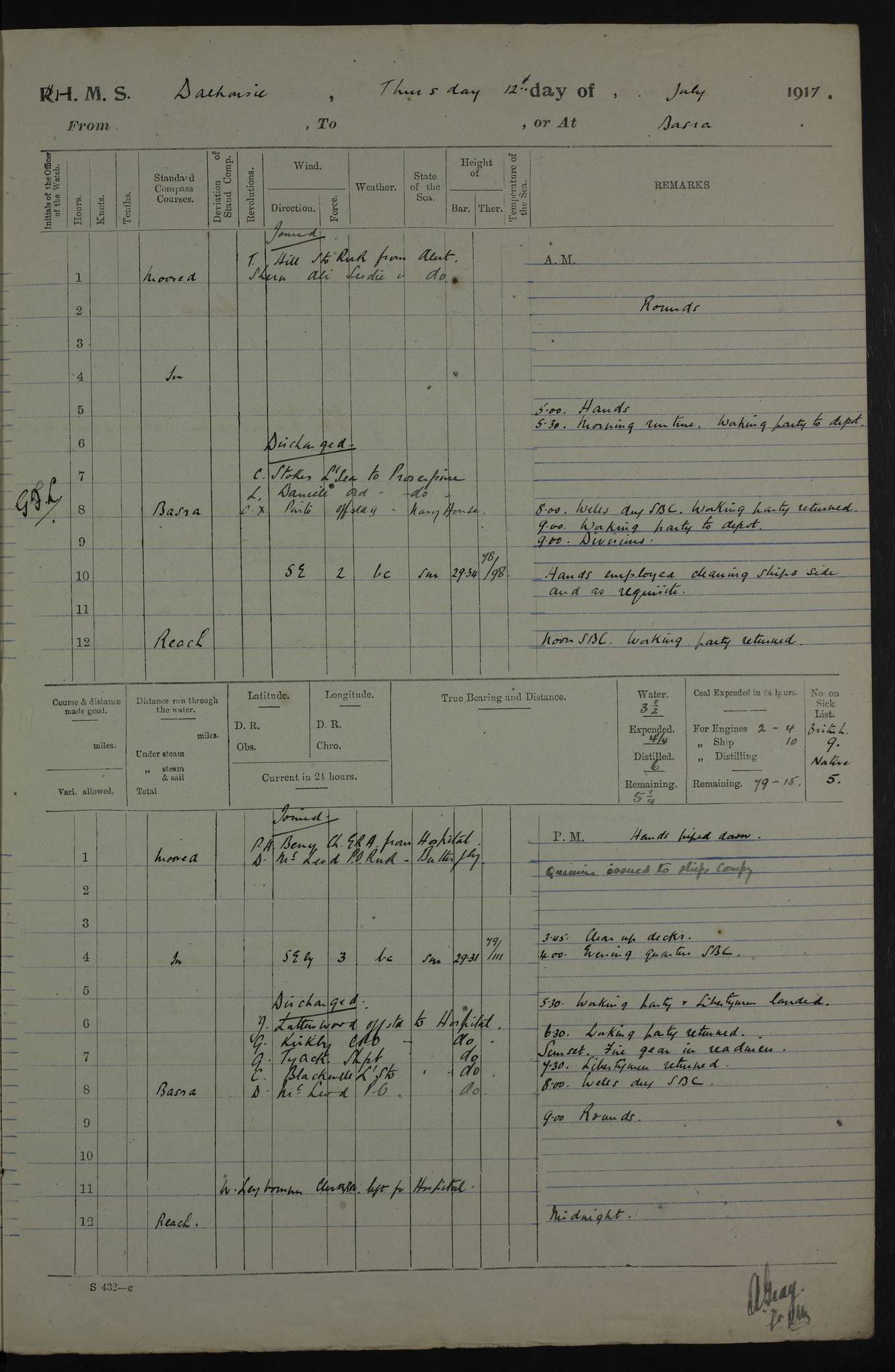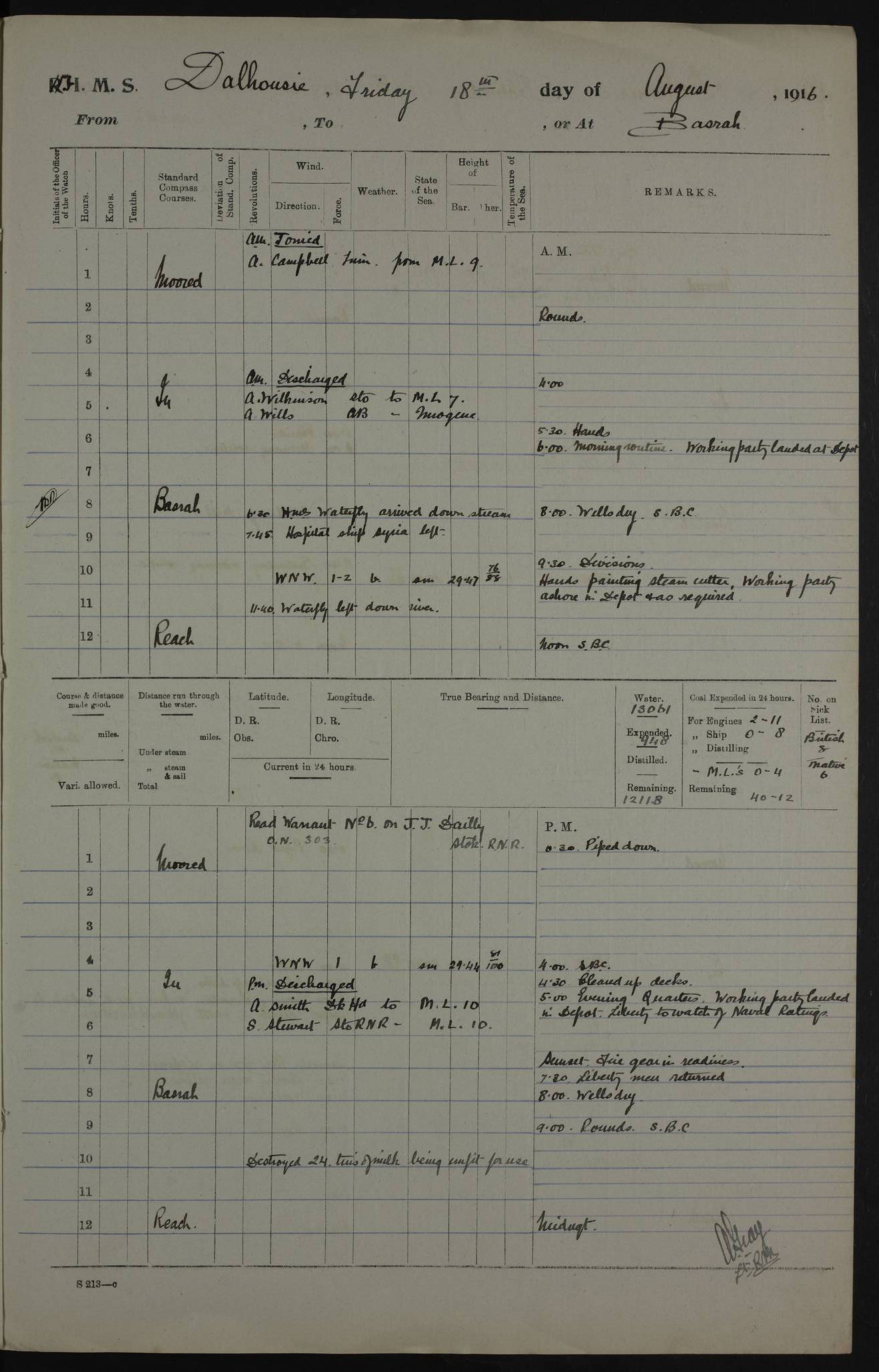 PM - Discharged To Hospital: H Widger, Engine Room Artificer - PW Harrison, Stoker Royal Navy Reserve To Motor Launch 11: J W Whitfield, Stoker 4ef4fa93e53e0a0c910056e2: (https://s3.amazonaws.com:443/oldweather/ADM53-39392/0018_0.jpg) 31 August 1916 Place: Basrah Lat 30.5269, Long 47.8407 2:00am: Rounds 5:05am: Hospital Ship SYRIA passed down 5:30am: Hands 6:00am: Morning Routine 8:00am: Wells dry – Signal Books Correct 9:30am: Divisions - Hands cleaning ship 11:00am: Drew Three Thousand Rupees from the Field treasury 12:00pm: Signal Books Correct – Issued Quinine to ship’s company 12:30pm: Piped Down 3:30pm: 4:00pm: Signal Books Correct 4:30pm: Cleared up decks 5:00pm: Evening Quarters – Leave to Watch of Naval Ratings 7:00pm: Sunset - Fire Gear in readiness 7:30pm: Liberty men returned 8:00pm: Wells dry - Signal Books Correct 9:00pm: Rounds - Signal Books Correct 11:00pm: Destroyed 19 tins Milk being unfit for use. AM – Joined From Motor Launch Depot: M. McMillan, Able Seaman From 5 Mess: T. Jackson, Petty Officer 1st From 4 Mess: T Golden, Stoker – J Tunney, Royal Navy Reserve Trawler Section From 10 Mess: J Donegan Royal Navy Reserve Trawler Section