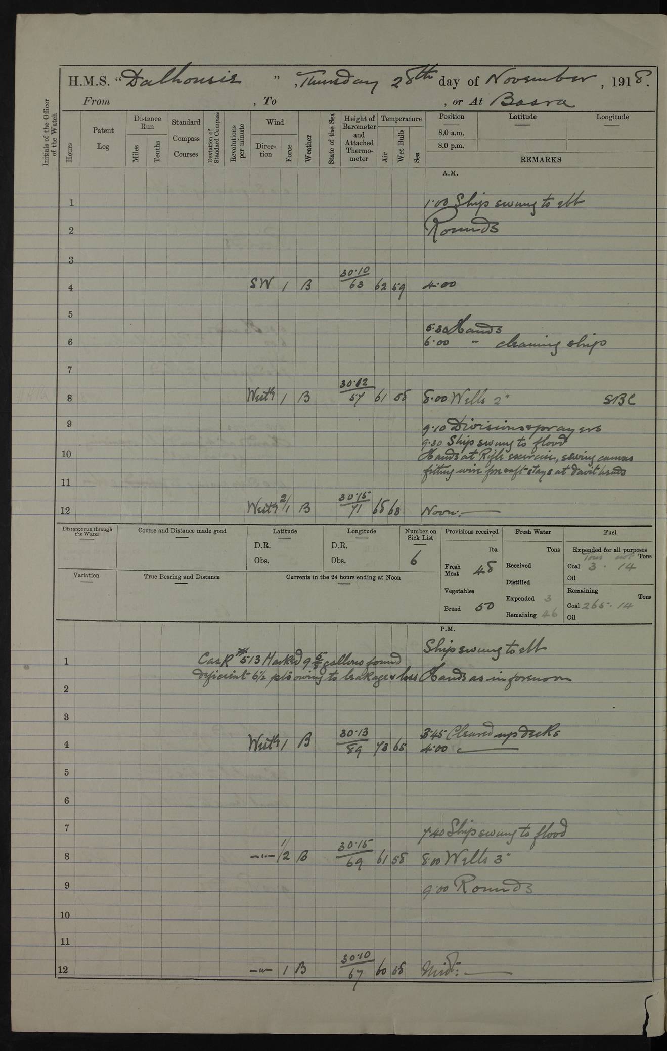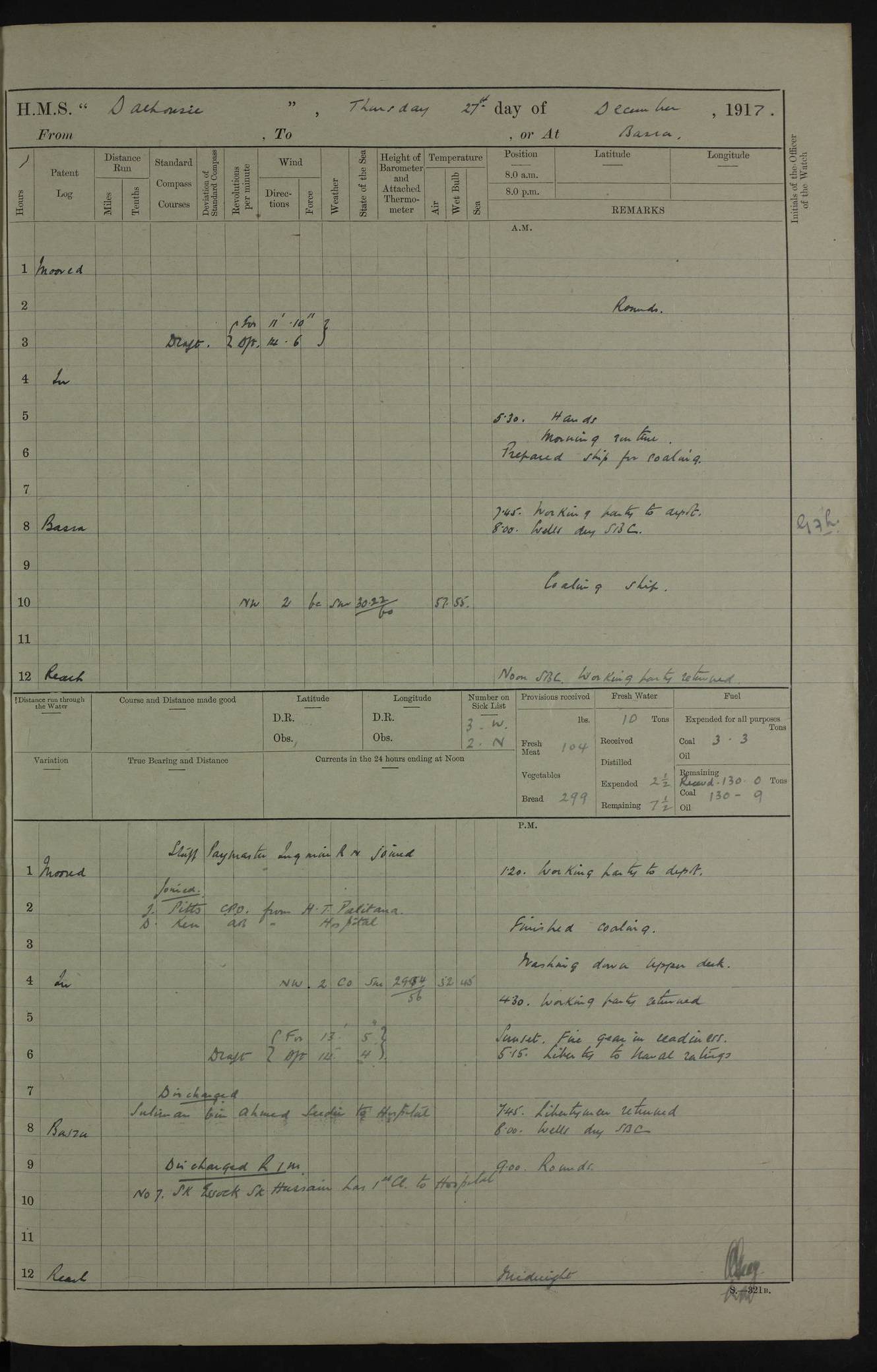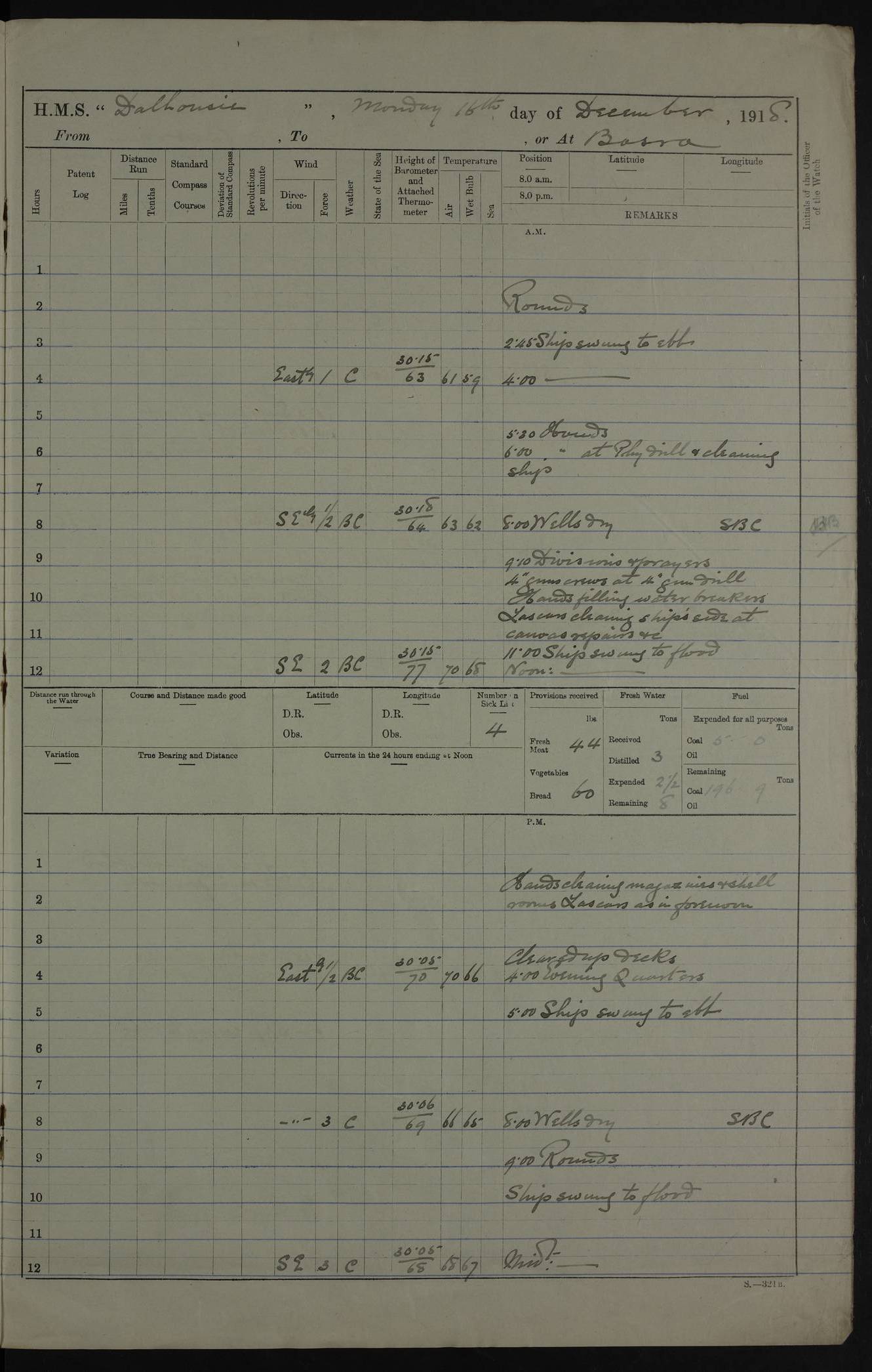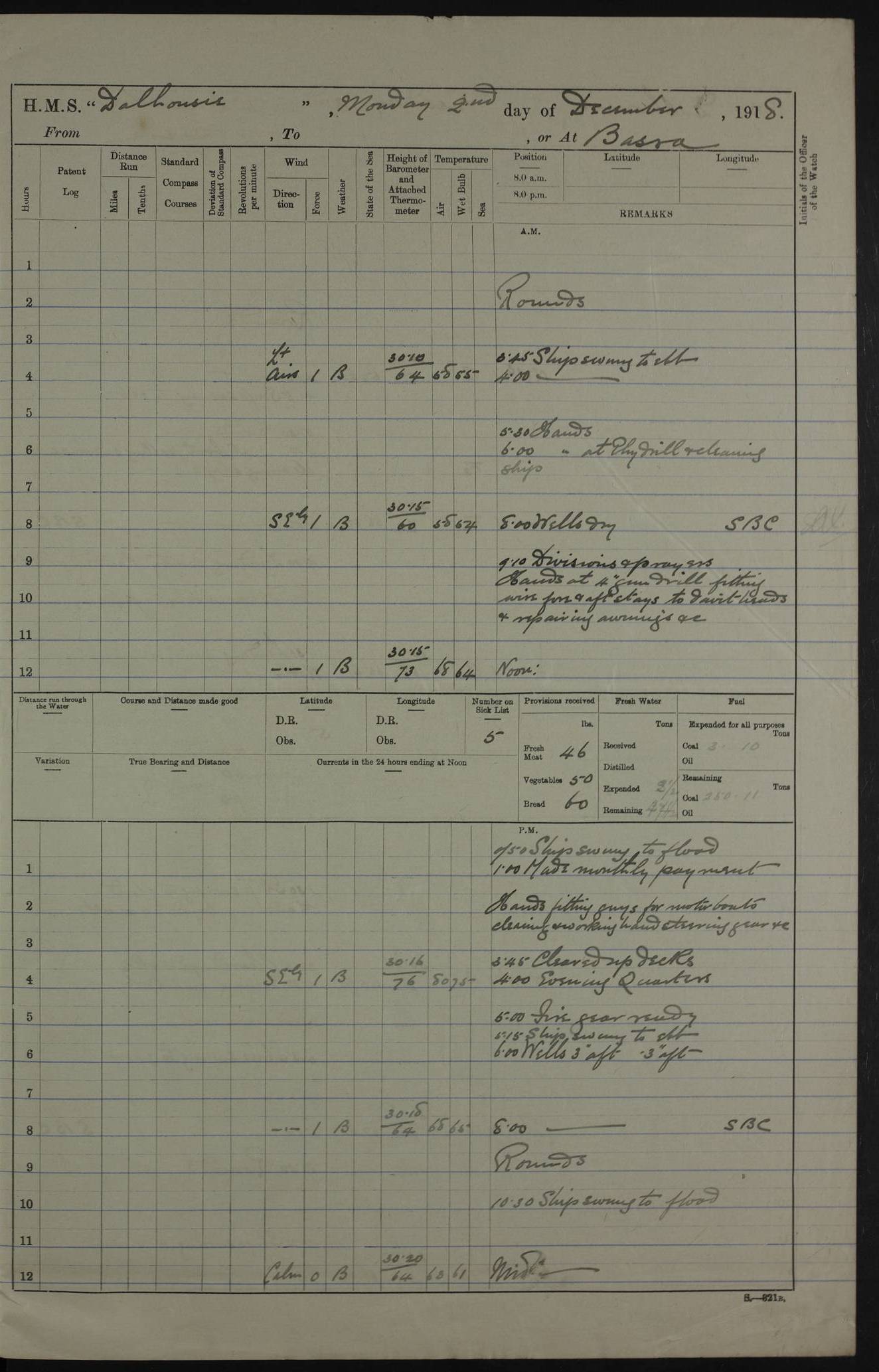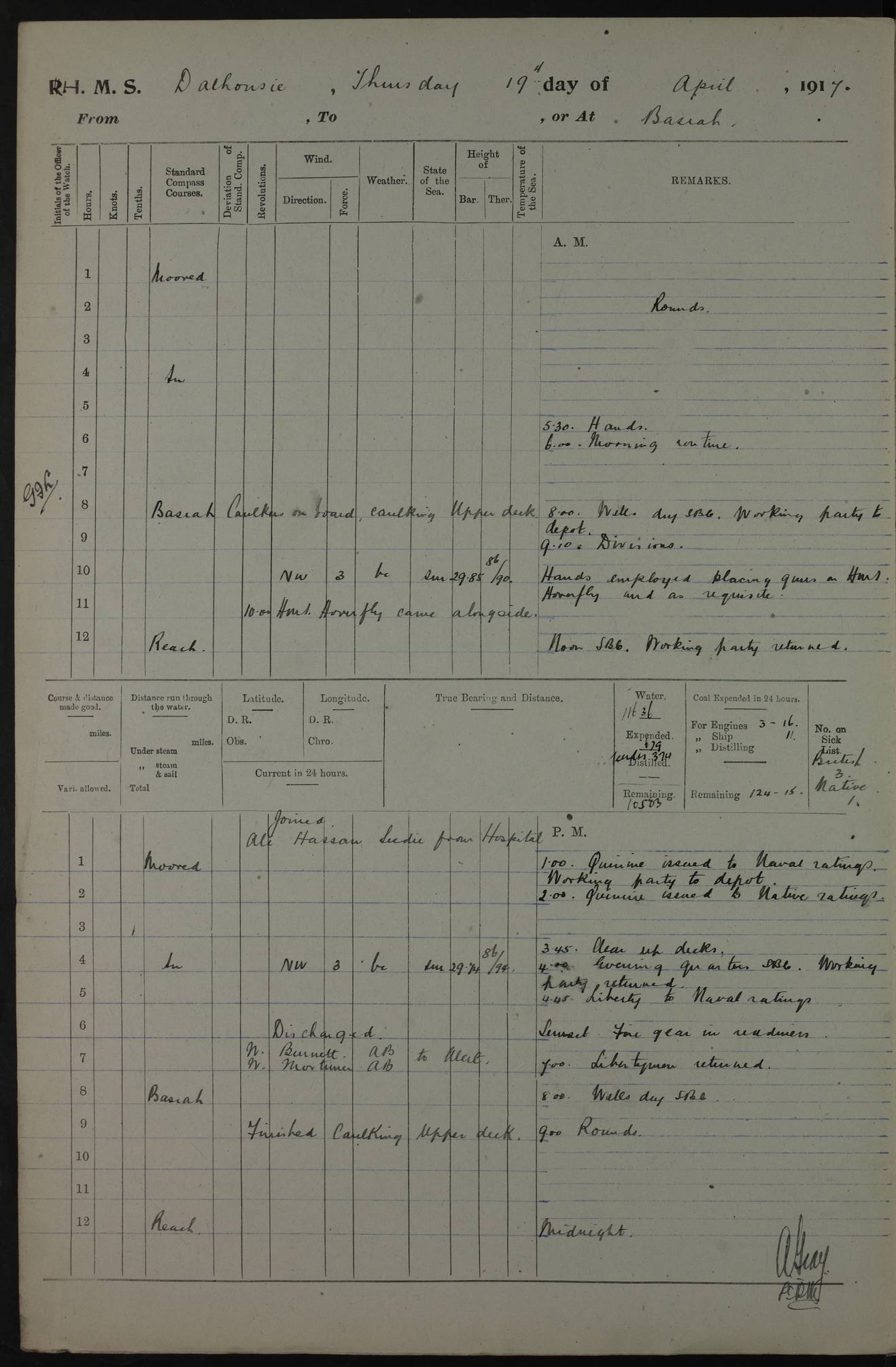 PM - Discharged To Hospital: H Widger, Engine Room Artificer - PW Harrison, Stoker Royal Navy Reserve To Motor Launch 11: J W Whitfield, Stoker 4ef4fa93e53e0a0c910056e2: (https://s3.amazonaws.com:443/oldweather/ADM53-39392/0018_0.jpg) 31 August 1916 Place: Basrah Lat 30.5269, Long 47.8407 2:00am: Rounds 5:05am: Hospital Ship SYRIA passed down 5:30am: Hands 6:00am: Morning Routine 8:00am: Wells dry – Signal Books Correct 9:30am: Divisions - Hands cleaning ship 11:00am: Drew Three Thousand Rupees from the Field treasury 12:00pm: Signal Books Correct – Issued Quinine to ship’s company 12:30pm: Piped Down 3:30pm: 4:00pm: Signal Books Correct 4:30pm: Cleared up decks 5:00pm: Evening Quarters – Leave to Watch of Naval Ratings 7:00pm: Sunset - Fire Gear in readiness 7:30pm: Liberty men returned 8:00pm: Wells dry - Signal Books Correct 9:00pm: Rounds - Signal Books Correct 11:00pm: Destroyed 19 tins Milk being unfit for use. AM – Joined From Motor Launch Depot: M. McMillan, Able Seaman From 5 Mess: T. Jackson, Petty Officer 1st From 4 Mess: T Golden, Stoker – J Tunney, Royal Navy Reserve Trawler Section From 10 Mess: J Donegan Royal Navy Reserve Trawler Section