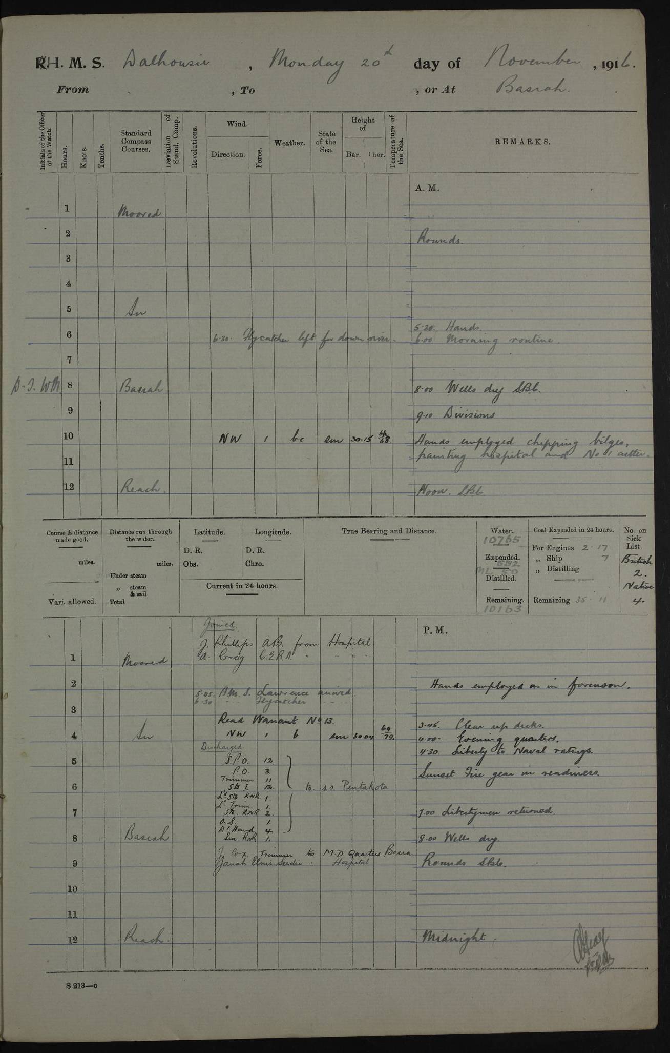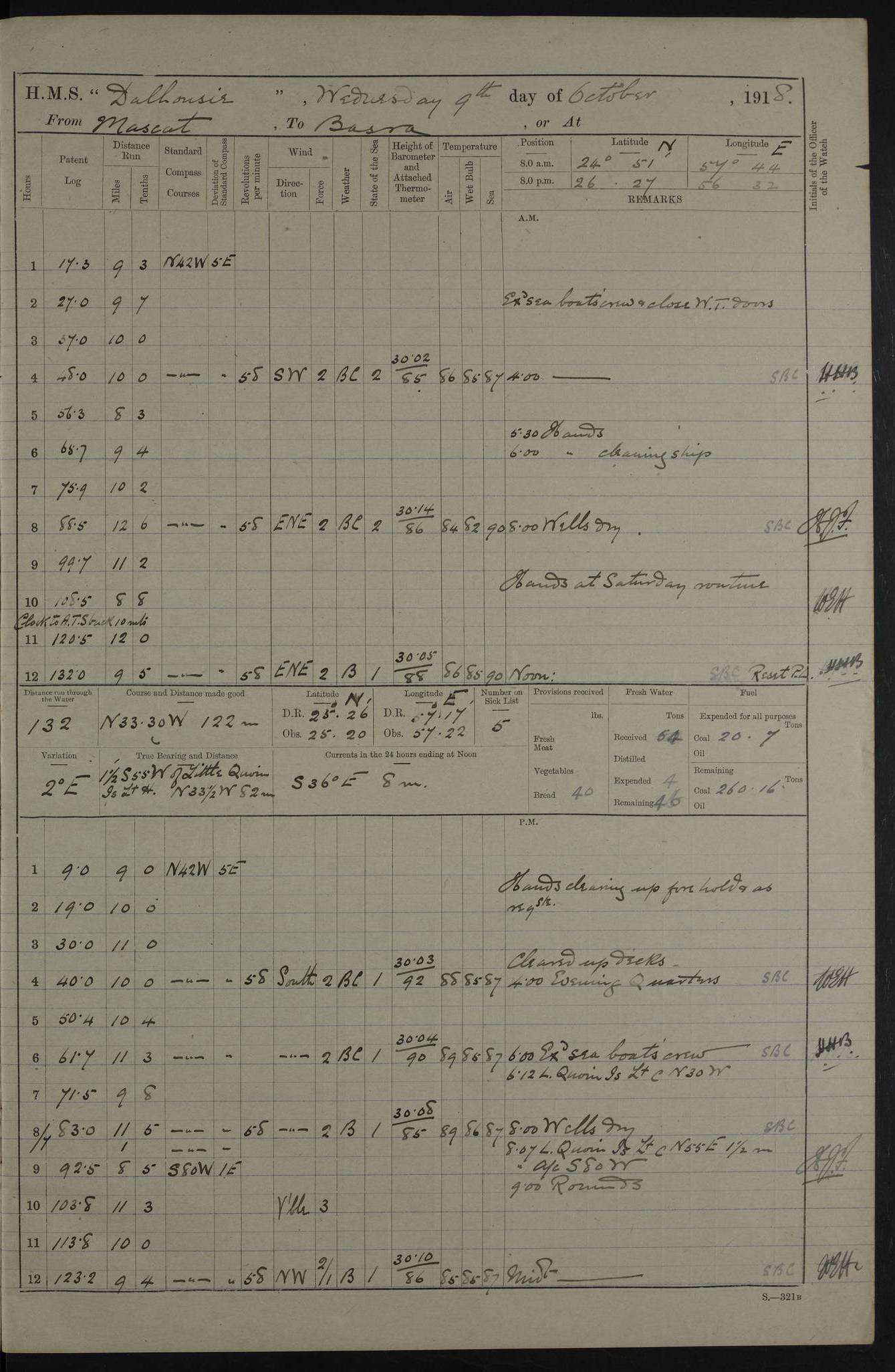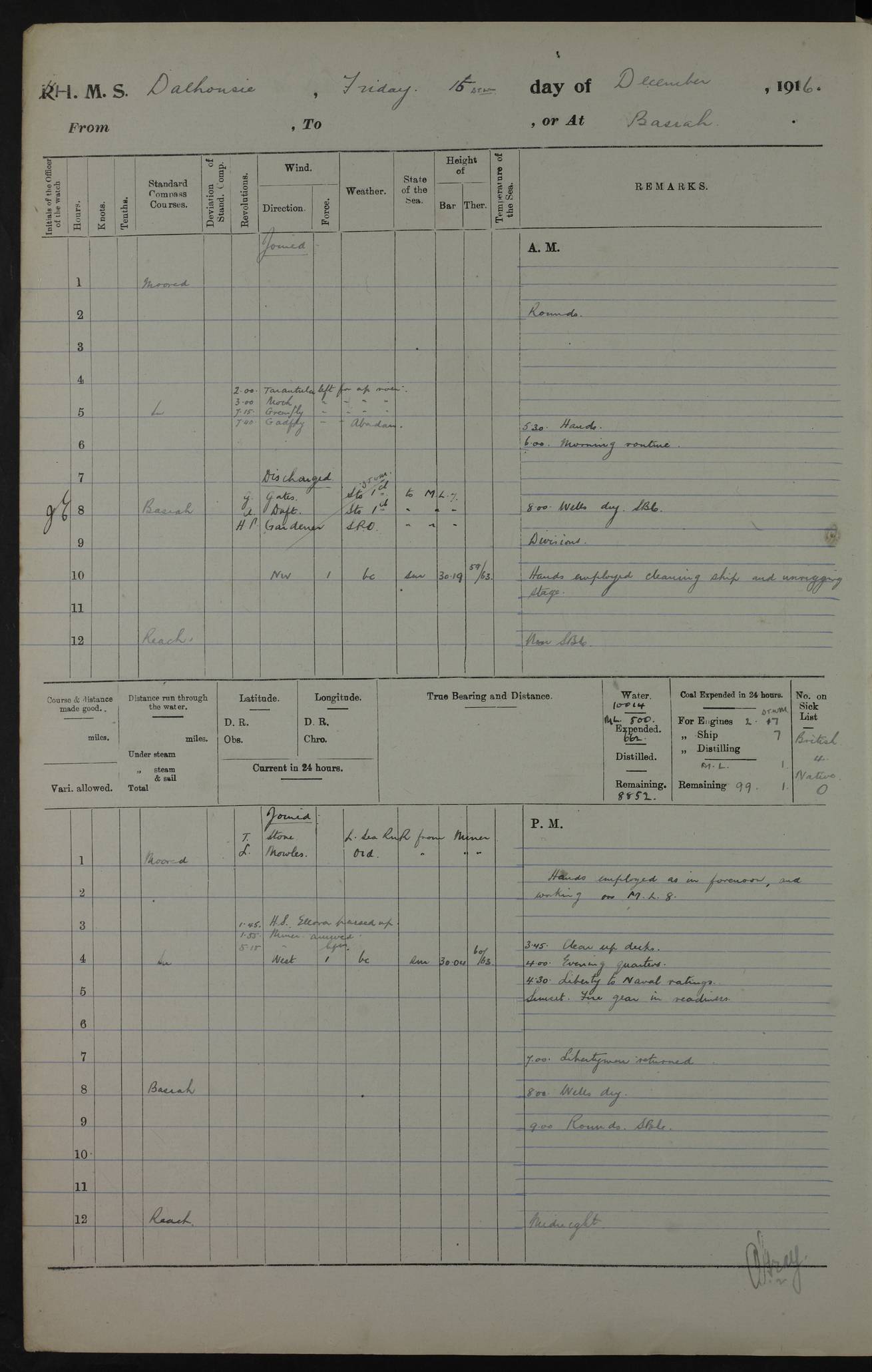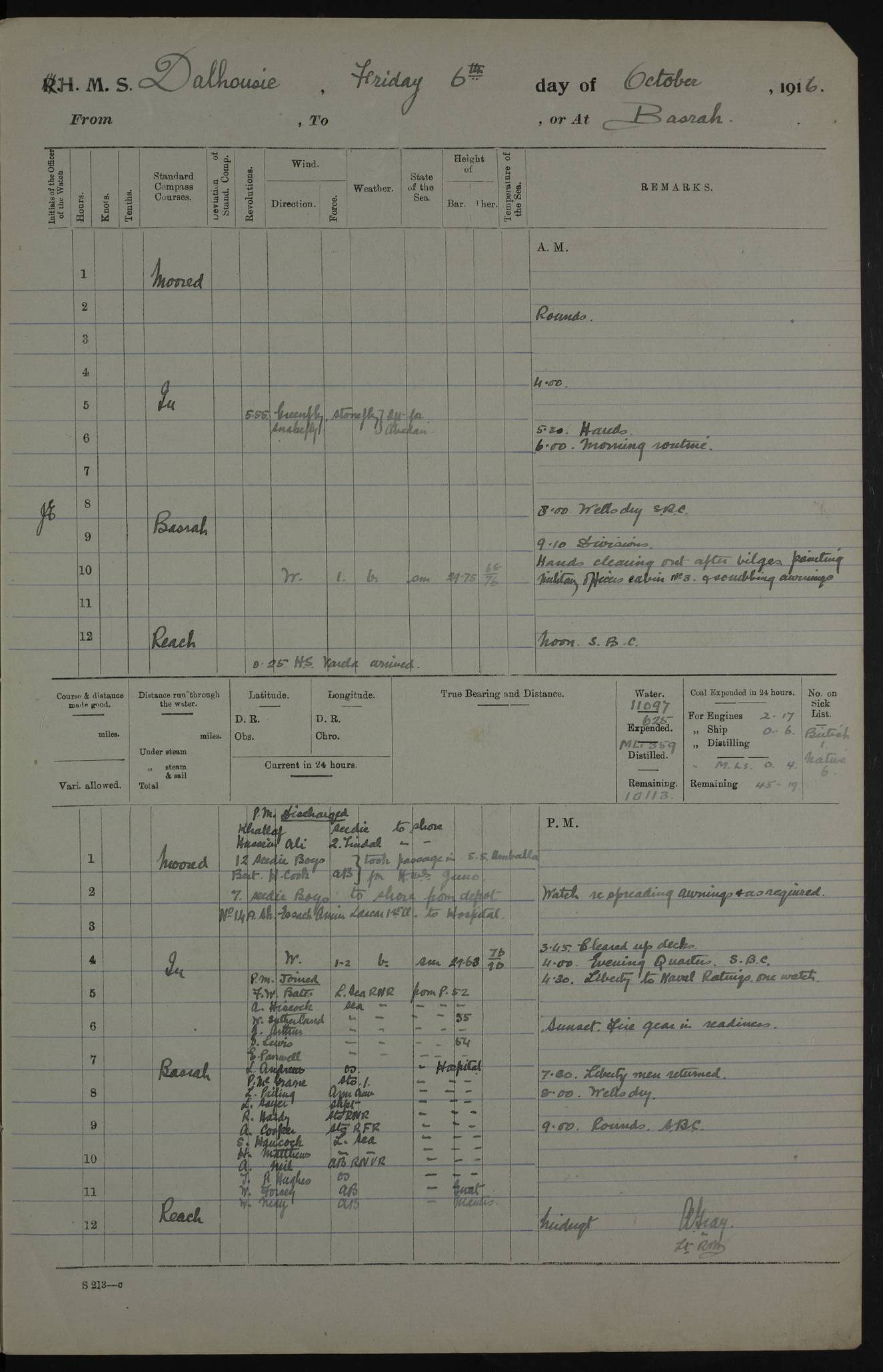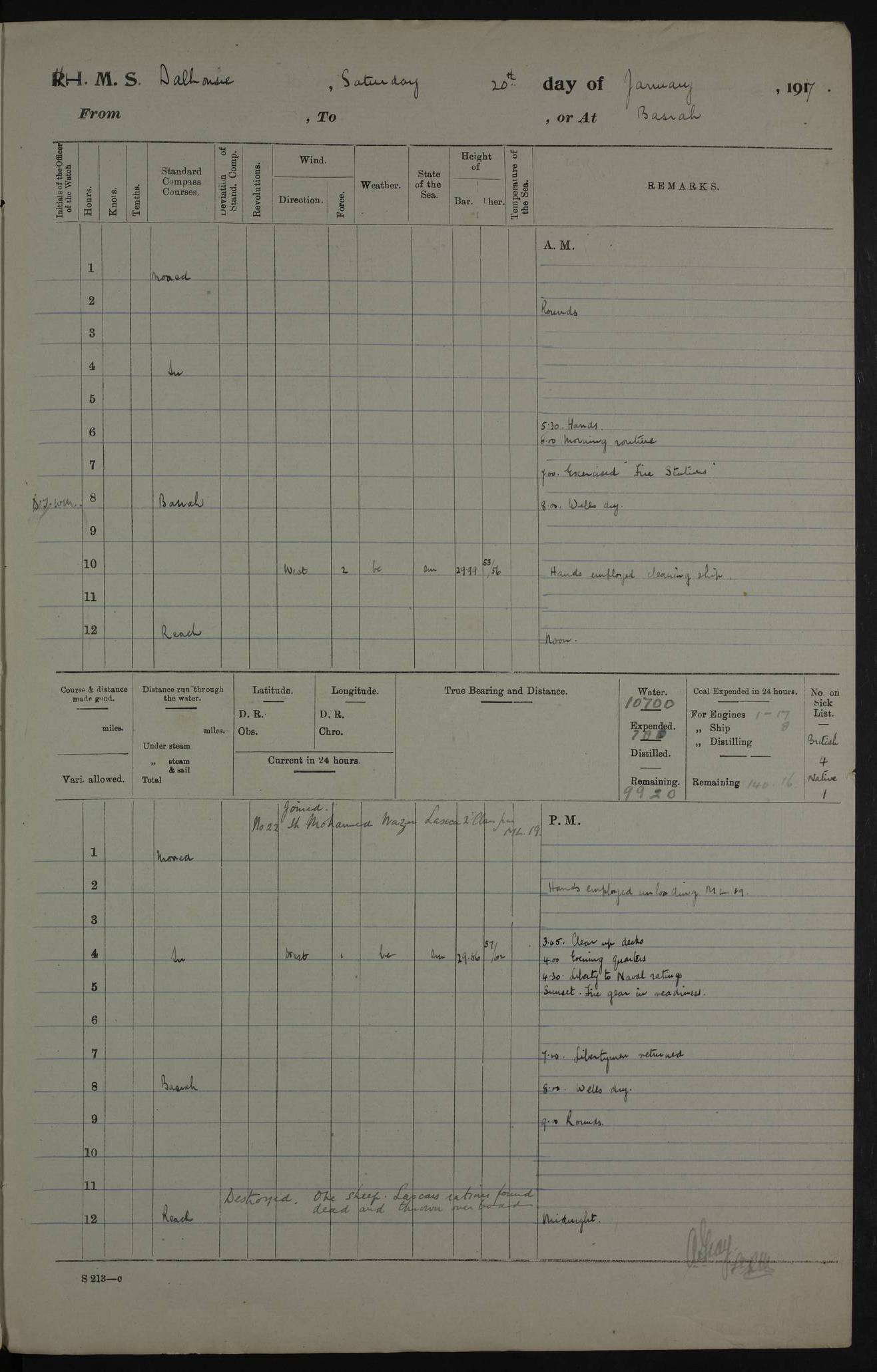 PM - Discharged To Hospital: H Widger, Engine Room Artificer - PW Harrison, Stoker Royal Navy Reserve To Motor Launch 11: J W Whitfield, Stoker 4ef4fa93e53e0a0c910056e2: (https://s3.amazonaws.com:443/oldweather/ADM53-39392/0018_0.jpg) 31 August 1916 Place: Basrah Lat 30.5269, Long 47.8407 2:00am: Rounds 5:05am: Hospital Ship SYRIA passed down 5:30am: Hands 6:00am: Morning Routine 8:00am: Wells dry – Signal Books Correct 9:30am: Divisions - Hands cleaning ship 11:00am: Drew Three Thousand Rupees from the Field treasury 12:00pm: Signal Books Correct – Issued Quinine to ship’s company 12:30pm: Piped Down 3:30pm: 4:00pm: Signal Books Correct 4:30pm: Cleared up decks 5:00pm: Evening Quarters – Leave to Watch of Naval Ratings 7:00pm: Sunset - Fire Gear in readiness 7:30pm: Liberty men returned 8:00pm: Wells dry - Signal Books Correct 9:00pm: Rounds - Signal Books Correct 11:00pm: Destroyed 19 tins Milk being unfit for use. AM – Joined From Motor Launch Depot: M. McMillan, Able Seaman From 5 Mess: T. Jackson, Petty Officer 1st From 4 Mess: T Golden, Stoker – J Tunney, Royal Navy Reserve Trawler Section From 10 Mess: J Donegan Royal Navy Reserve Trawler Section