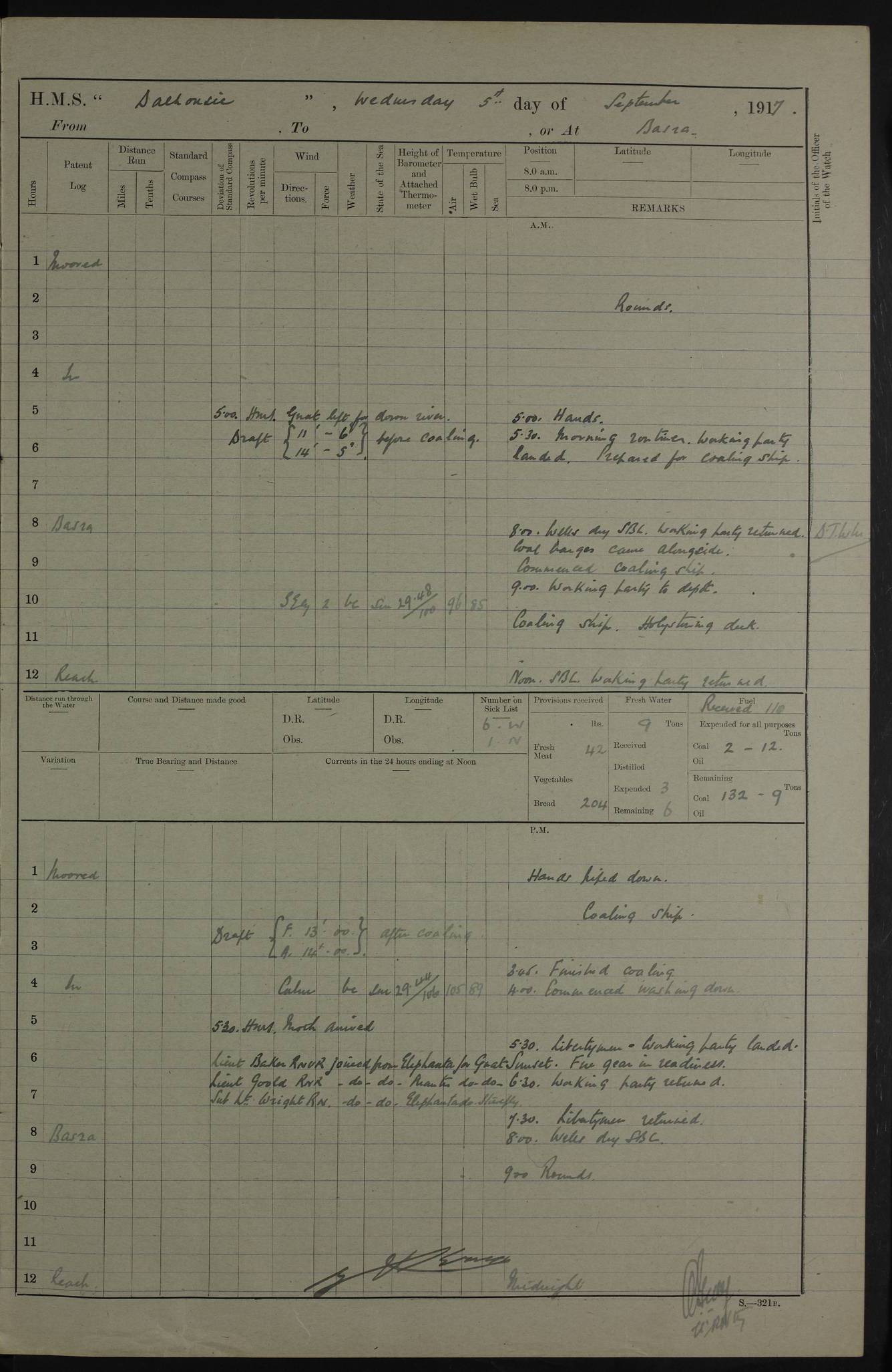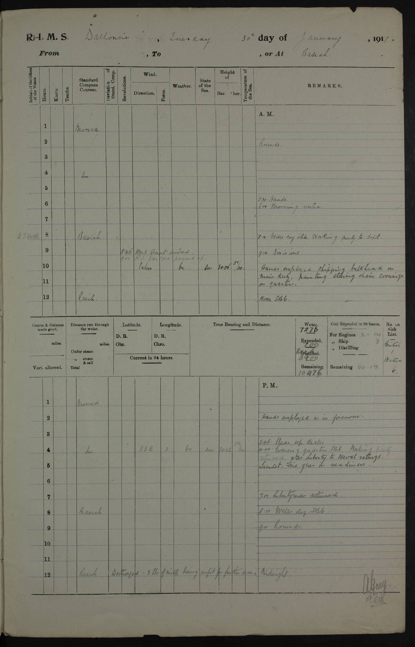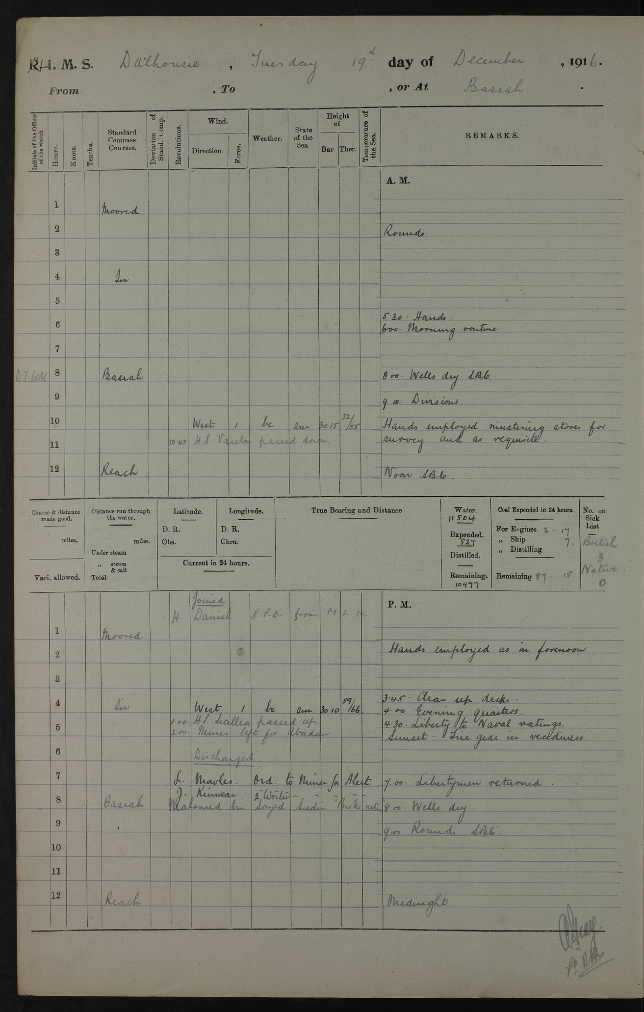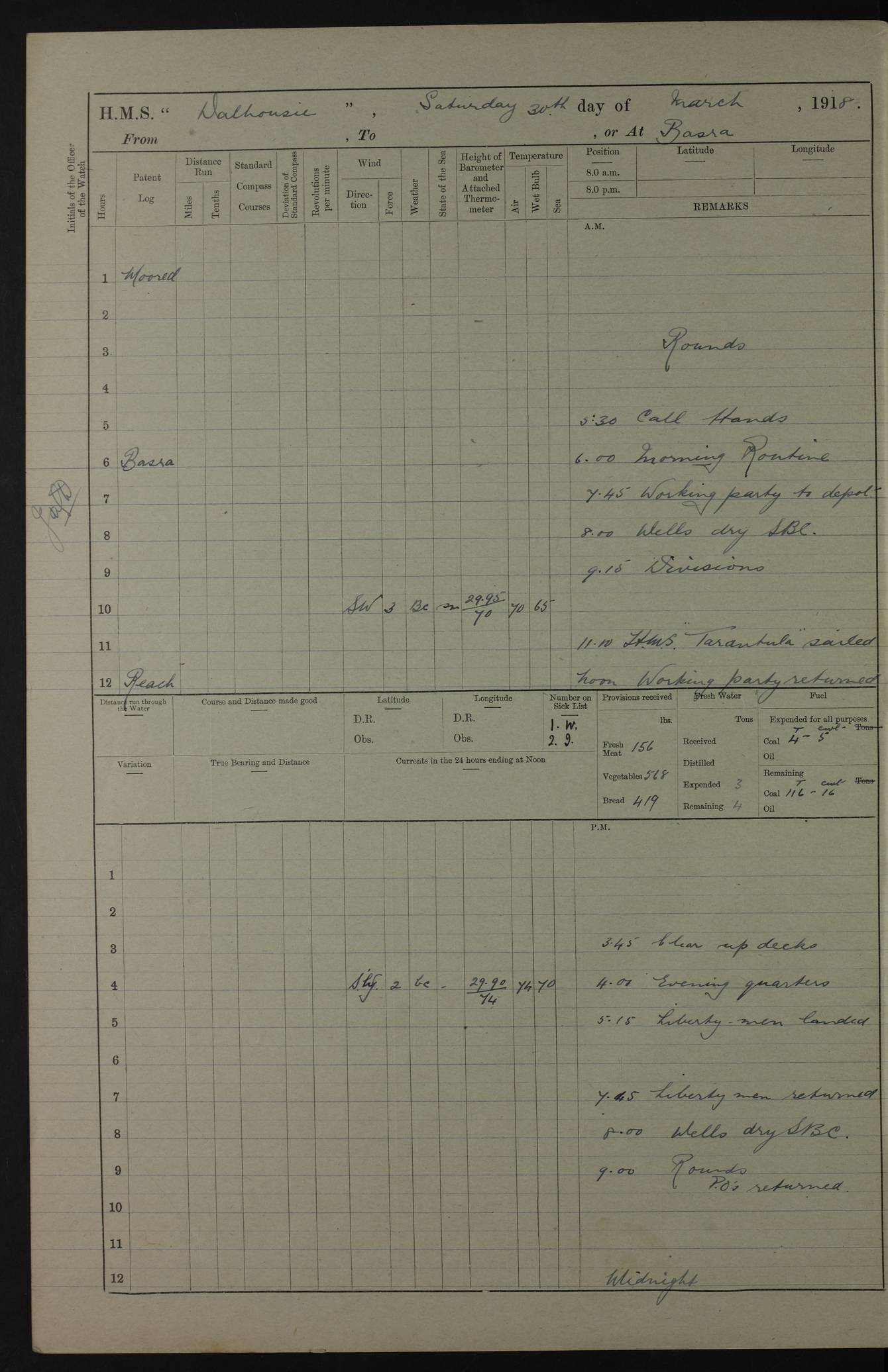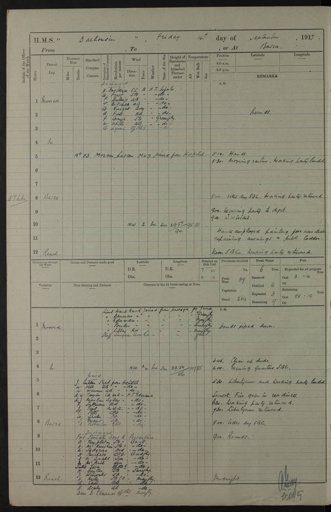 PM - Discharged To Hospital: H Widger, Engine Room Artificer - PW Harrison, Stoker Royal Navy Reserve To Motor Launch 11: J W Whitfield, Stoker 4ef4fa93e53e0a0c910056e2: (https://s3.amazonaws.com:443/oldweather/ADM53-39392/0018_0.jpg) 31 August 1916 Place: Basrah Lat 30.5269, Long 47.8407 2:00am: Rounds 5:05am: Hospital Ship SYRIA passed down 5:30am: Hands 6:00am: Morning Routine 8:00am: Wells dry – Signal Books Correct 9:30am: Divisions - Hands cleaning ship 11:00am: Drew Three Thousand Rupees from the Field treasury 12:00pm: Signal Books Correct – Issued Quinine to ship’s company 12:30pm: Piped Down 3:30pm: 4:00pm: Signal Books Correct 4:30pm: Cleared up decks 5:00pm: Evening Quarters – Leave to Watch of Naval Ratings 7:00pm: Sunset - Fire Gear in readiness 7:30pm: Liberty men returned 8:00pm: Wells dry - Signal Books Correct 9:00pm: Rounds - Signal Books Correct 11:00pm: Destroyed 19 tins Milk being unfit for use. AM – Joined From Motor Launch Depot: M. McMillan, Able Seaman From 5 Mess: T. Jackson, Petty Officer 1st From 4 Mess: T Golden, Stoker – J Tunney, Royal Navy Reserve Trawler Section From 10 Mess: J Donegan Royal Navy Reserve Trawler Section
