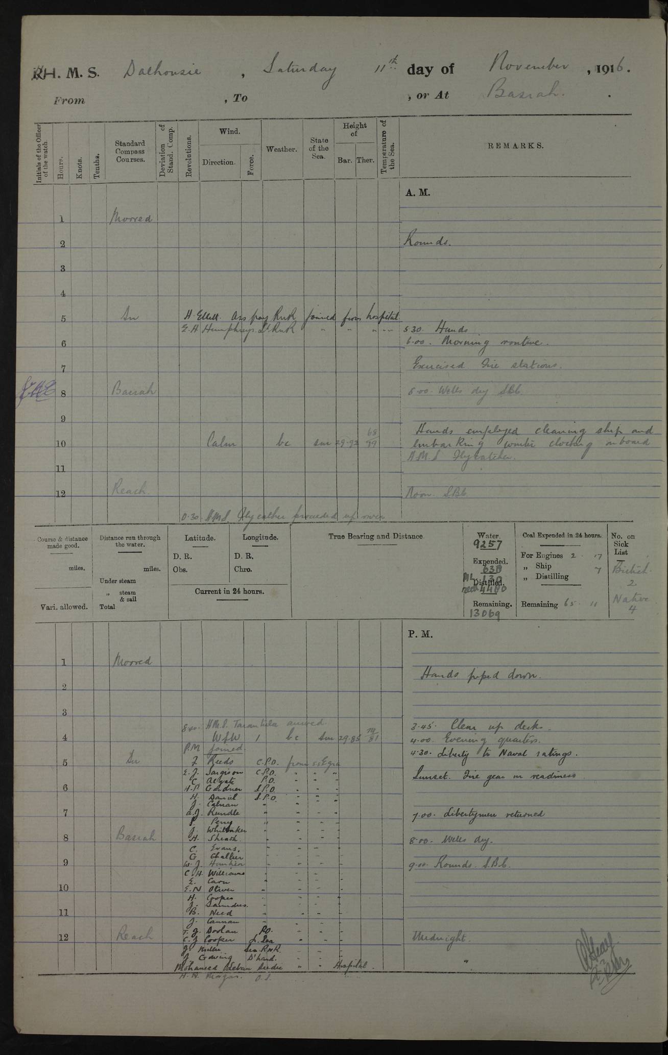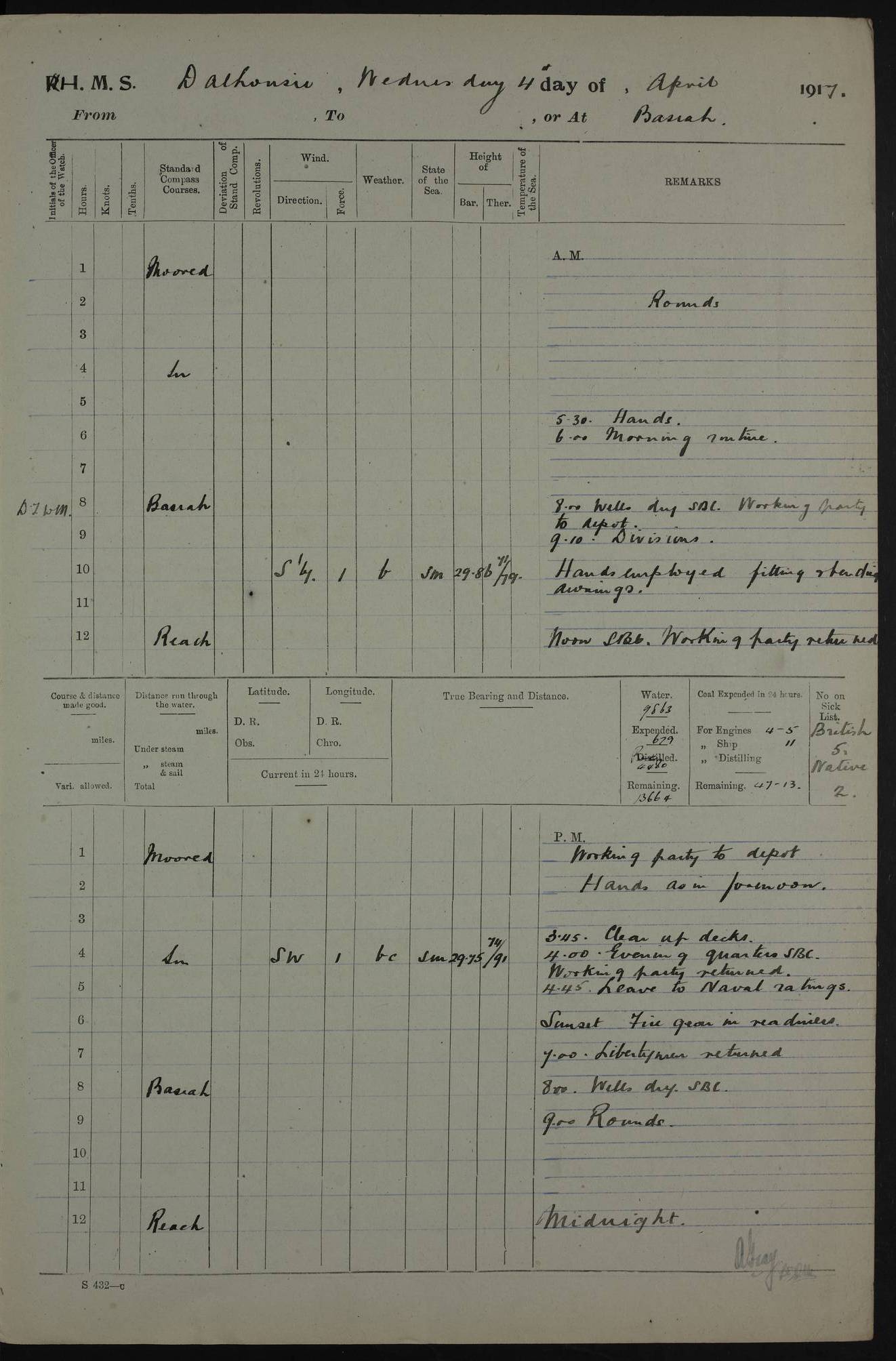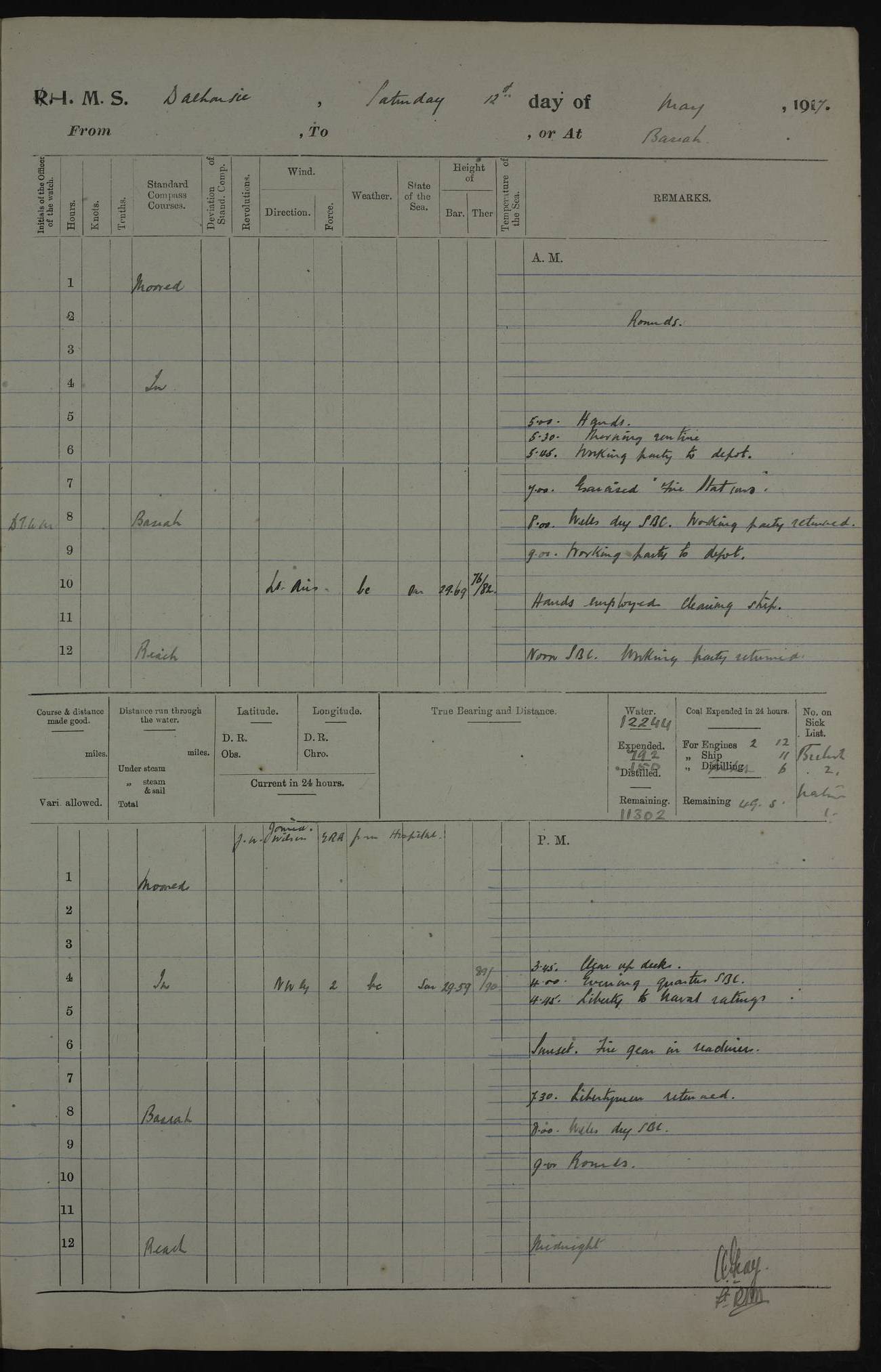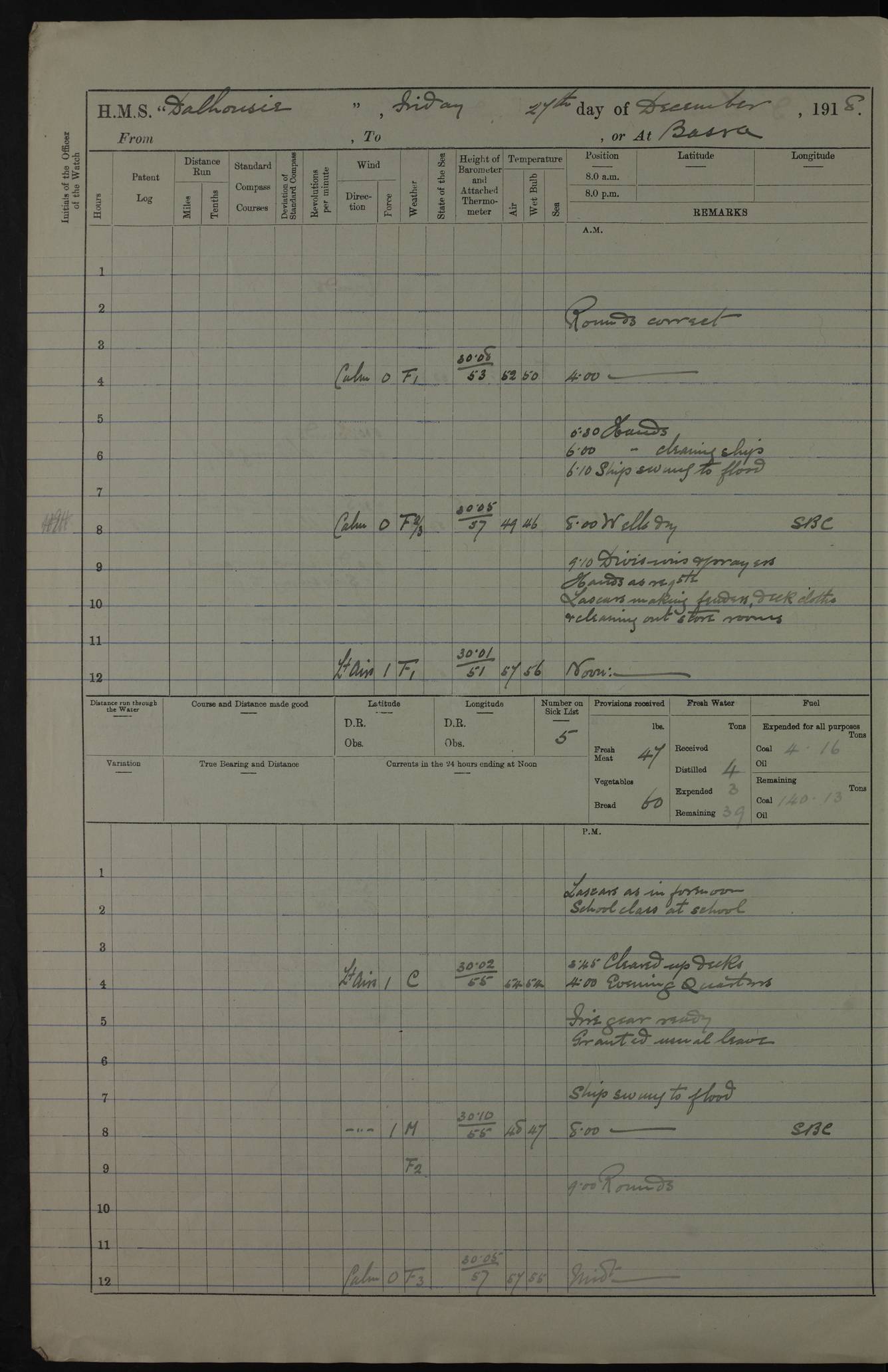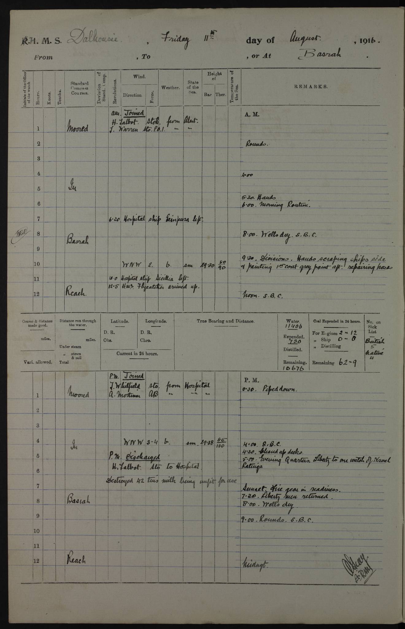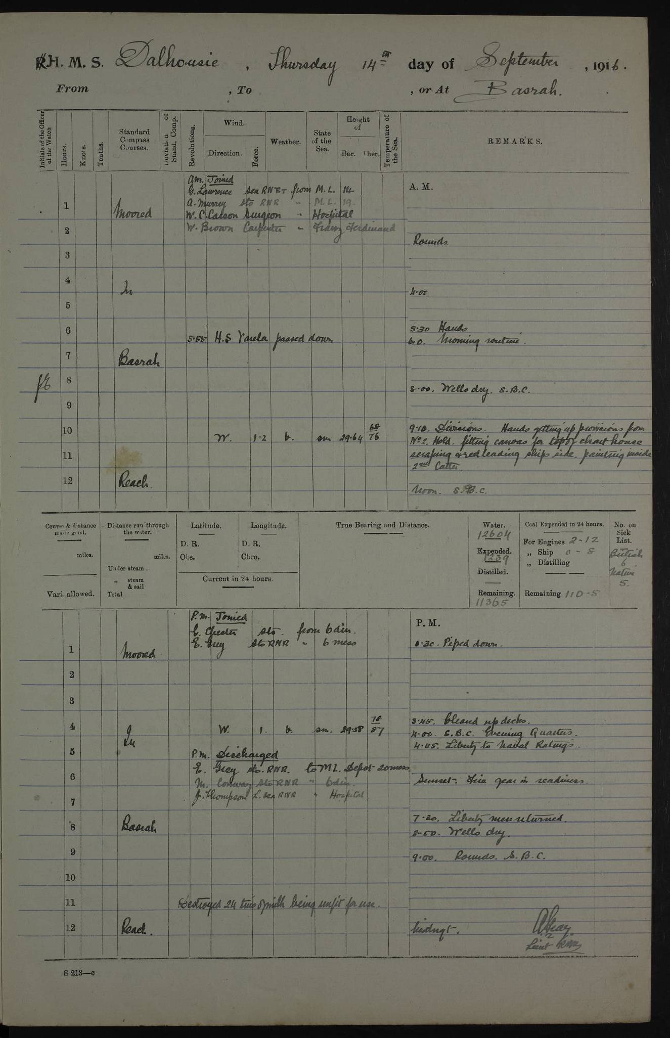 PM - Discharged To Hospital: H Widger, Engine Room Artificer - PW Harrison, Stoker Royal Navy Reserve To Motor Launch 11: J W Whitfield, Stoker 4ef4fa93e53e0a0c910056e2: (https://s3.amazonaws.com:443/oldweather/ADM53-39392/0018_0.jpg) 31 August 1916 Place: Basrah Lat 30.5269, Long 47.8407 2:00am: Rounds 5:05am: Hospital Ship SYRIA passed down 5:30am: Hands 6:00am: Morning Routine 8:00am: Wells dry – Signal Books Correct 9:30am: Divisions - Hands cleaning ship 11:00am: Drew Three Thousand Rupees from the Field treasury 12:00pm: Signal Books Correct – Issued Quinine to ship’s company 12:30pm: Piped Down 3:30pm: 4:00pm: Signal Books Correct 4:30pm: Cleared up decks 5:00pm: Evening Quarters – Leave to Watch of Naval Ratings 7:00pm: Sunset - Fire Gear in readiness 7:30pm: Liberty men returned 8:00pm: Wells dry - Signal Books Correct 9:00pm: Rounds - Signal Books Correct 11:00pm: Destroyed 19 tins Milk being unfit for use. AM – Joined From Motor Launch Depot: M. McMillan, Able Seaman From 5 Mess: T. Jackson, Petty Officer 1st From 4 Mess: T Golden, Stoker – J Tunney, Royal Navy Reserve Trawler Section From 10 Mess: J Donegan Royal Navy Reserve Trawler Section