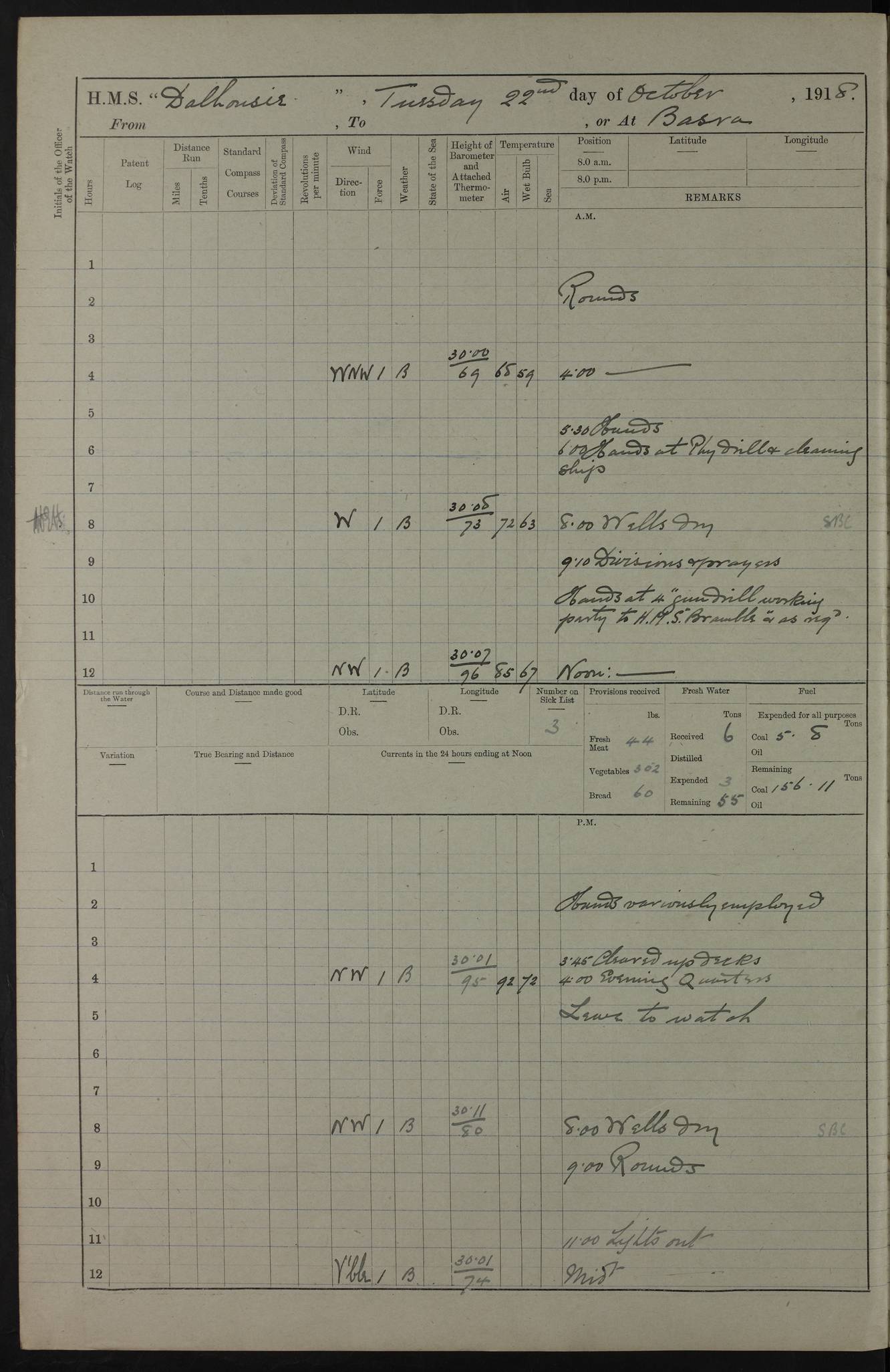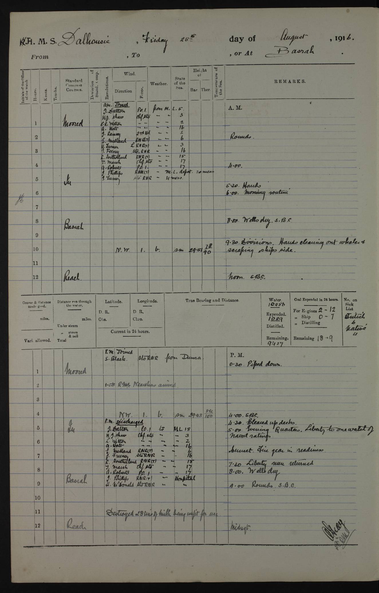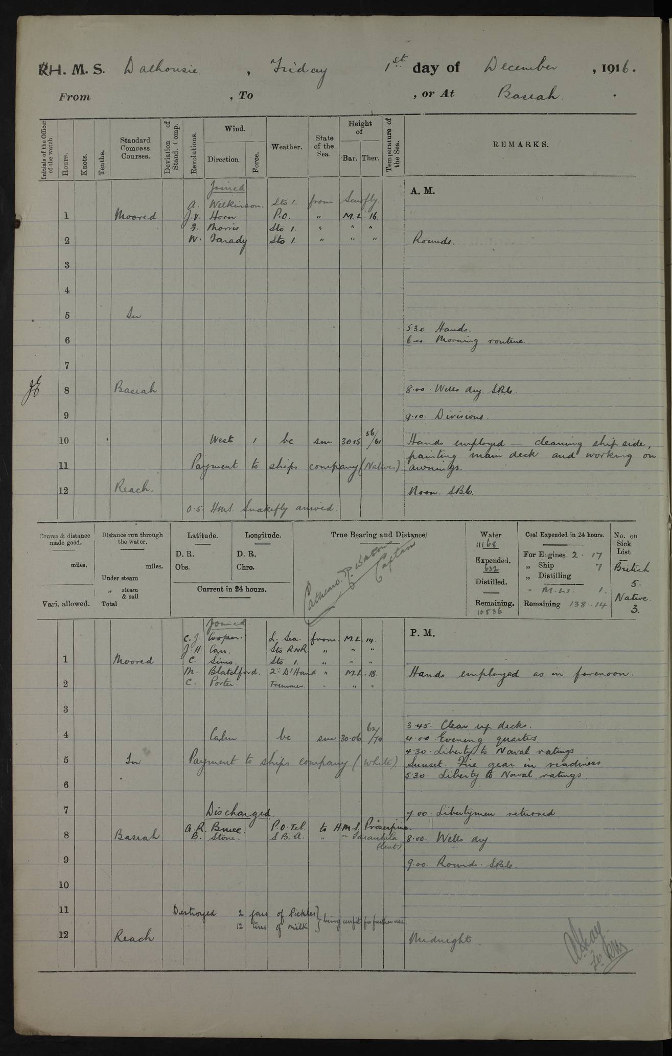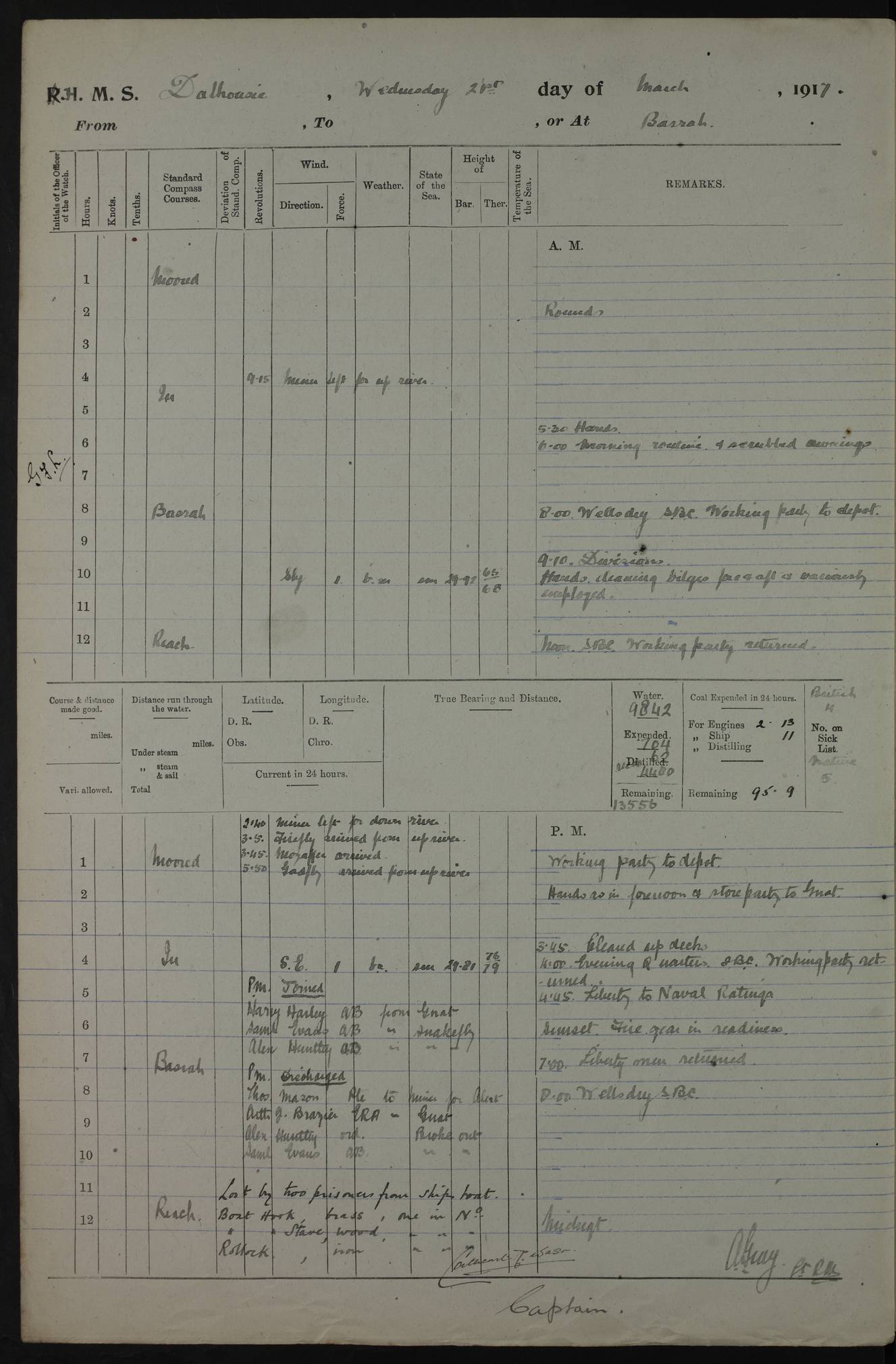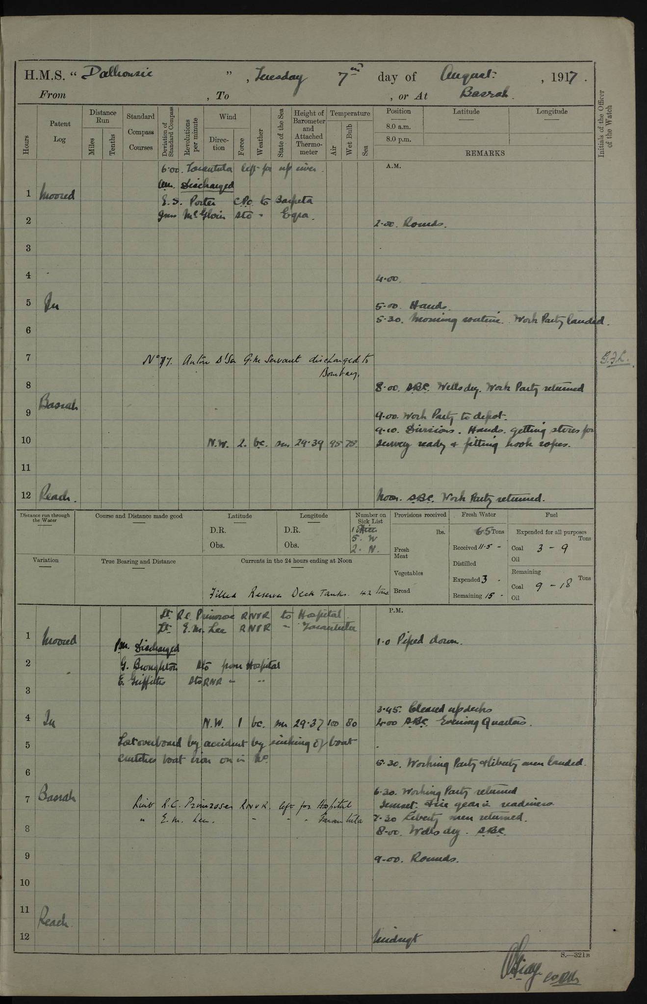 PM - Discharged To Hospital: H Widger, Engine Room Artificer - PW Harrison, Stoker Royal Navy Reserve To Motor Launch 11: J W Whitfield, Stoker 4ef4fa93e53e0a0c910056e2: (https://s3.amazonaws.com:443/oldweather/ADM53-39392/0018_0.jpg) 31 August 1916 Place: Basrah Lat 30.5269, Long 47.8407 2:00am: Rounds 5:05am: Hospital Ship SYRIA passed down 5:30am: Hands 6:00am: Morning Routine 8:00am: Wells dry – Signal Books Correct 9:30am: Divisions - Hands cleaning ship 11:00am: Drew Three Thousand Rupees from the Field treasury 12:00pm: Signal Books Correct – Issued Quinine to ship’s company 12:30pm: Piped Down 3:30pm: 4:00pm: Signal Books Correct 4:30pm: Cleared up decks 5:00pm: Evening Quarters – Leave to Watch of Naval Ratings 7:00pm: Sunset - Fire Gear in readiness 7:30pm: Liberty men returned 8:00pm: Wells dry - Signal Books Correct 9:00pm: Rounds - Signal Books Correct 11:00pm: Destroyed 19 tins Milk being unfit for use. AM – Joined From Motor Launch Depot: M. McMillan, Able Seaman From 5 Mess: T. Jackson, Petty Officer 1st From 4 Mess: T Golden, Stoker – J Tunney, Royal Navy Reserve Trawler Section From 10 Mess: J Donegan Royal Navy Reserve Trawler Section