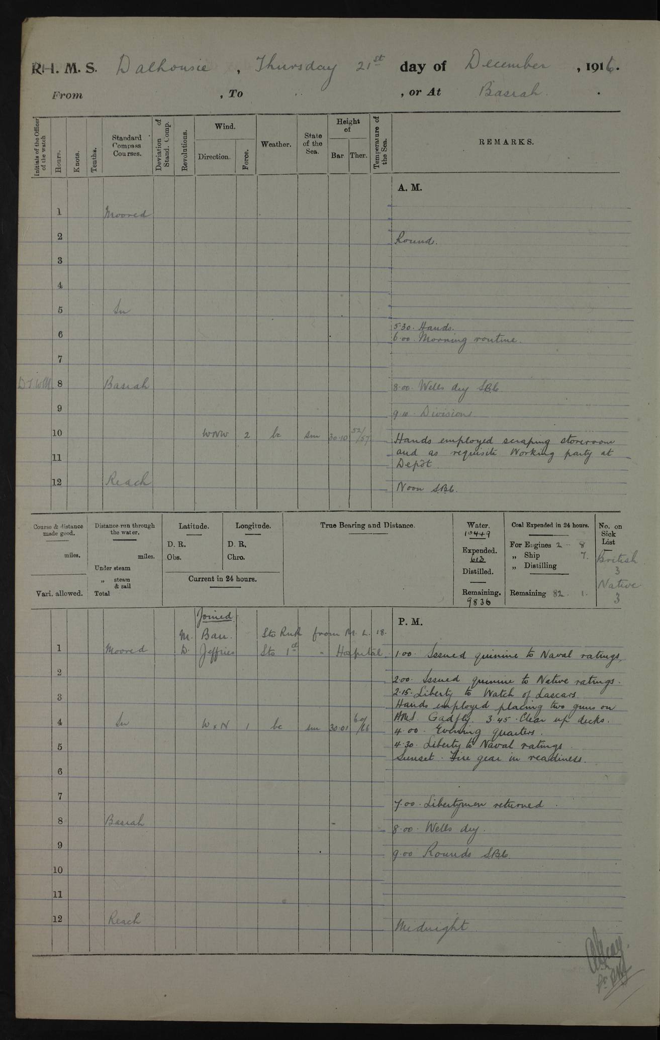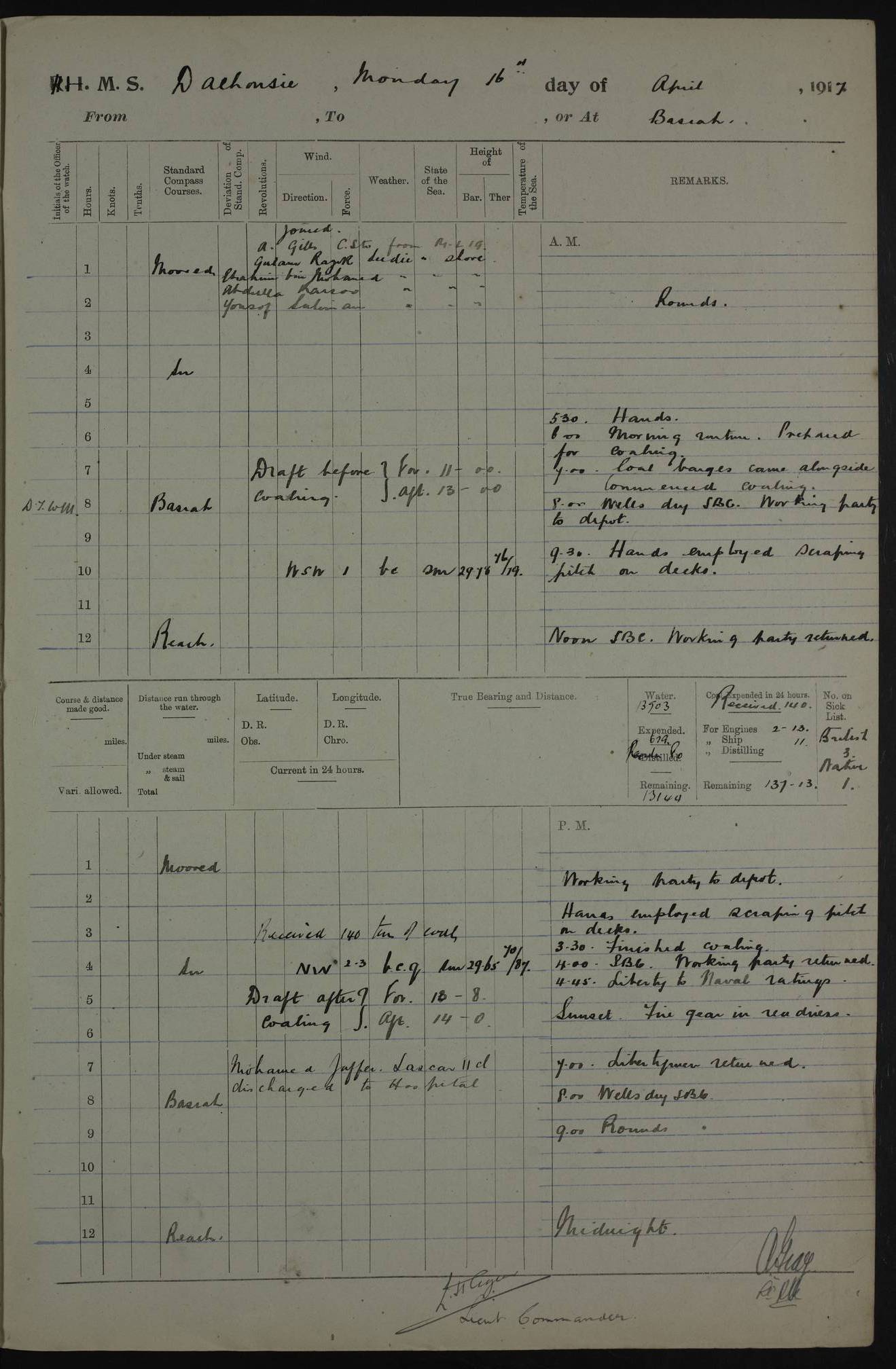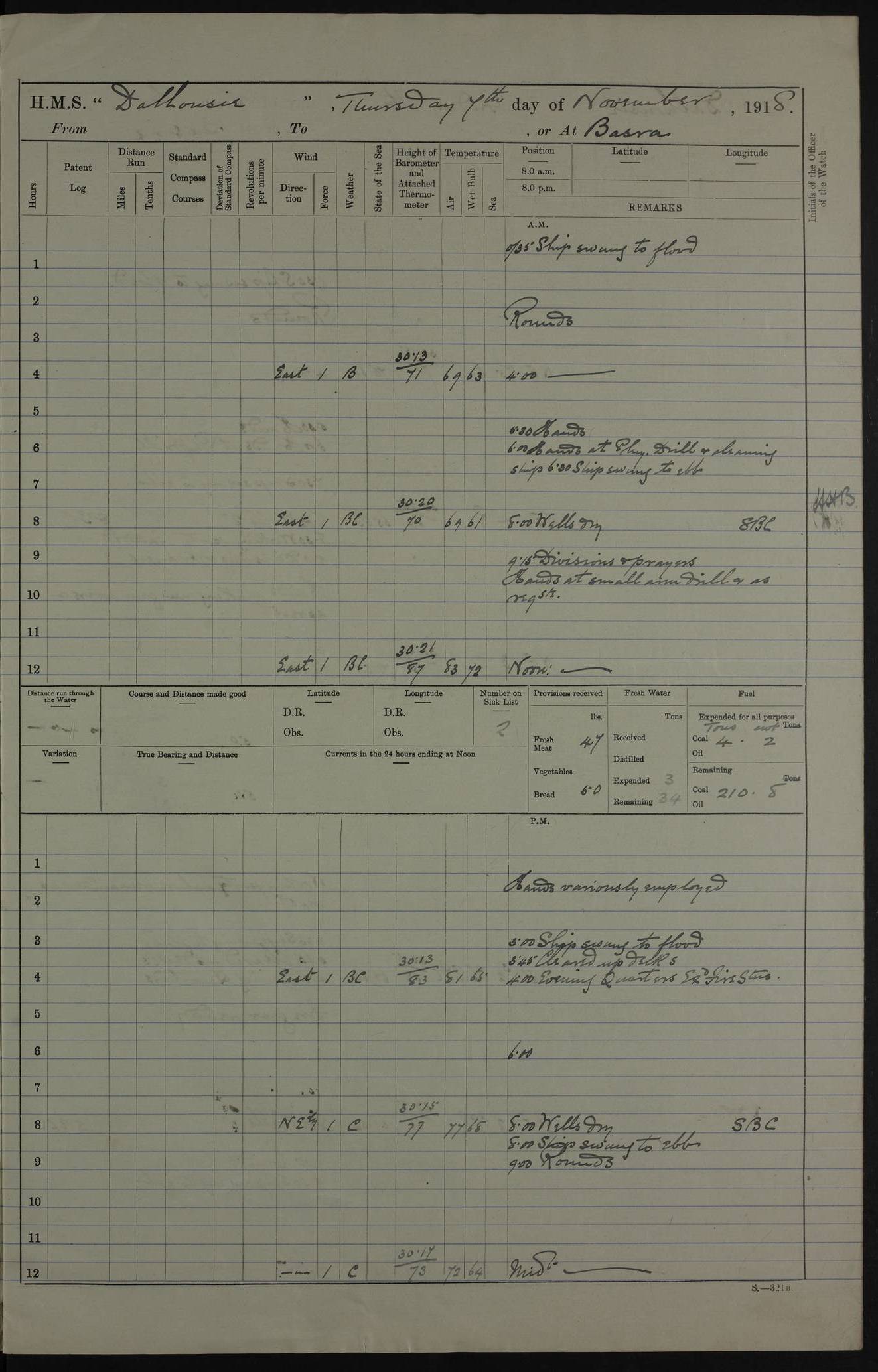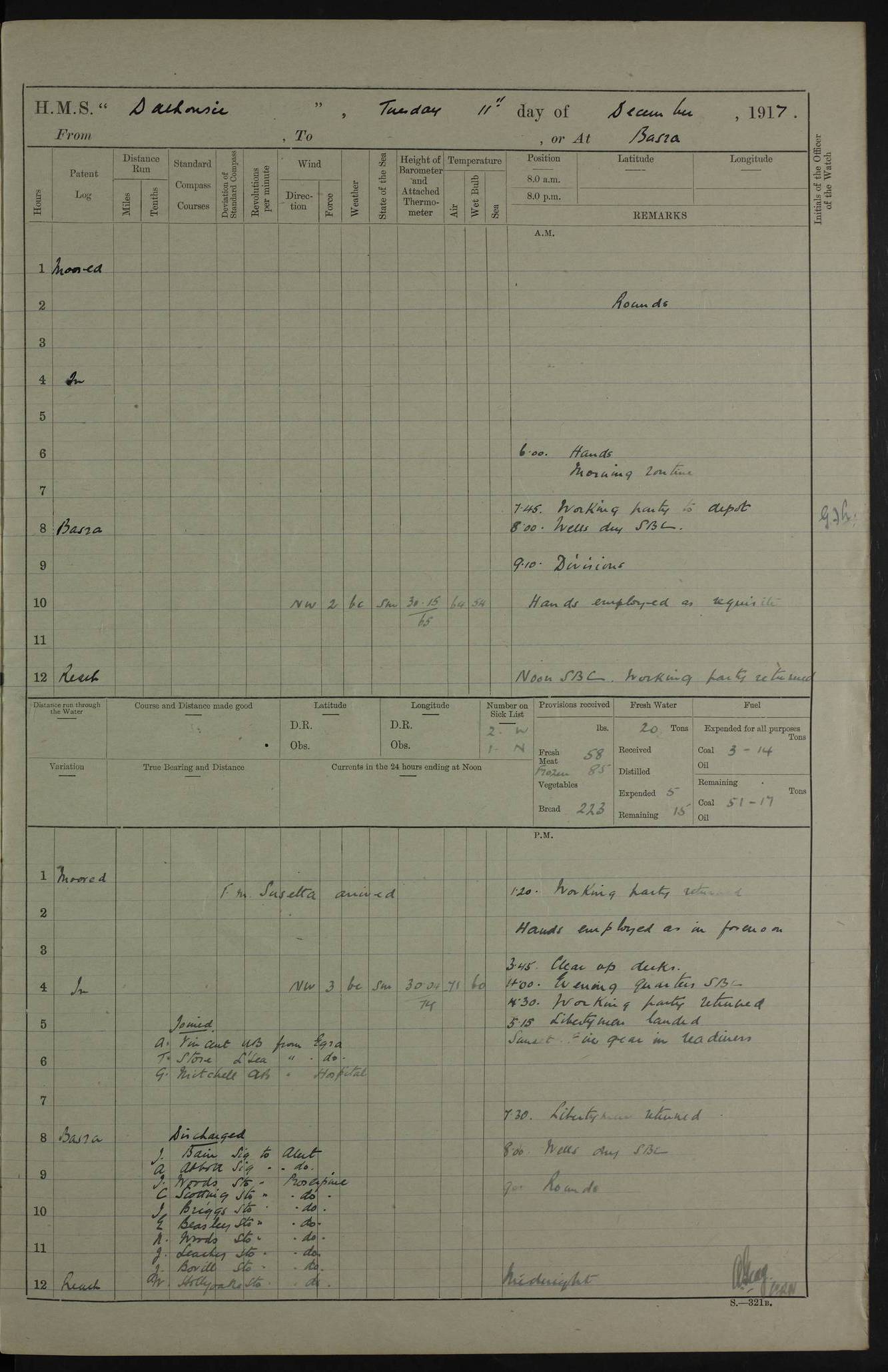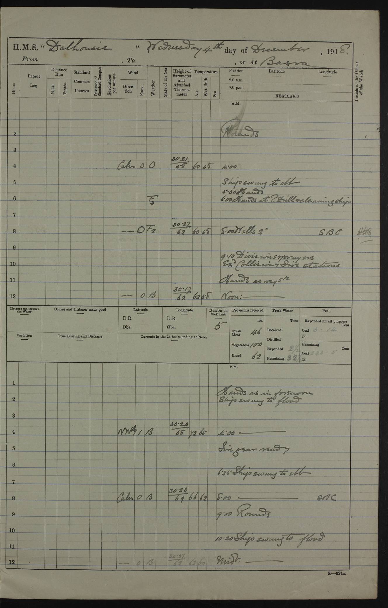 PM - Discharged To Hospital: H Widger, Engine Room Artificer - PW Harrison, Stoker Royal Navy Reserve To Motor Launch 11: J W Whitfield, Stoker 4ef4fa93e53e0a0c910056e2: (https://s3.amazonaws.com:443/oldweather/ADM53-39392/0018_0.jpg) 31 August 1916 Place: Basrah Lat 30.5269, Long 47.8407 2:00am: Rounds 5:05am: Hospital Ship SYRIA passed down 5:30am: Hands 6:00am: Morning Routine 8:00am: Wells dry – Signal Books Correct 9:30am: Divisions - Hands cleaning ship 11:00am: Drew Three Thousand Rupees from the Field treasury 12:00pm: Signal Books Correct – Issued Quinine to ship’s company 12:30pm: Piped Down 3:30pm: 4:00pm: Signal Books Correct 4:30pm: Cleared up decks 5:00pm: Evening Quarters – Leave to Watch of Naval Ratings 7:00pm: Sunset - Fire Gear in readiness 7:30pm: Liberty men returned 8:00pm: Wells dry - Signal Books Correct 9:00pm: Rounds - Signal Books Correct 11:00pm: Destroyed 19 tins Milk being unfit for use. AM – Joined From Motor Launch Depot: M. McMillan, Able Seaman From 5 Mess: T. Jackson, Petty Officer 1st From 4 Mess: T Golden, Stoker – J Tunney, Royal Navy Reserve Trawler Section From 10 Mess: J Donegan Royal Navy Reserve Trawler Section