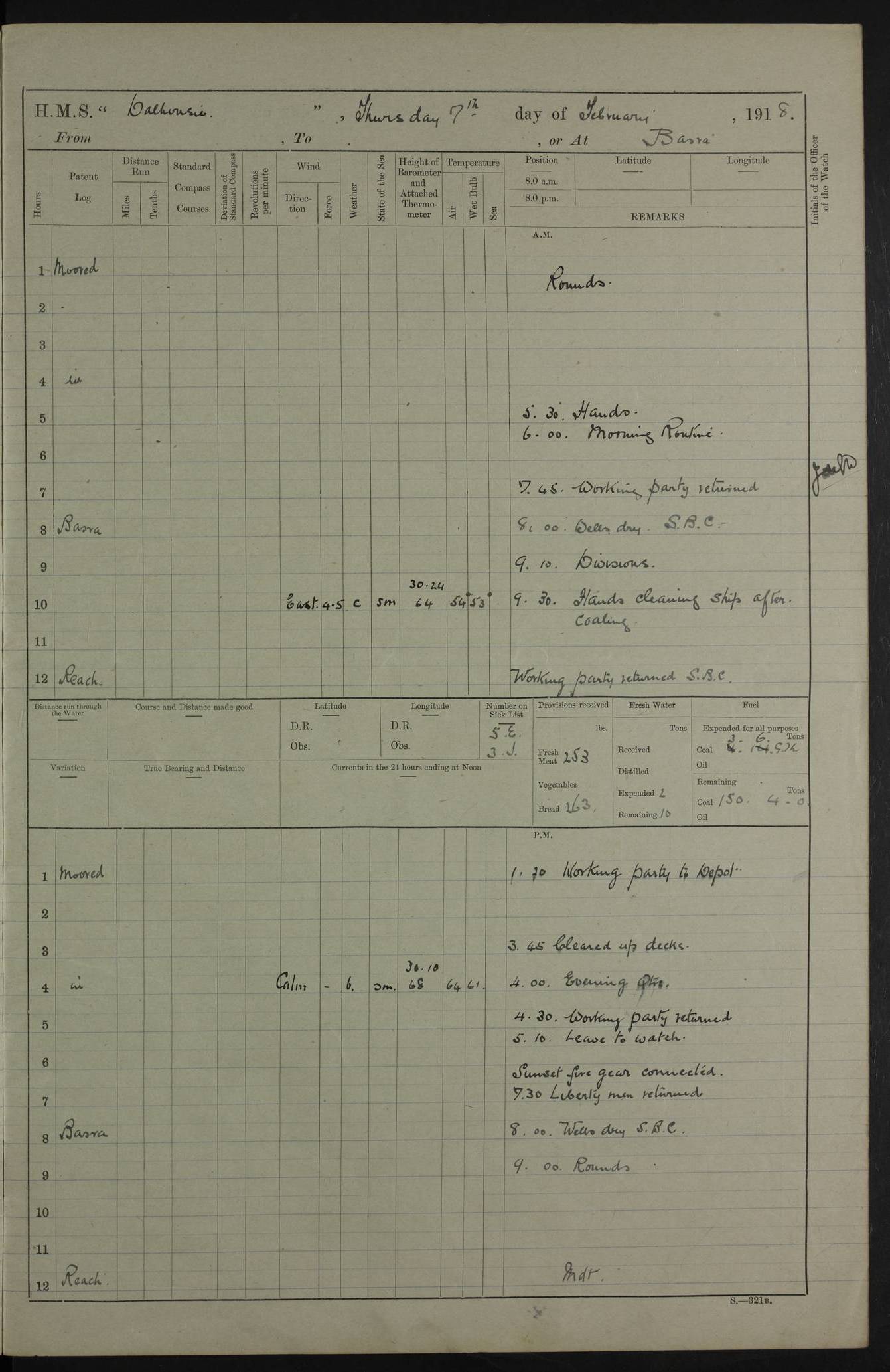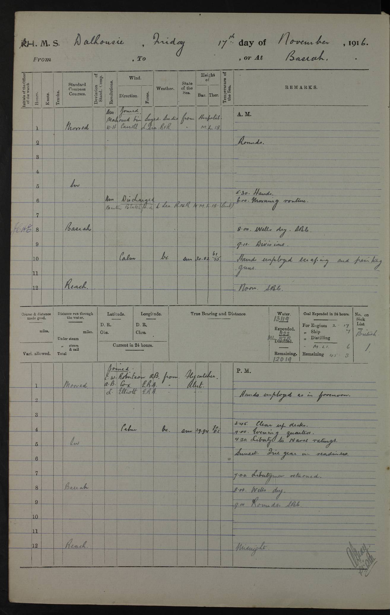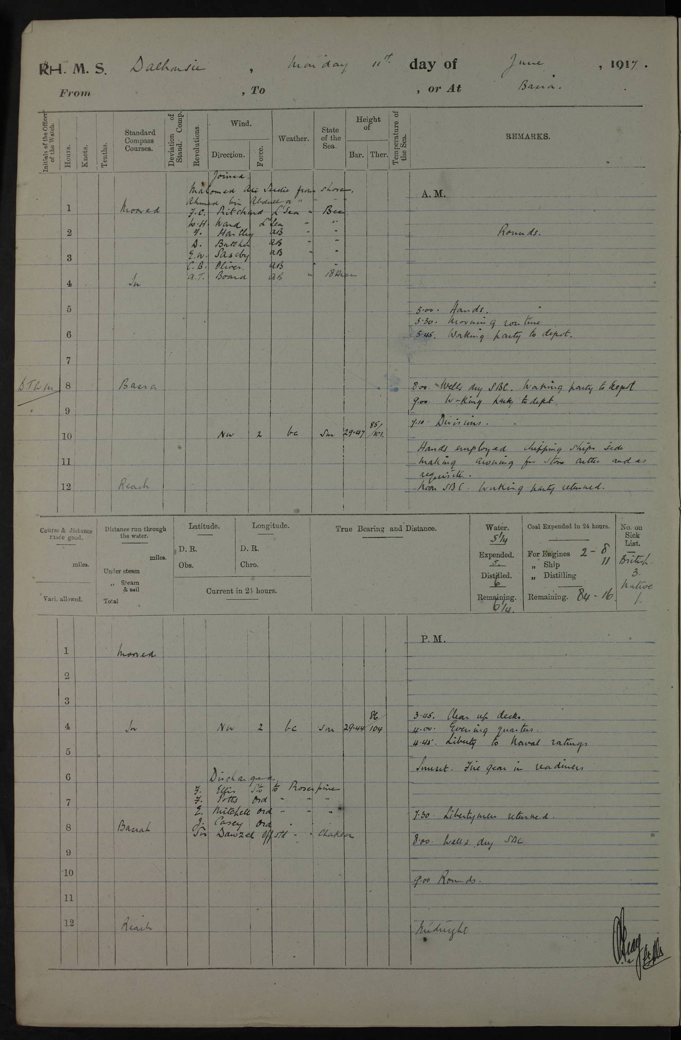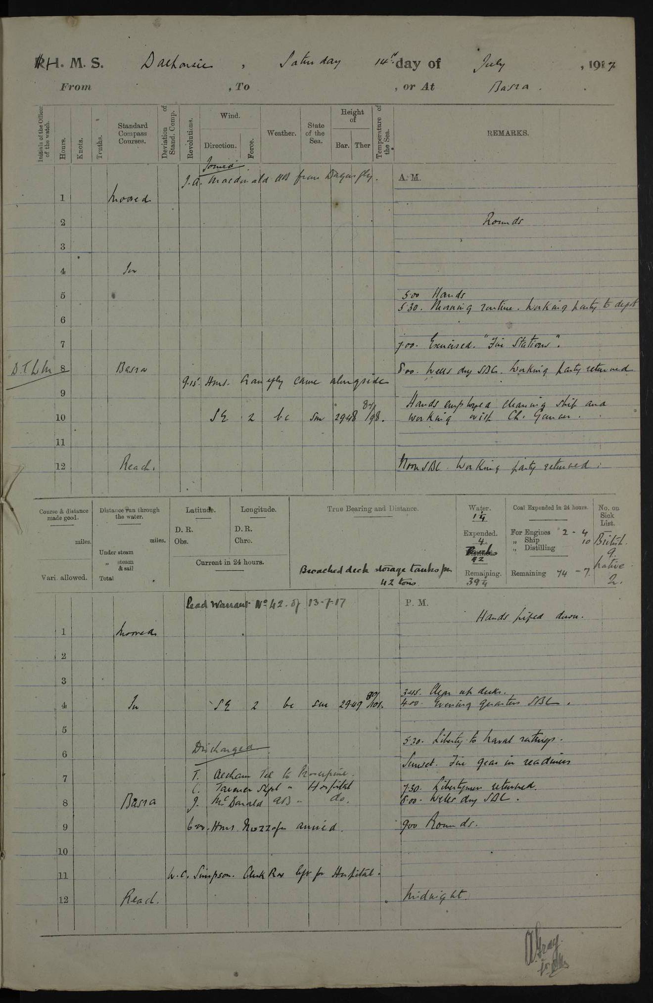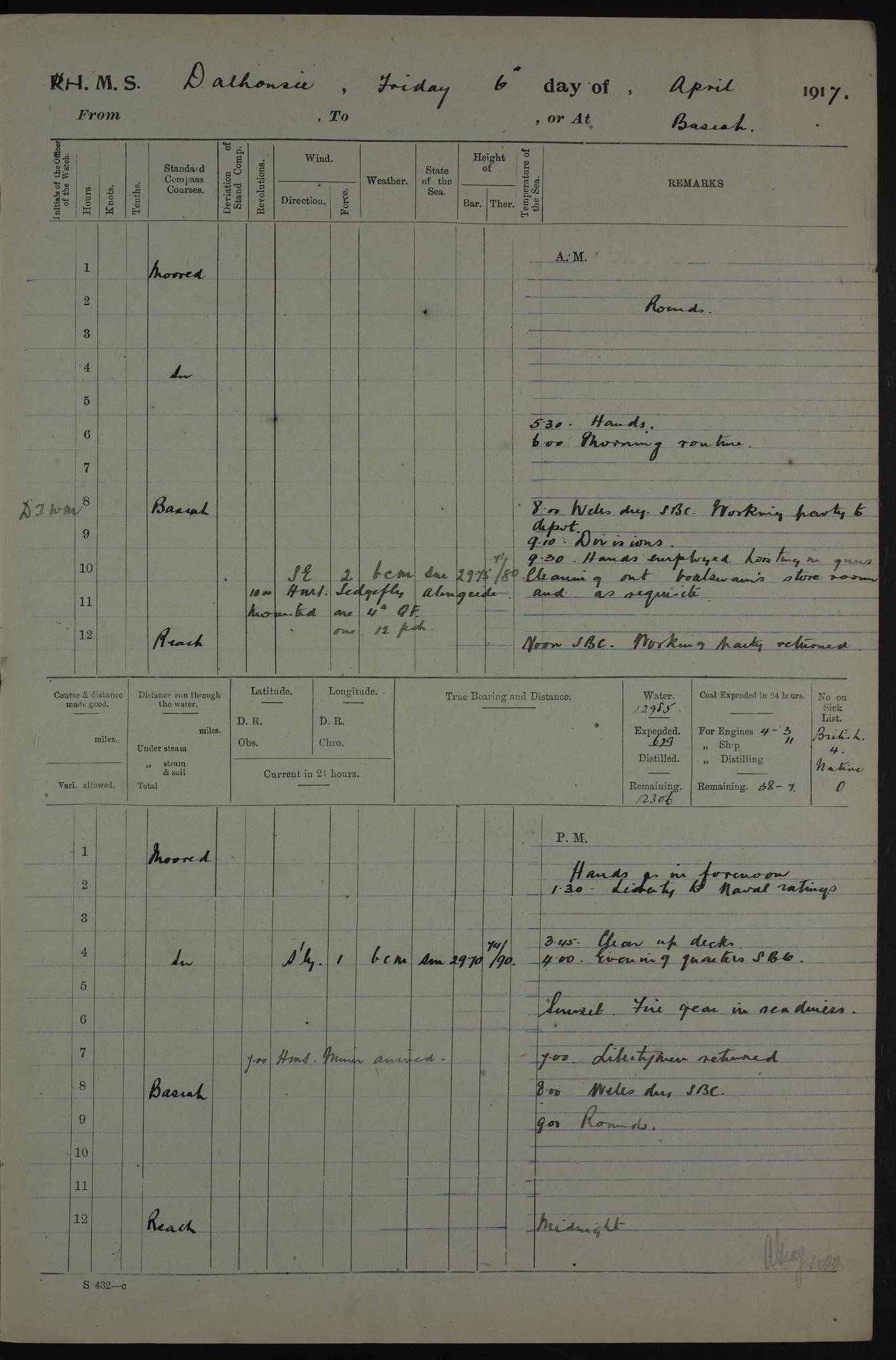 PM - Discharged To Hospital: H Widger, Engine Room Artificer - PW Harrison, Stoker Royal Navy Reserve To Motor Launch 11: J W Whitfield, Stoker 4ef4fa93e53e0a0c910056e2: (https://s3.amazonaws.com:443/oldweather/ADM53-39392/0018_0.jpg) 31 August 1916 Place: Basrah Lat 30.5269, Long 47.8407 2:00am: Rounds 5:05am: Hospital Ship SYRIA passed down 5:30am: Hands 6:00am: Morning Routine 8:00am: Wells dry – Signal Books Correct 9:30am: Divisions - Hands cleaning ship 11:00am: Drew Three Thousand Rupees from the Field treasury 12:00pm: Signal Books Correct – Issued Quinine to ship’s company 12:30pm: Piped Down 3:30pm: 4:00pm: Signal Books Correct 4:30pm: Cleared up decks 5:00pm: Evening Quarters – Leave to Watch of Naval Ratings 7:00pm: Sunset - Fire Gear in readiness 7:30pm: Liberty men returned 8:00pm: Wells dry - Signal Books Correct 9:00pm: Rounds - Signal Books Correct 11:00pm: Destroyed 19 tins Milk being unfit for use. AM – Joined From Motor Launch Depot: M. McMillan, Able Seaman From 5 Mess: T. Jackson, Petty Officer 1st From 4 Mess: T Golden, Stoker – J Tunney, Royal Navy Reserve Trawler Section From 10 Mess: J Donegan Royal Navy Reserve Trawler Section