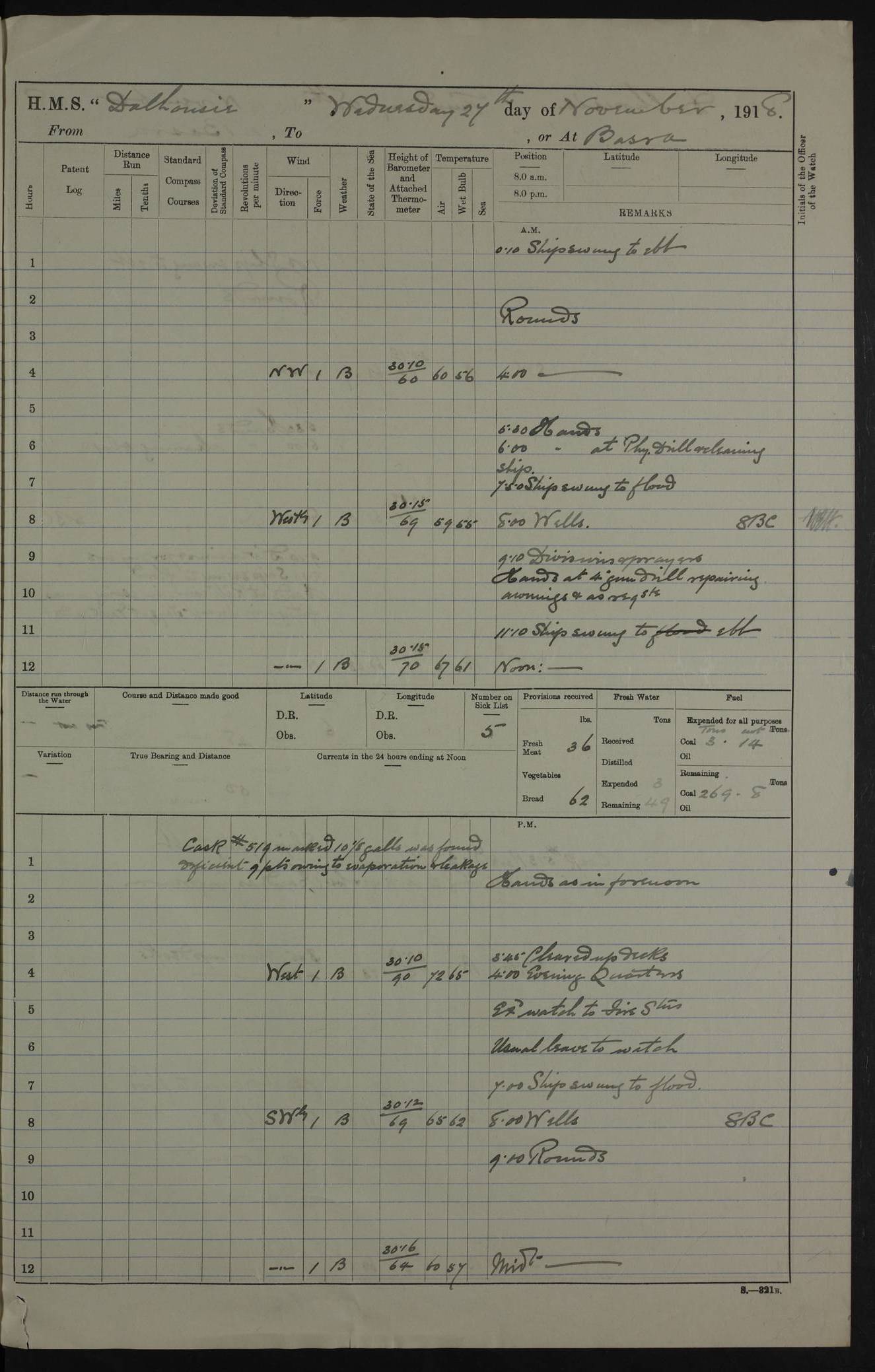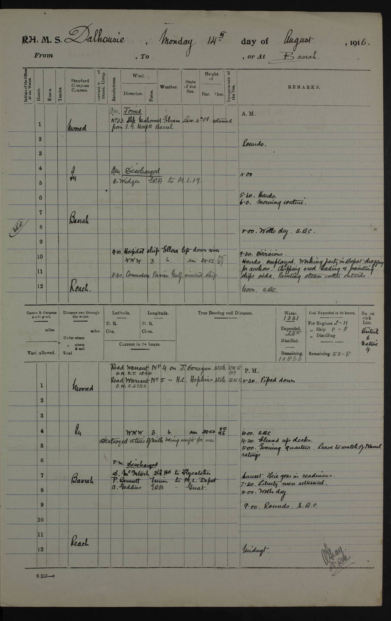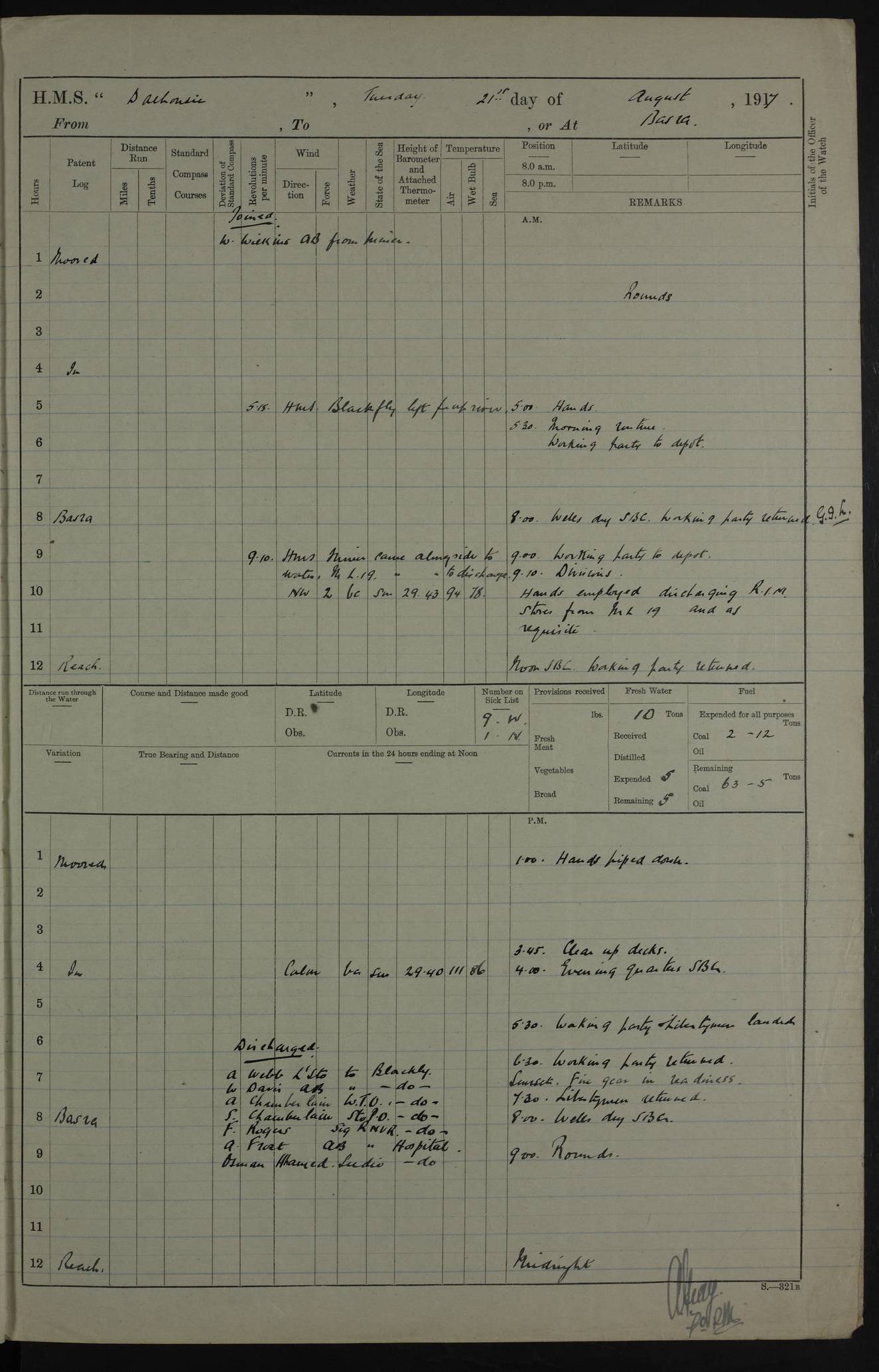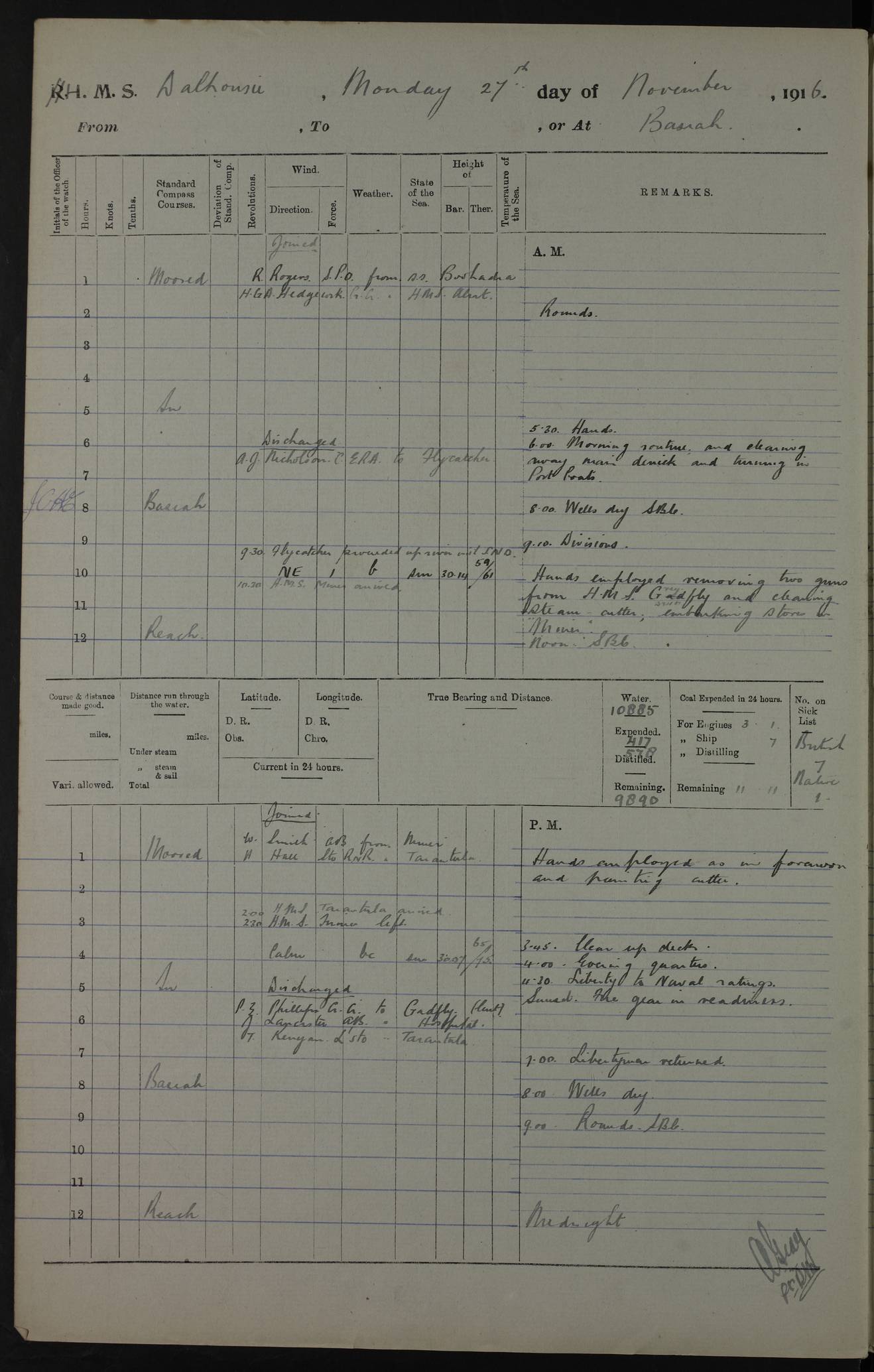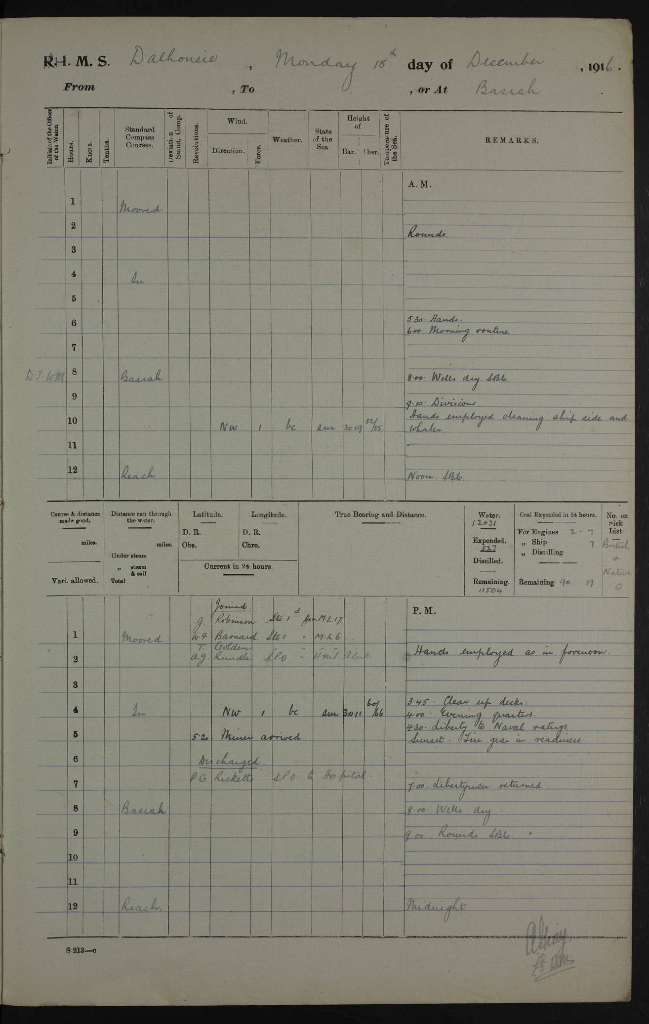 PM - Discharged To Hospital: H Widger, Engine Room Artificer - PW Harrison, Stoker Royal Navy Reserve To Motor Launch 11: J W Whitfield, Stoker 4ef4fa93e53e0a0c910056e2: (https://s3.amazonaws.com:443/oldweather/ADM53-39392/0018_0.jpg) 31 August 1916 Place: Basrah Lat 30.5269, Long 47.8407 2:00am: Rounds 5:05am: Hospital Ship SYRIA passed down 5:30am: Hands 6:00am: Morning Routine 8:00am: Wells dry – Signal Books Correct 9:30am: Divisions - Hands cleaning ship 11:00am: Drew Three Thousand Rupees from the Field treasury 12:00pm: Signal Books Correct – Issued Quinine to ship’s company 12:30pm: Piped Down 3:30pm: 4:00pm: Signal Books Correct 4:30pm: Cleared up decks 5:00pm: Evening Quarters – Leave to Watch of Naval Ratings 7:00pm: Sunset - Fire Gear in readiness 7:30pm: Liberty men returned 8:00pm: Wells dry - Signal Books Correct 9:00pm: Rounds - Signal Books Correct 11:00pm: Destroyed 19 tins Milk being unfit for use. AM – Joined From Motor Launch Depot: M. McMillan, Able Seaman From 5 Mess: T. Jackson, Petty Officer 1st From 4 Mess: T Golden, Stoker – J Tunney, Royal Navy Reserve Trawler Section From 10 Mess: J Donegan Royal Navy Reserve Trawler Section