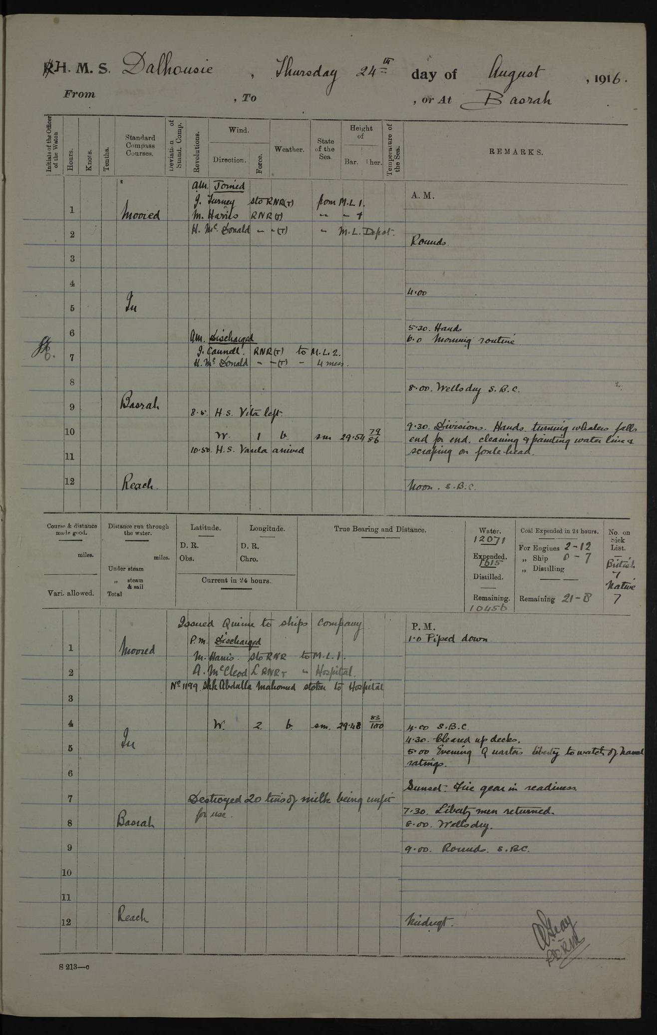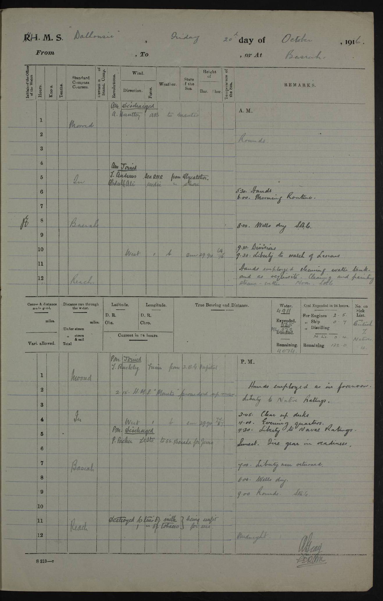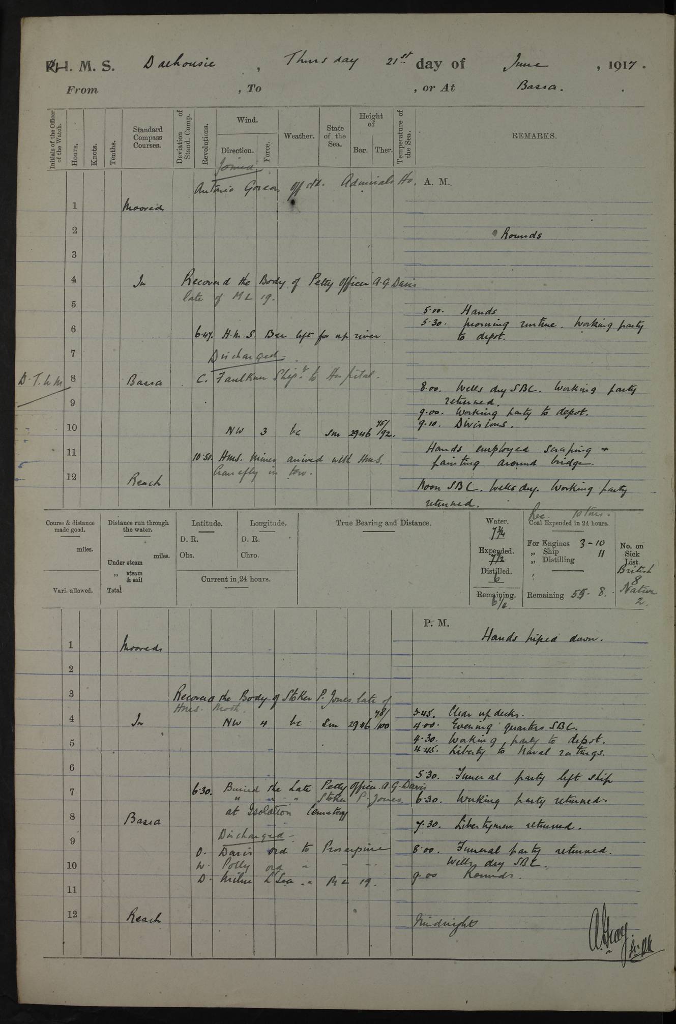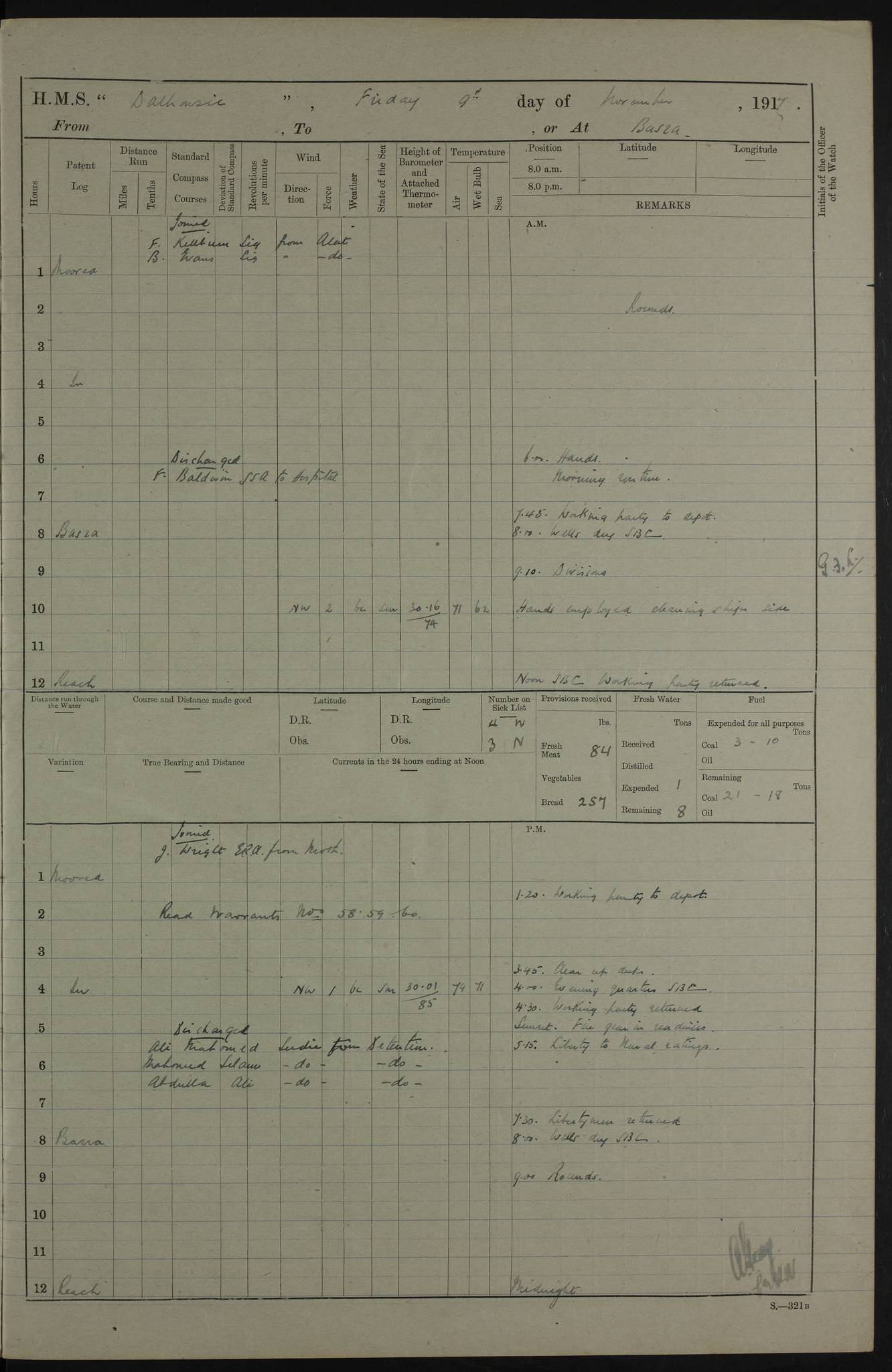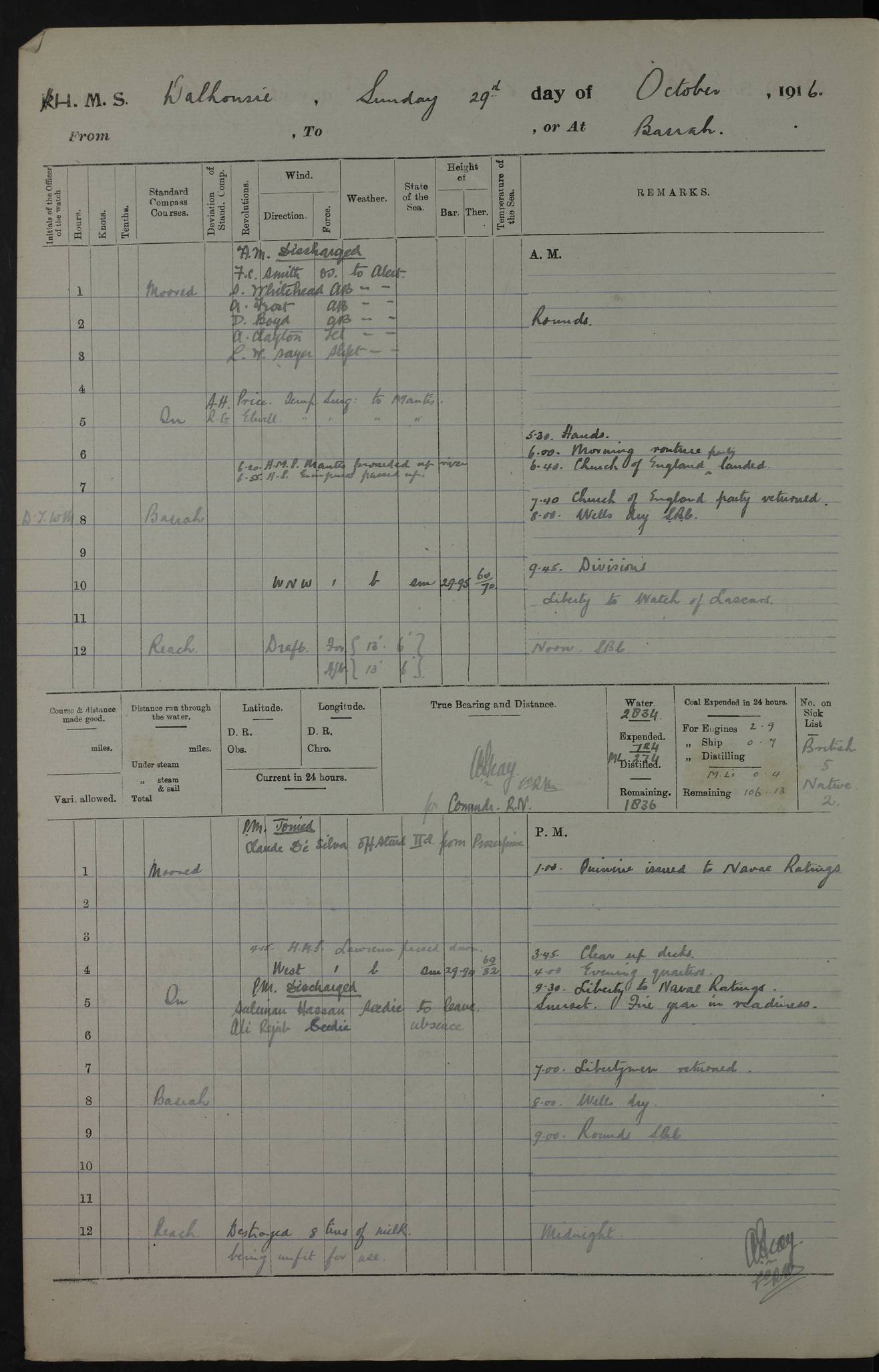 PM - Discharged To Hospital: H Widger, Engine Room Artificer - PW Harrison, Stoker Royal Navy Reserve To Motor Launch 11: J W Whitfield, Stoker 4ef4fa93e53e0a0c910056e2: (https://s3.amazonaws.com:443/oldweather/ADM53-39392/0018_0.jpg) 31 August 1916 Place: Basrah Lat 30.5269, Long 47.8407 2:00am: Rounds 5:05am: Hospital Ship SYRIA passed down 5:30am: Hands 6:00am: Morning Routine 8:00am: Wells dry – Signal Books Correct 9:30am: Divisions - Hands cleaning ship 11:00am: Drew Three Thousand Rupees from the Field treasury 12:00pm: Signal Books Correct – Issued Quinine to ship’s company 12:30pm: Piped Down 3:30pm: 4:00pm: Signal Books Correct 4:30pm: Cleared up decks 5:00pm: Evening Quarters – Leave to Watch of Naval Ratings 7:00pm: Sunset - Fire Gear in readiness 7:30pm: Liberty men returned 8:00pm: Wells dry - Signal Books Correct 9:00pm: Rounds - Signal Books Correct 11:00pm: Destroyed 19 tins Milk being unfit for use. AM – Joined From Motor Launch Depot: M. McMillan, Able Seaman From 5 Mess: T. Jackson, Petty Officer 1st From 4 Mess: T Golden, Stoker – J Tunney, Royal Navy Reserve Trawler Section From 10 Mess: J Donegan Royal Navy Reserve Trawler Section