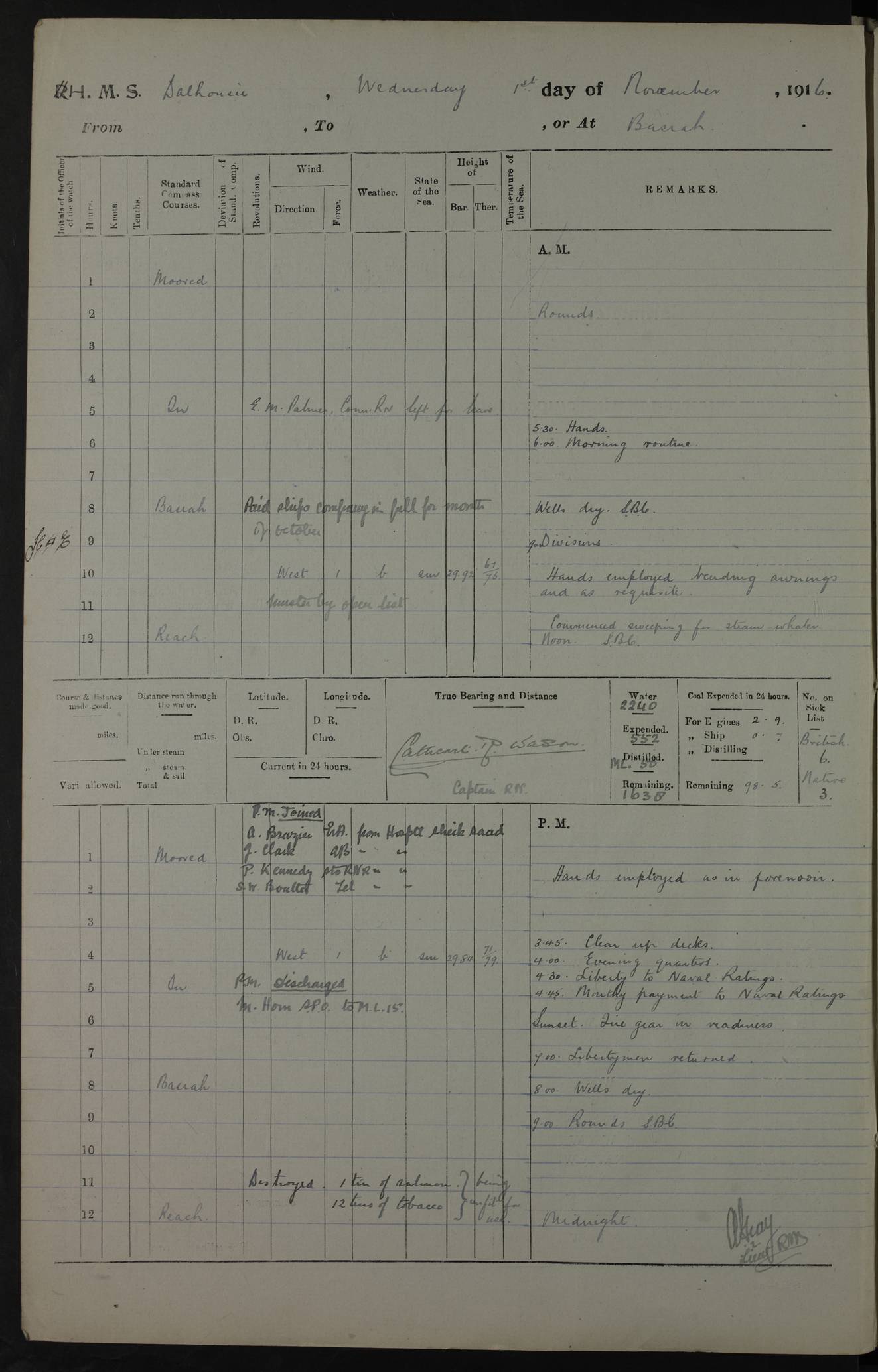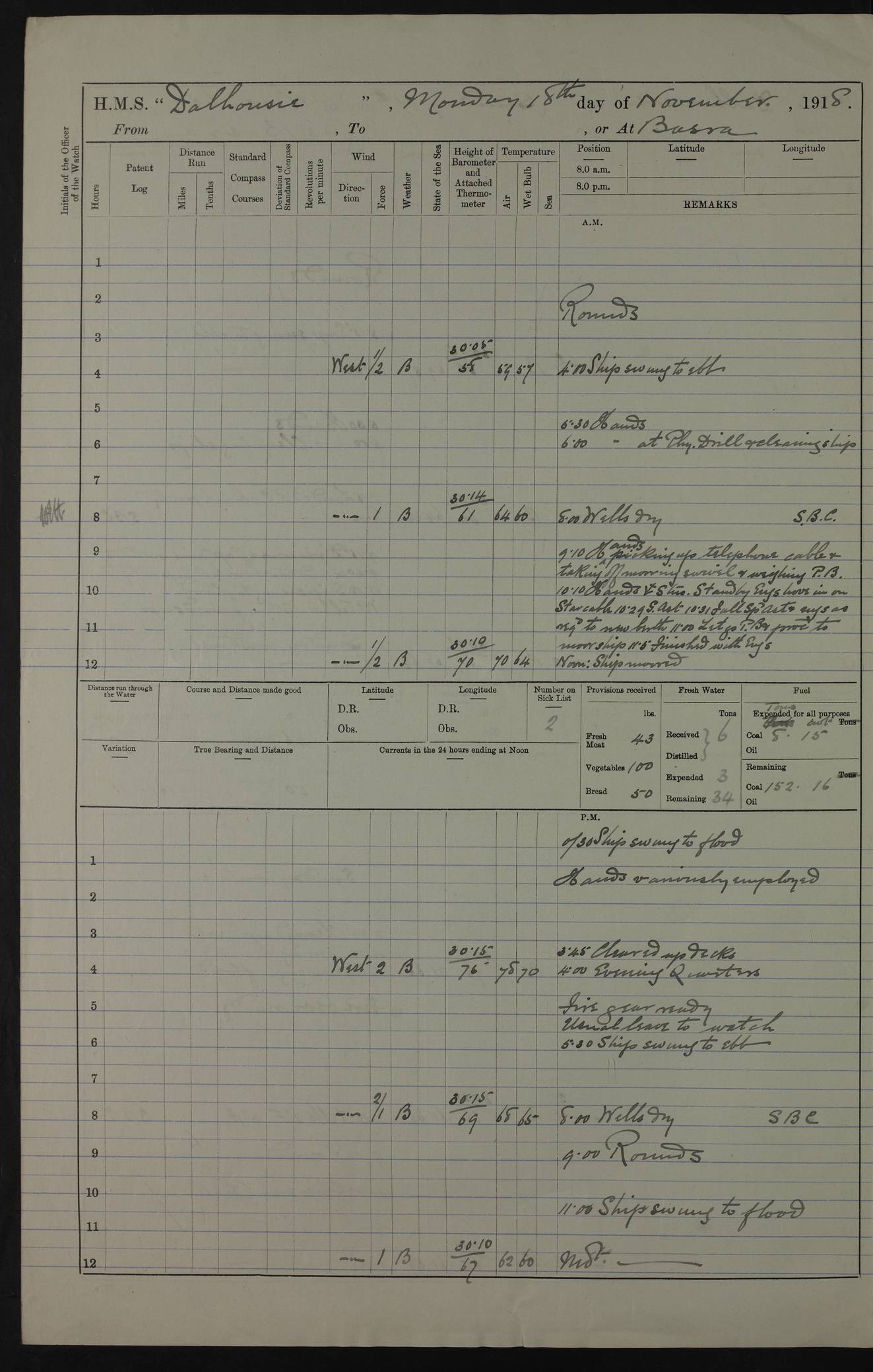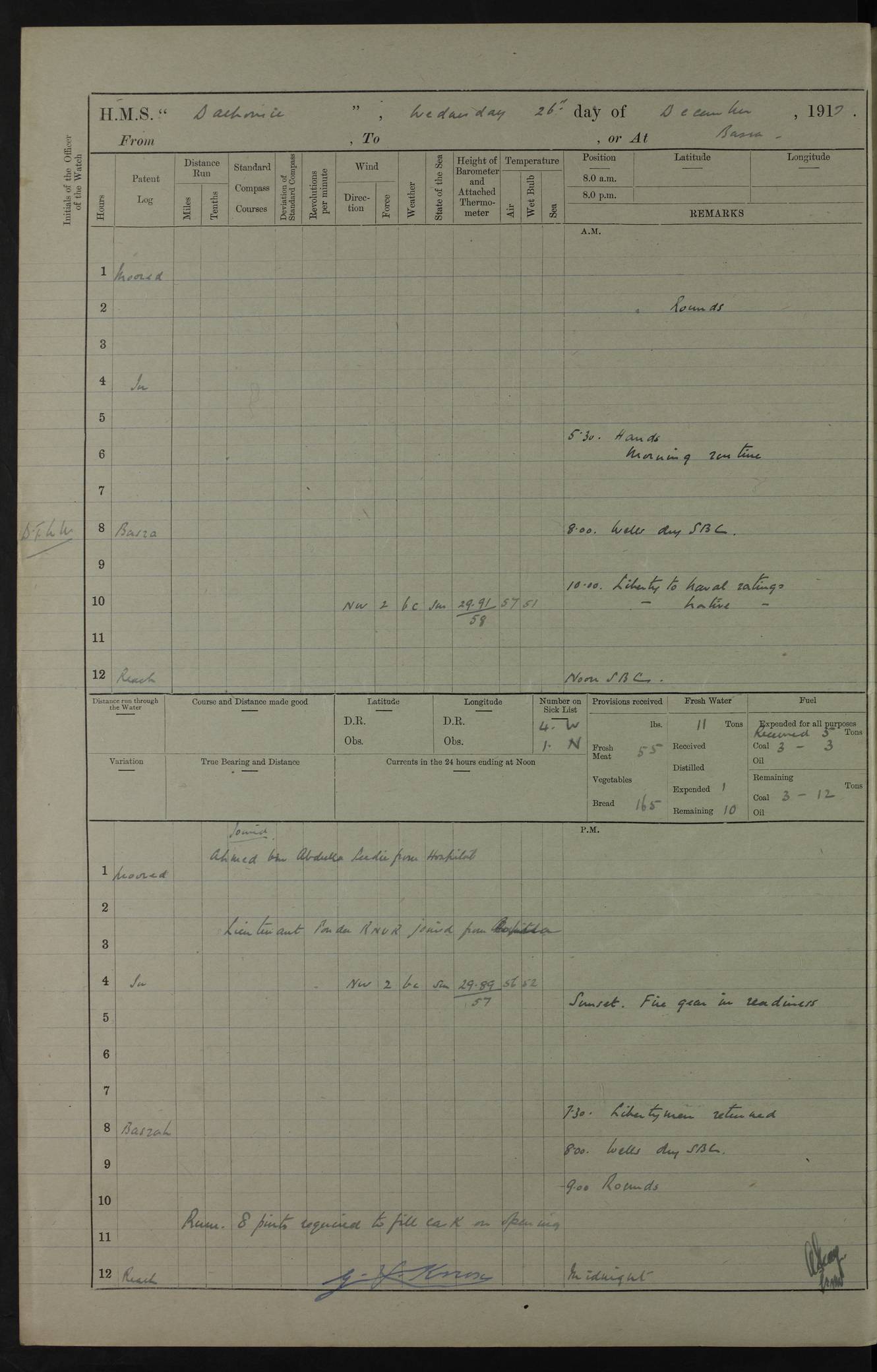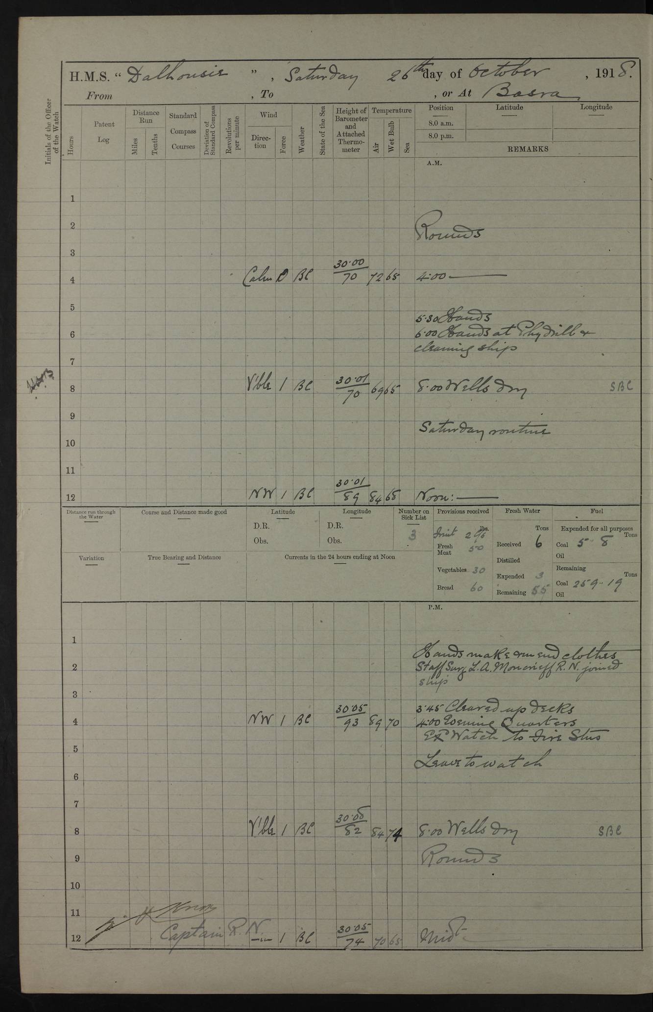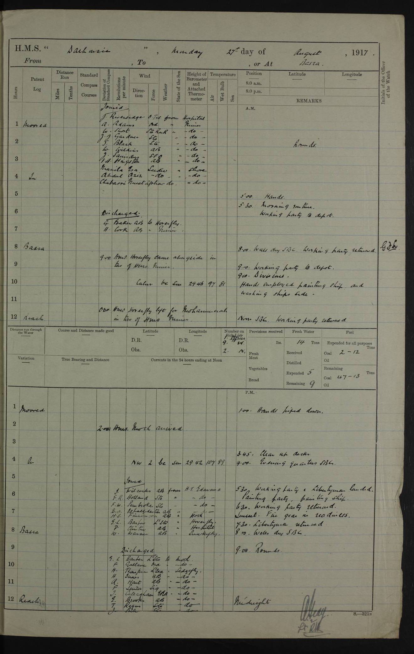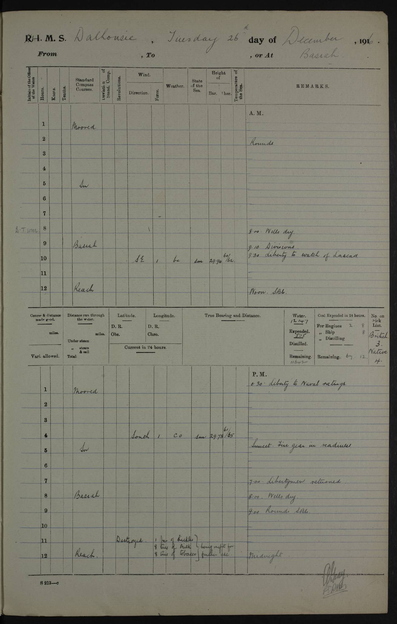 PM - Discharged To Hospital: H Widger, Engine Room Artificer - PW Harrison, Stoker Royal Navy Reserve To Motor Launch 11: J W Whitfield, Stoker 4ef4fa93e53e0a0c910056e2: (https://s3.amazonaws.com:443/oldweather/ADM53-39392/0018_0.jpg) 31 August 1916 Place: Basrah Lat 30.5269, Long 47.8407 2:00am: Rounds 5:05am: Hospital Ship SYRIA passed down 5:30am: Hands 6:00am: Morning Routine 8:00am: Wells dry – Signal Books Correct 9:30am: Divisions - Hands cleaning ship 11:00am: Drew Three Thousand Rupees from the Field treasury 12:00pm: Signal Books Correct – Issued Quinine to ship’s company 12:30pm: Piped Down 3:30pm: 4:00pm: Signal Books Correct 4:30pm: Cleared up decks 5:00pm: Evening Quarters – Leave to Watch of Naval Ratings 7:00pm: Sunset - Fire Gear in readiness 7:30pm: Liberty men returned 8:00pm: Wells dry - Signal Books Correct 9:00pm: Rounds - Signal Books Correct 11:00pm: Destroyed 19 tins Milk being unfit for use. AM – Joined From Motor Launch Depot: M. McMillan, Able Seaman From 5 Mess: T. Jackson, Petty Officer 1st From 4 Mess: T Golden, Stoker – J Tunney, Royal Navy Reserve Trawler Section From 10 Mess: J Donegan Royal Navy Reserve Trawler Section