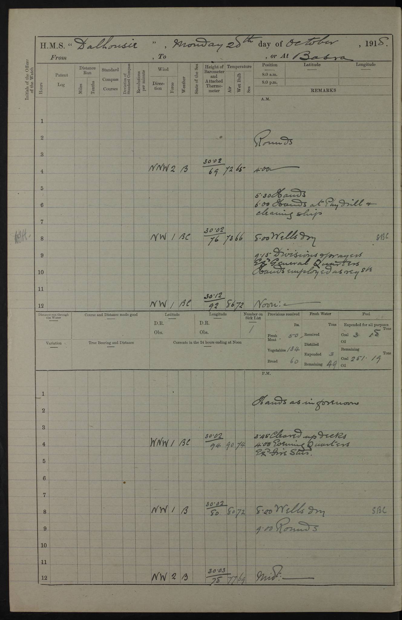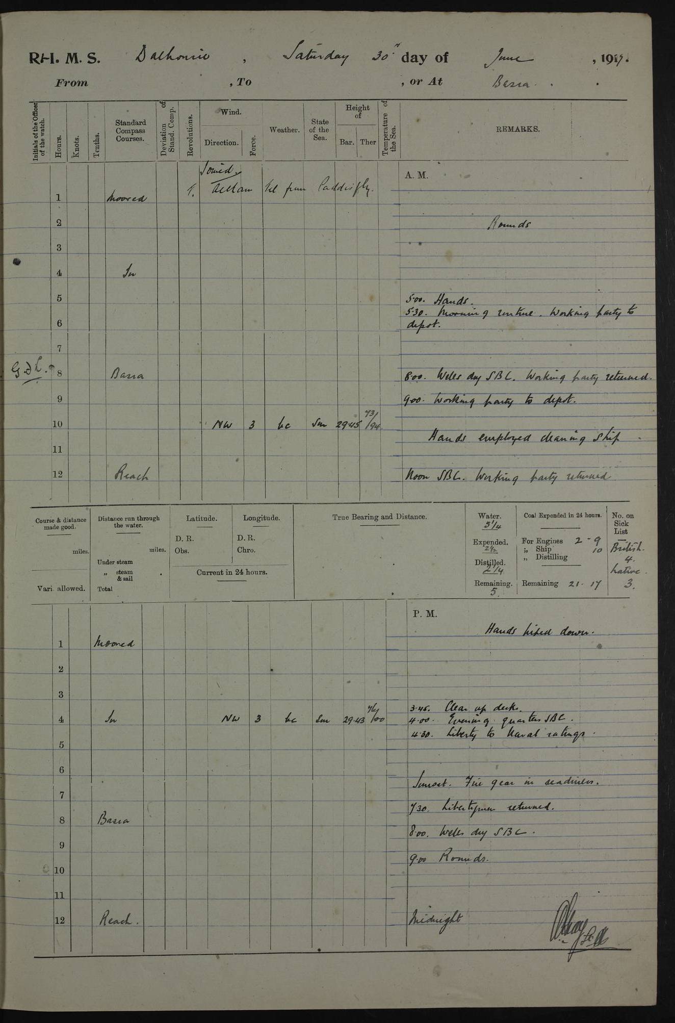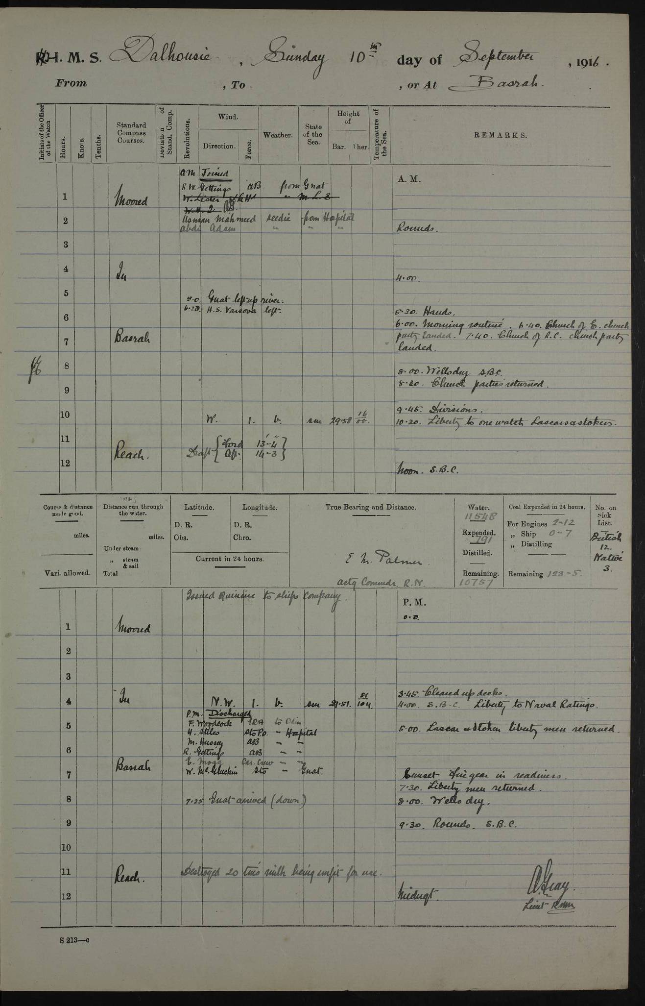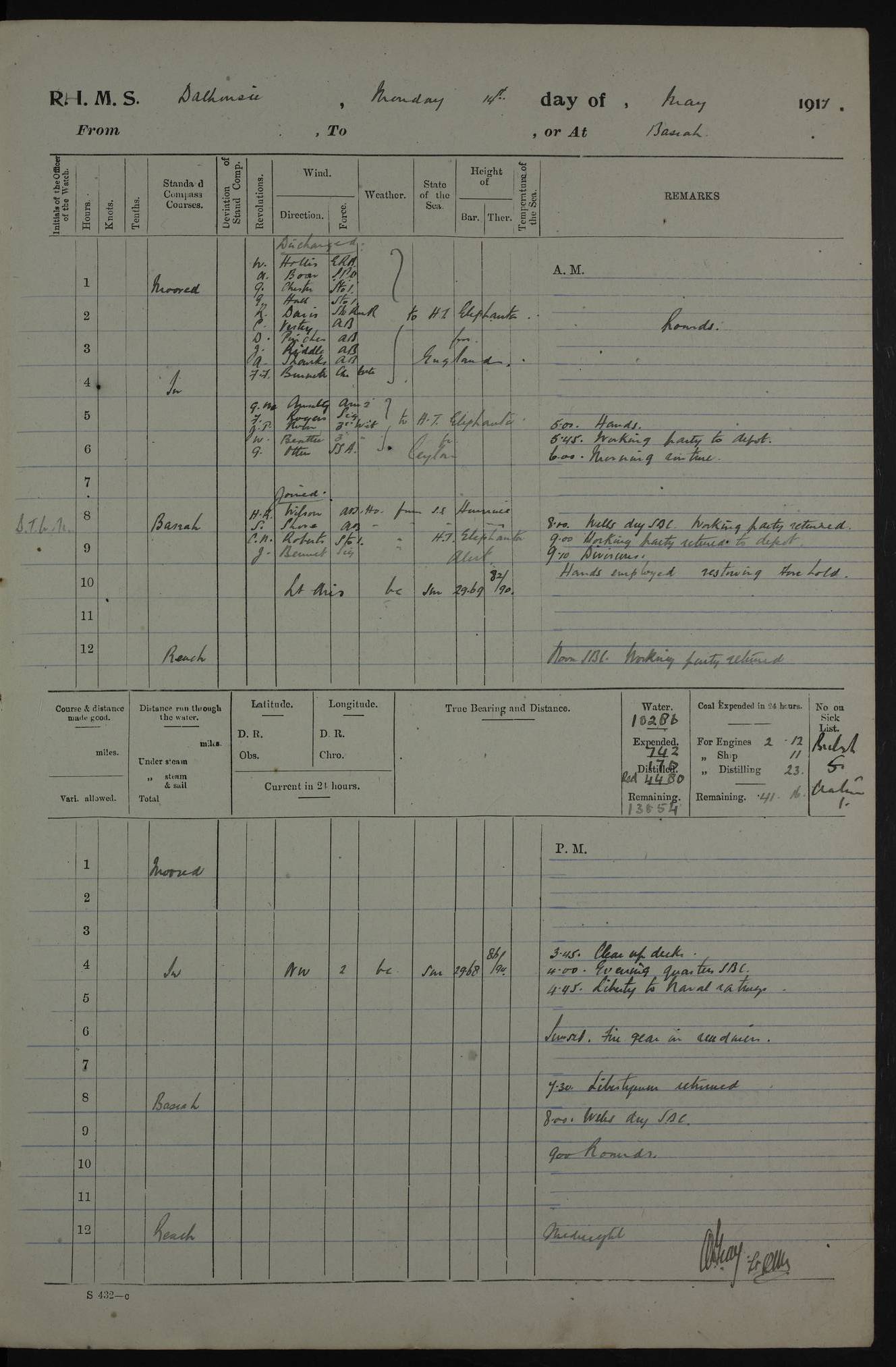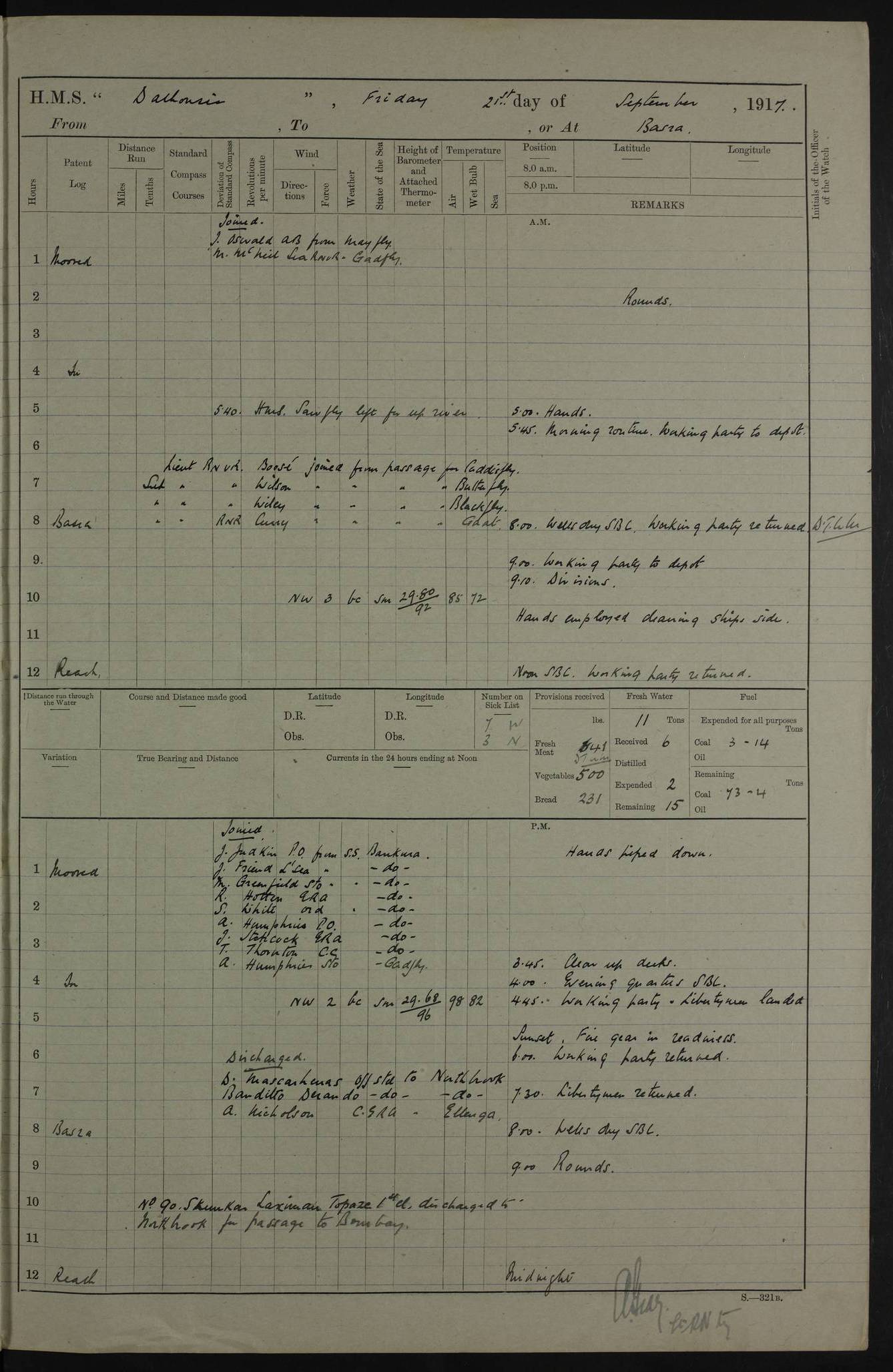 PM - Discharged To Hospital: H Widger, Engine Room Artificer - PW Harrison, Stoker Royal Navy Reserve To Motor Launch 11: J W Whitfield, Stoker 4ef4fa93e53e0a0c910056e2: (https://s3.amazonaws.com:443/oldweather/ADM53-39392/0018_0.jpg) 31 August 1916 Place: Basrah Lat 30.5269, Long 47.8407 2:00am: Rounds 5:05am: Hospital Ship SYRIA passed down 5:30am: Hands 6:00am: Morning Routine 8:00am: Wells dry – Signal Books Correct 9:30am: Divisions - Hands cleaning ship 11:00am: Drew Three Thousand Rupees from the Field treasury 12:00pm: Signal Books Correct – Issued Quinine to ship’s company 12:30pm: Piped Down 3:30pm: 4:00pm: Signal Books Correct 4:30pm: Cleared up decks 5:00pm: Evening Quarters – Leave to Watch of Naval Ratings 7:00pm: Sunset - Fire Gear in readiness 7:30pm: Liberty men returned 8:00pm: Wells dry - Signal Books Correct 9:00pm: Rounds - Signal Books Correct 11:00pm: Destroyed 19 tins Milk being unfit for use. AM – Joined From Motor Launch Depot: M. McMillan, Able Seaman From 5 Mess: T. Jackson, Petty Officer 1st From 4 Mess: T Golden, Stoker – J Tunney, Royal Navy Reserve Trawler Section From 10 Mess: J Donegan Royal Navy Reserve Trawler Section