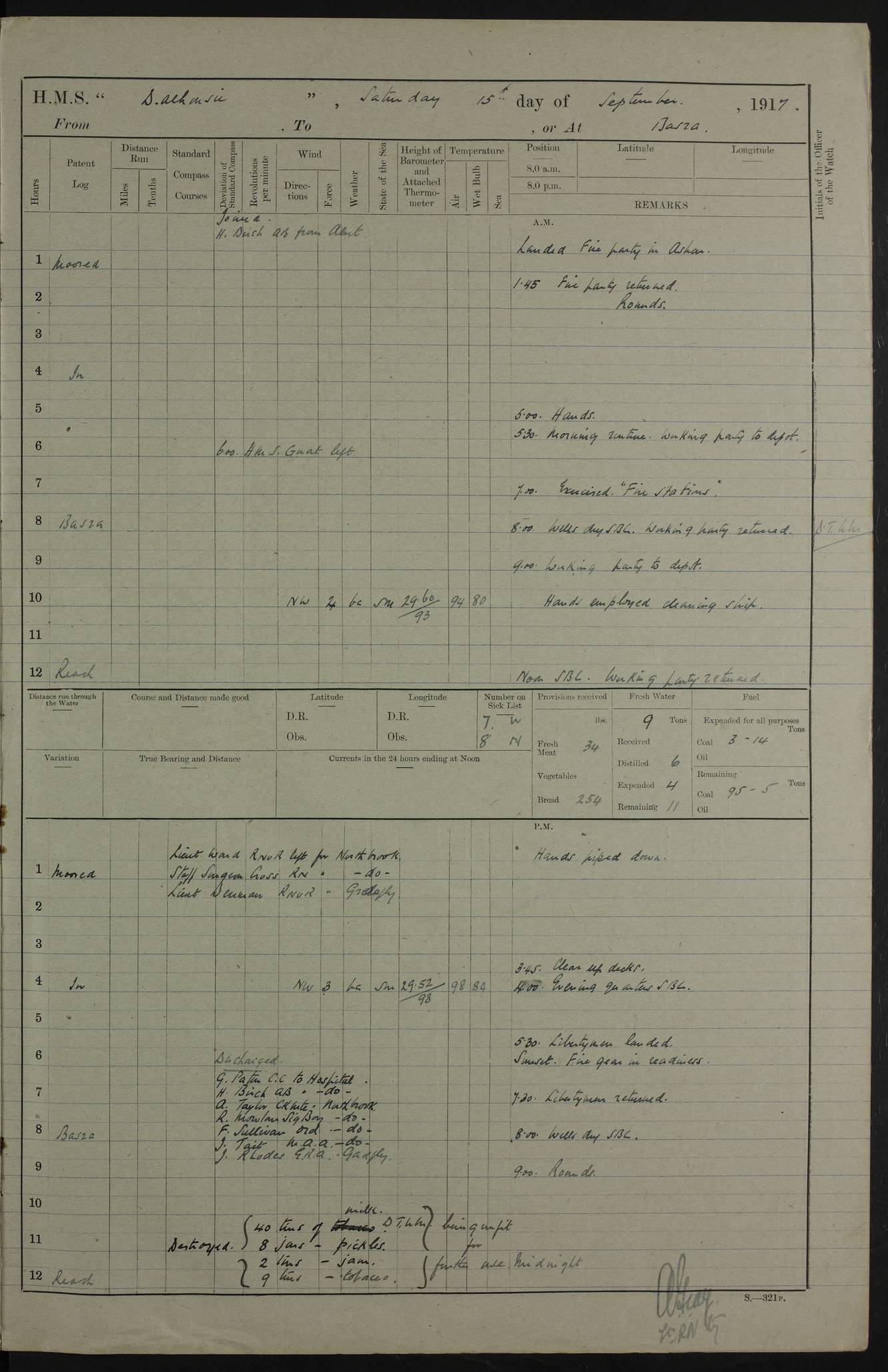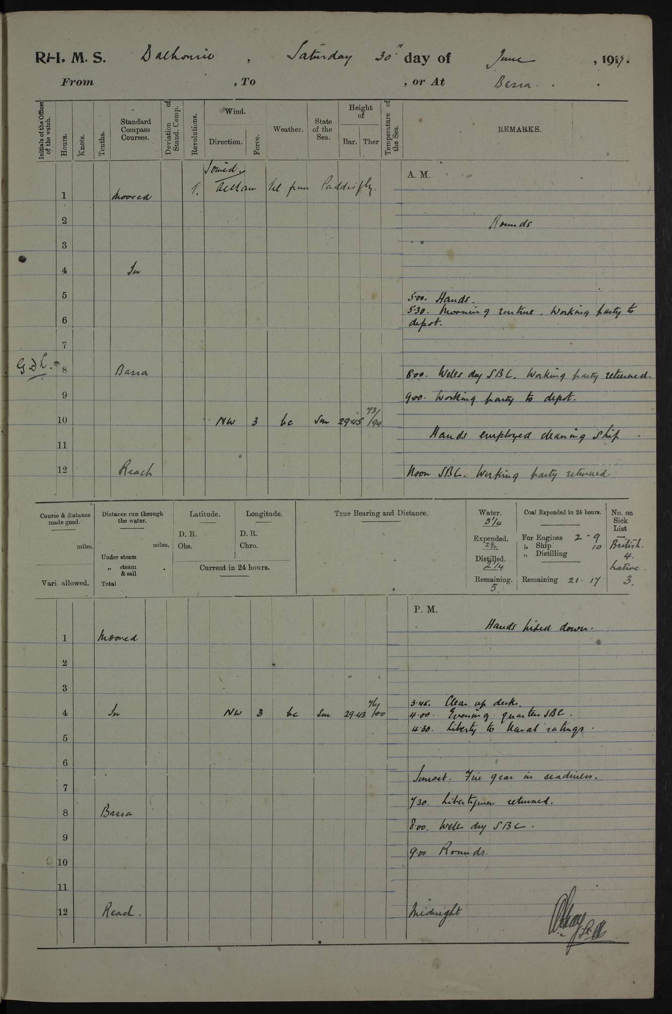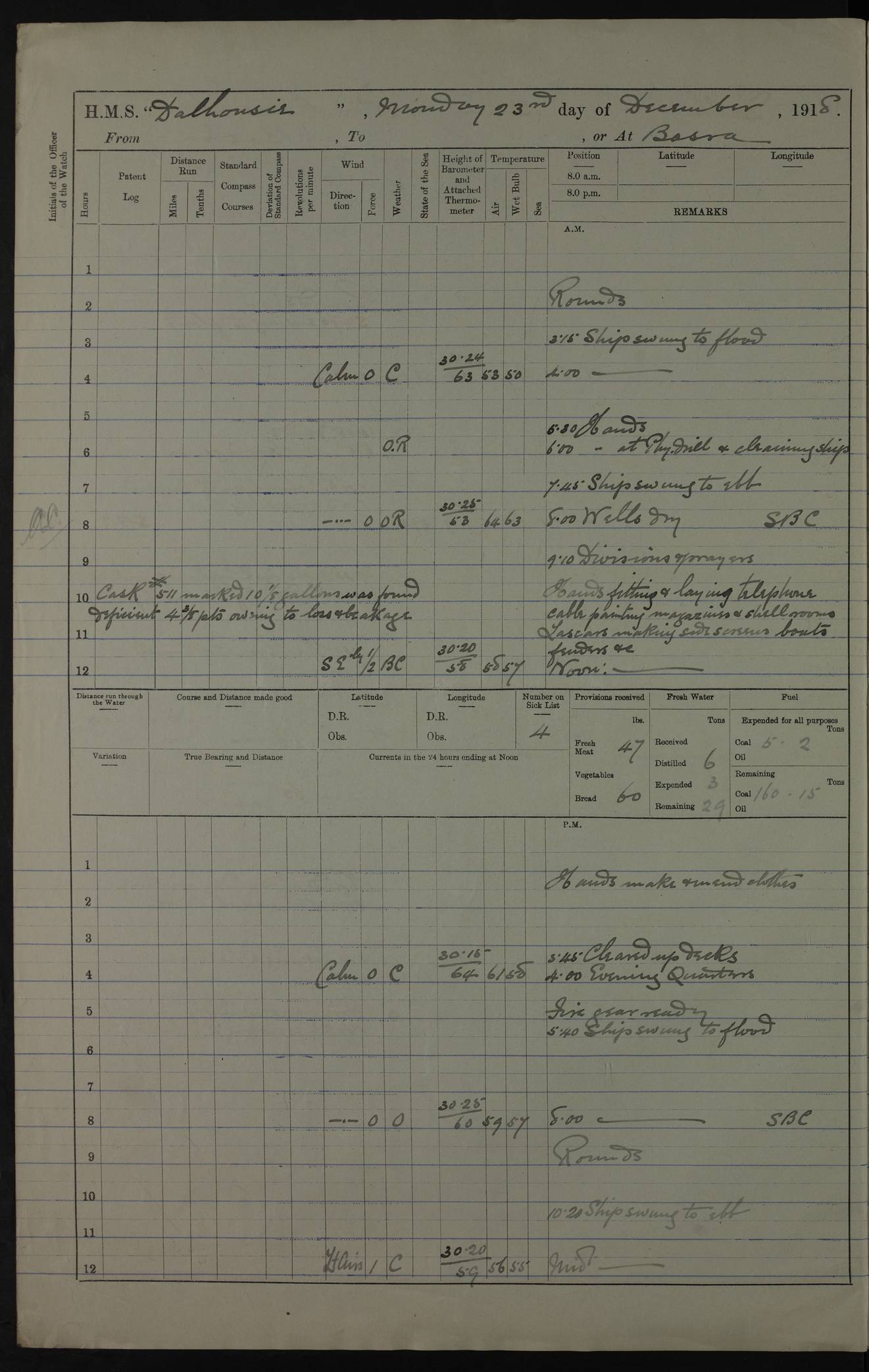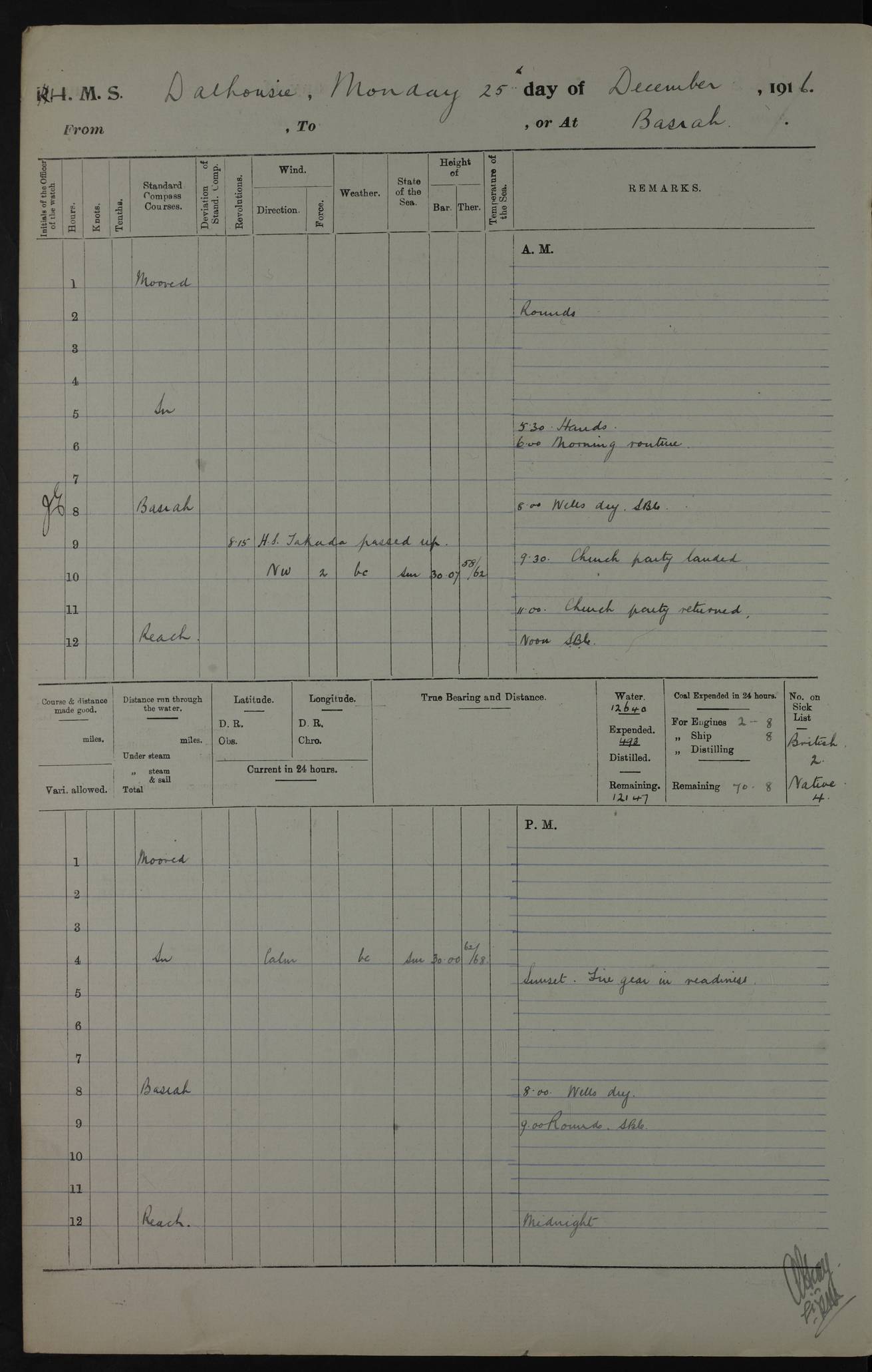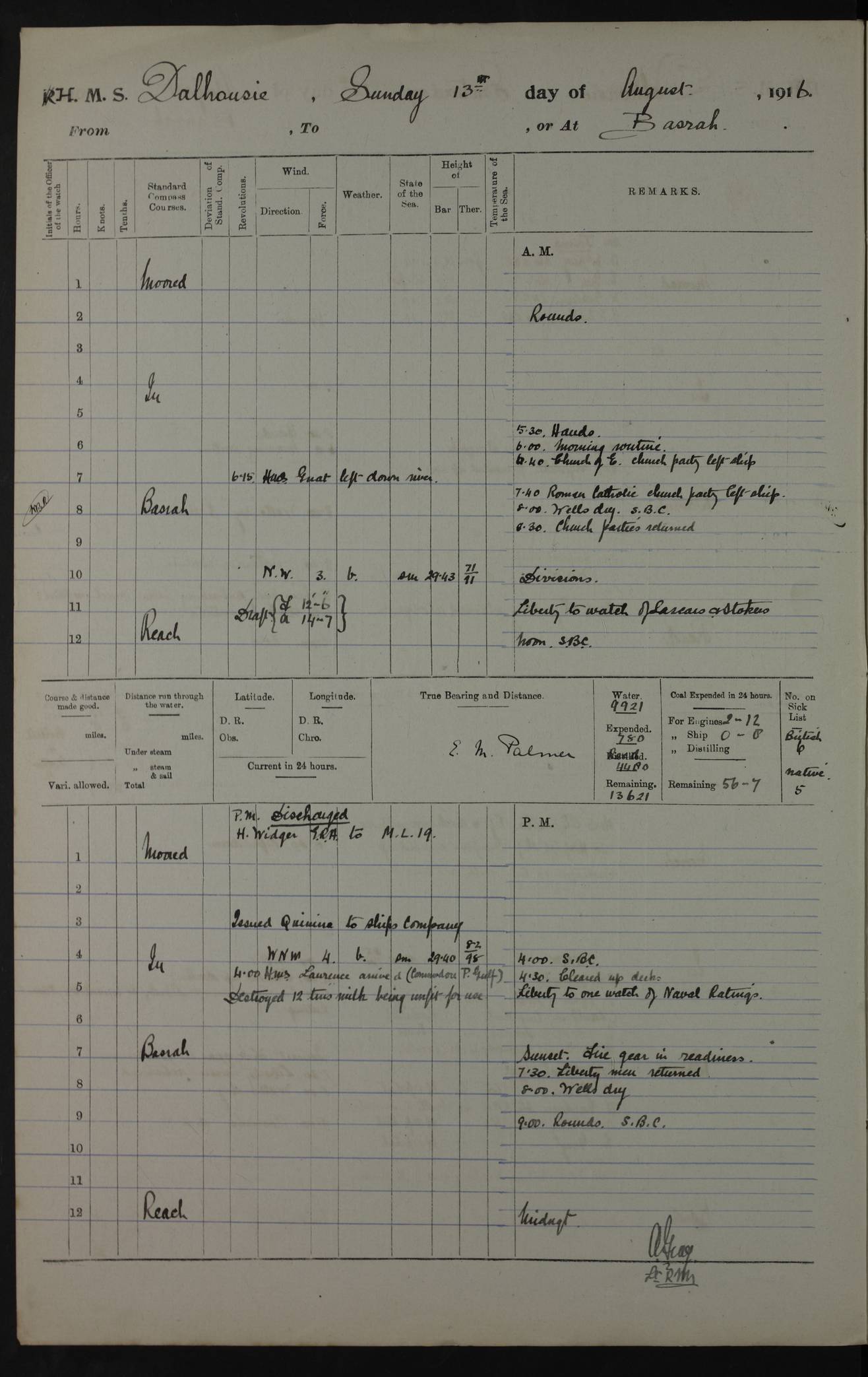 PM - Discharged To Hospital: H Widger, Engine Room Artificer - PW Harrison, Stoker Royal Navy Reserve To Motor Launch 11: J W Whitfield, Stoker 4ef4fa93e53e0a0c910056e2: (https://s3.amazonaws.com:443/oldweather/ADM53-39392/0018_0.jpg) 31 August 1916 Place: Basrah Lat 30.5269, Long 47.8407 2:00am: Rounds 5:05am: Hospital Ship SYRIA passed down 5:30am: Hands 6:00am: Morning Routine 8:00am: Wells dry – Signal Books Correct 9:30am: Divisions - Hands cleaning ship 11:00am: Drew Three Thousand Rupees from the Field treasury 12:00pm: Signal Books Correct – Issued Quinine to ship’s company 12:30pm: Piped Down 3:30pm: 4:00pm: Signal Books Correct 4:30pm: Cleared up decks 5:00pm: Evening Quarters – Leave to Watch of Naval Ratings 7:00pm: Sunset - Fire Gear in readiness 7:30pm: Liberty men returned 8:00pm: Wells dry - Signal Books Correct 9:00pm: Rounds - Signal Books Correct 11:00pm: Destroyed 19 tins Milk being unfit for use. AM – Joined From Motor Launch Depot: M. McMillan, Able Seaman From 5 Mess: T. Jackson, Petty Officer 1st From 4 Mess: T Golden, Stoker – J Tunney, Royal Navy Reserve Trawler Section From 10 Mess: J Donegan Royal Navy Reserve Trawler Section